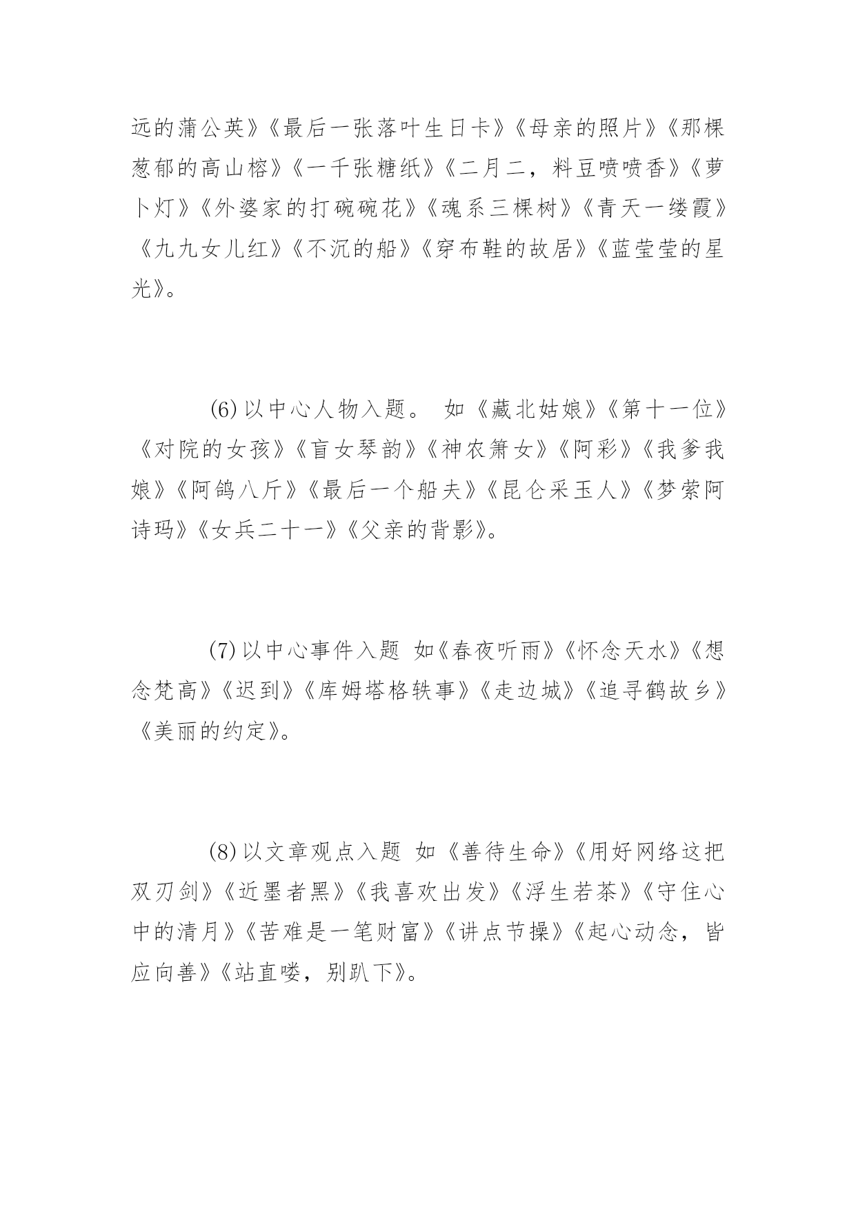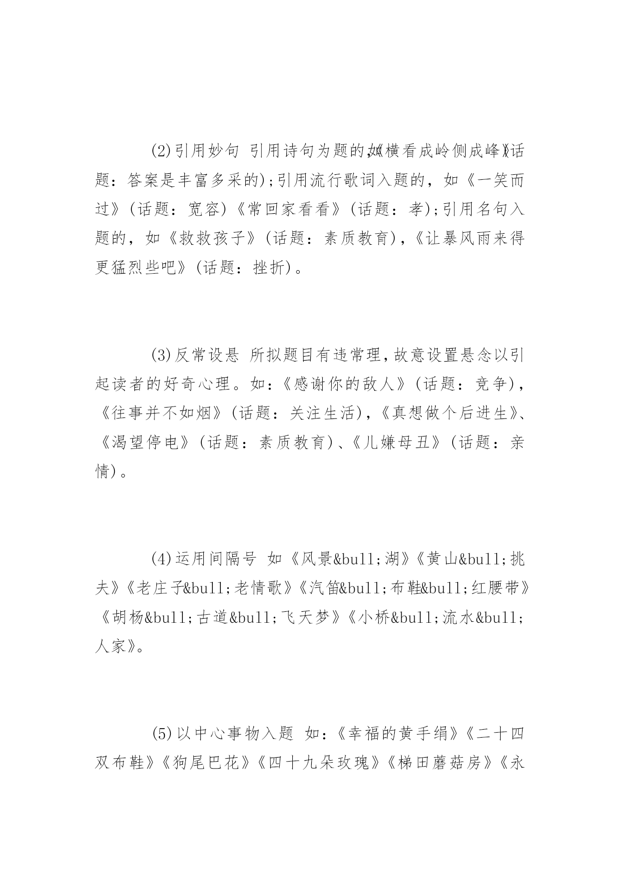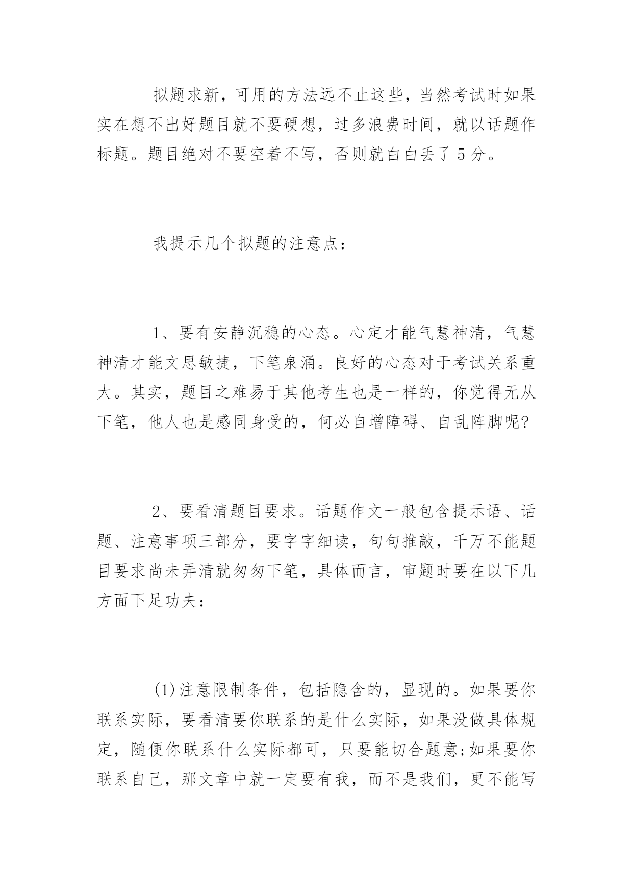 中考话题作文拟题目技巧2017中考话题作文拟题目技巧俗话说标题是文章的眼睛,题好一半文。你的作文如果能取个好题目,自然会让阅卷老师对你刮目相看。好标题一般要符合两个标准:生动形象,富有文学意味;言简意赅,能包孕文章主题。该怎样拟好题目呢?下列方法可供参考:(1)运用修辞如以比喻入题的,《送老人一轮暖阳》(话题:孝);以夸张入题的,《那个障碍粉碎了我》(话题:挫折);以反问入题的,《我是谁?》(话题:假如记忆可以移植);以设问入题的,《我从日本邮局取回了什么?》(话题:效率);以对偶入题的,《一头白发,满山青葱》(话题:环保),《高高山顶立,深深海底行》(话题:人生感悟);以拟人入题的,如《地球就诊记》(话题:环保);以呼告入题的,《回来吧,妈妈!》(话题:亲情);利用谐音《从心做起》(话题:亲情);利用双关,《冬日暖阳》《花落春仍在》(话题:温情)(2)引用妙句引用诗句为题的,如《横看成岭侧成峰》(话题:答案是丰富多采的);引用流行歌词入题的,如《一笑而过》(话题:宽容)《常回家看看》(话题:孝);引用名句入题的,如《救救孩子》(话题:素质教育),《让暴风雨来得更猛烈些吧》(话题:挫折)。(3)反常设悬所拟题目有违常理,故意设置悬念以引起读者的好奇心理。如:《感谢你的敌人》(话题:竞争),《往事并不如烟》(话题:关注生活),《真想做个后进生》、《渴望停电》(话题:素质教育)、《儿嫌母丑》(话题:亲情)。(4)运用间隔号如《风景•湖》《黄山•挑夫》《老庄子•老情歌》《汽笛•布鞋•红腰带》《胡杨•古道•飞天梦》《小桥•流水•人家》。(5)以中心事物入题如:《幸福的黄手绢》《二十四双布鞋》《狗尾巴花》《四十九朵玫瑰》《梯田蘑菇房》《永远的蒲公英》《最后一张落叶生日卡》《母亲的照片》《那棵葱郁的高山榕》《一千张糖纸》《二月二,料豆喷喷香》《萝卜灯》《外婆家的打碗碗花》《魂系三棵树》《青天一缕霞》《九九女儿红》《不沉的船》《穿布鞋的故居》《蓝莹莹的星光》。(6)以中心人物入题。如《藏北姑娘》《第十一位》《对院的女孩》《盲女琴韵》《神农箫女》《阿彩》《我爹我娘》《阿鸽八斤》《最后一个船夫》《昆仑采玉人》《梦萦阿诗玛》《女兵二十一》《父亲的背影》。(7)以中心事件入题如《春夜听雨》《怀念天水》《想念梵高》《迟到》《库姆塔格轶事》《走边城》《追寻鹤故乡》《美丽的约定》。(8)以文章观点入题如《善待生命》《用好网络这把双刃剑》《近墨者黑》《我喜欢出发》《浮生若茶》《守住心中的清月》《苦难是一笔财富》《讲点节操》《起心动念,皆应向善》《站直喽,别趴下》。拟题求新,可用的方法远不止这些,当然考试时如果实在想不出好题目就不要硬想,过多浪费时间,就以话题作标题。题目绝对不要空着不写,否则就白白丢了5分。我提示几个拟题的注意点:1、要有安静沉稳的心态。心定才能气慧神清,气慧神清才能文思敏捷,下笔泉涌。良好的心态对于考试关系重大。其实,题目之难易于其他考生也是一样的,你觉得无从下笔,他人也是感同身受的,何必自增障碍、自乱阵脚呢?2、要看清题目要求。话题作文一般包含提示语、话题、注意事项三部分,要字字细读,句句推敲,千万不能题目要求尚未弄清就匆匆下笔,具体而言,审题时要在以下几方面下足功夫:(1)注意限制条件,包括隐含的,显现的。如果要你联系实际,要看清要你联系的是什么实际,如果没做具体规定,随便你联系什么实际都可,只要能切合题意;如果要你联系自己,那文章中就一定要有我,而不是我们,更不能写他人。还要读出隐含于材料中的命题者的意图。如2010年中考作文题的话题材料是一个寓言故事。故事中的青年在人生路上必须有所取舍时,将诚信抛掉了。对于人生来说,诚信不仅是一种美德,更是做人的根本,怎么可以抛弃呢?尽管这个故事并没有结论,但其中蕴含的道理是很清楚的:诚信不可抛。要按这个道理立意,这是命题者通过话题材料给予考生的提示。当年有少数考生写诚信可抛,究其原因,若非有意反弹琵琶,标新立异,就是未看出材料中隐含的观点。(2)吃准材料,抓住关键问题思考立意。比如下面这个题目:随着交通、通讯越来越发达,随着网络的出现,世界似乎正变得越来越小;而随着对宇宙的探索和研究越来越深入,越来越多的人意识到地球不过是人类居住的一个小小的村落。于是,一个新名词地球村出现了。地球村,多么形象的称呼。对此,你有什么联想、想象或见解呢?请以地球村为话题写一篇作文。写这篇文章容易犯的毛病就是重复话题材料已经说明的意思,反复论说地球变小了,变成村落了。这样就偏离了写作重心。这个题目实际上是要求以地球已经是个村为前提,来写你的联想、想象和见解。明白了这一点,思路就不难打开,文章也