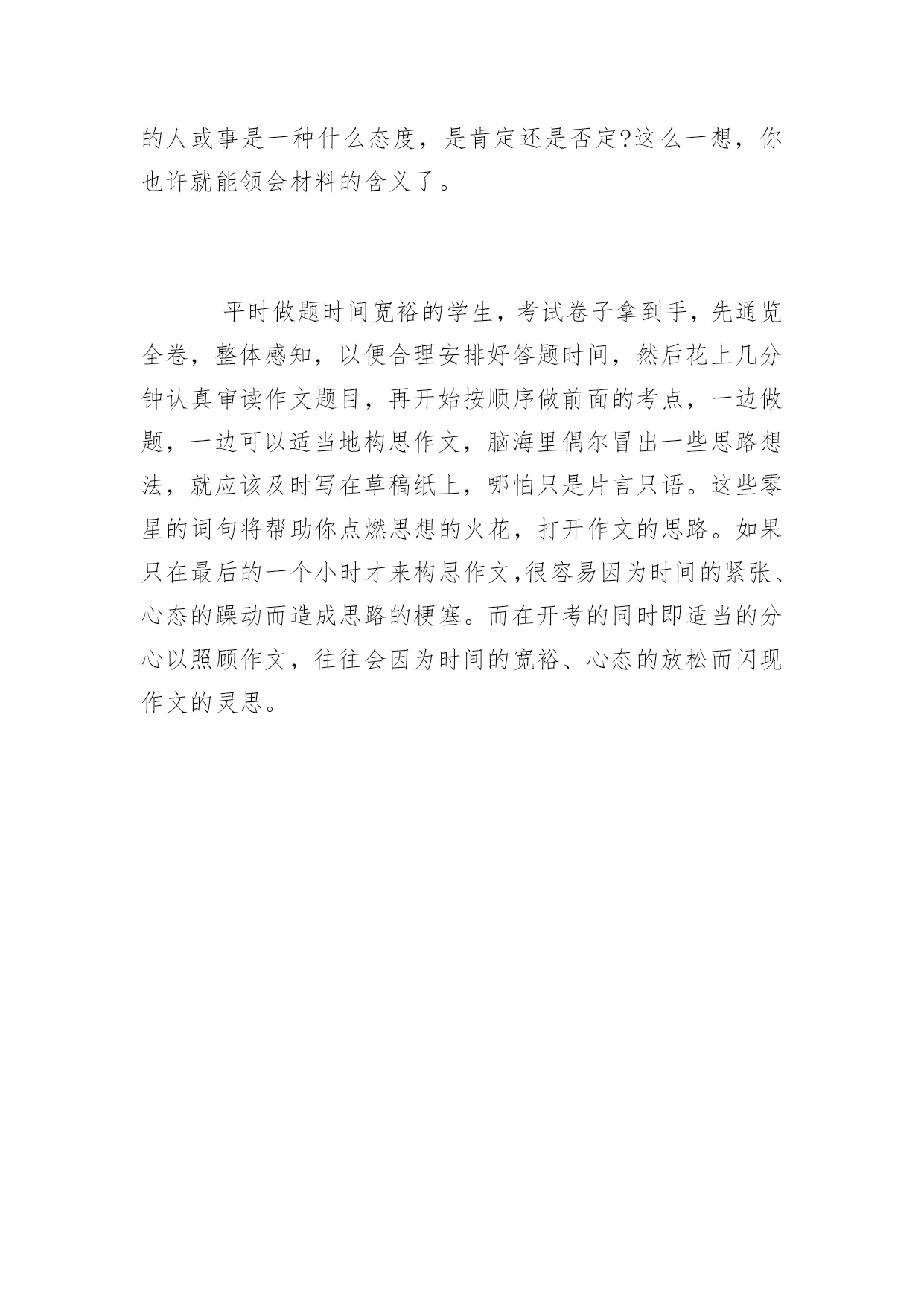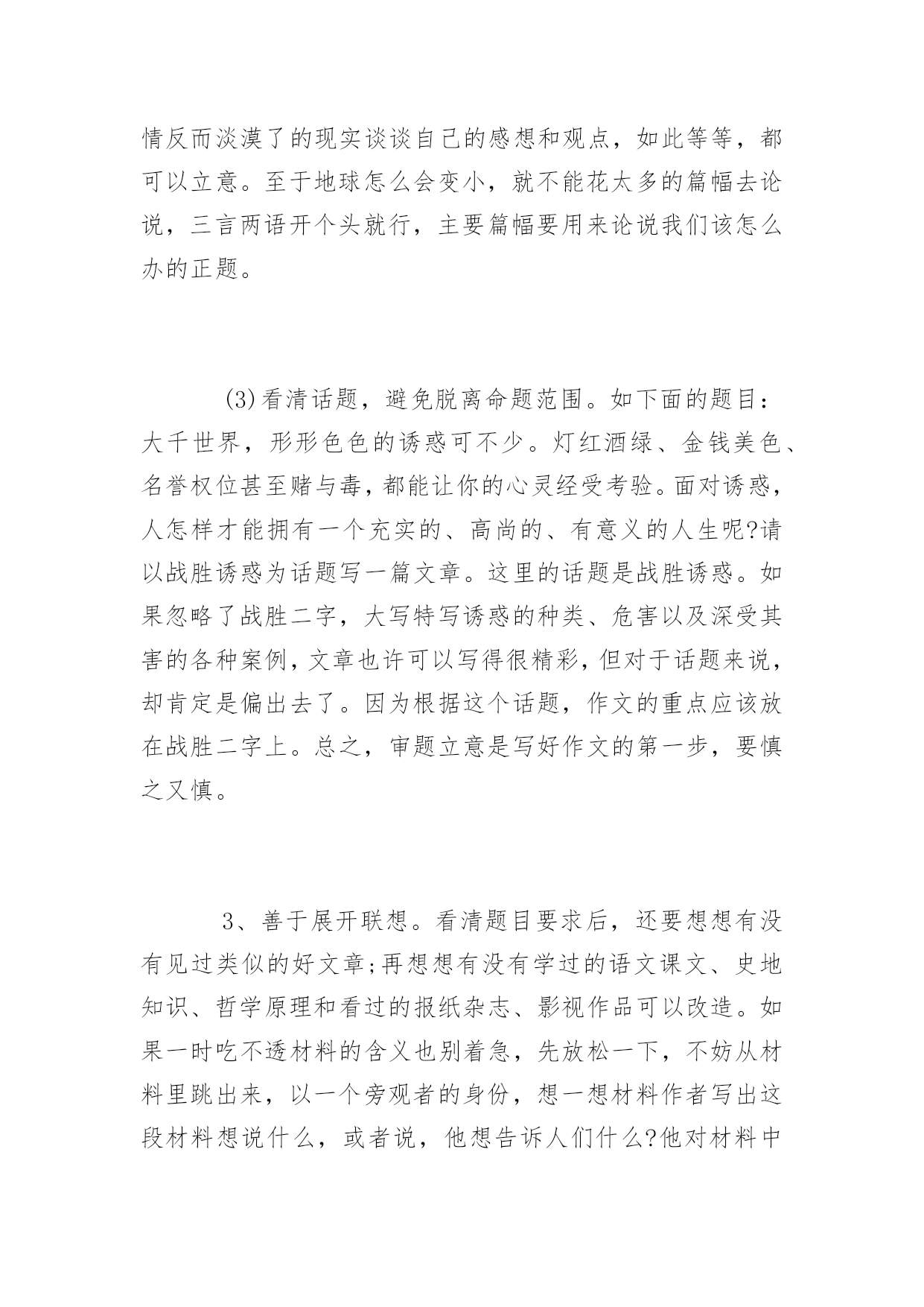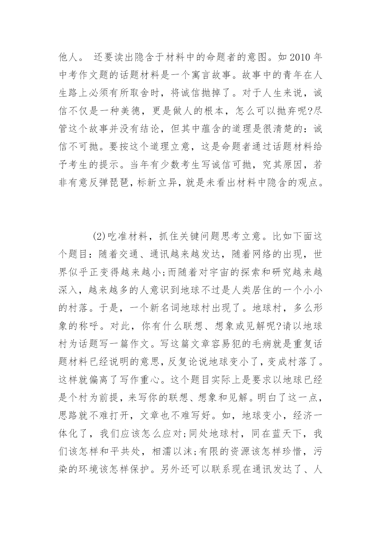 中考话题作文拟题目技巧2017中考话题作文拟题目技巧俗话说标题是文章的眼睛,题好一半文。你的作文如果能取个好题目,自然会让阅卷老师对你刮目相看。好标题一般要符合两个标准:生动形象,富有文学意味;言简意赅,能包孕文章主题。该怎样拟好题目呢?下列方法可供参考:(1)运用修辞如以比喻入题的,《送老人一轮暖阳》(话题:孝);以夸张入题的,《那个障碍粉碎了我》(话题:挫折);以反问入题的,《我是谁?》(话题:假如记忆可以移植);以设问入题的,《我从日本邮局取回了什么?》(话题:效率);以对偶入题的,《一头白发,满山青葱》(话题:环保),《高高山顶立,深深海底行》(话题:人生感悟);以拟人入题的,如《地球就诊记》(话题:环保);以呼告入题的,《回来吧,妈妈!》(话题:亲情);利用谐音《从心做起》(话题:亲情);利用双关,《冬日暖阳》《花落春仍在》(话题:温情)(2)引用妙句引用诗句为题的,如《横看成岭侧成峰》(话题:答案是丰富多采的);引用流行歌词入题的,如《一笑而过》(话题:宽容)《常回家看看》(话题:孝);引用名句入题的,如《救救孩子》(话题:素质教育),《让暴风雨来得更猛烈些吧》(话题:挫折)。(3)反常设悬所拟题目有违常理,故意设置悬念以引起读者的好奇心理。如:《感谢你的敌人》(话题:竞争),《往事并不如烟》(话题:关注生活),《真想做个后进生》、《渴望停电》(话题:素质教育)、《儿嫌母丑》(话题:亲情)。(4)运用间隔号如《风景•湖》《黄山•挑夫》《老庄子•老情歌》《汽笛•布鞋•红腰带》《胡杨•古道•飞天梦》《小桥•流水•人家》。(5)以中心事物入题如:《幸福的黄手绢》《二十四双布鞋》《狗尾巴花》《四十九朵玫瑰》《梯田蘑菇房》《永远的蒲公英》《最后一张落叶生日卡》《母亲的照片》《那棵葱郁的高山榕》《一千张糖纸》《二月二,料豆喷喷香》《萝卜灯》《外婆家的打碗碗花》《魂系三棵树》《青天一缕霞》《九九女儿红》《不沉的船》《穿布鞋的故居》《蓝莹莹的星光》。(6)以中心人物入题。如《藏北姑娘》《第十一位》《对院的女孩》《盲女琴韵》《神农箫女》《阿彩》《我爹我娘》《阿鸽八斤》《最后一个船夫》《昆仑采玉人》《梦萦阿诗玛》《女兵二十一》《父亲的背影》。(7)以中心事件入题如《春夜听雨》《怀念天水》《想念梵高》《迟到》《库姆塔格轶事》《走边城》《追寻鹤故乡》《美丽的约定》。(8)以文章观点入题如《善待生命》《用好网络这把双刃剑》《近墨者黑》《我喜欢出发》《浮生若茶》《守住心中的清月》《苦难是一笔财富》《讲点节操》《起心动念,皆应向善》《站直喽,别趴下》。拟题求新,可用的方法远不止这些,当然考试时如果实在想不出好题目就不要硬想,过多浪费时间,就以话题作标题。题目绝对不要空着不写,否则就白白丢了5分。我提示几个拟题的注意点:1、要有安静沉稳的心态。心定才能气慧神清,气慧神清才能文思敏捷,下笔泉涌。良好的心态对于考试关系重大。其实,题目之难易于其他考生也是一样的,你觉得无从下笔,他人也是感同身受的,何必自增障碍、自乱阵脚呢?2、要看清题目要求。话题作文一般包含提示语、话题、注意事项三部分,要字字细读,句句推敲,千万不能题目要求尚未弄清就匆匆下笔,具体而言,审题时要在以下几方面下足功夫:(1)注意限制条件,包括隐含的,显现的。如果要你联系实际,要看清要你联系的是什么实际,如果没做具体规定,随便你联系什么实际都可,只要能切合题意;如果要你联系自己,那文章中就一定要有我,而不是我们,更不能写他人。还要读出隐含于材料中的命题者的意图。如2010年中考作文题的话题材料是一个寓言故事。故事中的青年在人生路上必须有所取舍时,将诚信抛掉了。对于人生来说,诚信不仅是一种美德,更是做人的根本,怎么可以抛弃呢?尽管这个故事并没有结论,但其中蕴含的道理是很清楚的:诚信不可抛。要按这个道理立意,这是命题者通过话题材料给予考生的提示。当年有少数考生写诚信可抛,究其原因,若非有意反弹琵琶,标新立异,就是未看出材料中隐含的观点。(2)吃准材料,抓住关键问题思考立意。比如下面这个题目:随着交通、通讯越来越发达,随着网络的出现,世界似乎正变得越来越小;而随着对宇宙的探索和研究越来越深入,越来越多的人意识到地球不过是人类居住的一个小小的村落。于是,一个新名词地球村出现了。地球村,多么形象的称呼。对此,你有什么联想、想象或见解呢?请以地球村为话题写一篇作文。写这篇文章容易犯的毛病就是重复话题材料已经说明的意思,反复论说地球变小了,变成村落了。这样就偏离了写作重心。这个题目实际上是要求以地球已经是个村为前提,来写你的联想、想象和见解。明白了这一点,思路就不难打开,文章也