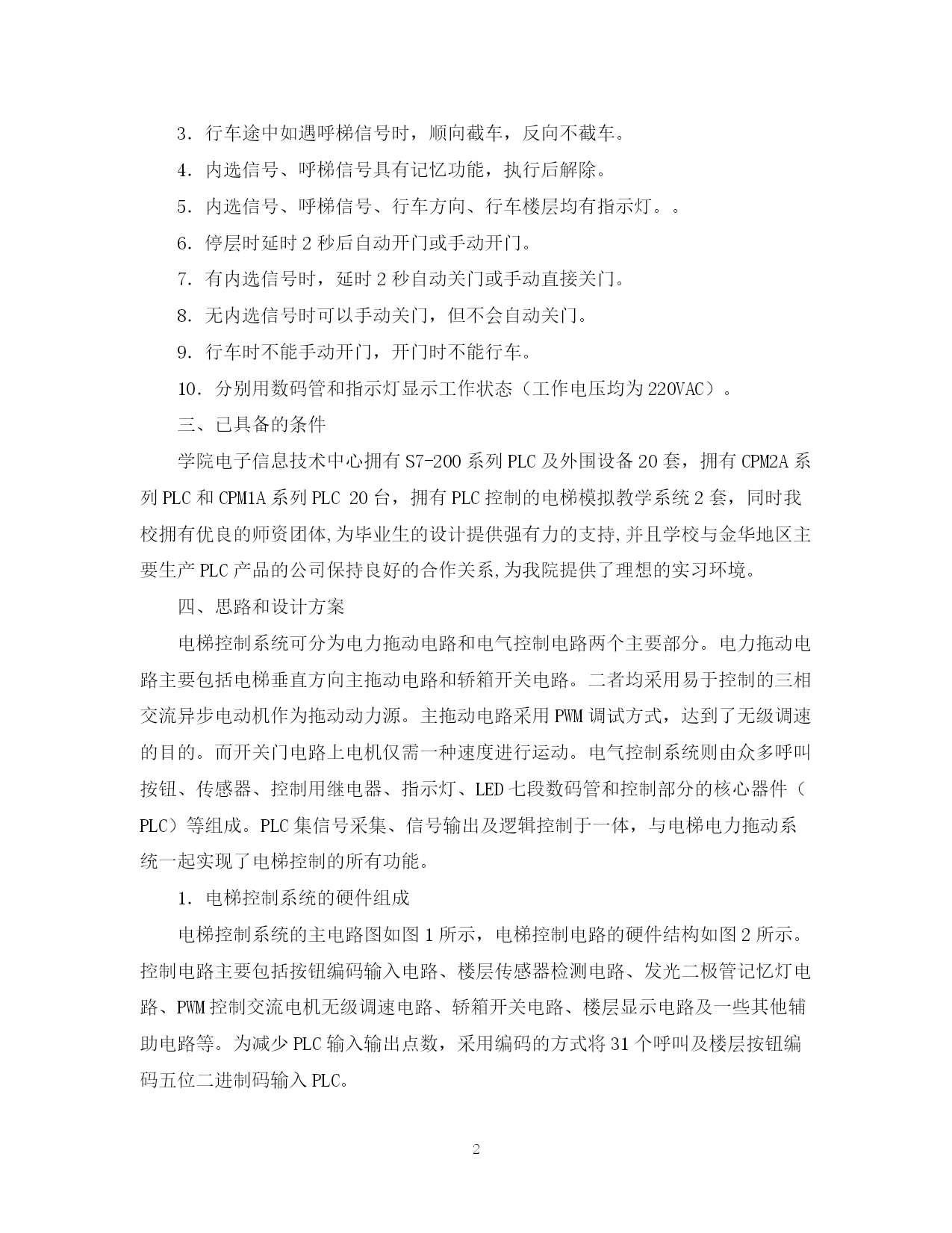 此资料由网络收集而来,如有侵权请告知上传者立即删除。资料共分享,我们负责传递知识。PAGEPAGE3电梯控制器的设计开题报告一、开题报告背景与意义在现代社会和经济活动中,计算机技术、自动控制技术和电力电子技术得到了迅速的发展,不断满足社会经济快速发展和人民生活水平不断提高的需要,电梯作为一种重要的交通运输工具,已经成为城市物质文明的一种标志。电梯在公办大楼、公司、高层住宅、宾馆等场所得到了广泛应用。特别是在高层建筑中,电梯是不可缺少的垂直运输设备。随着高层建筑飞速发展的今天,电梯行业也随之进入了新的发展时期,载人电梯控制技术已经发展到了调频调压调速控制阶段,具有乘坐安全、运行可靠、舒适度较高等特点,其主流控制技术采用PLC控制,具有许多智能化控制功能。本开题报告设计针对我国电梯业的现状,将可编程序控制器(PLC)应用于五层电梯进行逻辑控制,通过合理的选择和设计,不但提高了电梯可靠性、可维护性以及灵活性,同时延长了使用寿命,缩短了电梯的开发周期,并提高了电梯的控制水平,改善了电梯运行的舒适感,使电梯达到了较为理想的控制效果。本文所设计的电梯与传统的电梯相比,在运行上具有良好的舒适感,在生活中可以节约电能,取得了良好的经济效益和社会效益,达到了理想的目的。二、毕业教学环节开题报告的主要内容本开题报告主要任务是完成五层电梯控制器的电路设计、元器件选型、PLC外部接口电路设计、控制器装配图与接线图设计、列出元器件清单、完成PLC程序设计与联机调试等内容。具体控制要求如下:1.由于电梯对控制系统的可靠性和安全性要求极高,主要以逻辑控制为主,通常采用PLC作为控制系统的核心,所以,应用PLC来设计一个5层电梯控制器具有一定的现实意义。2.上行与下行选择由上电梯的人选择信号决定。顺向优先执行,顺向执行完之后再反向执行。3.行车途中如遇呼梯信号时,顺向截车,反向不截车。4.内选信号、呼梯信号具有记忆功能,执行后解除。5.内选信号、呼梯信号、行车方向、行车楼层均有指示灯。。6.停层时延时2秒后自动开门或手动开门。7.有内选信号时,延时2秒自动关门或手动直接关门。8.无内选信号时可以手动关门,但不会自动关门。9.行车时不能手动开门,开门时不能行车。10.分别用数码管和指示灯显示工作状态(工作电压均为220VAC)。三、已具备的条件学院电子信息技术中心拥有S7-200系列PLC及外围设备20套,拥有CPM2A系列PLC和CPM1A系列PLC20台,拥有PLC控制的电梯模拟教学系统2套,同时我校拥有优良的师资团体,为毕业生的设计提供强有力的支持,并且学校与金华地区主要生产PLC产品的公司保持良好的合作关系,为我院提供了理想的实习环境。四、思路和设计方案电梯控制系统可分为电力拖动电路和电气控制电路两个主要部分。电力拖动电路主要包括电梯垂直方向主拖动电路和轿箱开关电路。二者均采用易于控制的三相交流异步电动机作为拖动动力源。主拖动电路采用PWM调试方式,达到了无级调速的目的。而开关门电路上电机仅需一种速度进行运动。电气控制系统则由众多呼叫按钮、传感器、控制用继电器、指示灯、LED七段数码管和控制部分的核心器件(PLC)等组成。PLC集信号采集、信号输出及逻辑控制于一体,与电梯电力拖动系统一起实现了电梯控制的所有功能。1.电梯控制系统的硬件组成电梯控制系统的主电路图如图1所示,电梯控制电路的硬件结构如图2所示。控制电路主要包括按钮编码输入电路、楼层传感器检测电路、发光二极管记忆灯电路、PWM控制交流电机无级调速电路、轿箱开关电路、楼层显示电路及一些其他辅助电路等。为减少PLC输入输出点数,采用编码的方式将31个呼叫及楼层按钮编码五位二进制码输入PLC。(1)系统输入部分系统输入部分分为两个部分,一是直接输入到PLC输入口的开关量信号部分,包括:控制台上的启动按钮、恢复正常工作按钮、消防/检修按钮、强迫上行(下行)按钮部分以及开关门行程到位开关。二是按钮编码输入信号部分。本系统为十层电梯系统,在轿箱内的选层按钮和门厅旁的向上、向下呼叫按钮共有28个之多,采用优先编码的方法将31个按钮信号编为五位二进制码。这里采用四片8位优先编码器4532和五个四二输入端或门4072组成32级优先编码器。(责任编辑:1011)(2)系统输出部分系统的输出部分包括发光二极管记忆灯电路、PWM控制调速电路、轿箱开关门电路和七段数码管楼层显示电路等。在PWM控制直流电机无级调速电路中,PWM产生电路接收来自PLC的八位二进制码,随着码值的改变,其输出的脉冲占空比也相应改变。轿箱开关门电路使用两个继电器、两个行程开关、直流电动机、功率反相器2019等构成控制电路。在七段数码管楼层显示电路中,七段数据管不经专用