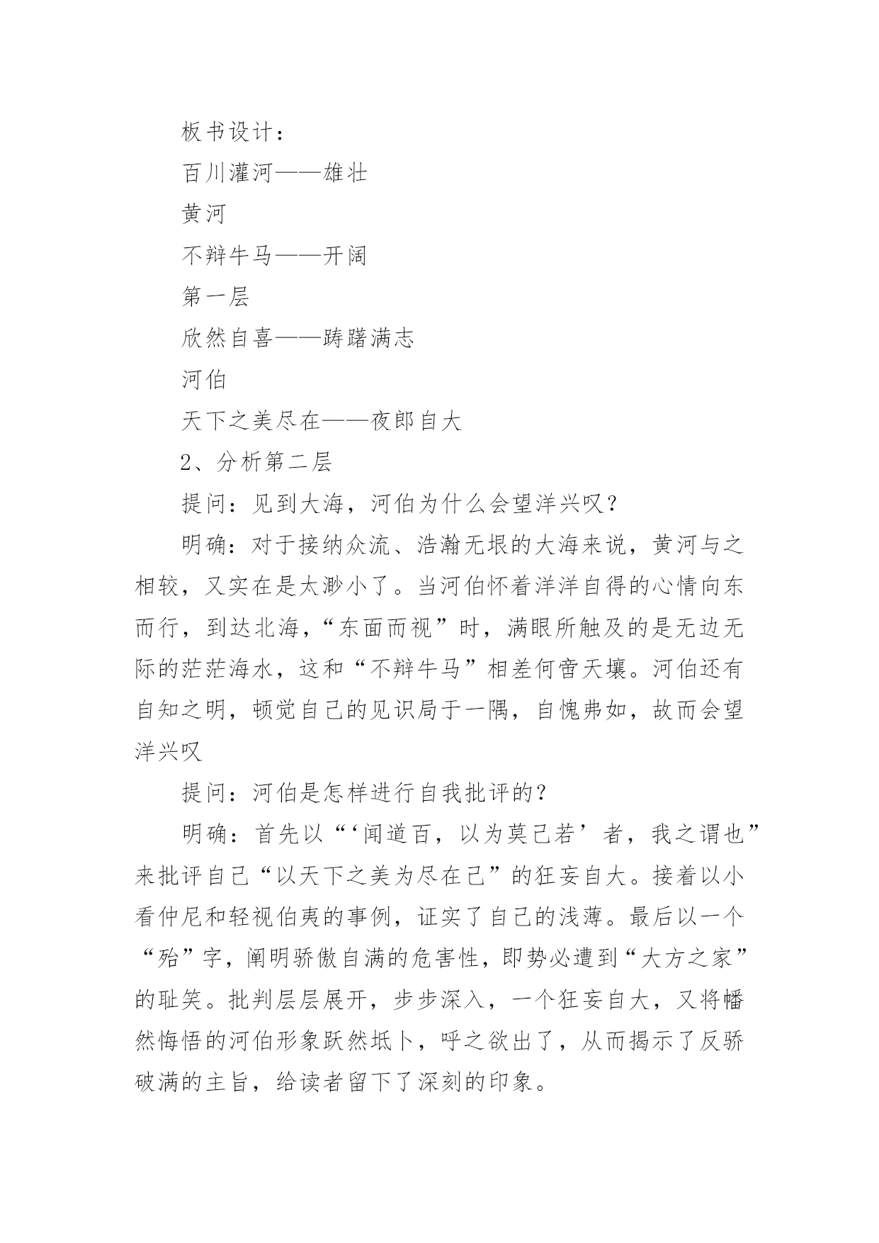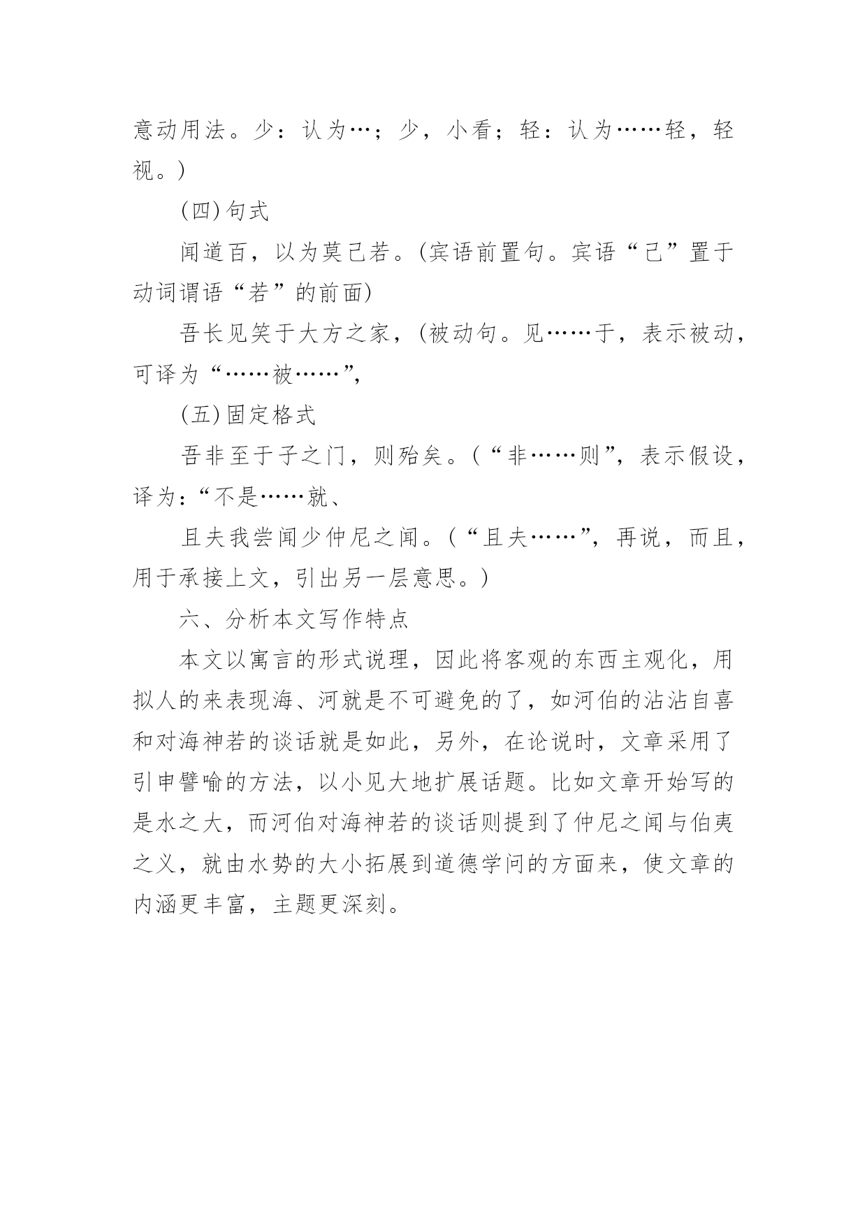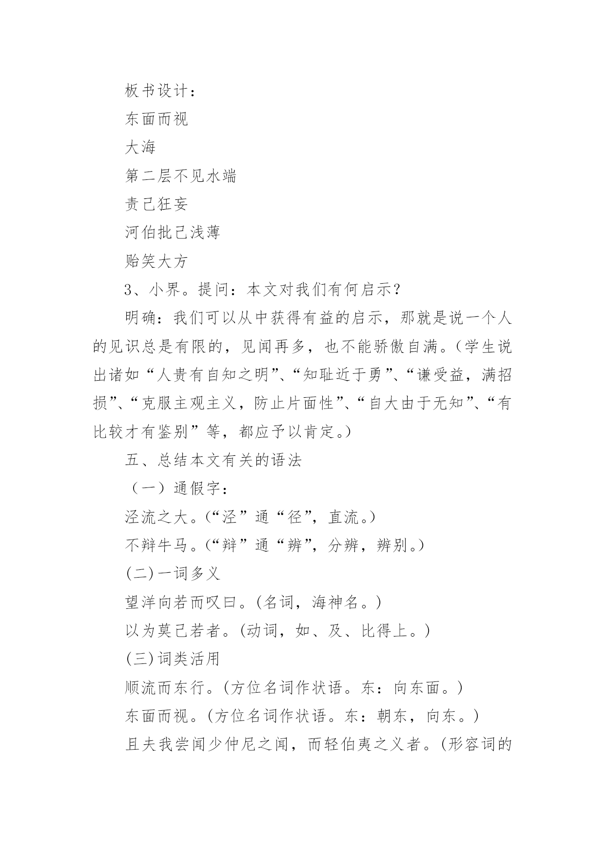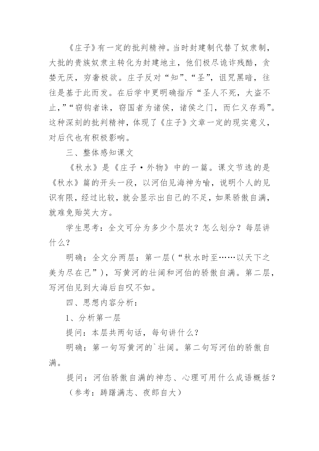 《秋水》教学设计《秋水》教学设计范文一、导入:我们中国的成语源远流长,含义深刻。其中有两个成语,一个是“望洋兴叹”,一个是“贻笑大方”。大家知道它出自什么作品吗?(《庄子秋水》)有谁能说一说这两个成语的意思?(望洋兴叹:本义指在伟大的事物面前感叹自己的藐小,今多比喻要做一件事而力量不够,感到无可奈何。贻笑大方:让内行者见笑。)二、介绍作者及《庄子》庄子,名周.宋蒙城(今河南商丘县附近)人。大约生于公元前四世纪中叶,死于公元前三世纪上半时期,与孟子同时或稍后。他作过蒙城漆园吏;楚威王要拜他为相,他拒绝了。《庄子》是庄周和他的门人、后学者所著。一般人认定,“内篇”七篇是庄子自著,“外篇”十一篇是门人和后学者所著。它是一部唯心主义哲学著作,但具有很高的文学价值。《庄子》一书的思想核心.即清静无为,顺应自然,随从世俗,反对人为,弃圣绝知,否定现实的进步和斗争。《庄子》中所宣扬的社会理想是人类远古,所谓“其卧徐徐,其觉于于”;当是时也,民结绳而用之,甘其食,美其服,乐其俗,安其居,邻国相望,鸡狗之声相闻,民至老死不相往来”。《庄子》有一定的批判精神。当时封建制代替了奴隶制,大批的贵族奴隶主转化为封建地主,他们极尽诡诈残酷,贪婪无厌,穷奢极欲。庄子反对“知”、“圣”,诅咒黑暗,往往是基于此而发。在后学中更明确指斥“圣人不死,大盗不止,”“窃钩者诛,窃国者为诸侯,诸侯之门,而仁义存焉”。这种深刻的批判精神,体现了《庄子》文章一定的现实意义,对后代也有积极影响。三、整体感知课文《秋水》是《庄子·外物》中的一篇。课文节选的是《秋水》篇的开头一段,以河伯见海神为喻,说明个人的见识有限,经过比较,就会显示出自己的不足,如果骄傲自满,就难免贻笑大方。学生思考:全文可分为多少个层次?怎么划分?每层讲什么?明确:全文分两层:第一层(“秋水时至……以天下之美为尽在己”),写黄河的壮阔和河伯的骄傲自满。第二层,写河伯见到大海后自叹不如。四、思想内容分析:1、分析第一层提问:本层共两句话,每句讲什么?明确:第一句写黄河的`壮阔。第二句写河伯的骄傲自满。提问:河伯骄傲自满的神态、心理可用什么成语概括?(参考:踌躇满志、夜郎自大)板书设计:百川灌河——雄壮黄河不辩牛马——开阔第一层欣然自喜——踌躇满志河伯天下之美尽在——夜郎自大2、分析第二层提问:见到大海,河伯为什么会望洋兴叹?明确:对于接纳众流、浩瀚无垠的大海来说,黄河与之相较,又实在是太渺小了。当河伯怀着洋洋自得的心情向东而行,到达北海,“东面而视”时,满眼所触及的是无边无际的茫茫海水,这和“不辩牛马”相差何啻天壤。河伯还有自知之明,顿觉自己的见识局于一隅,自愧弗如,故而会望洋兴叹提问:河伯是怎样进行自我批评的?明确:首先以“‘闻道百,以为莫己若’者,我之谓也”来批评自己“以天下之美为尽在己”的狂妄自大。接着以小看仲尼和轻视伯夷的事例,证实了自己的浅薄。最后以一个“殆”字,阐明骄傲自满的危害性,即势必遭到“大方之家”的耻笑。批判层层展开,步步深入,一个狂妄自大,又将幡然悔悟的河伯形象跃然坻卜,呼之欲出了,从而揭示了反骄破满的主旨,给读者留下了深刻的印象。板书设计:东面而视大海第二层不见水端责己狂妄河伯批己浅薄贻笑大方3、小界。提问:本文对我们有何启示?明确:我们可以从中获得有益的启示,那就是说一个人的见识总是有限的,见闻再多,也不能骄傲自满。(学生说出诸如“人贵有自知之明”、“知耻近于勇”、“谦受益,满招损”、“克服主观主义,防止片面性”、“自大由于无知”、“有比较才有鉴别”等,都应予以肯定。)五、总结本文有关的语法(一)通假字:泾流之大。(“泾”通“径”,直流。)不辩牛马。(“辩”通“辨”,分辨,辨别。)(二)一词多义望洋向若而叹曰。(名词,海神名。)以为莫己若者。(动词,如、及、比得上。)(三)词类活用顺流而东行。(方位名词作状语。东:向东面。)东面而视。(方位名词作状语。东:朝东,向东。)且夫我尝闻少仲尼之闻,而轻伯夷之义者。(形容词的意动用法。少:认为…;少,小看;轻:认为……轻,轻视。)(四)句式闻道百,以为莫己若。(宾语前置句。宾语“己”置于动词谓语“若”的前面)吾长见笑于大方之家,(被动句。见……于,表示被动,可译为“……被……”,(五)固定格式吾非至于子之门,则殆矣。(“非……则”,表示假设,译为:“不是……就、且夫我尝闻少仲尼之闻。(“且夫……”,再说,而且,用于承接上文,引出另一层意思。)六、分析本文写作特点本文以寓言的形式说理,因此将客观的东西主观化,用拟人的来表现海、河就是不可避免的了,如河伯的沾沾自喜和对海神若的谈话就是如此,另外,在论说时,文章采用了引申譬喻的方法,以小见大地扩展话题。比如文章开始写的是水之大,而河伯对海神若的谈话则提到了仲尼之闻与伯夷之义,就由水势的大小拓展到