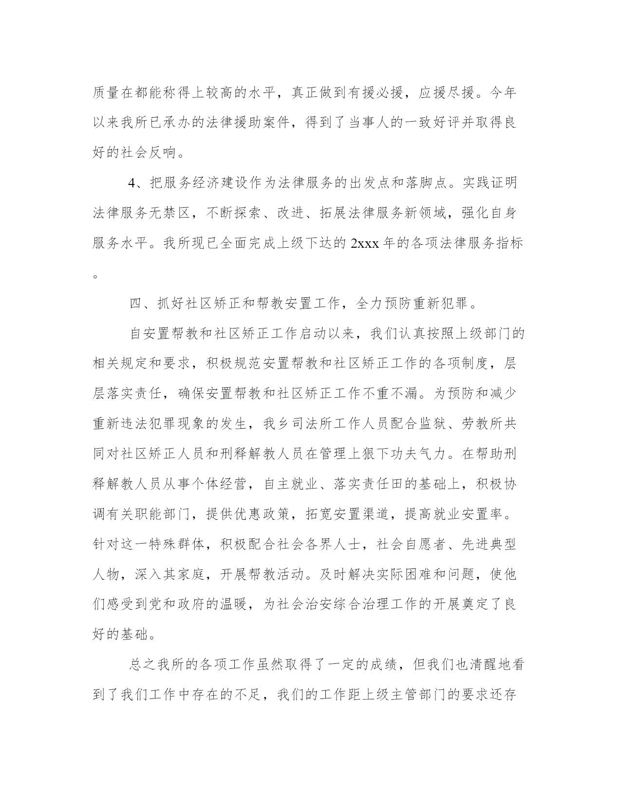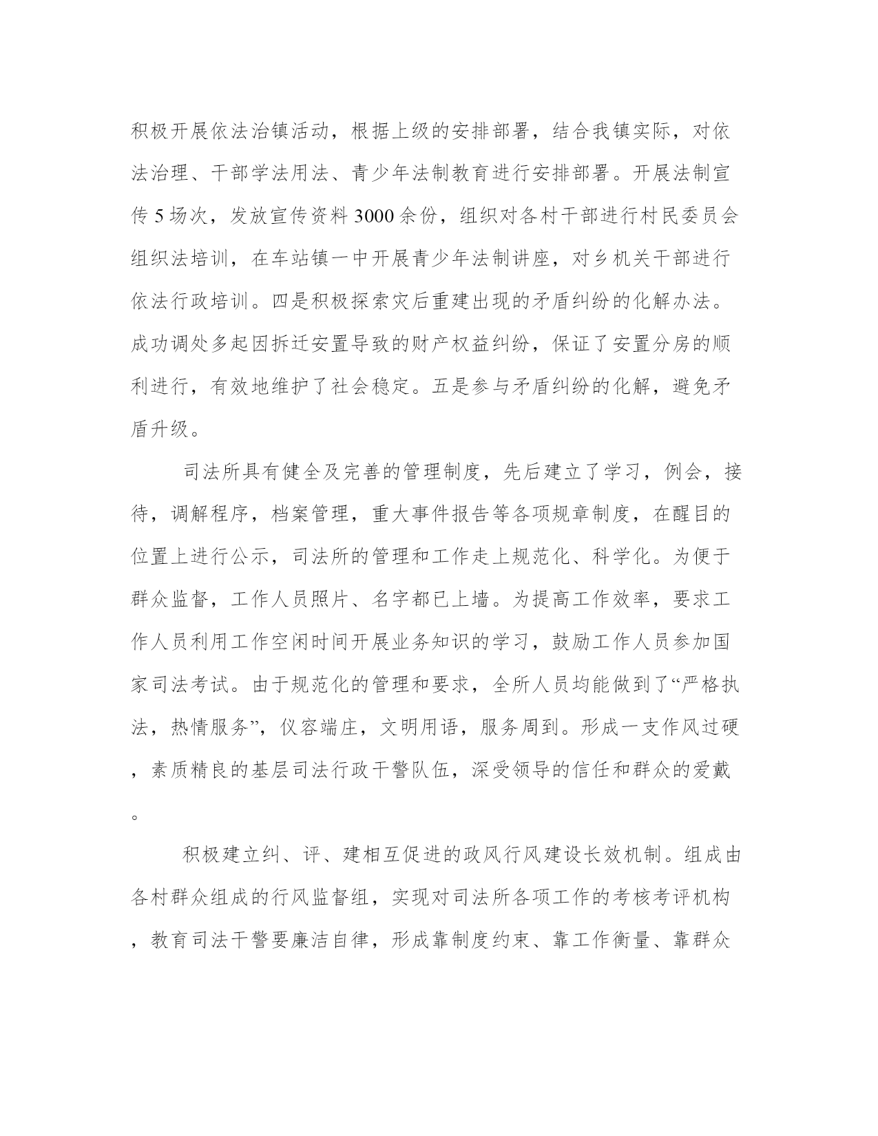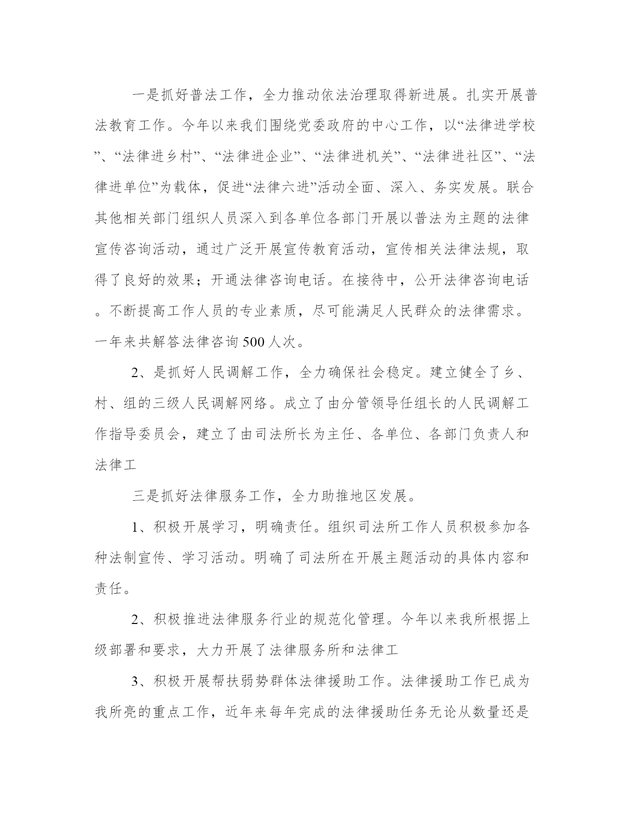 乡镇司法所工作总结(汇总14篇)总结是对过去一定时期的工作、学习或思想情况进行回顾、分析,并做出客观评价的书面材料,它可使零星的、肤浅的、表面的感性认知上升到全面的、系统的、本质的理性认识上来,让我们一起认真地写一份总结吧。什么样的总结才是有效的呢?那么下面我就给大家讲一讲总结怎么写才比较好,我们一起来看一看吧。乡镇司法所工作总结篇一2xxx年以来,在县司法局的正确领导下和乡党委、政府的大力支持帮助下,我所紧紧围绕和服务于乡党委、政府中心工作,坚持以邓小平理论和“三个代表”重要思想为指导,坚持落实科学发展观,深入贯彻党的十七大、十七届五中六中全会精神,认真学习落实上级司法行政工作会议精神,在县司法局的领导和乡党委、政府的有力支持下,紧紧围绕稳定、改革、发展这一主题,强化基础工作,落实责任措施,在维护基层社会稳定中较好地发挥了“第一道防线”的作用,为建设“平安象形”,构建和谐社会做出了突出贡献。现将一年来的工作总结如下:一、抓好建设力度,努力推动司法所规范化建设。在新的历史时期内,各种社会矛盾出现了多发性、多样化的状况。因此,基层调解组织所遇到的民间矛盾纠纷也日益复杂,调解难度日益加大。而我们的基层调解队伍却长期存在着人员变动过快、素质偏低、兼职过多、年龄老化、司法所力量薄弱、调解工作保障不到位等诸多问题。这些问题与在社会主义新农村建设中,发挥司法行政工作尤其是基层司法行政工作的职能作用是极不相适应的。为此,我们紧紧抓住机构设置、人员编制两个关键环节,调整充实工作人员,强化业务培训,努力提高业务素质。为提高司法所维护社会稳定、服务经济发展的效能和层次,乡党委、政府高度重视,在人力、财力、物力上给予大力支持,专门发文抽调2位具有大专以上学历的且工作责任心强的专工作人员充实到原司法所队伍。为了提高基层司法行政工作人员的政治、业务素质和依法行政的能力,我们对新任用的人员一律组织参加上级业务部门的集中岗位培训。除了配强配足工作队伍外,我们还加强基础办公设施的投入,设立了专门的调解室和档案资料室,并配备了1台电脑和1台打印机,大大提高了工作效率,解决了实际问题,也方便了群众办事。二、抓业务知识学习,提高队伍素质。为了提高司法工作人员和人民调解员的工作能力和业务素质,促进对政策法规的理解,我乡司法所坚持每月组织学习业务知识,学习先进的工作经验,通过学习,使基层司法工作人员明确了法律知识、了解司法行政工作的近期工作任务,同时也促进了工作人员之间的交流和沟通。1、抓好四大板块工作,充分发挥司法所的职能作用。一是抓好普法工作,全力推动依法治理取得新进展。扎实开展普法教育工作。今年以来我们围绕党委政府的中心工作,以“法律进学校”、“法律进乡村”、“法律进企业”、“法律进机关”、“法律进社区”、“法律进单位”为载体,促进“法律六进”活动全面、深入、务实发展。联合其他相关部门组织人员深入到各单位各部门开展以普法为主题的法律宣传咨询活动,通过广泛开展宣传教育活动,宣传相关法律法规,取得了良好的效果;开通法律咨询电话。在接待中,公开法律咨询电话。不断提高工作人员的专业素质,尽可能满足人民群众的法律需求。一年来共解答法律咨询500人次。2、是抓好人民调解工作,全力确保社会稳定。建立健全了乡、村、组的三级人民调解网络。成立了由分管领导任组长的人民调解工作指导委员会,建立了由司法所长为主任、各单位、各部门负责人和法律工三是抓好法律服务工作,全力助推地区发展。1、积极开展学习,明确责任。组织司法所工作人员积极参加各种法制宣传、学习活动。明确了司法所在开展主题活动的具体内容和责任。2、积极推进法律服务行业的规范化管理。今年以来我所根据上级部署和要求,大力开展了法律服务所和法律工3、积极开展帮扶弱势群体法律援助工作。法律援助工作已成为我所亮的重点工作,近年来每年完成的法律援助任务无论从数量还是质量在都能称得上较高的水平,真正做到有援必援,应援尽援。今年以来我所已承办的法律援助案件,得到了当事人的一致好评并取得良好的社会反响。4、把服务经济建设作为法律服务的出发点和落脚点。实践证明法律服务无禁区,不断探索、改进、拓展法律服务新领域,强化自身服务水平。我所现已全面完成上级下达的2xxx年的各项法律服务指标。四、抓好社区矫正和帮教安置工作,全力预防重新犯罪。自安置帮教和社区矫正工作启动以来,我们认真按照上级部门的相关规定和要求,积极规范安置帮教和社区矫正工作的各项制度,层层落实责任,确保安置帮教和社区矫正工作不重不漏。为预防和减少重新违法犯罪现象的发生,我乡司法所工作人员配合监狱、劳教所共同对社区矫正人员和刑释解教人员在管理上狠下功夫气力。在帮助刑释解教人员从事个体经营,自主就业、落实责任田的基础上,积极协调有关职能部门,提供优惠政策,拓