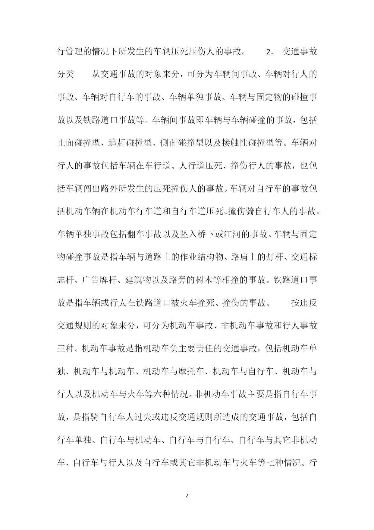 PAGEPAGE3什么是交通事故交通事故1.交通事故的定义交通事故是指车辆在公路、街道或其它道路上运行时引起或所发生的死人、伤人或物件损失的事故。车辆包括机动车和非机动车,机动车中有各类汽车、摩托车和拖拉机等,是用发动机或电动马达驱动的车辆。非机动车中有畜力车和自行车等。道路是指公路、街道、胡同、里巷、广场、停车场等供公众通行的地方。其中供车辆行驶的为车行道,供人通行的为人行道。与道路成为一体的桥梁、隧道、轮渡设施以及作业道路用的电梯等通统包括“道路”中,作为道路附属设施。根据交通事故的定义,下列情况不能算作交通事故。(1)各种军用车辆在野外(不是在道路上,或虽是在道路上但已断绝交通时)演习中所造成的人身伤亡事故或军用车辆之间的碰撞事件。(2)农机车辆在田野或场院作业中,或在往返作业区的途中轧死、轧伤本单位参加劳动的人员。(3)汽车和机械专用车辆在施工现场或厂矿、企业内部所发生的事故。(4)参加体育竞赛的车辆在体育场地所发生的事故。(5)虽是道路或广场但临时作为集体游行场所、文化娱乐场所而发生的挤伤人、踩死踩伤人的事故。(6)利用交通自杀或制造撞车事件。(7)在机关、企业内部,在交通管理部门没有业务进行管理的情况下所发生的车辆压死压伤人的事故。2.交通事故分类从交通事故的对象来分,可分为车辆间事故、车辆对行人的事故、车辆对自行车的事故、车辆单独事故、车辆与固定物的碰撞事故以及铁路道口事故等。车辆间事故即车辆与车辆碰撞的事故,包括正面碰撞型、追赶碰撞型、侧面碰撞型以及接触性碰撞型等。车辆对行人的事故包括车辆在车行道、人行道压死、撞伤行人的事故,也包括车辆闯出路外所发生的压死撞伤人的事故。车辆对自行车的事故包括机动车辆在机动车行车道和自行车道压死、撞伤骑自行车人的事故。车辆单独事故包括翻车事故以及坠入桥下或江河的事故。车辆与固定物碰撞事故是指车辆与道路上的作业结构物、路肩上的灯杆、交通标志杆、广告牌杆、建筑物以及路旁的树木等相撞的事故。铁路道口事故是指车辆或行人在铁路道口被火车撞死、撞伤的事故。按违反交通规则的对象来分,可分为机动车事故、非机动车事故和行人事故三种。机动车事故是指机动车负主要责任的交通事故,包括机动车单独、机动车与机动车、机动车与摩托车、机动车与自行车、机动车与行人以及机动车与火车等六种情况。非机动车事故主要是指自行车事故,是指骑自行车人过失或违反交通规则所造成的交通事故,包括自行车单独、自行车与机动车、自行车与自行车、自行车与其它非机动车、自行车与行人以及自行车或其它非机动车与火车等七种情况。行人事故是指由于行人过失或违反交通规则而发生的交通事故,包括在行人负主要责任的机动车和非机动车压死或撞死行人的事故,也包括火车在铁路道口撞死撞伤人的事故。