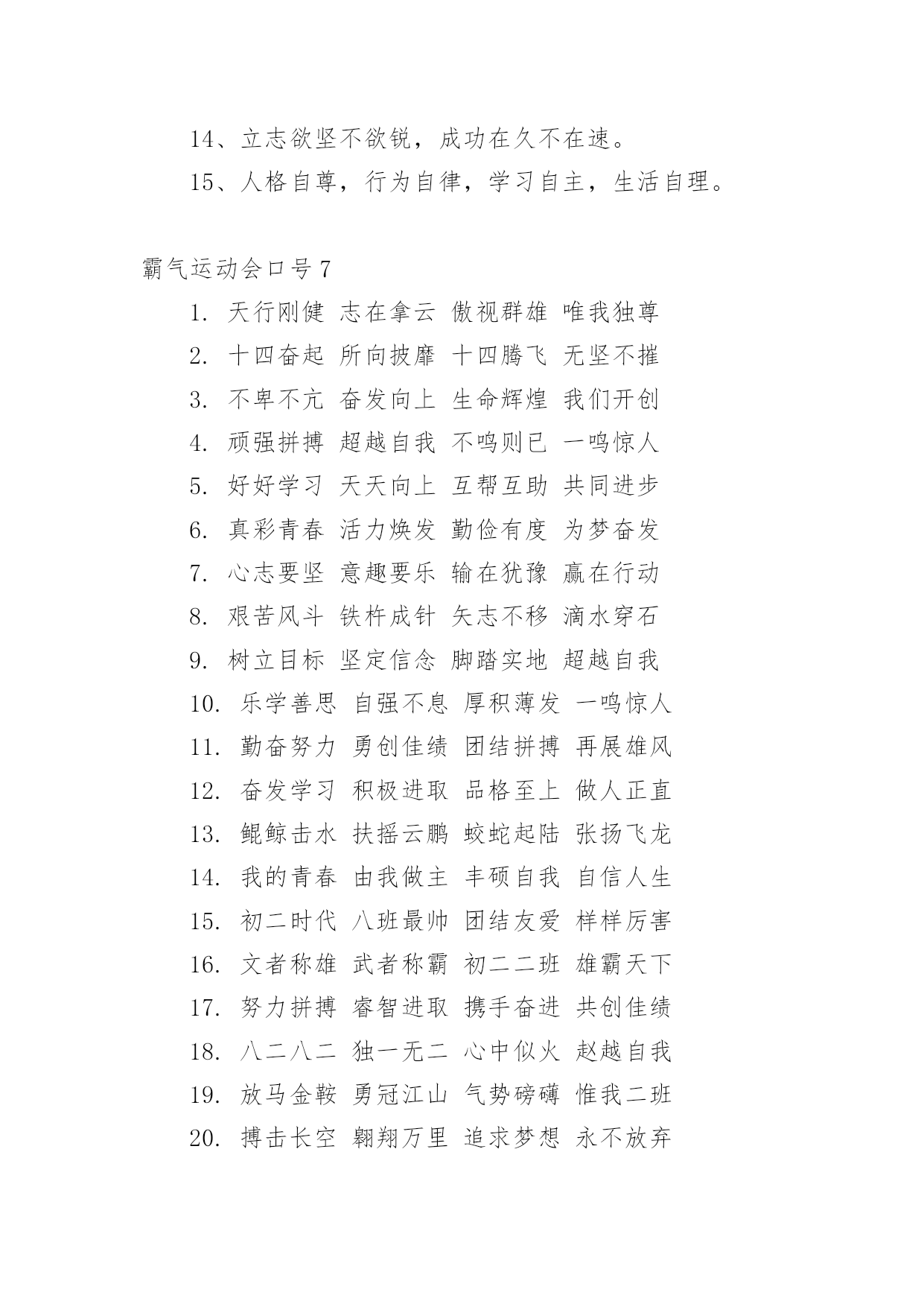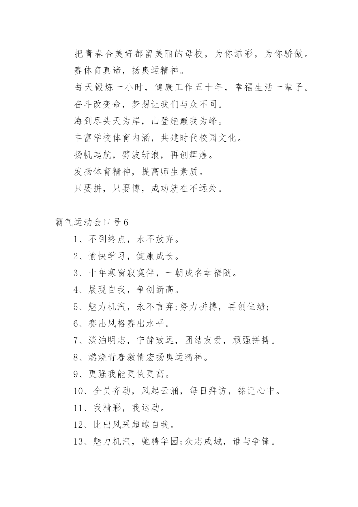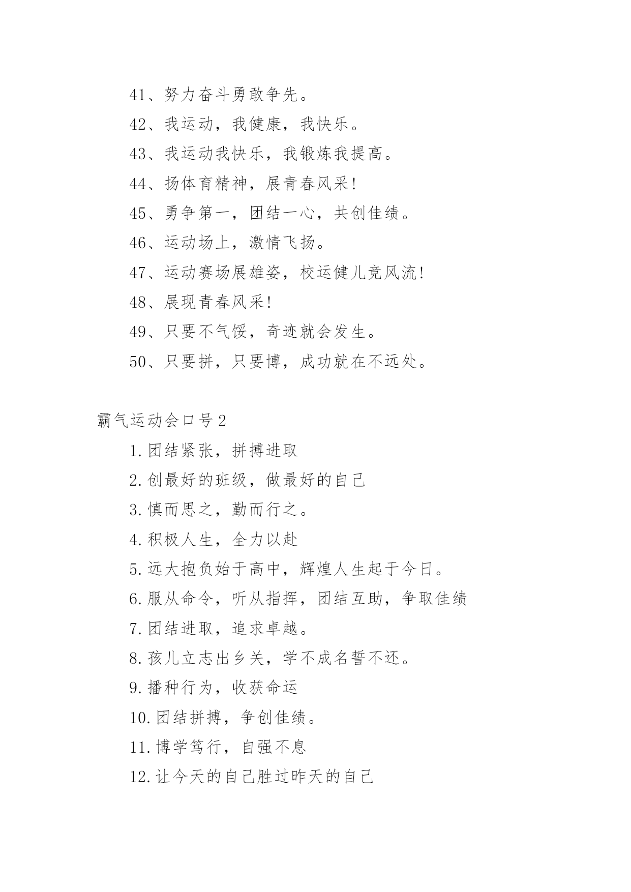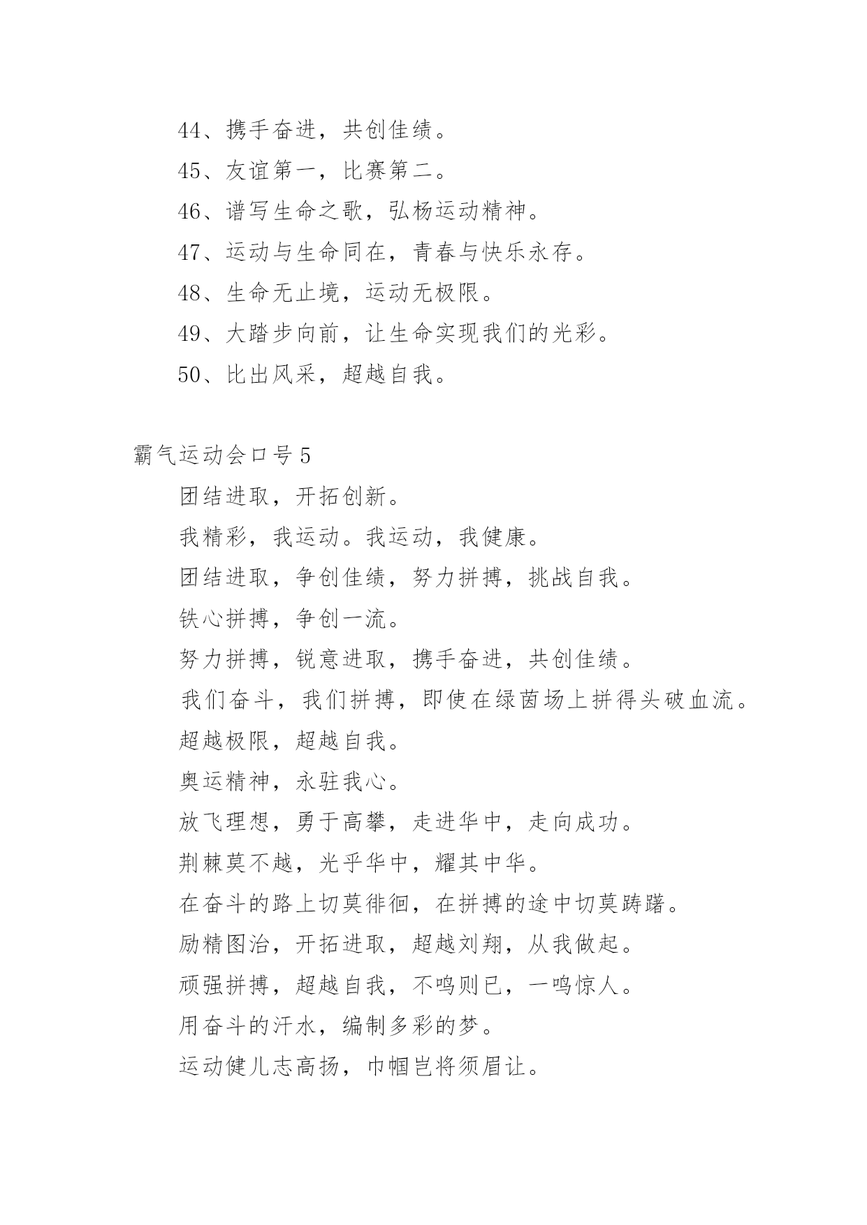 霸气运动会口号在平凡的学习、工作、生活中,大家一定没少看到过口号吧,口号的作用是便于“造势”,形成一种氛围。那么你有真正了解过口号吗?下面是小编为大家收集的霸气运动会口号,供大家参考借鉴,希望可以帮助到有需要的朋友。霸气运动会口号11、风流今朝,尽在高二班。2、敢爱敢恨敢拼敢闯,圆梦在班。3、高二,永不言败!4、拼搏追取善学勤。5、前进,创造出一个又一个的奇迹。6、虔诚治学,豁达泄世,修剪自我。7、青春活力,团结友爱,尊敬师长。8、青春拥抱梦想,拼搏成就辉煌!9、青春运动,友谊健康。10、人类需要体育,世界向往和和平!11、人人关心体育,体育造福人人!12、人生能有几回搏,此时不搏何时搏?13、双腿走遍中华!14、体坛青春际会,校园运动乐章!15、挑战运动极限,演绎健美人生!16、团结拼搏奋斗。17、发展体育运动,增强人民体质!18、团结拼搏向上。19、团结友爱,勤奋好学,激情飞扬。20、团结友谊进步。21、为班集体的荣誉而奋斗!22、文明守纪拥抱胜利。23、我精彩,我运动。24、高二八班,向你问好。25、高二七班,奔向未来!26、高二十班,十全十美,勇夺第一!27、更快更高更强。28、关注十七的表现!期待奇迹的出现!29、挥洒着青春的活力,放飞希望和梦想!30、积极去拼搏。31、激情燃烧希望,励志赢来成功!32、坚信未来的明天将属于我们。33、健体魄强素质,促发展上水平。34、荆棘莫不越,光乎华中,耀其中华!35、精神的动力,源于运动。36、九班九班,久久生辉,永放光芒!37、没有最棒的,只有最好的。38、鸣奏青春旋律,抒写运动乐意!39、年轻健儿显身手,时代骄子竞风流!40、年轻没有失败,只要亮出风采!41、努力奋斗勇敢争先。42、我运动,我健康,我快乐。43、我运动我快乐,我锻炼我提高。44、扬体育精神,展青春风采!45、勇争第一,团结一心,共创佳绩。46、运动场上,激情飞扬。47、运动赛场展雄姿,校运健儿竞风流!48、展现青春风采!49、只要不气馁,奇迹就会发生。50、只要拼,只要博,成功就在不远处。霸气运动会口号21.团结紧张,拼搏进取2.创最好的班级,做最好的自己3.慎而思之,勤而行之。4.积极人生,全力以赴5.远大抱负始于高中,辉煌人生起于今日。6.服从命令,听从指挥,团结互助,争取佳绩7.团结进取,追求卓越。8.孩儿立志出乡关,学不成名誓不还。9.播种行为,收获命运10.团结拼搏,争创佳绩。11.博学笃行,自强不息12.让今天的自己胜过昨天的自己13.健康第一,从我做起。14.聆听·思考·选择15.开拓创新,争优进取霸气运动会口号31.天道酬勤,宁静致远。2.大胆挑战,世界总会让步。3.每一个男生都应该是绅士,每一个女生都应该是淑女4.班级兴亡,我的责任5.玩转草根,足下加油。6.热爱生活,热爱运动。7.草根足球,越踢越欢。8.超越梦想,成就未来。9.力争佳绩,永不言败刘亮10.超越梦想,我心飞扬。11.龙的梦想,龙的魂。龙的精神,龙的人。12.必胜!必胜!中国队,必胜!13.草根足球,越踢越欢14.赛场风云,点燃激情15.拼搏创造奇迹,奋斗书写辉煌16.信心无畏,良心无愧,青春无悔17.人贵知足,唯学不然18.扬理想之风帆,抵成功之彼岸。19.讲和气,育灵气20.学中进,搏中胜霸气运动会口号41、赛体育真谛,扬奥运精神。2、播种油脂,收获疾病;播种运动,收获健康。3、怀学生心,做最强人。4、只为成功想办法,不为失败找理由。5、发展体育运动,增强人民体质。6、济师精英,顽强拼搏;运动健儿,志在必得。7、年轻健儿显身手,时代骄子竞风流。8、挑战自俺,突破极限。9、机汽机汽,勇创佳绩;团结拼搏,展现自我。10、戮力同心,扬我班威。11、积极进取,努力拼搏,磨练意志,强健体魄。12、团结文明,展现风采。13、青春运动,友谊健康。14、团结一心,奋勇向前,追求卓越,争创第一。15、厚德载物,自强不息,团结进取,永争第一。16、音符让音乐有了旋律,运动让生命充满健康。17、每餐七分饱,营养不能少;天天多运动,健康活到老。18、勤学砺志;团结一致,敢于冲刺。19、英姿飒爽,步伐矫健。20、我运动,我快乐,争做时代好少年。21、运动是健康的仙丹,微笑是长寿的灵药。22、我运动,我快乐我锻炼,我提高。23、更强我能,更快更高。24、勇与拼搏,自强不息。25、体育是运动的艺术,运动是体育的灵魂。26、把舵扬帆,锐不可挡,奋勇拼搏,气势非凡。27、顽强拼搏,超越自我,不鸣则已,一鸣惊人。28、磨砺意志,奋发冲刺,团结拼搏,展现自我。29、山中猛虎,水中蛟龙,高二五班,卧虎藏龙。30、时不我待,努力举绩,一鼓作气,挑战佳绩。31、永不言败,勇往直前,携手共进,同创辉煌。32、开展全民健身运动,全面建设小康社会。33、管住你的嘴,
