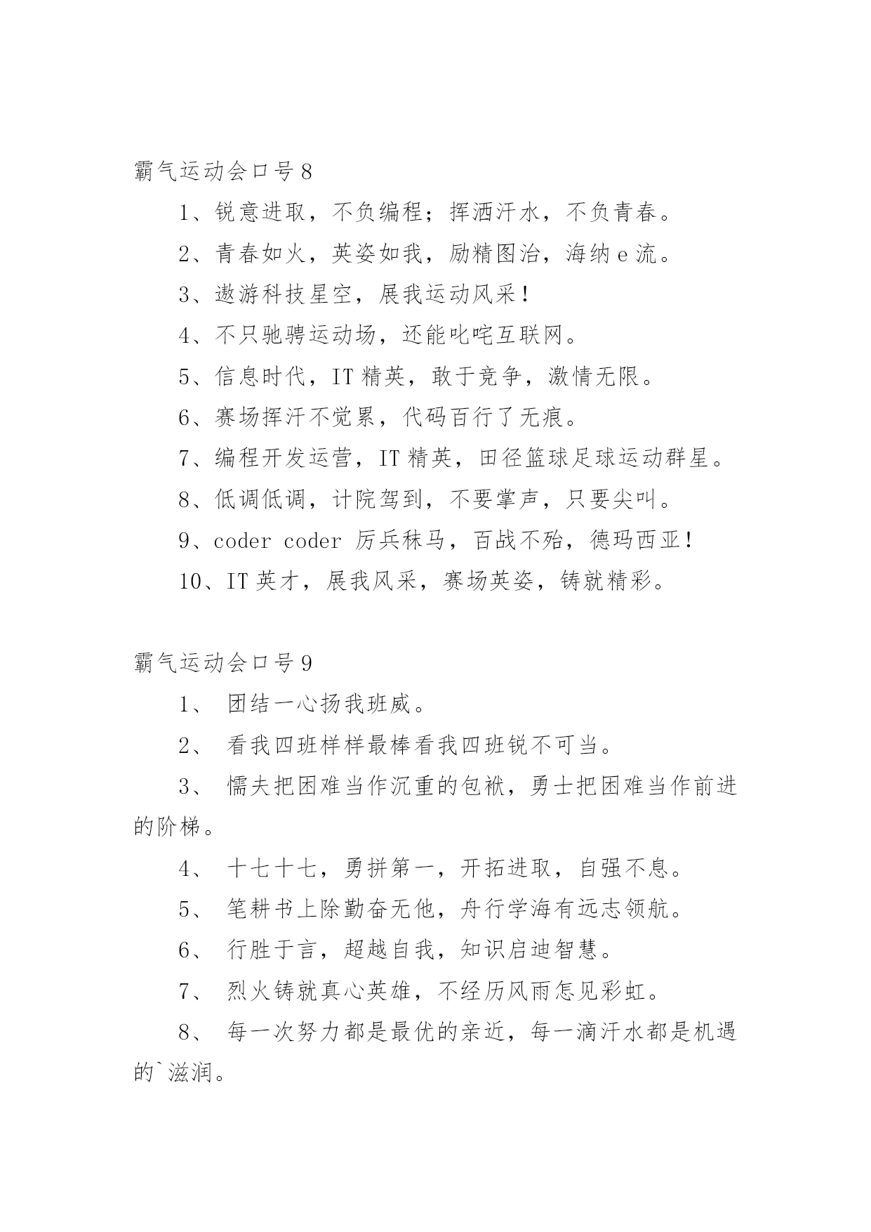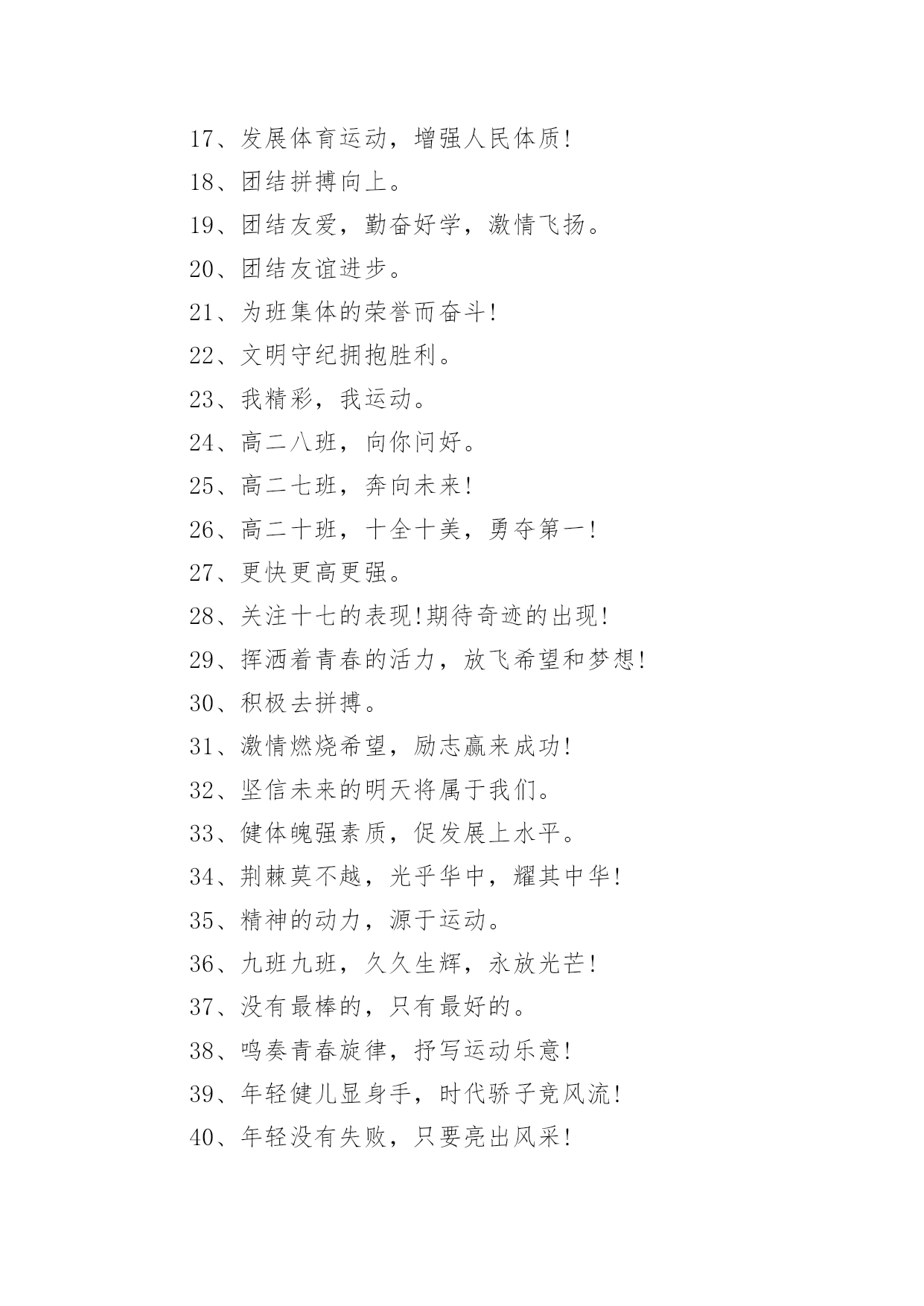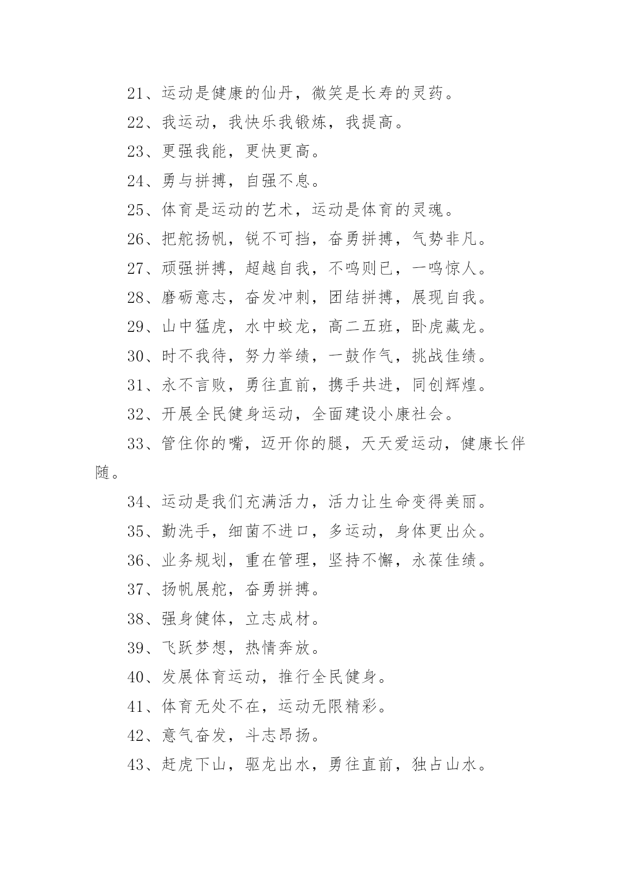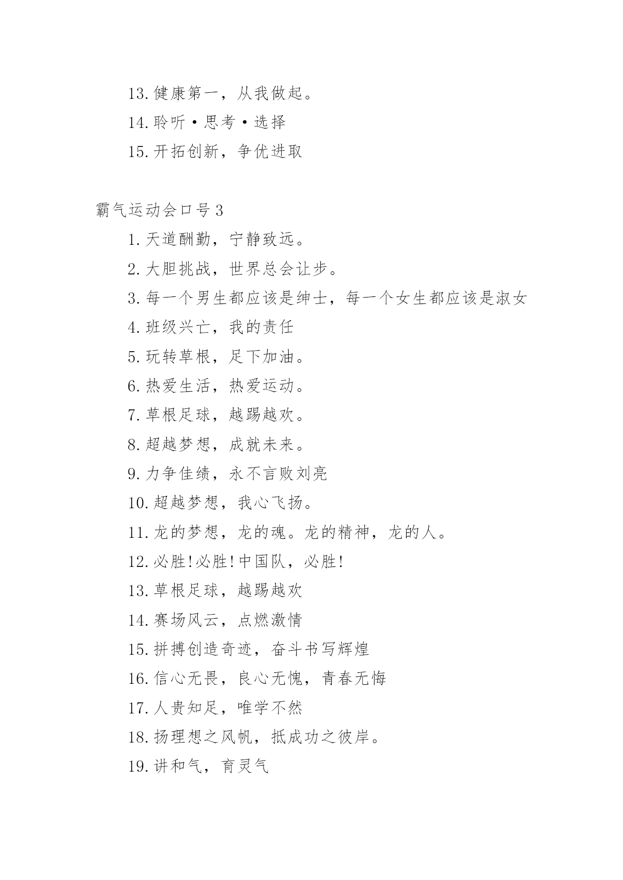 霸气运动会口号在平凡的学习、工作、生活中,大家一定没少看到过口号吧,口号的作用是便于“造势”,形成一种氛围。那么你有真正了解过口号吗?下面是小编为大家收集的霸气运动会口号,供大家参考借鉴,希望可以帮助到有需要的朋友。霸气运动会口号11、风流今朝,尽在高二班。2、敢爱敢恨敢拼敢闯,圆梦在班。3、高二,永不言败!4、拼搏追取善学勤。5、前进,创造出一个又一个的奇迹。6、虔诚治学,豁达泄世,修剪自我。7、青春活力,团结友爱,尊敬师长。8、青春拥抱梦想,拼搏成就辉煌!9、青春运动,友谊健康。10、人类需要体育,世界向往和和平!11、人人关心体育,体育造福人人!12、人生能有几回搏,此时不搏何时搏?13、双腿走遍中华!14、体坛青春际会,校园运动乐章!15、挑战运动极限,演绎健美人生!16、团结拼搏奋斗。17、发展体育运动,增强人民体质!18、团结拼搏向上。19、团结友爱,勤奋好学,激情飞扬。20、团结友谊进步。21、为班集体的荣誉而奋斗!22、文明守纪拥抱胜利。23、我精彩,我运动。24、高二八班,向你问好。25、高二七班,奔向未来!26、高二十班,十全十美,勇夺第一!27、更快更高更强。28、关注十七的表现!期待奇迹的出现!29、挥洒着青春的活力,放飞希望和梦想!30、积极去拼搏。31、激情燃烧希望,励志赢来成功!32、坚信未来的明天将属于我们。33、健体魄强素质,促发展上水平。34、荆棘莫不越,光乎华中,耀其中华!35、精神的动力,源于运动。36、九班九班,久久生辉,永放光芒!37、没有最棒的,只有最好的。38、鸣奏青春旋律,抒写运动乐意!39、年轻健儿显身手,时代骄子竞风流!40、年轻没有失败,只要亮出风采!41、努力奋斗勇敢争先。42、我运动,我健康,我快乐。43、我运动我快乐,我锻炼我提高。44、扬体育精神,展青春风采!45、勇争第一,团结一心,共创佳绩。46、运动场上,激情飞扬。47、运动赛场展雄姿,校运健儿竞风流!48、展现青春风采!49、只要不气馁,奇迹就会发生。50、只要拼,只要博,成功就在不远处。霸气运动会口号21.团结紧张,拼搏进取2.创最好的班级,做最好的自己3.慎而思之,勤而行之。4.积极人生,全力以赴5.远大抱负始于高中,辉煌人生起于今日。6.服从命令,听从指挥,团结互助,争取佳绩7.团结进取,追求卓越。8.孩儿立志出乡关,学不成名誓不还。9.播种行为,收获命运10.团结拼搏,争创佳绩。11.博学笃行,自强不息12.让今天的自己胜过昨天的自己13.健康第一,从我做起。14.聆听·思考·选择15.开拓创新,争优进取霸气运动会口号31.天道酬勤,宁静致远。2.大胆挑战,世界总会让步。3.每一个男生都应该是绅士,每一个女生都应该是淑女4.班级兴亡,我的责任5.玩转草根,足下加油。6.热爱生活,热爱运动。7.草根足球,越踢越欢。8.超越梦想,成就未来。9.力争佳绩,永不言败刘亮10.超越梦想,我心飞扬。11.龙的梦想,龙的魂。龙的精神,龙的人。12.必胜!必胜!中国队,必胜!13.草根足球,越踢越欢14.赛场风云,点燃激情15.拼搏创造奇迹,奋斗书写辉煌16.信心无畏,良心无愧,青春无悔17.人贵知足,唯学不然18.扬理想之风帆,抵成功之彼岸。19.讲和气,育灵气20.学中进,搏中胜霸气运动会口号41、赛体育真谛,扬奥运精神。2、播种油脂,收获疾病;播种运动,收获健康。3、怀学生心,做最强人。4、只为成功想办法,不为失败找理由。5、发展体育运动,增强人民体质。6、济师精英,顽强拼搏;运动健儿,志在必得。7、年轻健儿显身手,时代骄子竞风流。8、挑战自俺,突破极限。9、机汽机汽,勇创佳绩;团结拼搏,展现自我。10、戮力同心,扬我班威。11、积极进取,努力拼搏,磨练意志,强健体魄。12、团结文明,展现风采。13、青春运动,友谊健康。14、团结一心,奋勇向前,追求卓越,争创第一。15、厚德载物,自强不息,团结进取,永争第一。16、音符让音乐有了旋律,运动让生命充满健康。17、每餐七分饱,营养不能少;天天多运动,健康活到老。18、勤学砺志;团结一致,敢于冲刺。19、英姿飒爽,步伐矫健。20、我运动,我快乐,争做时代好少年。21、运动是健康的仙丹,微笑是长寿的灵药。22、我运动,我快乐我锻炼,我提高。23、更强我能,更快更高。24、勇与拼搏,自强不息。25、体育是运动的艺术,运动是体育的灵魂。26、把舵扬帆,锐不可挡,奋勇拼搏,气势非凡。27、顽强拼搏,超越自我,不鸣则已,一鸣惊人。28、磨砺意志,奋发冲刺,团结拼搏,展现自我。29、山中猛虎,水中蛟龙,高二五班,卧虎藏龙。30、时不我待,努力举绩,一鼓作气,挑战佳绩。31、永不言败,勇往直前,携手共进,同创辉煌。32、开展全民健身运动,全面建设小康社会。33、管住你的嘴,