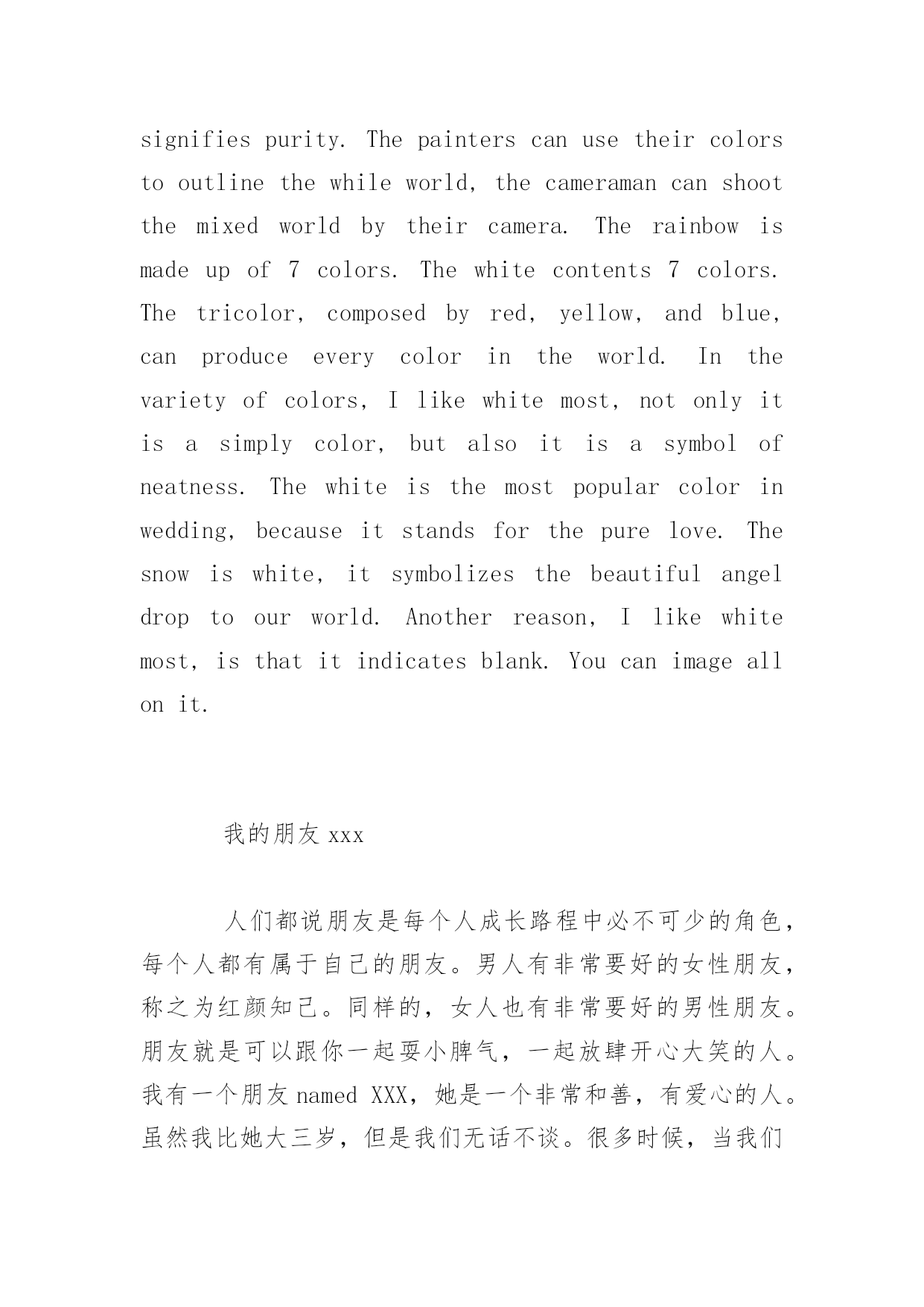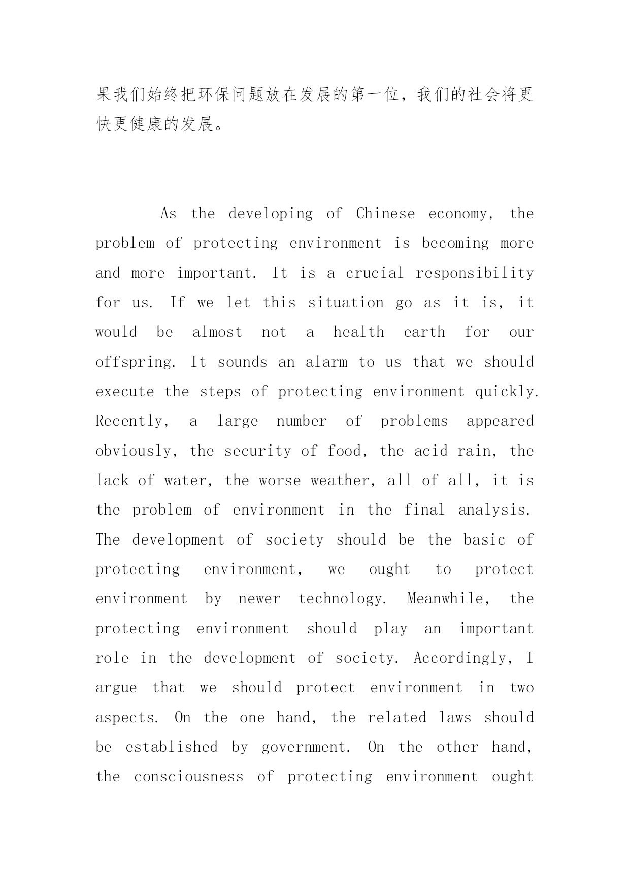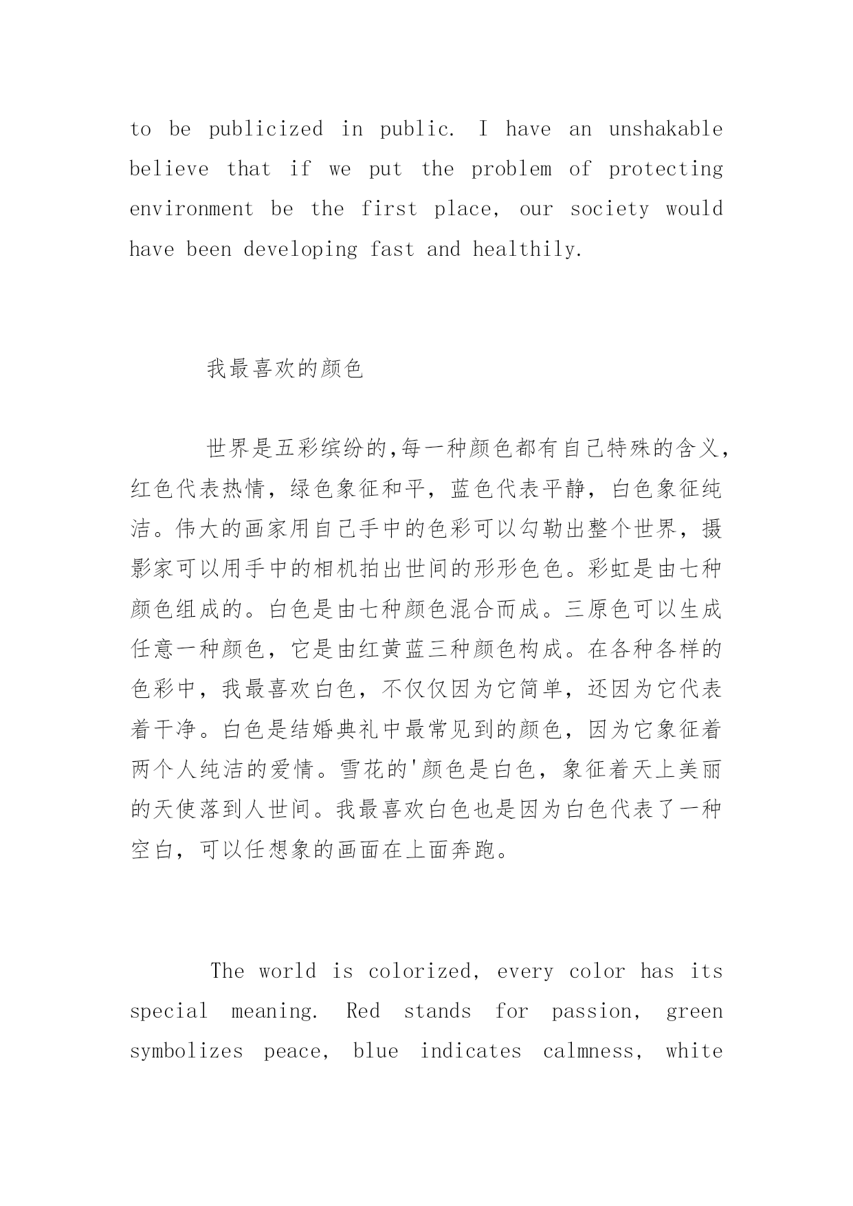 高考英语作文高考英语作文范文5篇导语:历年高考英语中,高考英语作文都是很重要的一项得分点。下面是小编为大家整理的英语作文范文,希望对大家有所帮助。更多相关的知识,请关注CNFLA学习网!环境保护随着中国经济的发展,环境问题也越来越突出。保护环境,成了我们重要的责任。如果我们再让情况如此下去的话,留给我们后代的恐怕就不是一个健康的地球了。这给我们敲响了一个警钟,那就是要尽快实施环境保护的一些措施。最近,很多问题越来越明显的出现在公众的眼中。食品安全问题、酸雨问题、水资源缺乏问题、气候问题,allofall,归根结底都是环境的问题。社会的发展应该成为环境保护的基石,我们应该用不断产生的新技术来保护环境。同时,环境的保护应该成为社会发展的`一个重要的部分。综上所述,我认为环境的保护应该从两个方面来实施。Ontheonehand,相应的法律应该被制定by政府。Ontheotherhand,环保意识应该在公众中间进行广泛的宣传。我相信如果我们始终把环保问题放在发展的第一位,我们的社会将更快更健康的发展。AsthedevelopingofChineseeconomy,theproblemofprotectingenvironmentisbecomingmoreandmoreimportant.Itisacrucialresponsibilityforus.Ifweletthissituationgoasitis,itwouldbealmostnotahealthearthforouroffspring.Itsoundsanalarmtousthatweshouldexecutethestepsofprotectingenvironmentquickly.Recently,alargenumberofproblemsappearedobviously,thesecurityoffood,theacidrain,thelackofwater,theworseweather,allofall,itistheproblemofenvironmentinthefinalanalysis.Thedevelopmentofsocietyshouldbethebasicofprotectingenvironment,weoughttoprotectenvironmentbynewertechnology.Meanwhile,theprotectingenvironmentshouldplayanimportantroleinthedevelopmentofsociety.Accordingly,Iarguethatweshouldprotectenvironmentintwoaspects.Ontheonehand,therelatedlawsshouldbeestablishedbygovernment.Ontheotherhand,theconsciousnessofprotectingenvironmentoughttobepublicizedinpublic.Ihaveanunshakablebelievethatifweputtheproblemofprotectingenvironmentbethefirstplace,oursocietywouldhavebeendevelopingfastandhealthily.我最喜欢的颜色世界是五彩缤纷的,每一种颜色都有自己特殊的含义,红色代表热情,绿色象征和平,蓝色代表平静,白色象征纯洁。伟大的画家用自己手中的色彩可以勾勒出整个世界,摄影家可以用手中的相机拍出世间的形形色色。彩虹是由七种颜色组成的。白色是由七种颜色混合而成。三原色可以生成任意一种颜色,它是由红黄蓝三种颜色构成。在各种各样的色彩中,我最喜欢白色,不仅仅因为它简单,还因为它代表着干净。白色是结婚典礼中最常见到的颜色,因为它象征着两个人纯洁的爱情。雪花的'颜色是白色,象征着天上美丽的天使落到人世间。我最喜欢白色也是因为白色代表了一种空白,可以任想象的画面在上面奔跑。Theworldiscolorized,everycolorhasitsspecialmeaning.Redstandsforpassion,greensymbolizespeace,blueindicatescalmness,whitesignifiespurity.Thepainterscanusetheircolorstooutlinethewhileworld,thecameramancanshootthemixedworldbytheircamera.Therainbowismadeupof7colors.Thewhitecontents7colo