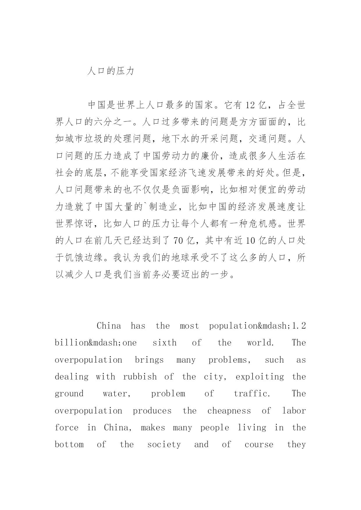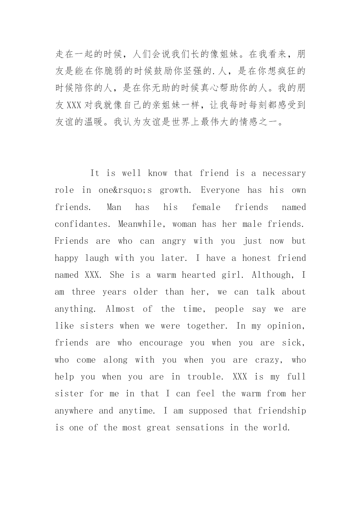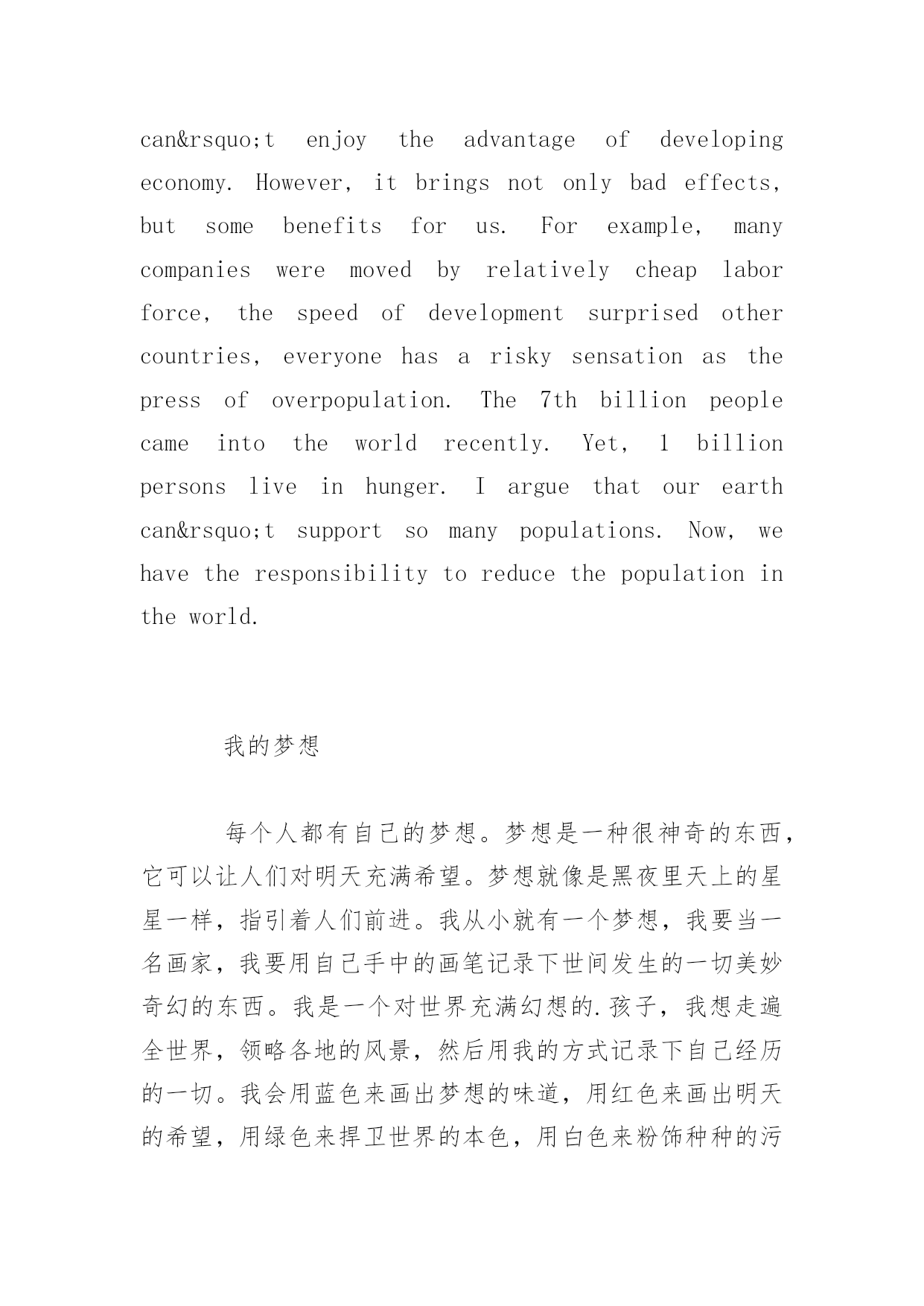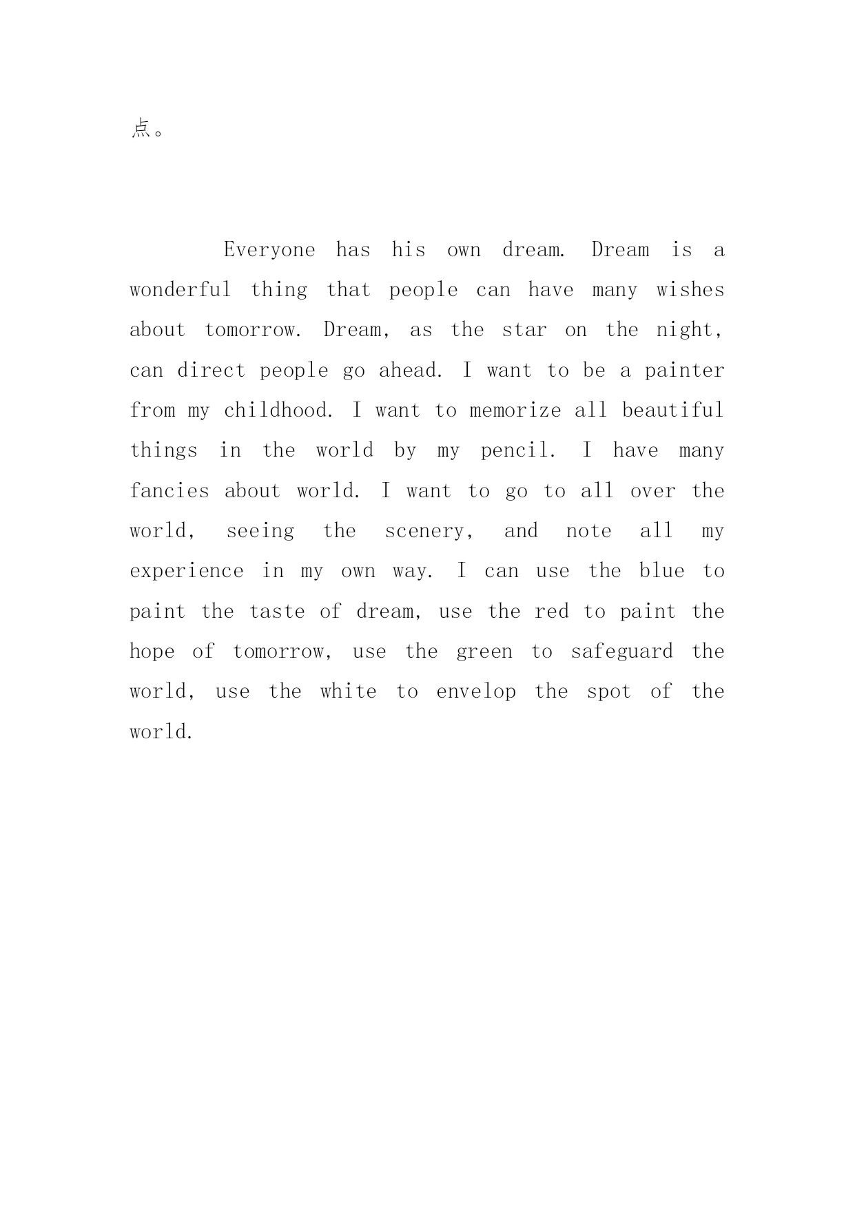 高考英语作文高考英语作文范文5篇导语:历年高考英语中,高考英语作文都是很重要的一项得分点。下面是小编为大家整理的英语作文范文,希望对大家有所帮助。更多相关的知识,请关注CNFLA学习网!环境保护随着中国经济的发展,环境问题也越来越突出。保护环境,成了我们重要的责任。如果我们再让情况如此下去的话,留给我们后代的恐怕就不是一个健康的地球了。这给我们敲响了一个警钟,那就是要尽快实施环境保护的一些措施。最近,很多问题越来越明显的出现在公众的眼中。食品安全问题、酸雨问题、水资源缺乏问题、气候问题,allofall,归根结底都是环境的问题。社会的发展应该成为环境保护的基石,我们应该用不断产生的新技术来保护环境。同时,环境的保护应该成为社会发展的`一个重要的部分。综上所述,我认为环境的保护应该从两个方面来实施。Ontheonehand,相应的法律应该被制定by政府。Ontheotherhand,环保意识应该在公众中间进行广泛的宣传。我相信如果我们始终把环保问题放在发展的第一位,我们的社会将更快更健康的发展。AsthedevelopingofChineseeconomy,theproblemofprotectingenvironmentisbecomingmoreandmoreimportant.Itisacrucialresponsibilityforus.Ifweletthissituationgoasitis,itwouldbealmostnotahealthearthforouroffspring.Itsoundsanalarmtousthatweshouldexecutethestepsofprotectingenvironmentquickly.Recently,alargenumberofproblemsappearedobviously,thesecurityoffood,theacidrain,thelackofwater,theworseweather,allofall,itistheproblemofenvironmentinthefinalanalysis.Thedevelopmentofsocietyshouldbethebasicofprotectingenvironment,weoughttoprotectenvironmentbynewertechnology.Meanwhile,theprotectingenvironmentshouldplayanimportantroleinthedevelopmentofsociety.Accordingly,Iarguethatweshouldprotectenvironmentintwoaspects.Ontheonehand,therelatedlawsshouldbeestablishedbygovernment.Ontheotherhand,theconsciousnessofprotectingenvironmentoughttobepublicizedinpublic.Ihaveanunshakablebelievethatifweputtheproblemofprotectingenvironmentbethefirstplace,oursocietywouldhavebeendevelopingfastandhealthily.我最喜欢的颜色世界是五彩缤纷的,每一种颜色都有自己特殊的含义,红色代表热情,绿色象征和平,蓝色代表平静,白色象征纯洁。伟大的画家用自己手中的色彩可以勾勒出整个世界,摄影家可以用手中的相机拍出世间的形形色色。彩虹是由七种颜色组成的。白色是由七种颜色混合而成。三原色可以生成任意一种颜色,它是由红黄蓝三种颜色构成。在各种各样的色彩中,我最喜欢白色,不仅仅因为它简单,还因为它代表着干净。白色是结婚典礼中最常见到的颜色,因为它象征着两个人纯洁的爱情。雪花的'颜色是白色,象征着天上美丽的天使落到人世间。我最喜欢白色也是因为白色代表了一种空白,可以任想象的画面在上面奔跑。Theworldiscolorized,everycolorhasitsspecialmeaning.Redstandsforpassion,greensymbolizespeace,blueindicatescalmness,whitesignifiespurity.Thepainterscanusetheircolorstooutlinethewhileworld,thecameramancanshootthemixedworldbytheircamera.Therainbowismadeupof7colors.Thewhitecontents7colo