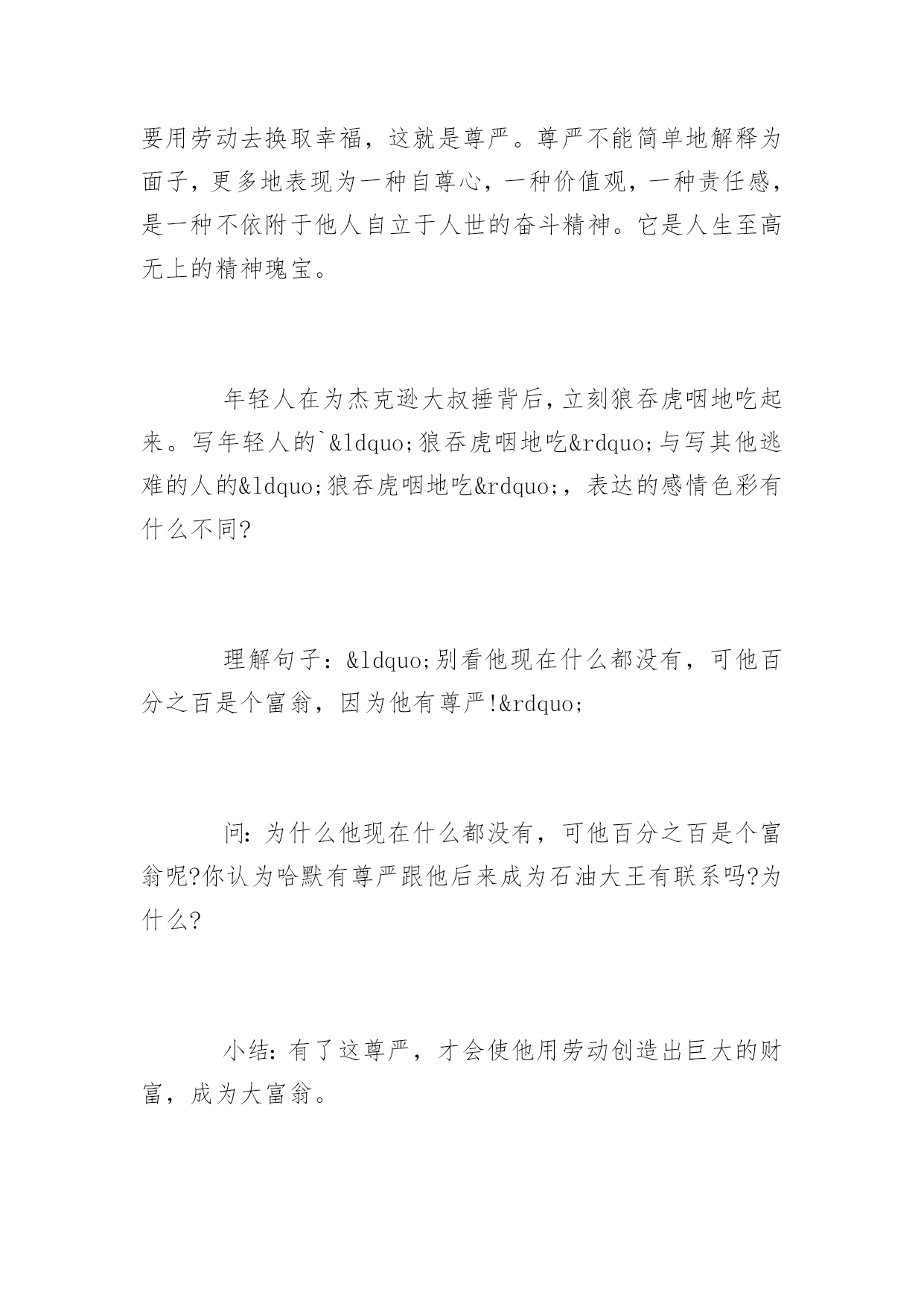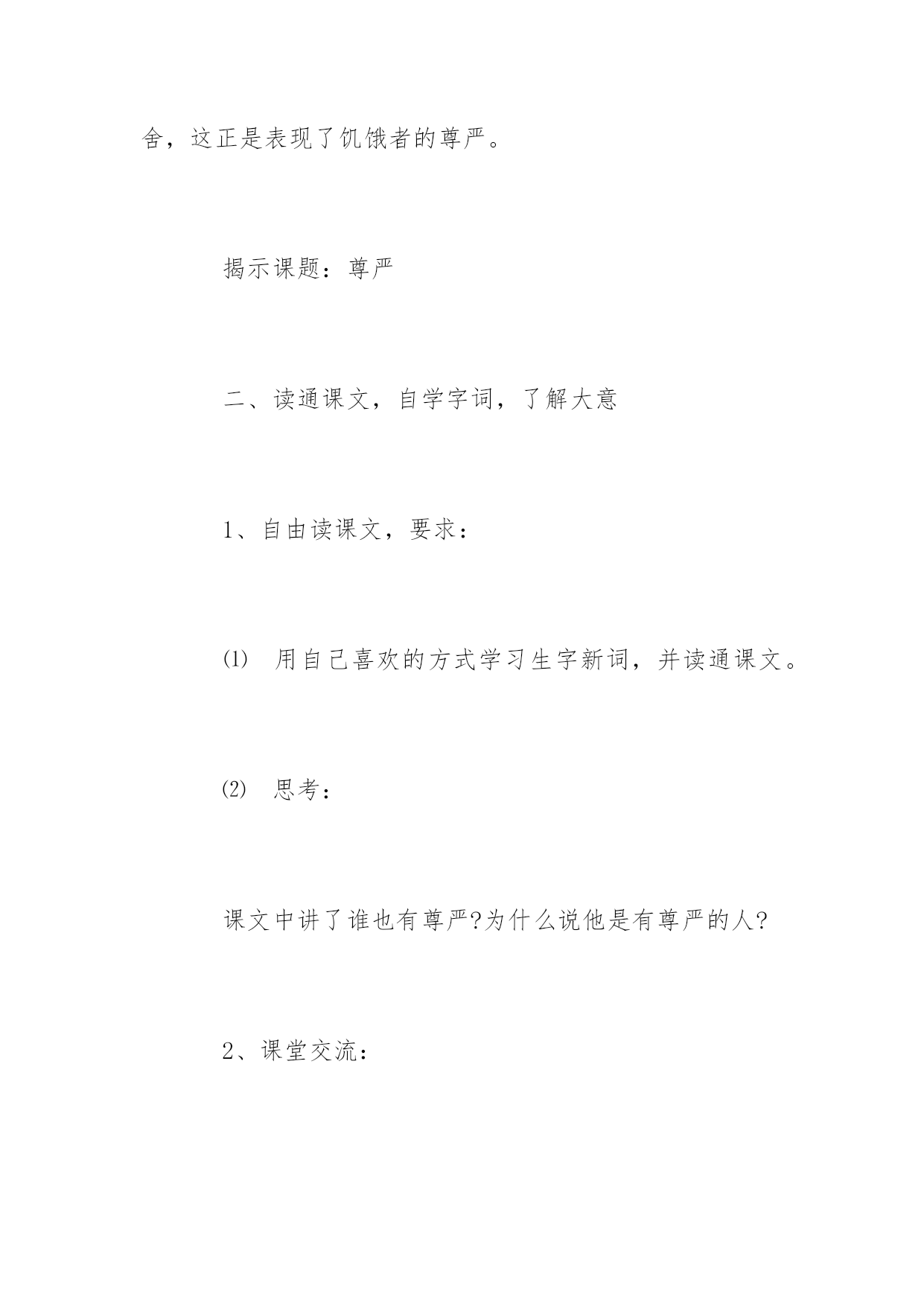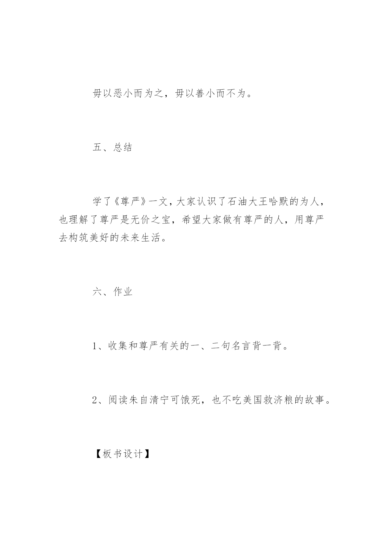 小学《尊严》教学设计小学《尊严》教学设计尊严是指人和具有人性特征的事物,拥有应有的权利,并且这些权利被其他人和具有人性特征的事物所尊重。下面应届毕业生考试网小编给大家带来《尊严》教学设计,更多教学设计请关注应届毕业生考试网。【教学目标】1、自主识字若干个,积累“骨瘦如柴”、“狼吞虎咽”、“惬意”等词语。2、有感情地朗读课文,理解并积累课文中含义深刻的句子。3、抓住描写哈默的外貌、神态、语言的句子体会尊严的含义。领悟“人拥有尊严,就会用劳动创造美好的未来”的道理。【教学过程】一、故事导入、揭示课题周朝时,齐国遭饥荒。有个叫黔敖的财主在路旁摆下些食物,等着饥民过来吃。不久,便有个饿汉用袖子蒙着面孔,跌跌撞撞地走了过来。黔敖左手拿着吃的,右手拿着喝的,对他吆喝着说:“嗟!来吃吧!”那饿汉张大眼睛看了看黔敖和食物,说:“我不吃这种‘嗟来之食’!”最后,这个饿汉活活地饿死了。这就是成语故事《嗟来之食》。讨论:这“嗟來之食”究竟该不该吃,能不能吃?饿汉因不食“嗟来之食”而活活饿死,你认为值得吗?总结:施舍者很神气地吆喝一声“喂!来吃!”这个滋味是不好受的。宁愿饿死,也不吃你的施舍,这正是表现了饥饿者的尊严。揭示课题:尊严二、读通课文,自学字词,了解大意1、自由读课文,要求:⑴用自己喜欢的方式学习生字新词,并读通课文。⑵思考:课文中讲了谁也有尊严?为什么说他是有尊严的人?2、课堂交流:⑴同桌相互检查课文读通情况。⑵任选喜欢的小节朗读交流,结合正音:惬(qiè)意⑶用简单的话语说说课文讲了谁有尊严?为什么说他是有尊严的人?三、深入研读,理解“尊严”1、提出研究专题:文中哪些描写可以看出哈默有尊严?2、学生自主圈划描写哈默外貌、语言、动作和神态的语句,适当做些旁批。3、小组围绕专题合作研究,共同探讨。4、课堂交流,展示研读成果:依据学生交流,随机落实以下词句的理解,并指导朗读:外貌描写:“只有一个人例外,这是个脸色苍白、骨瘦如柴的年轻人。”语言动作和神态的描写:他仰起头问:“先生,吃您这么多东西,您有什么活儿需要我做吗?”这个年轻人的目光顿时灰暗了,他的喉结上下动了动,说:“先生,那我不能吃您的东西,我不能不劳动,就得到这些食物!”“不,我现在就做,等做完了您的活儿,我再吃这些东西!”教师总结:这是一个饥寒交迫但不失尊严的人,面对沃尔逊人的款待仍不失尊严的人、他时刻牢记不能不劳而获,要用劳动去换取幸福,这就是尊严。尊严不能简单地解释为面子,更多地表现为一种自尊心,一种价值观,一种责任感,是一种不依附于他人自立于人世的奋斗精神。它是人生至高无上的精神瑰宝。年轻人在为杰克逊大叔捶背后,立刻狼吞虎咽地吃起来。写年轻人的`“狼吞虎咽地吃”与写其他逃难的人的“狼吞虎咽地吃”,表达的感情色彩有什么不同?理解句子:“别看他现在什么都没有,可他百分之百是个富翁,因为他有尊严!”问:为什么他现在什么都没有,可他百分之百是个富翁呢?你认为哈默有尊严跟他后来成为石油大王有联系吗?为什么?小结:有了这尊严,才会使他用劳动创造出巨大的财富,成为大富翁。四、出示有关尊严的名言与学生同诵1、孟子:富贵不能淫、贫*不能移、威武不能屈。2、《礼记.中庸》:志士不饮盗泉之水,廉者不受嗟来之食。3、毕达哥拉斯:无论是别人在跟前或者自己单独的时候,都不要做一点卑劣的事情:最要紧的是自尊。4、刘备:毋以恶小而为之,毋以善小而不为。五、总结学了《尊严》一文,大家认识了石油大王哈默的为人,也理解了尊严是无价之宝,希望大家做有尊严的人,用尊严去构筑美好的未来生活。六、作业1、收集和尊严有关的一、二句名言背一背。2、阅读朱自清宁可饿死,也不吃美国救济粮的故事。【板书设计】年轻人↓尊严石油大王