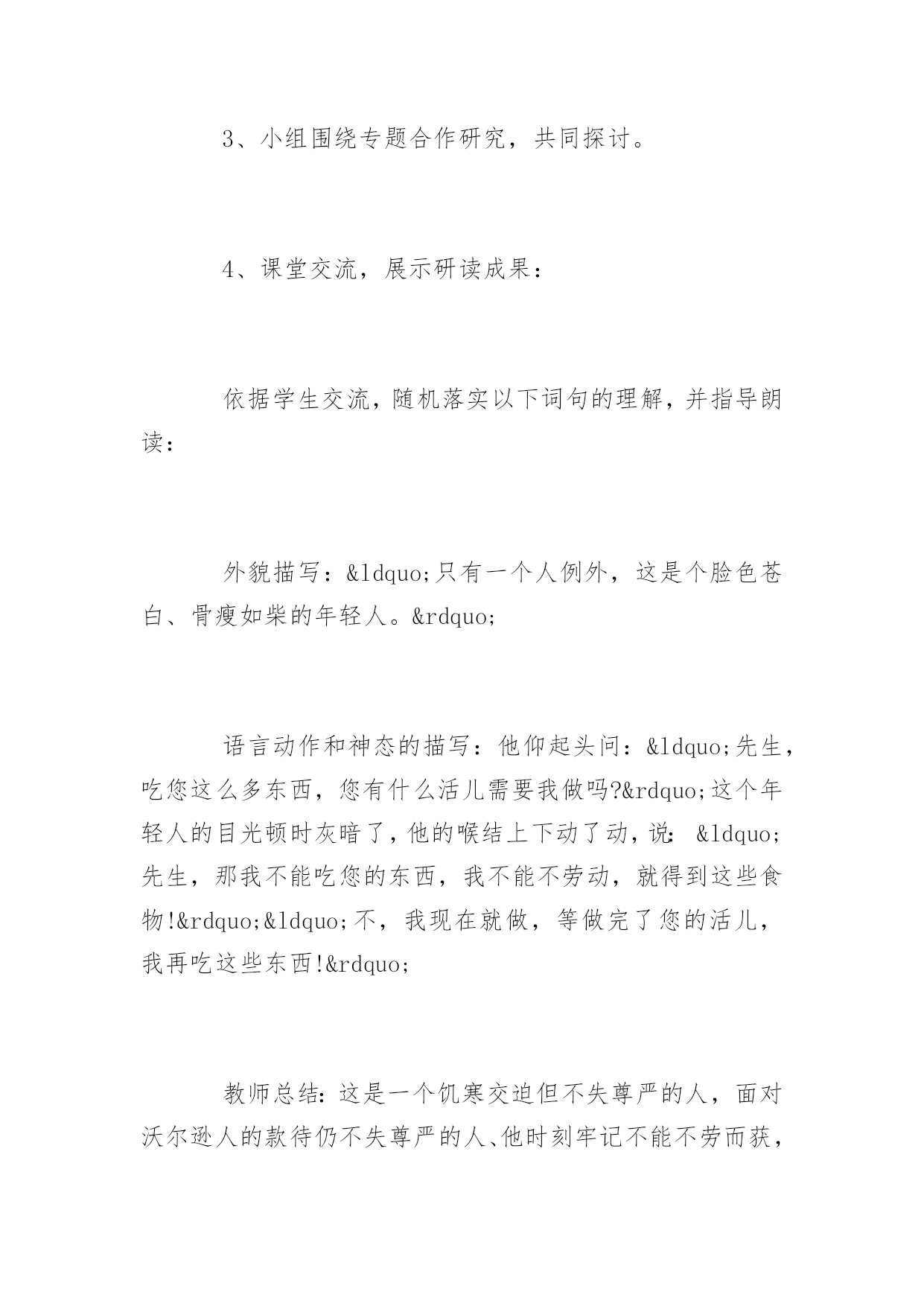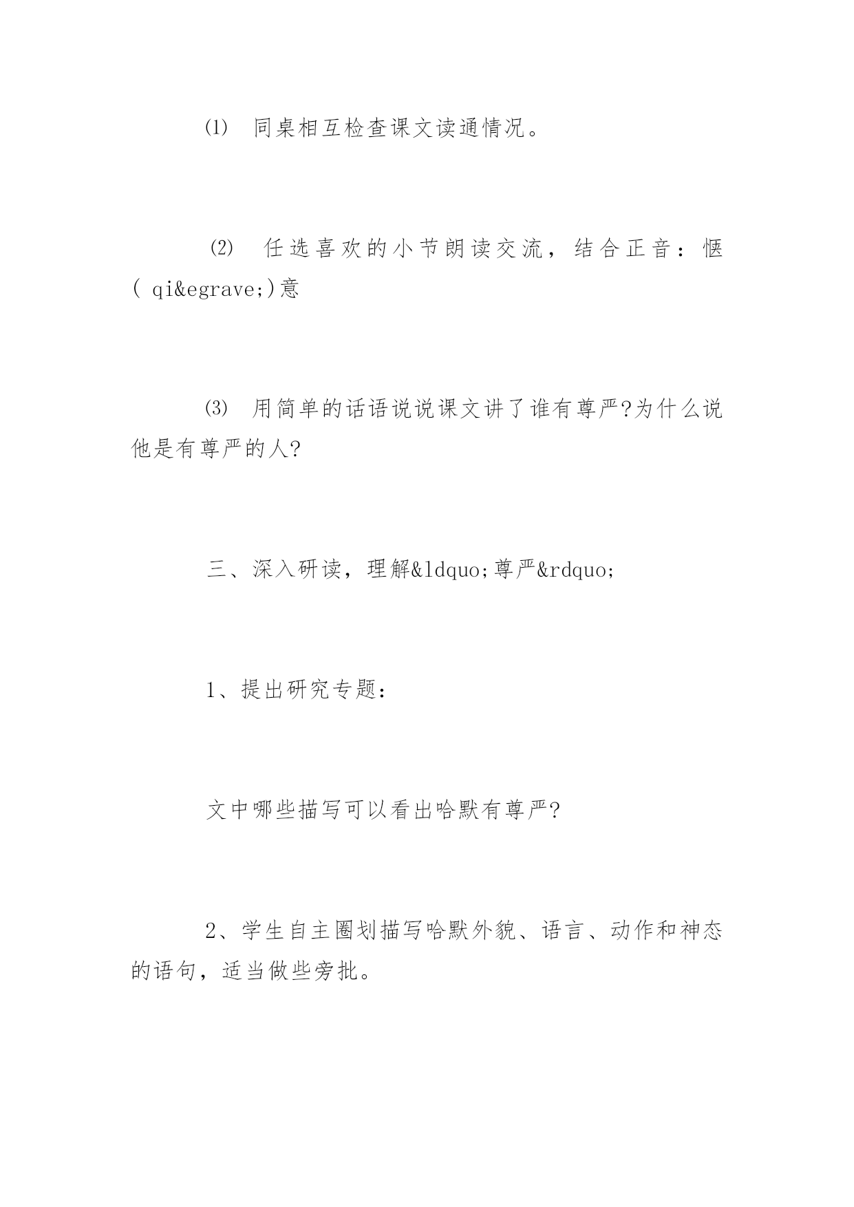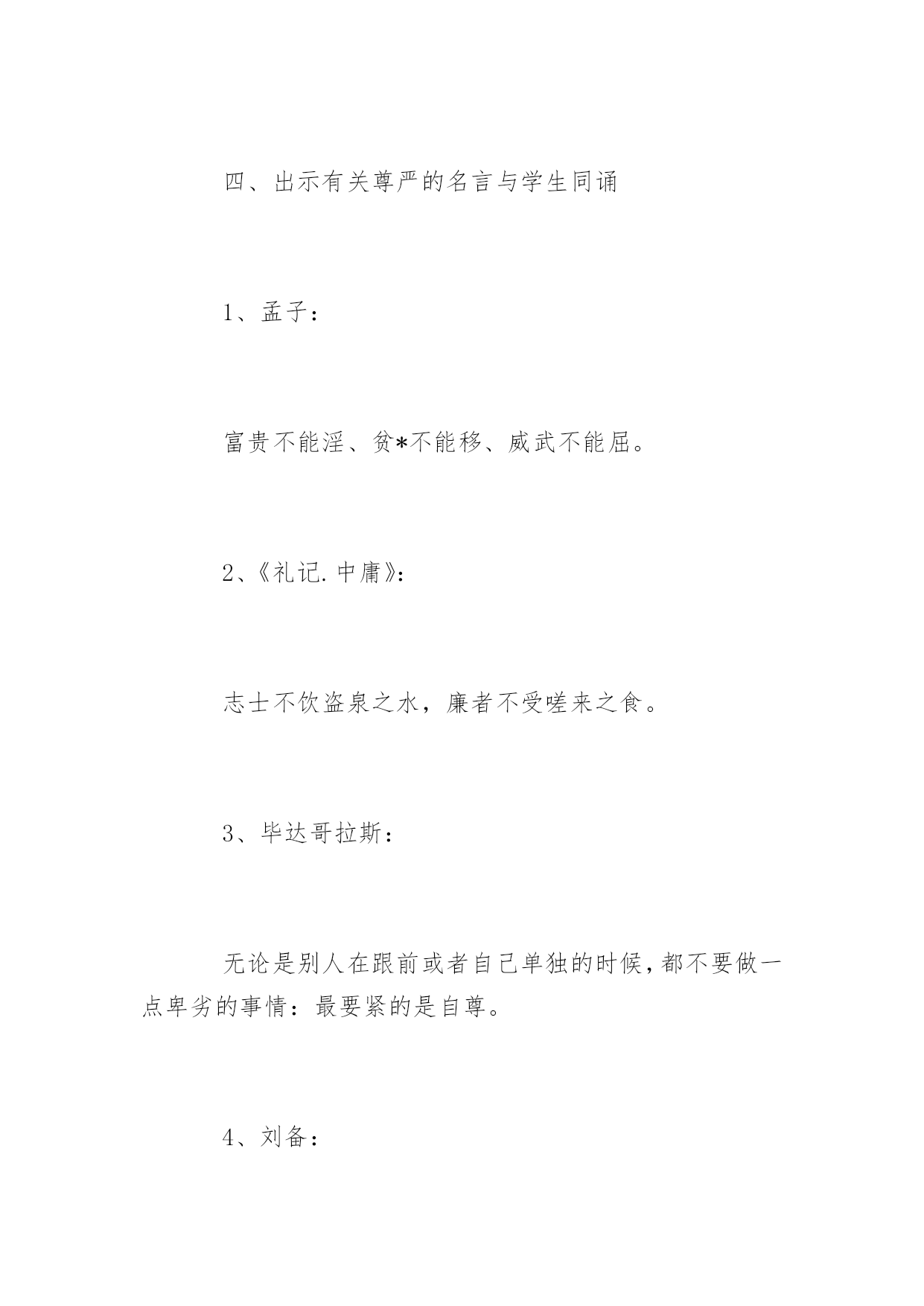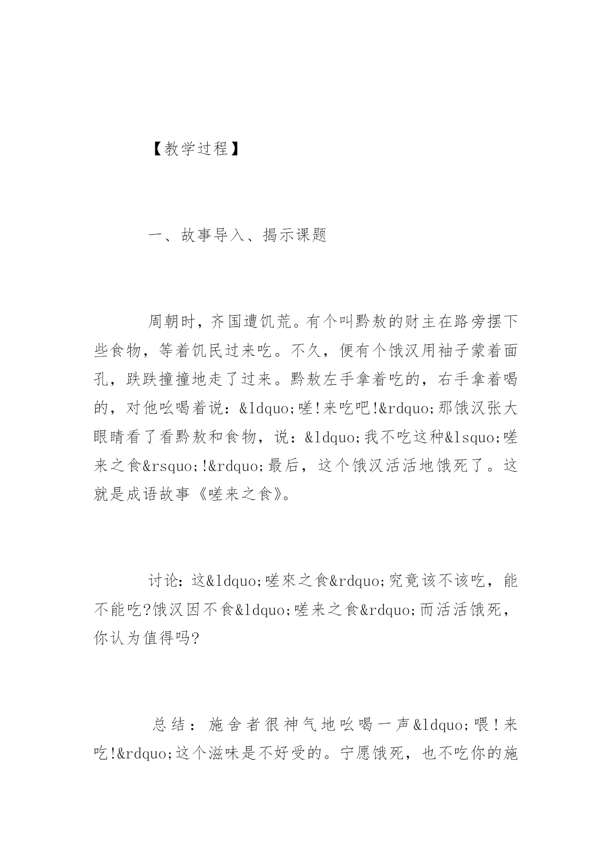 小学《尊严》教学设计小学《尊严》教学设计尊严是指人和具有人性特征的事物,拥有应有的权利,并且这些权利被其他人和具有人性特征的事物所尊重。下面应届毕业生考试网小编给大家带来《尊严》教学设计,更多教学设计请关注应届毕业生考试网。【教学目标】1、自主识字若干个,积累“骨瘦如柴”、“狼吞虎咽”、“惬意”等词语。2、有感情地朗读课文,理解并积累课文中含义深刻的句子。3、抓住描写哈默的外貌、神态、语言的句子体会尊严的含义。领悟“人拥有尊严,就会用劳动创造美好的未来”的道理。【教学过程】一、故事导入、揭示课题周朝时,齐国遭饥荒。有个叫黔敖的财主在路旁摆下些食物,等着饥民过来吃。不久,便有个饿汉用袖子蒙着面孔,跌跌撞撞地走了过来。黔敖左手拿着吃的,右手拿着喝的,对他吆喝着说:“嗟!来吃吧!”那饿汉张大眼睛看了看黔敖和食物,说:“我不吃这种‘嗟来之食’!”最后,这个饿汉活活地饿死了。这就是成语故事《嗟来之食》。讨论:这“嗟來之食”究竟该不该吃,能不能吃?饿汉因不食“嗟来之食”而活活饿死,你认为值得吗?总结:施舍者很神气地吆喝一声“喂!来吃!”这个滋味是不好受的。宁愿饿死,也不吃你的施舍,这正是表现了饥饿者的尊严。揭示课题:尊严二、读通课文,自学字词,了解大意1、自由读课文,要求:⑴用自己喜欢的方式学习生字新词,并读通课文。⑵思考:课文中讲了谁也有尊严?为什么说他是有尊严的人?2、课堂交流:⑴同桌相互检查课文读通情况。⑵任选喜欢的小节朗读交流,结合正音:惬(qiè)意⑶用简单的话语说说课文讲了谁有尊严?为什么说他是有尊严的人?三、深入研读,理解“尊严”1、提出研究专题:文中哪些描写可以看出哈默有尊严?2、学生自主圈划描写哈默外貌、语言、动作和神态的语句,适当做些旁批。3、小组围绕专题合作研究,共同探讨。4、课堂交流,展示研读成果:依据学生交流,随机落实以下词句的理解,并指导朗读:外貌描写:“只有一个人例外,这是个脸色苍白、骨瘦如柴的年轻人。”语言动作和神态的描写:他仰起头问:“先生,吃您这么多东西,您有什么活儿需要我做吗?”这个年轻人的目光顿时灰暗了,他的喉结上下动了动,说:“先生,那我不能吃您的东西,我不能不劳动,就得到这些食物!”“不,我现在就做,等做完了您的活儿,我再吃这些东西!”教师总结:这是一个饥寒交迫但不失尊严的人,面对沃尔逊人的款待仍不失尊严的人、他时刻牢记不能不劳而获,要用劳动去换取幸福,这就是尊严。尊严不能简单地解释为面子,更多地表现为一种自尊心,一种价值观,一种责任感,是一种不依附于他人自立于人世的奋斗精神。它是人生至高无上的精神瑰宝。年轻人在为杰克逊大叔捶背后,立刻狼吞虎咽地吃起来。写年轻人的`“狼吞虎咽地吃”与写其他逃难的人的“狼吞虎咽地吃”,表达的感情色彩有什么不同?理解句子:“别看他现在什么都没有,可他百分之百是个富翁,因为他有尊严!”问:为什么他现在什么都没有,可他百分之百是个富翁呢?你认为哈默有尊严跟他后来成为石油大王有联系吗?为什么?小结:有了这尊严,才会使他用劳动创造出巨大的财富,成为大富翁。四、出示有关尊严的名言与学生同诵1、孟子:富贵不能淫、贫*不能移、威武不能屈。2、《礼记.中庸》:志士不饮盗泉之水,廉者不受嗟来之食。3、毕达哥拉斯:无论是别人在跟前或者自己单独的时候,都不要做一点卑劣的事情:最要紧的是自尊。4、刘备:毋以恶小而为之,毋以善小而不为。五、总结学了《尊严》一文,大家认识了石油大王哈默的为人,也理解了尊严是无价之宝,希望大家做有尊严的人,用尊严去构筑美好的未来生活。六、作业1、收集和尊严有关的一、二句名言背一背。2、阅读朱自清宁可饿死,也不吃美国救济粮的故事。【板书设计】年轻人↓尊严石油大王