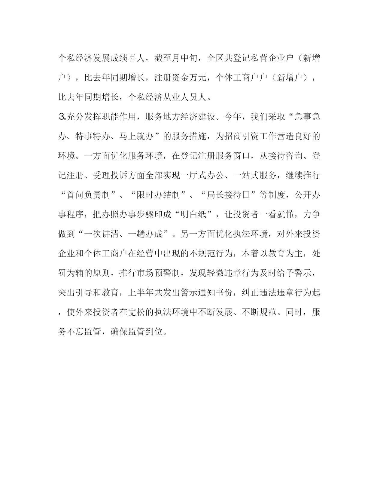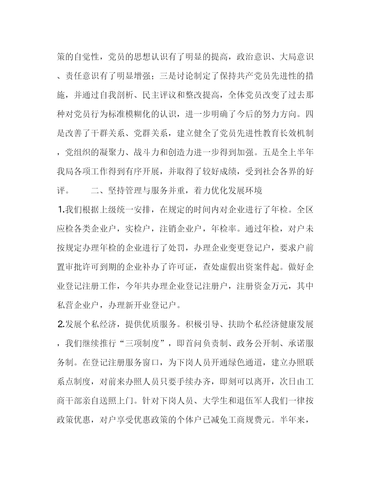 PAGE此资料由网络收集而来,如有侵权请告知上传者立即删除。资料共分享,我们负责传递知识。工商局上半年总结今年,我局在市工商局和开发区党委、管委会的领导下,坚持以xxx理论和“三个代表”的重要思想为指导,紧紧围绕地方经济发展这一中心,结合保持共产党员先进性教育活动,全局上下团结一心,稳中求进,进中求好,好中求快,不断创新工作思路,巩固、完善工作机制,切实改进工作作风,努力提高工作绩效,为开发区创造公平竞争的市场环境和安全健康的消费环境,做出了积极的贡献,取得了较好的成绩。现就主要工作情况总结如下:一、认真开展保持共产党员先进性教育活动按照开发区党委的统一部署和开发区党委先进性教育活动领导小组办公室的安排,我局的先进性教育活动,从×月×日开始至月中旬基本结束。由于局党组高度重视,精心组织,合理安排,广大党员自觉参与,态度热忱,先进性教育活动各项工作扎实推进,取得了明显的成效。学习培训、分析评议、整改提高三个阶段工作均达到了中央、省委、市委和开发区党委的要求,取得实实在在的效果,达到了目标要求。一是党员素质有了明显提高。通过这次先进性教育活动,广大党员的党员意识和纪律观念得到了明显的增强,学习理论的自觉性也有了明显的提高;二是全体党员普遍受到了一次较为深刻的马克思主义理论教育,进一步增强了全面正确地贯彻执行党的基本路线和中央决策的自觉性,党员的思想认识有了明显的提高,政治意识、大局意识、责任意识有了明显增强;三是讨论制定了保持共产党员先进性的措施,并通过自我剖析、民主评议和整改提高,全体党员改变了过去那种对党员行为标准模糊化的认识,进一步明确了今后的努力方向。四是改善了干群关系、党群关系,建立健全了党员先进性教育长效机制,党组织的凝聚力、战斗力和创造力进一步得到加强。五是全上半年我局各项工作得到有序开展,并取得了较好成绩,受到社会各界的好评。二、坚持管理与服务并重,着力优化发展环境⒈我们根据上级统一安排,在规定的时间内对企业进行了年检。全区应检各类企业户,实检户,注销企业户,年检率。通过年检,对户未按规定办理年检的企业进行了处罚,办理企业变更登记户,要求户前置审批许可到期的企业补办了许可证,查处虚假出资案件起。做好企业登记注册工作,今年共办理企业登记注册户,注册资金万元,其中私营企业户,办理新开业登记户。⒉发展个私经济,提供优质服务。积极引导、扶助个私经济健康发展,我们继续推行“三项制度”,即首问负责制、政务公开制、承诺服务制。在登记注册服务窗口,为下岗人员开通绿色通道,建立办照联系点制度,对前来办照人员只要手续办齐,即刻可以离开,次日由工商干部亲自送照上门。针对下岗人员、大学生和退伍军人我们一律按政策优惠,对户享受优惠政策的个体户已减免工商规费元。半年来,个私经济发展成绩喜人,截至月中旬,全区共登记私营企业户(新增户),比去年同期增长,注册资金万元,个体工商户户(新增户),比去年同期增长,个私经济从业人员人。⒊充分发挥职能作用,服务地方经济建设。今年,我们采取“急事急办、特事特办、马上就办”的服务措施,为招商引资工作营造良好的环境。一方面优化服务环境,在登记注册服务窗口,从接待咨询、登记注册、受理投诉方面全部实现一厅式办公、一站式服务,继续推行“首问负责制”、“限时办结制”、“局长接待日”等制度,公开办事程序,把办照办事步骤印成“明白纸”,让投资者一看就懂,力争做到“一次讲清、一趟办成”。另一方面优化执法环境,对外来投资企业和个体工商户在经营中出现的不规范行为,本着以教育为主,处罚为辅的原则,推行市场预警制,发现轻微违章行为及时给予警示,突出引导和教育,上半年共发出警示通知书份,纠正违法违章行为起,使外来投资者在宽松的执法环境中不断发展、不断规范。同时,服务不忘监管,确保监管到位。