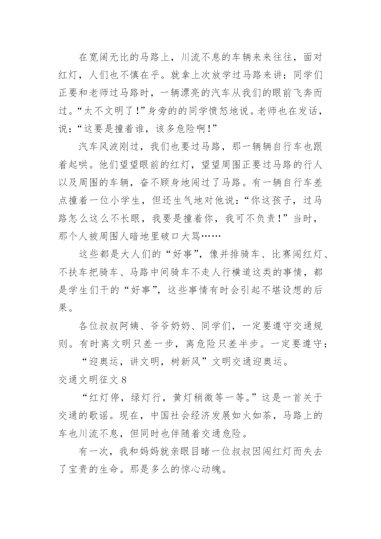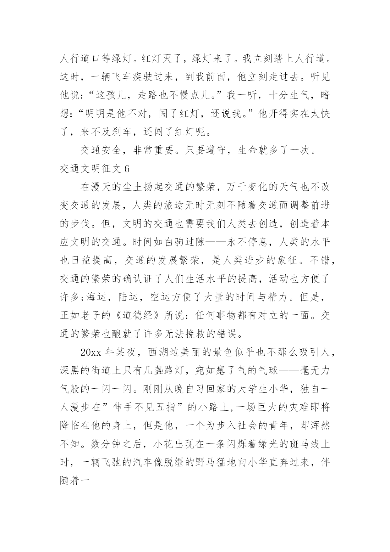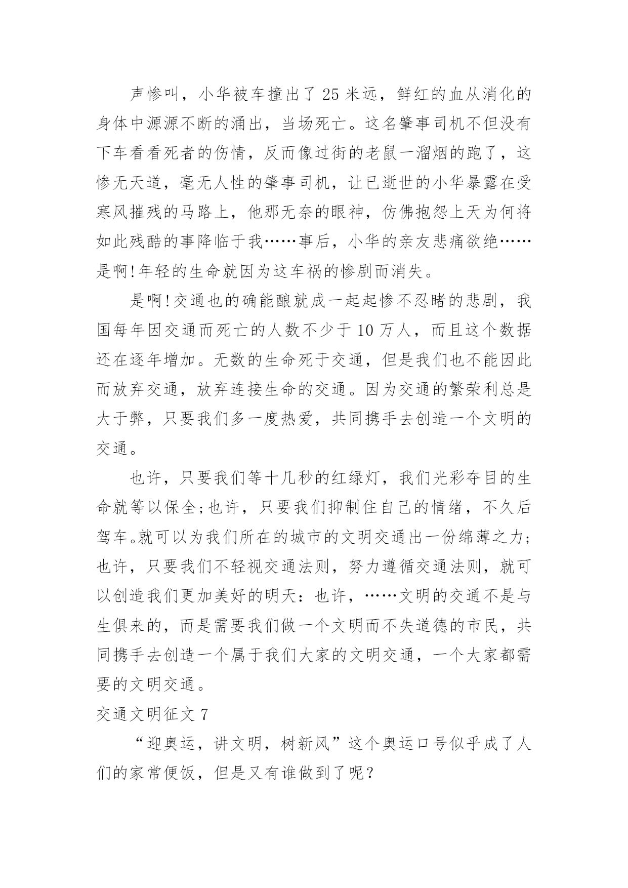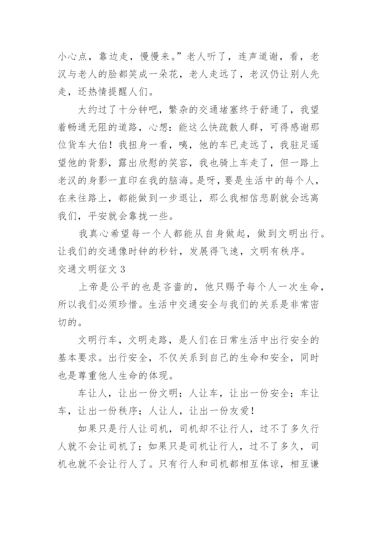 交通文明征文交通文明征文(合集15篇)在日常学习、工作和生活中,大家都有写征文的经历,对征文很是熟悉吧,通过征文可以把我们那些零零散散的思想,聚集在一块。一篇什么样的征文才能称之为优秀征文呢?下面是小编收集整理的交通文明征文,仅供参考,大家一起来看看吧。交通文明征文1在我们学校门前的宁安路上,两边有早市,有36路和212路公交车的总站,有多个大超市的班车停靠站,还有居民小区、学校、幼儿园、街道办事处、商铺、饭店的大门出入口……每天都是人来人往、车水马龙,车辆不遵守交通规则、行人乱穿马路从而发生堵车和的情况更是家常便饭,而这只不过是我们市区数千条道路中很平凡的一条!这个场面对我们来说是很可怕的,我想以此来告诉所有大人和小朋友们,请珍爱生命,为了他人,也为了自己,齐心合力,维护交通安全,创建文明之路,让我们的生命在文明与友爱、遵纪与有序中每天都能平安顺利的度过!不知从何时起,汽车就像电视剧中的“灰太狼”一样,经常去扰乱“羊群”的快乐和安宁,“注意交通安全”是家长们每天一句必说的话。即使是这样,每天也有很多很多的事故让人惨不忍睹,很多很多的意外让人撕心裂肺。每当“灰太狼”一作恶,就会有人失去了健全的身体甚至是鲜活的生命,就会有爸爸妈妈突然间失去了孩子,也会有孩子突然间就再也没有了爸爸妈妈,一个个原本是欢乐幸福的家庭眨眼间就让“灰太狼”给破坏的支离破碎!爸爸妈妈就曾告诉过我这样一个真实的故事:有一天早上在南京路和辽阳路路口,一辆大货车撞上了一辆公交车,而一个刚跟爸爸妈妈说了再见正走在上学路上的小姐姐被压在了公交车下,从此她再也不能与爸爸妈妈一起幸福地生活,再也不能与老师同学一起快乐地游戏……爷爷奶奶叔叔阿姨们,同学们,为了您和他人的生命安全,请自觉遵守交通法规,行车和行路时注意安全,并积极投身到文明交通的宣传教育中来,为“文明交通”尽一份责任,献一份爱心。现在,全社会都很重视交通安全问题,尤其关心我们小朋友的成长与安全,110警车也天天在我们学校门口巡逻护学,处处为我们小朋友着想,借此机会,我也想代表所有的少先队员向交警叔叔们说一声:“你们辛苦了,谢谢你们!”向你们敬一个崇高的队礼!“文明交通,从我做起”,我们小学生也向所有关心我们成长的大人们郑重承诺:一定学好交通安全知识,自觉遵守交通法规,并用我们的小手去拉爸爸妈妈的大手,文明交通一起走。决不随意穿马路、闯红灯,决不在马路上追逐玩耍并排走,更决不逞能骑“英雄车”、玩滑板和轮滑,时时处处做一个遵守交通法规,关心他人的文明好少年。因为有爱,世上才有了阳光和雨露。因为懂得珍惜,人间才有了花草和树木。珍爱生命,共创平安大道、共筑文明交通、共建幸福家园是我们每个人的美好心愿,让我们携起手来,共同勉励,共同呵护,让文明之花遍地开放,让生命之旅在爱心和责任的护航下一路欢歌,一路芳香!交通文明征文2繁华的街道上车水马龙,紧张的现代生活节奏使行人车辆来去匆匆,或许是时间的变迁,或许局外人无心去留意,每天的每天,都有交通事故的悲剧发生,而怎样做到“文明交通,平安出入”这一严肃话题,便使人陷入深深思考……这一天,我背上书包,要去学习英语,走到拐弯路口,便看见一辆大货车徐徐向前,前面是拥挤的人群,自行车、摩托车,挤得整条街几乎水泄不通,要是再加上这一辆大货车,那……我不禁皱起了眉头,扶着自行车等在路边。货车驾驶员是一位将近六十岁的老汉,奇怪的是,他并没有继续往前挤进繁杂的道路中,而是把车默默地停在路的最旁边,抽起烟来。这时,一位年迈的老爷爷乘着电动车慢慢开来,老爷爷因年纪大,手脚不太灵便,也许看到那拥挤的人群,心里害怕吧,所以开起电动车就像一只乌龟,小心谨慎。老爷爷来到货车前怯生生地望着老汉,不知进退。老汉见了,眼睛变得柔和,亲切地呼唤老爷爷:“大伯,你放心,您先走吧!”这短短的话语就像股暖流浸入老人的心田,让原本对交通害怕的他,像打了强心剂,老人连忙对老汉招手示谢,老汉微笑着,眼睛里充满慈祥。老人驾着电动车要离开了,老汉一把叫住老人,关切地说:“老伯,路上车多,您可得小心点,靠边走,慢慢来。”老人听了,连声道谢,看,老汉与老人的脸都笑成一朵花,老人走远了,老汉仍让别人先走,还热情提醒人们。大约过了十分钟吧,繁杂的交通堵塞终于舒通了,我望着畅通无阻的道路,心想:能这么快疏散人群,可得感谢那位货车大伯!我扭身一看,咦,他的车已走远了,我驻足遥望他的背影,露出欣慰的笑容,我也骑上车走了,但一路上老汉的身影一直印在我的脑海。是呀,要是生活中的每个人,在来往路上,都能做到一步退让,那么我相信悲剧就会远离我们,平安就会靠拢一些。我真心希望每一个人都能从自身做起,做到文明出行。让我们的交通像时钟的秒针,发展得飞速,文明有秩序。交通文明征文3上帝是公平的也是吝啬的,他只赐予每个人一次生命,所以我们必须珍惜。生活中交