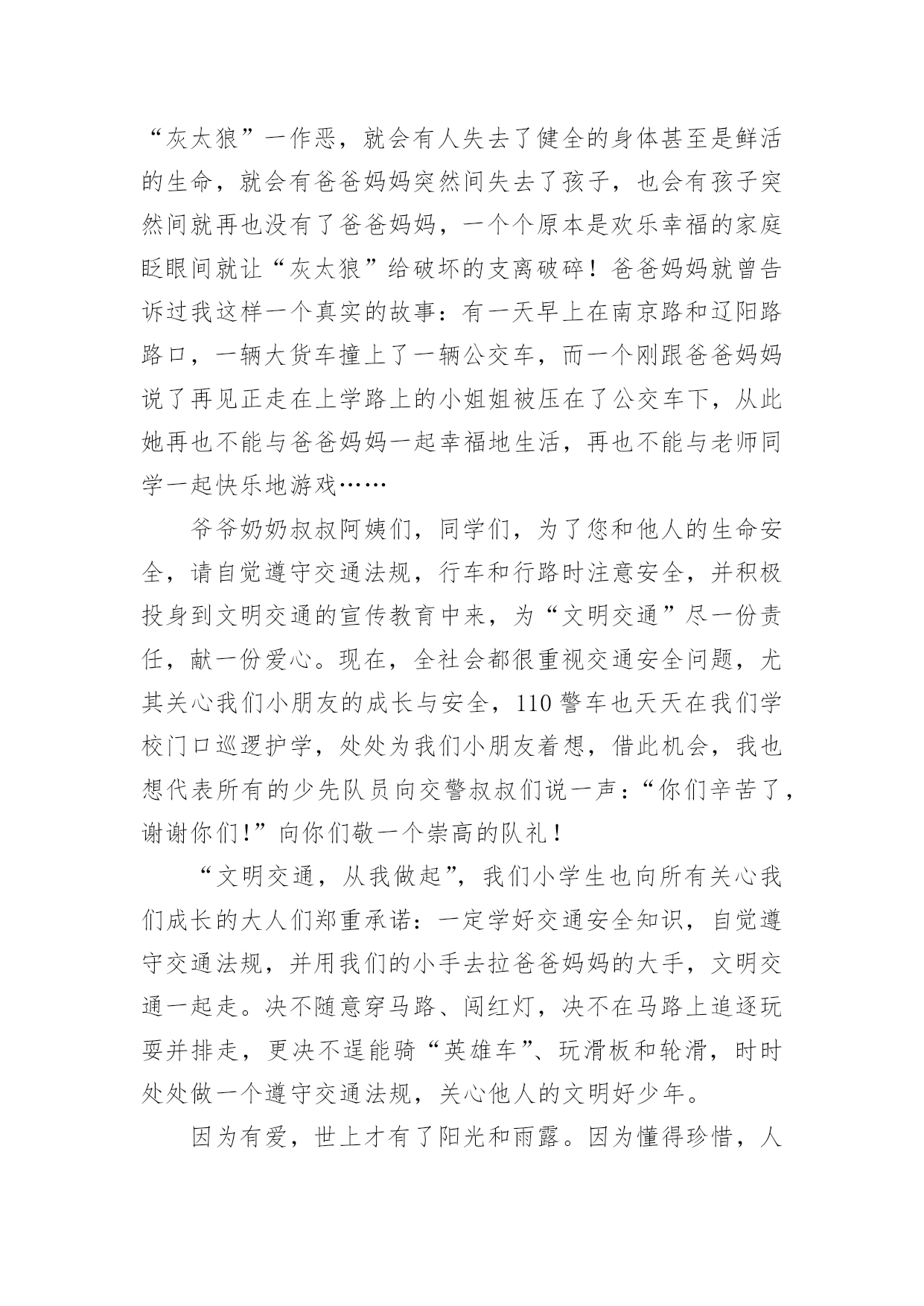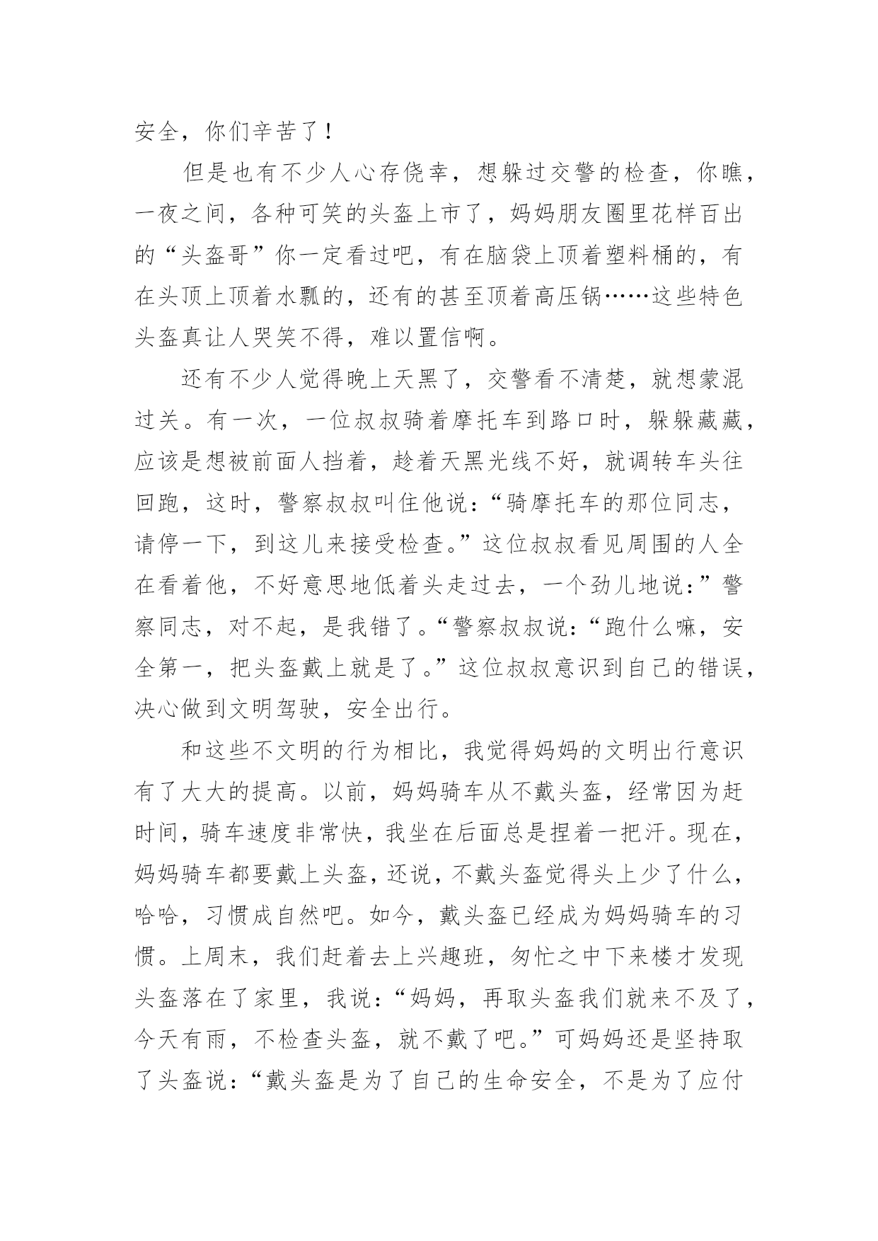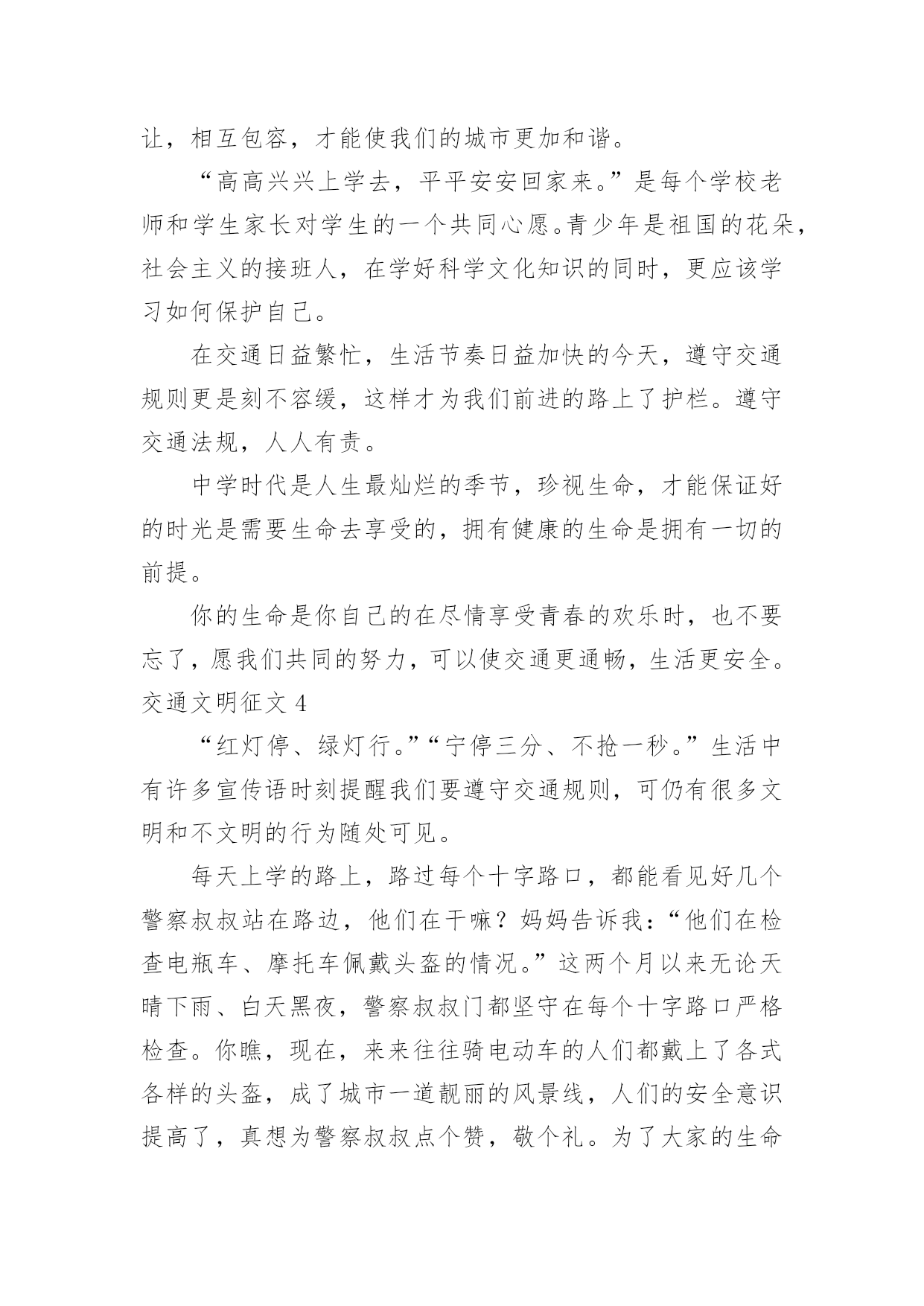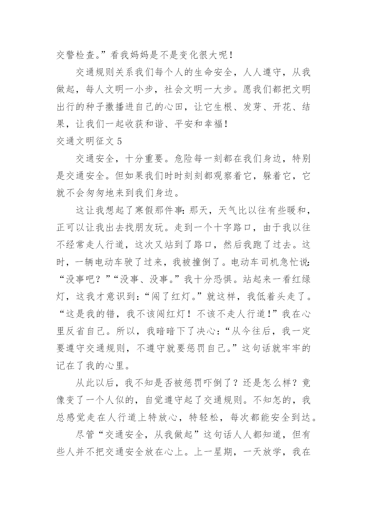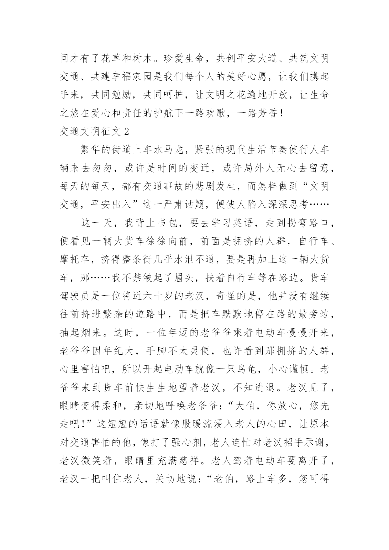 交通文明征文交通文明征文(合集15篇)在日常学习、工作和生活中,大家都有写征文的经历,对征文很是熟悉吧,通过征文可以把我们那些零零散散的思想,聚集在一块。一篇什么样的征文才能称之为优秀征文呢?下面是小编收集整理的交通文明征文,仅供参考,大家一起来看看吧。交通文明征文1在我们学校门前的宁安路上,两边有早市,有36路和212路公交车的总站,有多个大超市的班车停靠站,还有居民小区、学校、幼儿园、街道办事处、商铺、饭店的大门出入口……每天都是人来人往、车水马龙,车辆不遵守交通规则、行人乱穿马路从而发生堵车和的情况更是家常便饭,而这只不过是我们市区数千条道路中很平凡的一条!这个场面对我们来说是很可怕的,我想以此来告诉所有大人和小朋友们,请珍爱生命,为了他人,也为了自己,齐心合力,维护交通安全,创建文明之路,让我们的生命在文明与友爱、遵纪与有序中每天都能平安顺利的度过!不知从何时起,汽车就像电视剧中的“灰太狼”一样,经常去扰乱“羊群”的快乐和安宁,“注意交通安全”是家长们每天一句必说的话。即使是这样,每天也有很多很多的事故让人惨不忍睹,很多很多的意外让人撕心裂肺。每当“灰太狼”一作恶,就会有人失去了健全的身体甚至是鲜活的生命,就会有爸爸妈妈突然间失去了孩子,也会有孩子突然间就再也没有了爸爸妈妈,一个个原本是欢乐幸福的家庭眨眼间就让“灰太狼”给破坏的支离破碎!爸爸妈妈就曾告诉过我这样一个真实的故事:有一天早上在南京路和辽阳路路口,一辆大货车撞上了一辆公交车,而一个刚跟爸爸妈妈说了再见正走在上学路上的小姐姐被压在了公交车下,从此她再也不能与爸爸妈妈一起幸福地生活,再也不能与老师同学一起快乐地游戏……爷爷奶奶叔叔阿姨们,同学们,为了您和他人的生命安全,请自觉遵守交通法规,行车和行路时注意安全,并积极投身到文明交通的宣传教育中来,为“文明交通”尽一份责任,献一份爱心。现在,全社会都很重视交通安全问题,尤其关心我们小朋友的成长与安全,110警车也天天在我们学校门口巡逻护学,处处为我们小朋友着想,借此机会,我也想代表所有的少先队员向交警叔叔们说一声:“你们辛苦了,谢谢你们!”向你们敬一个崇高的队礼!“文明交通,从我做起”,我们小学生也向所有关心我们成长的大人们郑重承诺:一定学好交通安全知识,自觉遵守交通法规,并用我们的小手去拉爸爸妈妈的大手,文明交通一起走。决不随意穿马路、闯红灯,决不在马路上追逐玩耍并排走,更决不逞能骑“英雄车”、玩滑板和轮滑,时时处处做一个遵守交通法规,关心他人的文明好少年。因为有爱,世上才有了阳光和雨露。因为懂得珍惜,人间才有了花草和树木。珍爱生命,共创平安大道、共筑文明交通、共建幸福家园是我们每个人的美好心愿,让我们携起手来,共同勉励,共同呵护,让文明之花遍地开放,让生命之旅在爱心和责任的护航下一路欢歌,一路芳香!交通文明征文2繁华的街道上车水马龙,紧张的现代生活节奏使行人车辆来去匆匆,或许是时间的变迁,或许局外人无心去留意,每天的每天,都有交通事故的悲剧发生,而怎样做到“文明交通,平安出入”这一严肃话题,便使人陷入深深思考……这一天,我背上书包,要去学习英语,走到拐弯路口,便看见一辆大货车徐徐向前,前面是拥挤的人群,自行车、摩托车,挤得整条街几乎水泄不通,要是再加上这一辆大货车,那……我不禁皱起了眉头,扶着自行车等在路边。货车驾驶员是一位将近六十岁的老汉,奇怪的是,他并没有继续往前挤进繁杂的道路中,而是把车默默地停在路的最旁边,抽起烟来。这时,一位年迈的老爷爷乘着电动车慢慢开来,老爷爷因年纪大,手脚不太灵便,也许看到那拥挤的人群,心里害怕吧,所以开起电动车就像一只乌龟,小心谨慎。老爷爷来到货车前怯生生地望着老汉,不知进退。老汉见了,眼睛变得柔和,亲切地呼唤老爷爷:“大伯,你放心,您先走吧!”这短短的话语就像股暖流浸入老人的心田,让原本对交通害怕的他,像打了强心剂,老人连忙对老汉招手示谢,老汉微笑着,眼睛里充满慈祥。老人驾着电动车要离开了,老汉一把叫住老人,关切地说:“老伯,路上车多,您可得小心点,靠边走,慢慢来。”老人听了,连声道谢,看,老汉与老人的脸都笑成一朵花,老人走远了,老汉仍让别人先走,还热情提醒人们。大约过了十分钟吧,繁杂的交通堵塞终于舒通了,我望着畅通无阻的道路,心想:能这么快疏散人群,可得感谢那位货车大伯!我扭身一看,咦,他的车已走远了,我驻足遥望他的背影,露出欣慰的笑容,我也骑上车走了,但一路上老汉的身影一直印在我的脑海。是呀,要是生活中的每个人,在来往路上,都能做到一步退让,那么我相信悲剧就会远离我们,平安就会靠拢一些。我真心希望每一个人都能从自身做起,做到文明出行。让我们的交通像时钟的秒针,发展得飞速,文明有秩序。交通文明征文3上帝是公平的也是吝啬的,他只赐予每个人一次生命,所以我们必须珍惜。生活中交