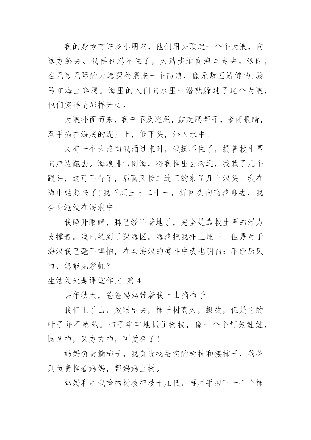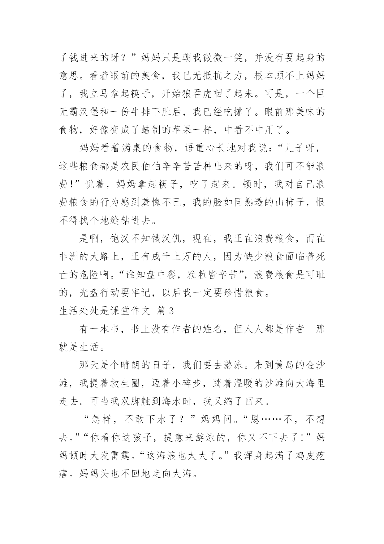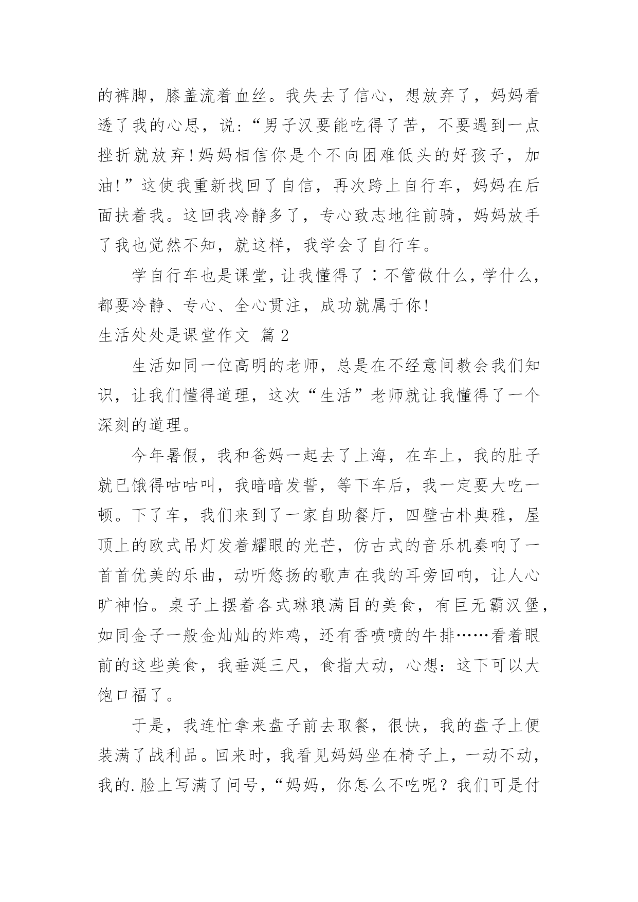 生活处处是课堂作文[荐]生活处处是课堂作文无论是身处学校还是步入社会,许多人都写过作文吧,根据写作命题的特点,作文可以分为命题作文和非命题作文。如何写一篇有思想、有文采的作文呢?下面是小编帮大家整理的生活处处是课堂作文7篇,供大家参考借鉴,希望可以帮助到有需要的朋友。生活处处是课堂作文篇1课堂,不仅仅只局限于学校之内,生活之中也一定有许多课堂,让我们受益匪浅。今天,我们就一起来了解我心中最宝贵的那堂课∶学自行车。那是一个风和日丽的星期天,微风习习,是个骑车的好日子。望着叔叔阿姨们像飞驰地骏马骑车向远处驶去时,我心中不禁充满了羡慕:这是一种多么好的运动啊!于是,我缓缓推着自行车,叫上妈妈,开始进行自行车训练。此刻,我的'眼中充满着憧憬,希望能学好这项技艺……训练开始了,我自信满满地跨上自行车,准备行驶。当我踩动踏板的那一瞬间,我害怕了。害怕自己摔倒,害怕被路人嘲笑……在紧张和不安下,我变得烦躁起来,车把手扶着摇摇晃晃,失去了平衡。糟了,前方有一棵树,我却来不及躲闪,“嘭”!自行车前轮撞到树干上,我也摔倒了在地,想要爬起来,但两眼冒着金星,觉得天旋地转。妈妈赶紧跑过来,把我扶起,我两个膝盖的裤子都破了洞,妈妈挽起我的裤脚,膝盖流着血丝。我失去了信心,想放弃了,妈妈看透了我的心思,说:“男子汉要能吃得了苦,不要遇到一点挫折就放弃!妈妈相信你是个不向困难低头的好孩子,加油!”这使我重新找回了自信,再次跨上自行车,妈妈在后面扶着我。这回我冷静多了,专心致志地往前骑,妈妈放手了我也觉然不知,就这样,我学会了自行车。学自行车也是课堂,让我懂得了∶不管做什么,学什么,都要冷静、专心、全心贯注,成功就属于你!生活处处是课堂作文篇2生活如同一位高明的老师,总是在不经意间教会我们知识,让我们懂得道理,这次“生活”老师就让我懂得了一个深刻的道理。今年暑假,我和爸妈一起去了上海,在车上,我的肚子就已饿得咕咕叫,我暗暗发誓,等下车后,我一定要大吃一顿。下了车,我们来到了一家自助餐厅,四壁古朴典雅,屋顶上的欧式吊灯发着耀眼的光芒,仿古式的音乐机奏响了一首首优美的乐曲,动听悠扬的歌声在我的耳旁回响,让人心旷神怡。桌子上摆着各式琳琅满目的美食,有巨无霸汉堡,如同金子一般金灿灿的炸鸡,还有香喷喷的牛排……看着眼前的这些美食,我垂涎三尺,食指大动,心想:这下可以大饱口福了。于是,我连忙拿来盘子前去取餐,很快,我的盘子上便装满了战利品。回来时,我看见妈妈坐在椅子上,一动不动,我的.脸上写满了问号,“妈妈,你怎么不吃呢?我们可是付了钱进来的呀?”妈妈只是朝我微微一笑,并没有要起身的意思。看着眼前的美食,我已无抵抗之力,根本顾不上妈妈了,我立马拿起筷子,开始狼吞虎咽了起来。可是,一个巨无霸汉堡和一份牛排下肚后,我已经吃撑了。眼前那美味的食物,好像变成了蜡制的苹果一样,中看不中用了。妈妈看着满桌的食物,语重心长地对我说:“儿子呀,这些粮食都是农民伯伯辛辛苦苦种出来的呀,我们可不能浪费!”说着,妈妈拿起筷子,吃了起来。顿时,我对自己浪费粮食的行为感到羞愧不已,我的脸如同熟透的山柿子,恨不得找个地缝钻进去。是啊,饱汉不知饿汉饥,现在,我正在浪费粮食,而在非洲的大路上,正有成千上万的人,因为缺少粮食面临着死亡的危险啊。“谁知盘中餐,粒粒皆辛苦”,浪费粮食是可耻的,光盘行动要牢记,以后我一定要珍惜粮食。生活处处是课堂作文篇3有一本书,书上没有作者的姓名,但人人都是作者--那就是生活。那天是个晴朗的日子,我们要去游泳。来到黄岛的金沙滩,我提着救生圈,迈着小碎步,踏着温暖的沙滩向大海里走去。可当我双脚触到海水时,我又缩了回来。“怎样,不敢下水了?”妈妈问。“恩……不,不想去。”“你看你这孩子,提意来游泳的,你又不下去了!”妈妈顿时大发雷霆。“这海浪也太大了。”我浑身起满了鸡皮疙瘩。妈妈头也不回地走向大海。我的身旁有许多小朋友,他们用头顶起一个个大浪,向远方游去。我再也忍不住了,大踏步地向海里走去。这时,在无边无际的大海深处涌来一个高浪,像无数匹矫健的.骏马在海上奔腾。海里的人们向水里一潜就躲过了这个大浪,他们笑得是那样开心。大浪扑面而来,我来不及逃脱,鼓起腮帮子,紧闭眼睛,双手插在海底的泥土上,低下头,潜入水中。又有一个大浪向我涌过来时,我挺不住了,提着救生圈向岸边跑去。海浪排山倒海,将我推出去老远,我栽了几个跟头,这可不得了,后面又接二连三的来了几个浪头。我在海中站起来了!我不顾三七二十一,折回头向高浪迎去,我全身淹没在海浪中。我睁开眼睛,脚已经不着地了,完全是靠救生圈的浮力支撑着。我已经到了深海区。海浪把我托上埋下。但是对于海浪我已毫不惧怕,在与海浪的搏斗中我也明白:不经历风雨,怎能见彩虹?生活处处是课堂作文篇4去年秋天,爸爸妈妈带着我上山摘柿子。我们上了山,放眼望去,柿子树
