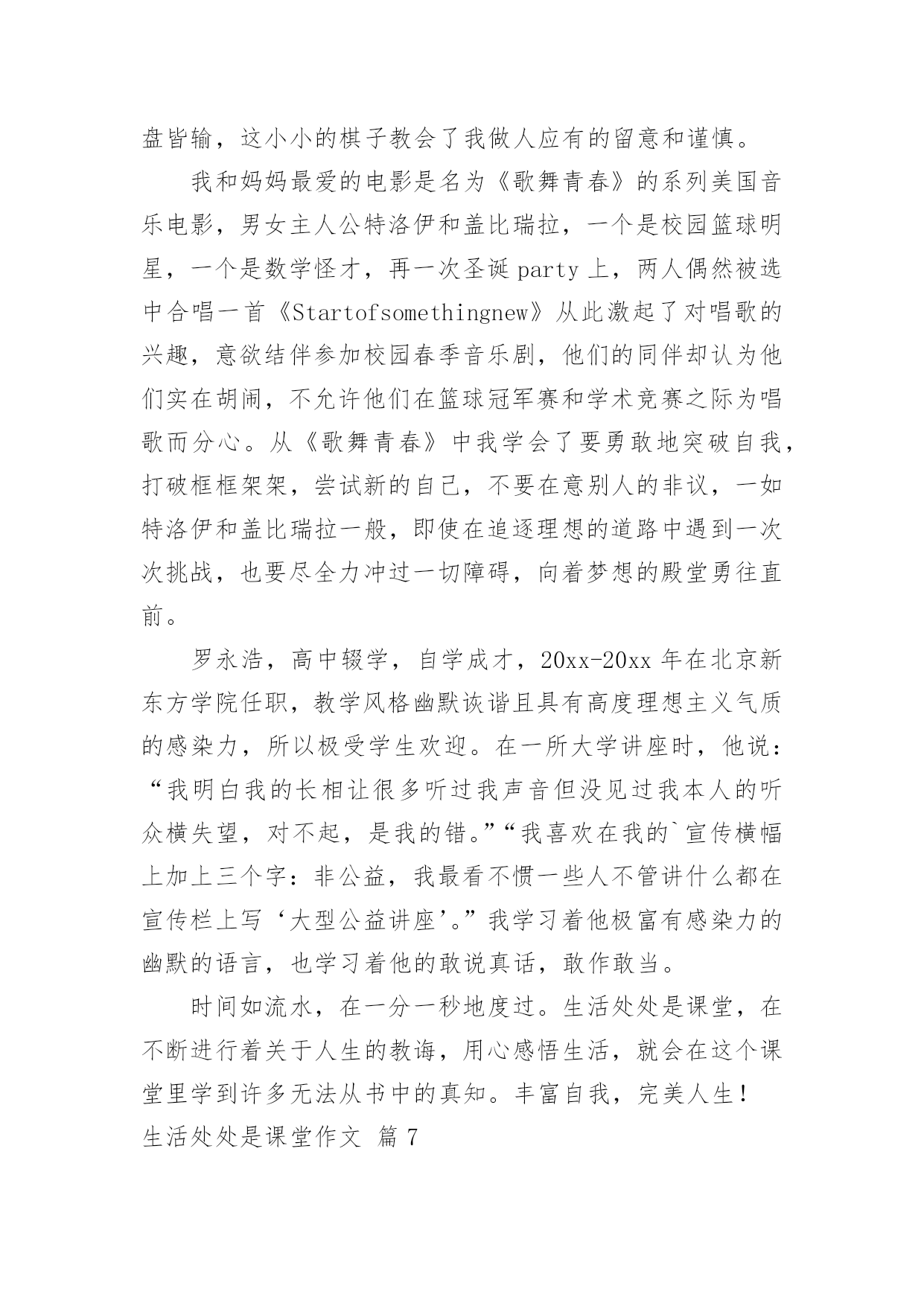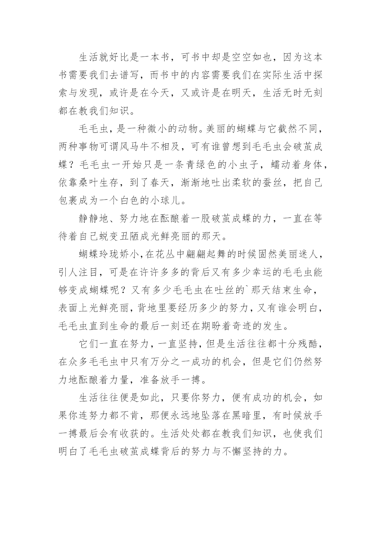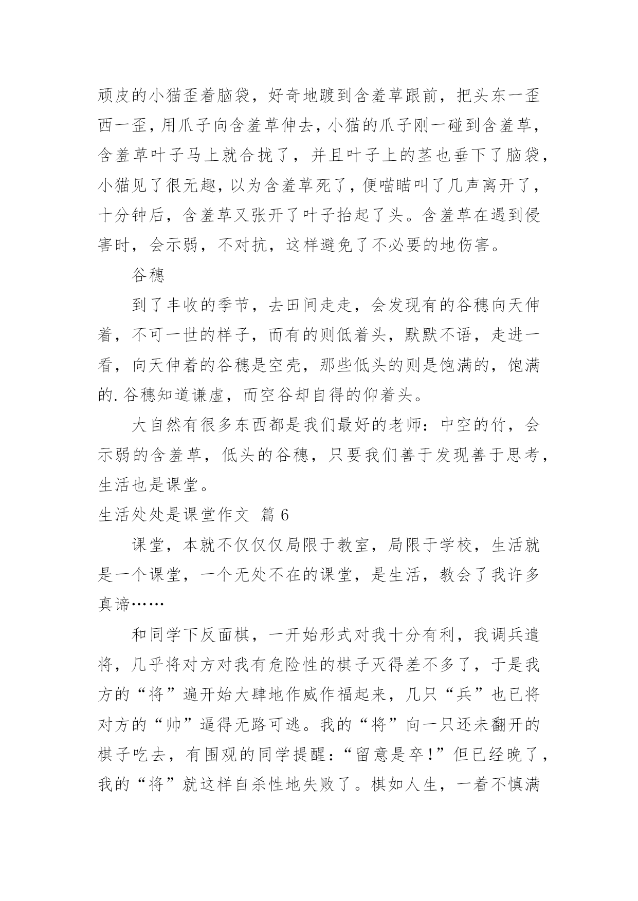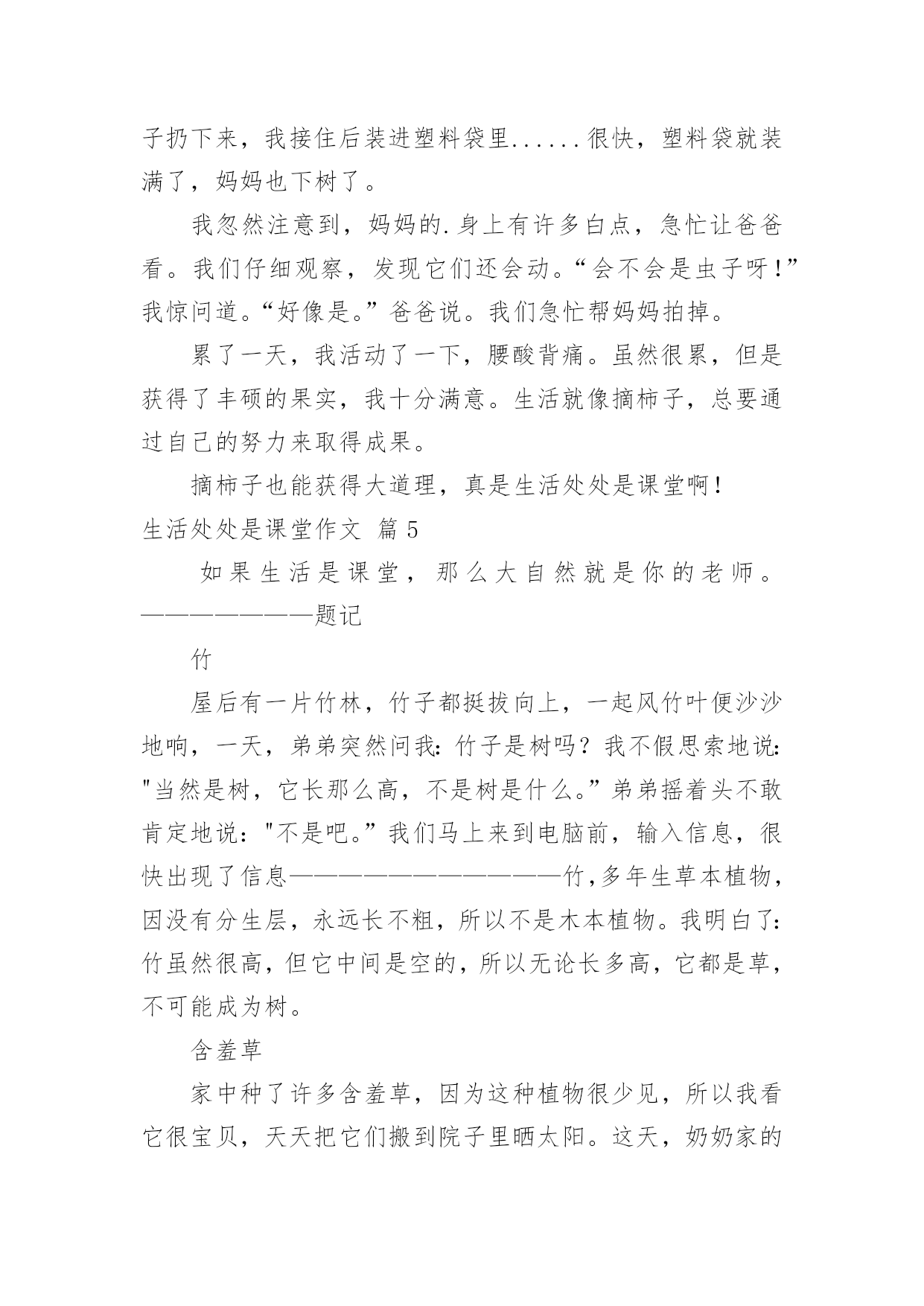 生活处处是课堂作文[荐]生活处处是课堂作文无论是身处学校还是步入社会,许多人都写过作文吧,根据写作命题的特点,作文可以分为命题作文和非命题作文。如何写一篇有思想、有文采的作文呢?下面是小编帮大家整理的生活处处是课堂作文7篇,供大家参考借鉴,希望可以帮助到有需要的朋友。生活处处是课堂作文篇1课堂,不仅仅只局限于学校之内,生活之中也一定有许多课堂,让我们受益匪浅。今天,我们就一起来了解我心中最宝贵的那堂课∶学自行车。那是一个风和日丽的星期天,微风习习,是个骑车的好日子。望着叔叔阿姨们像飞驰地骏马骑车向远处驶去时,我心中不禁充满了羡慕:这是一种多么好的运动啊!于是,我缓缓推着自行车,叫上妈妈,开始进行自行车训练。此刻,我的'眼中充满着憧憬,希望能学好这项技艺……训练开始了,我自信满满地跨上自行车,准备行驶。当我踩动踏板的那一瞬间,我害怕了。害怕自己摔倒,害怕被路人嘲笑……在紧张和不安下,我变得烦躁起来,车把手扶着摇摇晃晃,失去了平衡。糟了,前方有一棵树,我却来不及躲闪,“嘭”!自行车前轮撞到树干上,我也摔倒了在地,想要爬起来,但两眼冒着金星,觉得天旋地转。妈妈赶紧跑过来,把我扶起,我两个膝盖的裤子都破了洞,妈妈挽起我的裤脚,膝盖流着血丝。我失去了信心,想放弃了,妈妈看透了我的心思,说:“男子汉要能吃得了苦,不要遇到一点挫折就放弃!妈妈相信你是个不向困难低头的好孩子,加油!”这使我重新找回了自信,再次跨上自行车,妈妈在后面扶着我。这回我冷静多了,专心致志地往前骑,妈妈放手了我也觉然不知,就这样,我学会了自行车。学自行车也是课堂,让我懂得了∶不管做什么,学什么,都要冷静、专心、全心贯注,成功就属于你!生活处处是课堂作文篇2生活如同一位高明的老师,总是在不经意间教会我们知识,让我们懂得道理,这次“生活”老师就让我懂得了一个深刻的道理。今年暑假,我和爸妈一起去了上海,在车上,我的肚子就已饿得咕咕叫,我暗暗发誓,等下车后,我一定要大吃一顿。下了车,我们来到了一家自助餐厅,四壁古朴典雅,屋顶上的欧式吊灯发着耀眼的光芒,仿古式的音乐机奏响了一首首优美的乐曲,动听悠扬的歌声在我的耳旁回响,让人心旷神怡。桌子上摆着各式琳琅满目的美食,有巨无霸汉堡,如同金子一般金灿灿的炸鸡,还有香喷喷的牛排……看着眼前的这些美食,我垂涎三尺,食指大动,心想:这下可以大饱口福了。于是,我连忙拿来盘子前去取餐,很快,我的盘子上便装满了战利品。回来时,我看见妈妈坐在椅子上,一动不动,我的.脸上写满了问号,“妈妈,你怎么不吃呢?我们可是付了钱进来的呀?”妈妈只是朝我微微一笑,并没有要起身的意思。看着眼前的美食,我已无抵抗之力,根本顾不上妈妈了,我立马拿起筷子,开始狼吞虎咽了起来。可是,一个巨无霸汉堡和一份牛排下肚后,我已经吃撑了。眼前那美味的食物,好像变成了蜡制的苹果一样,中看不中用了。妈妈看着满桌的食物,语重心长地对我说:“儿子呀,这些粮食都是农民伯伯辛辛苦苦种出来的呀,我们可不能浪费!”说着,妈妈拿起筷子,吃了起来。顿时,我对自己浪费粮食的行为感到羞愧不已,我的脸如同熟透的山柿子,恨不得找个地缝钻进去。是啊,饱汉不知饿汉饥,现在,我正在浪费粮食,而在非洲的大路上,正有成千上万的人,因为缺少粮食面临着死亡的危险啊。“谁知盘中餐,粒粒皆辛苦”,浪费粮食是可耻的,光盘行动要牢记,以后我一定要珍惜粮食。生活处处是课堂作文篇3有一本书,书上没有作者的姓名,但人人都是作者--那就是生活。那天是个晴朗的日子,我们要去游泳。来到黄岛的金沙滩,我提着救生圈,迈着小碎步,踏着温暖的沙滩向大海里走去。可当我双脚触到海水时,我又缩了回来。“怎样,不敢下水了?”妈妈问。“恩……不,不想去。”“你看你这孩子,提意来游泳的,你又不下去了!”妈妈顿时大发雷霆。“这海浪也太大了。”我浑身起满了鸡皮疙瘩。妈妈头也不回地走向大海。我的身旁有许多小朋友,他们用头顶起一个个大浪,向远方游去。我再也忍不住了,大踏步地向海里走去。这时,在无边无际的大海深处涌来一个高浪,像无数匹矫健的.骏马在海上奔腾。海里的人们向水里一潜就躲过了这个大浪,他们笑得是那样开心。大浪扑面而来,我来不及逃脱,鼓起腮帮子,紧闭眼睛,双手插在海底的泥土上,低下头,潜入水中。又有一个大浪向我涌过来时,我挺不住了,提着救生圈向岸边跑去。海浪排山倒海,将我推出去老远,我栽了几个跟头,这可不得了,后面又接二连三的来了几个浪头。我在海中站起来了!我不顾三七二十一,折回头向高浪迎去,我全身淹没在海浪中。我睁开眼睛,脚已经不着地了,完全是靠救生圈的浮力支撑着。我已经到了深海区。海浪把我托上埋下。但是对于海浪我已毫不惧怕,在与海浪的搏斗中我也明白:不经历风雨,怎能见彩虹?生活处处是课堂作文篇4去年秋天,爸爸妈妈带着我上山摘柿子。我们上了山,放眼望去,柿子树