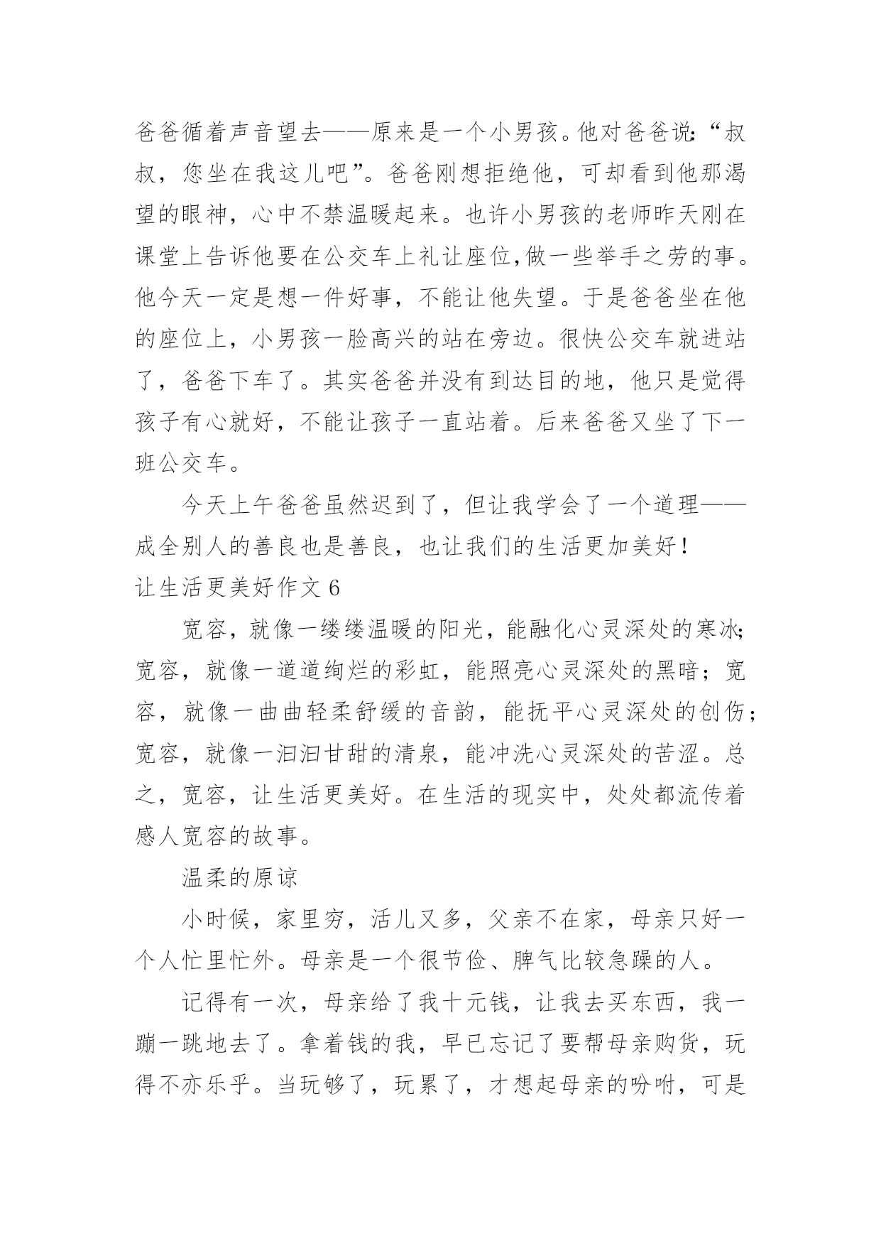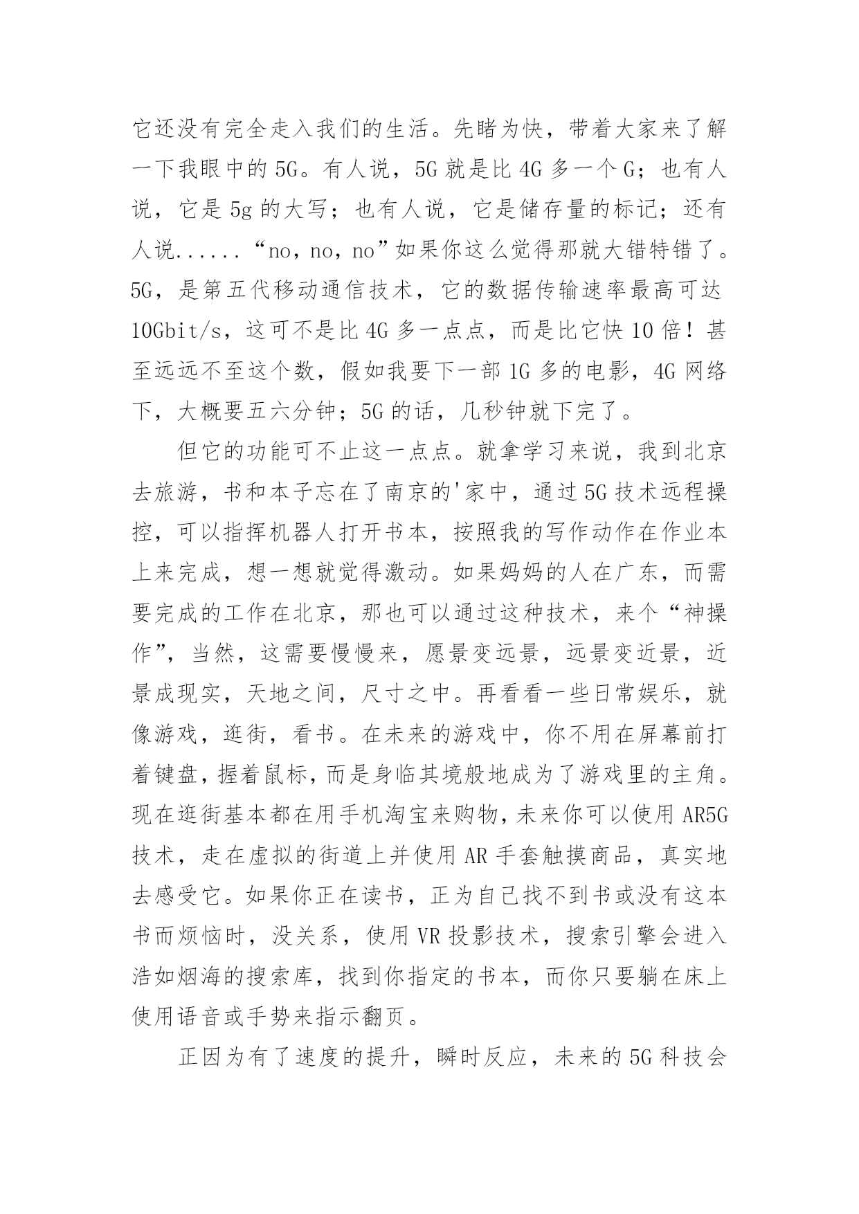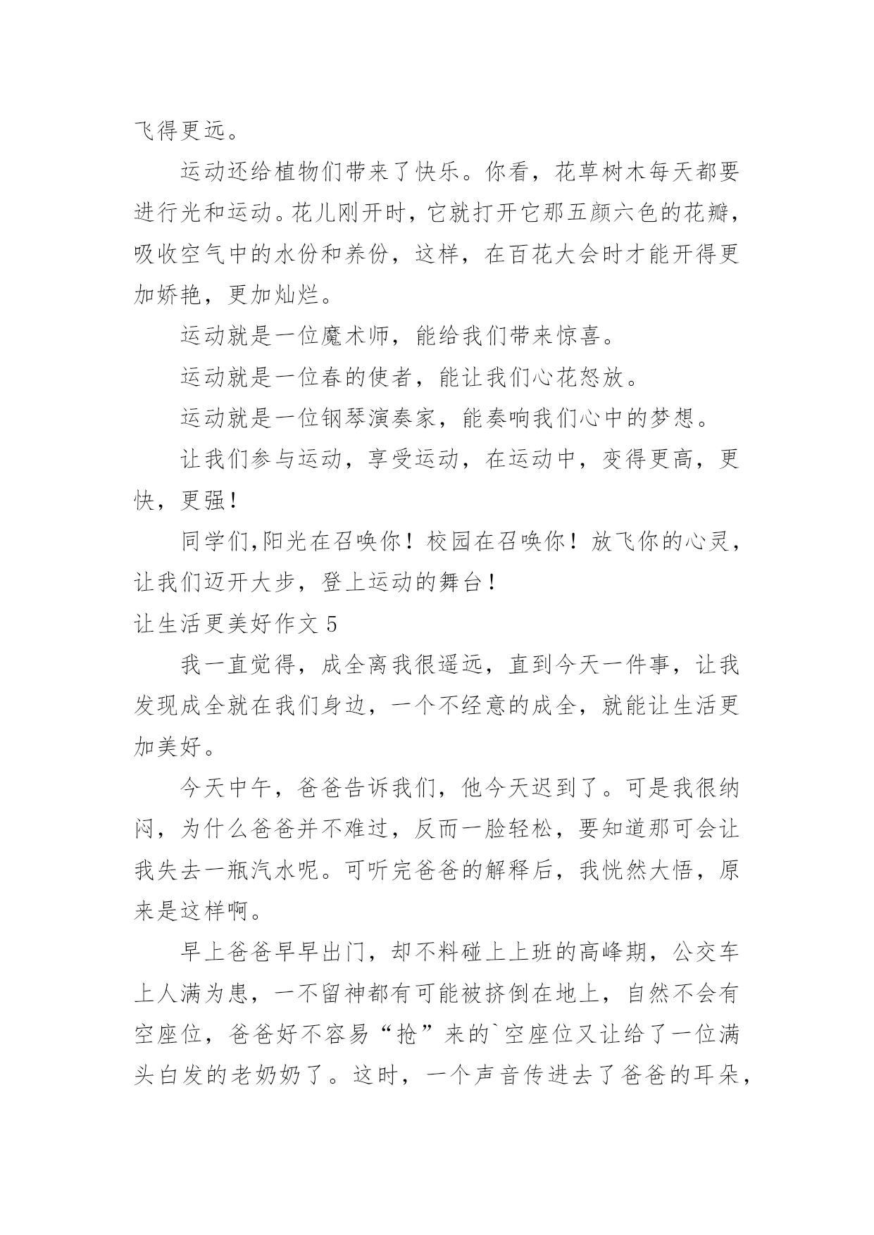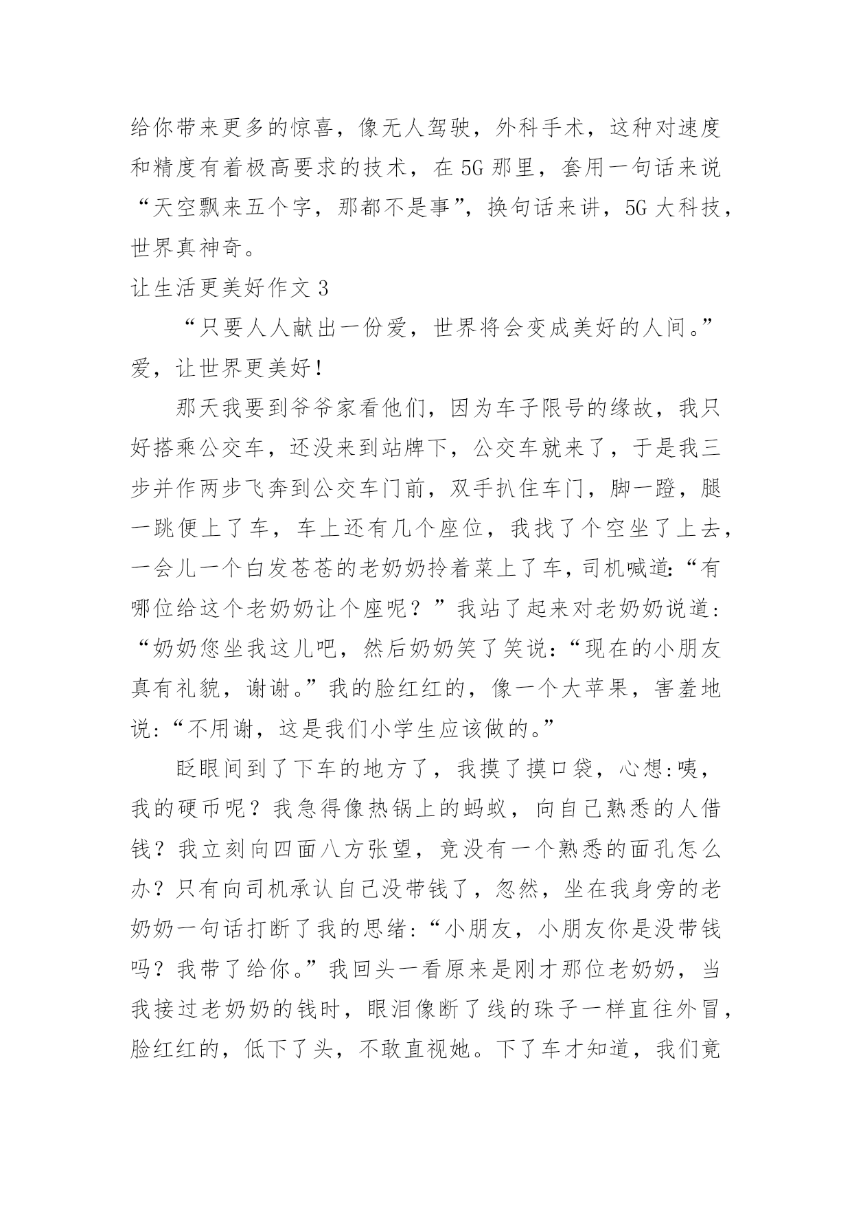 让生活更美好作文让生活更美好作文汇总(15篇)在平凡的学习、工作、生活中,大家都尝试过写作文吧,作文是人们以书面形式表情达意的言语活动。还是对作文一筹莫展吗?以下是小编整理的让生活更美好作文,仅供参考,希望能够帮助到大家。让生活更美好作文1今天,我看到了一则小故事,上面说的是,一群谁也不认识的陌生人在一家饭店吃饭,大家都因小心谨慎而感到不自在,就在这时后面突然传来一声盐罐破了的声音,而因此打破了尴尬的气氛,这个故事让我明白了一个道理,人们都感觉人与人之间的隔膜很厚,但是这隔膜很脆弱,问题是勇于打破它的'人太少了。其实,一个微笑,一个眼神,一个声音,和简单的一句话都可以打破这之间的隔膜。比如我每天上学的时候路上都会遇见张伯伯,我总是对张伯伯微笑着说早上好啊张伯伯,他也会对我说,你好,去上学啊!让生活更美好作文25G,一个让人们既熟悉又陌生的词,熟悉是因为朋友圈微博里到处刷,陌生是因为大部分人对5G只是一知半解,它还没有完全走入我们的生活。先睹为快,带着大家来了解一下我眼中的5G。有人说,5G就是比4G多一个G;也有人说,它是5g的大写;也有人说,它是储存量的标记;还有人说......“no,no,no”如果你这么觉得那就大错特错了。5G,是第五代移动通信技术,它的数据传输速率最高可达10Gbit/s,这可不是比4G多一点点,而是比它快10倍!甚至远远不至这个数,假如我要下一部1G多的电影,4G网络下,大概要五六分钟;5G的话,几秒钟就下完了。但它的功能可不止这一点点。就拿学习来说,我到北京去旅游,书和本子忘在了南京的'家中,通过5G技术远程操控,可以指挥机器人打开书本,按照我的写作动作在作业本上来完成,想一想就觉得激动。如果妈妈的人在广东,而需要完成的工作在北京,那也可以通过这种技术,来个“神操作”,当然,这需要慢慢来,愿景变远景,远景变近景,近景成现实,天地之间,尺寸之中。再看看一些日常娱乐,就像游戏,逛街,看书。在未来的游戏中,你不用在屏幕前打着键盘,握着鼠标,而是身临其境般地成为了游戏里的主角。现在逛街基本都在用手机淘宝来购物,未来你可以使用AR5G技术,走在虚拟的街道上并使用AR手套触摸商品,真实地去感受它。如果你正在读书,正为自己找不到书或没有这本书而烦恼时,没关系,使用VR投影技术,搜索引擎会进入浩如烟海的搜索库,找到你指定的书本,而你只要躺在床上使用语音或手势来指示翻页。正因为有了速度的提升,瞬时反应,未来的5G科技会给你带来更多的惊喜,像无人驾驶,外科手术,这种对速度和精度有着极高要求的技术,在5G那里,套用一句话来说“天空飘来五个字,那都不是事”,换句话来讲,5G大科技,世界真神奇。让生活更美好作文3“只要人人献出一份爱,世界将会变成美好的人间。”爱,让世界更美好!那天我要到爷爷家看他们,因为车子限号的缘故,我只好搭乘公交车,还没来到站牌下,公交车就来了,于是我三步并作两步飞奔到公交车门前,双手扒住车门,脚一蹬,腿一跳便上了车,车上还有几个座位,我找了个空坐了上去,一会儿一个白发苍苍的老奶奶拎着菜上了车,司机喊道:“有哪位给这个老奶奶让个座呢?”我站了起来对老奶奶说道:“奶奶您坐我这儿吧,然后奶奶笑了笑说:“现在的小朋友真有礼貌,谢谢。”我的脸红红的,像一个大苹果,害羞地说:“不用谢,这是我们小学生应该做的。”眨眼间到了下车的地方了,我摸了摸口袋,心想:咦,我的硬币呢?我急得像热锅上的蚂蚁,向自己熟悉的人借钱?我立刻向四面八方张望,竞没有一个熟悉的面孔怎么办?只有向司机承认自己没带钱了,忽然,坐在我身旁的老奶奶一句话打断了我的思绪:“小朋友,小朋友你是没带钱吗?我带了给你。”我回头一看原来是刚才那位老奶奶,当我接过老奶奶的钱时,眼泪像断了线的珠子一样直往外冒,脸红红的,低下了头,不敢直视她。下了车才知道,我们竟然是一个村子的`,我帮她拎着菜,她帮我背着书包,一老一少一起向村里走去。爱心就像一把火,温暖了我的心;爱心就像一汪清泉,让我的心不再干渴;爱心,就像一场春雨滋润了我的灵魂。还是那句话,只要人人献出一份爱,世界将会成为美好的人间。爱心,让生活更美好!让生活更美好作文4生命在于运动。生命不息,运动不止。因为运动,让我们拥有健康的体魄;因为运动,让我们享受快乐;因为运动,让我们的生活更精彩。每当清晨,阳光都会跳进我的家,阳光像金子一般,是那么耀眼,那么明亮。它温暖了我的.全身,照亮了我的家人,我们全家就要起床锻炼身体了。动起来,汗水会换来精彩!动起来,你会更加可爱!动起来,别再让梦期待!动起来,成功会向你敞开!生命在于运动”,没有运动也就没有了生命,缺少运动的生命是短暂的!参与运动,会赋予我们勇敢、果断的精神;参与运动,会赋予我们更快、更高、更强的力量;参与运动,会令我们拥有健康与快乐。运动不但给我们带来了