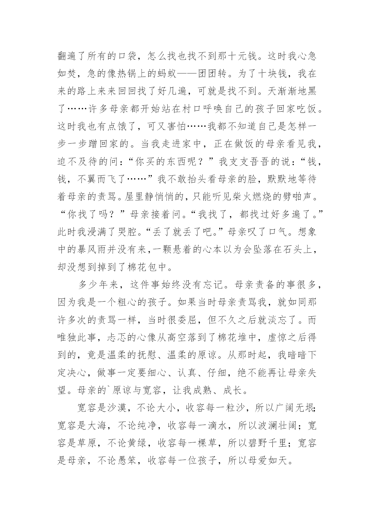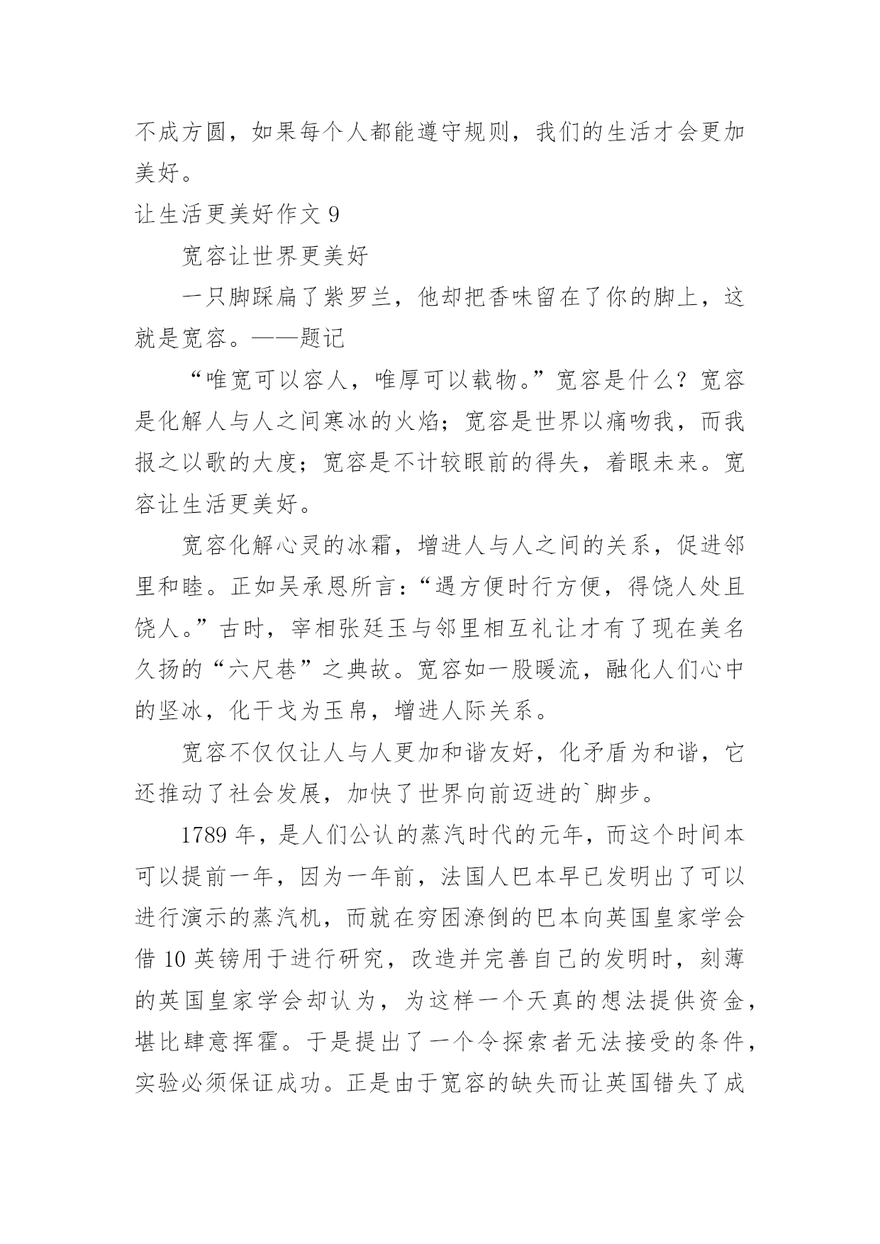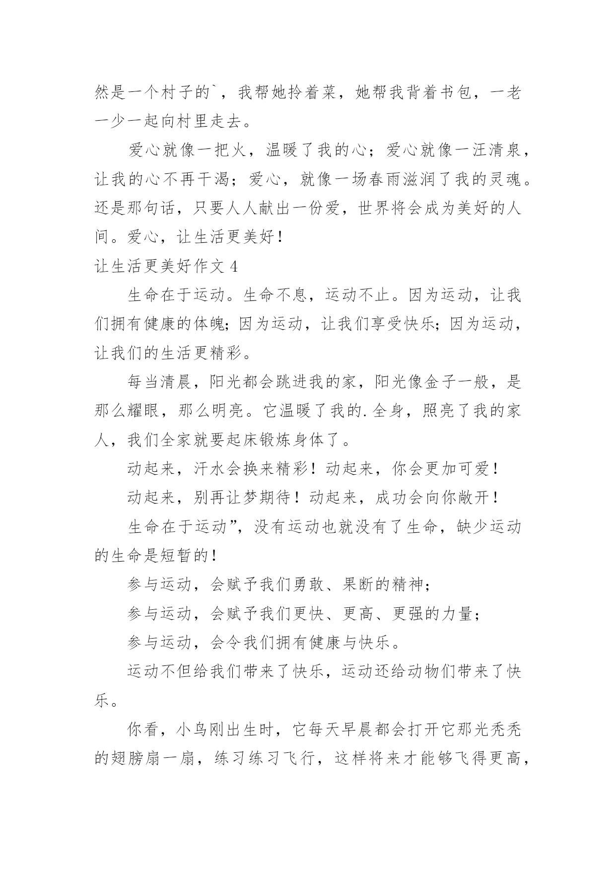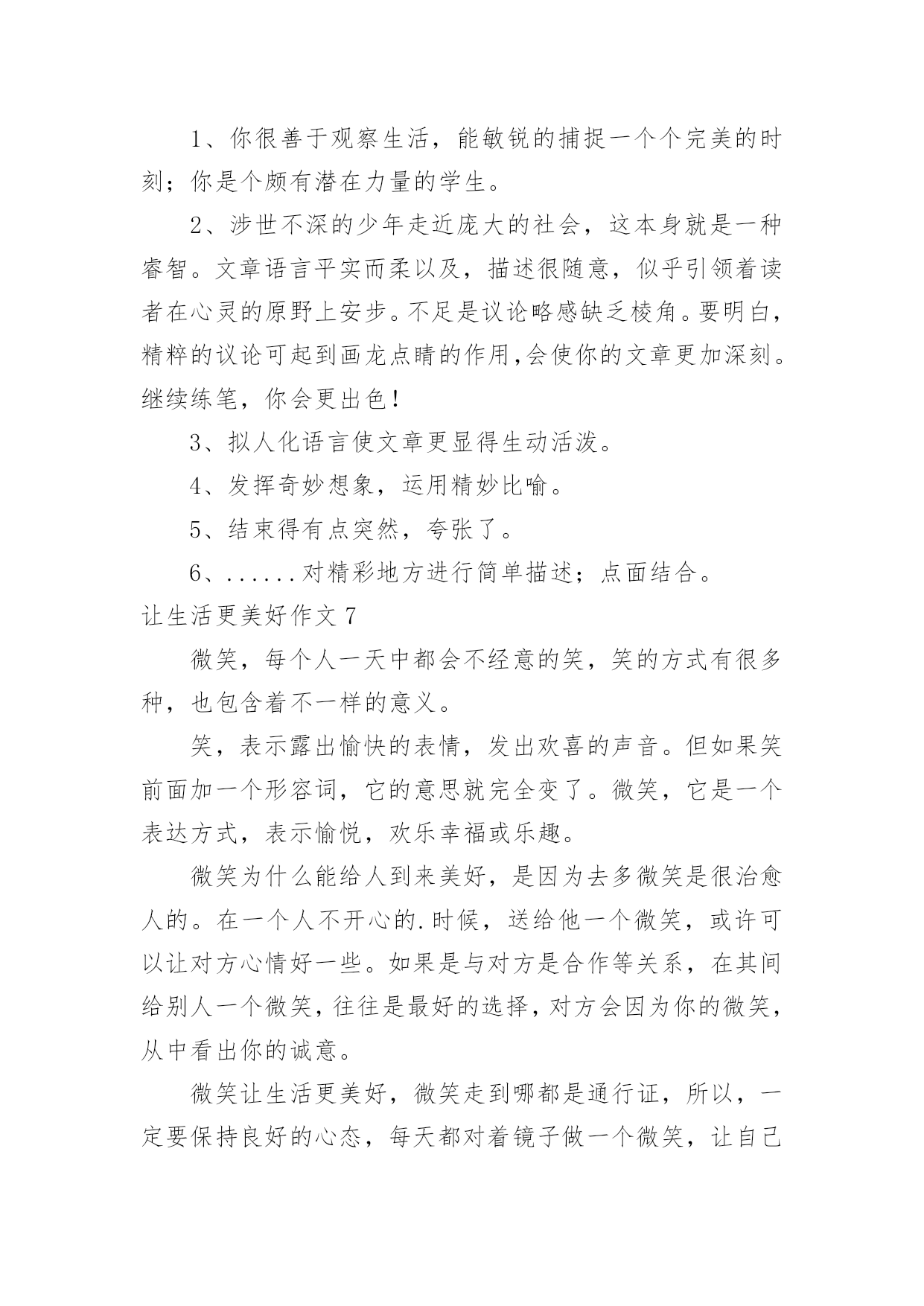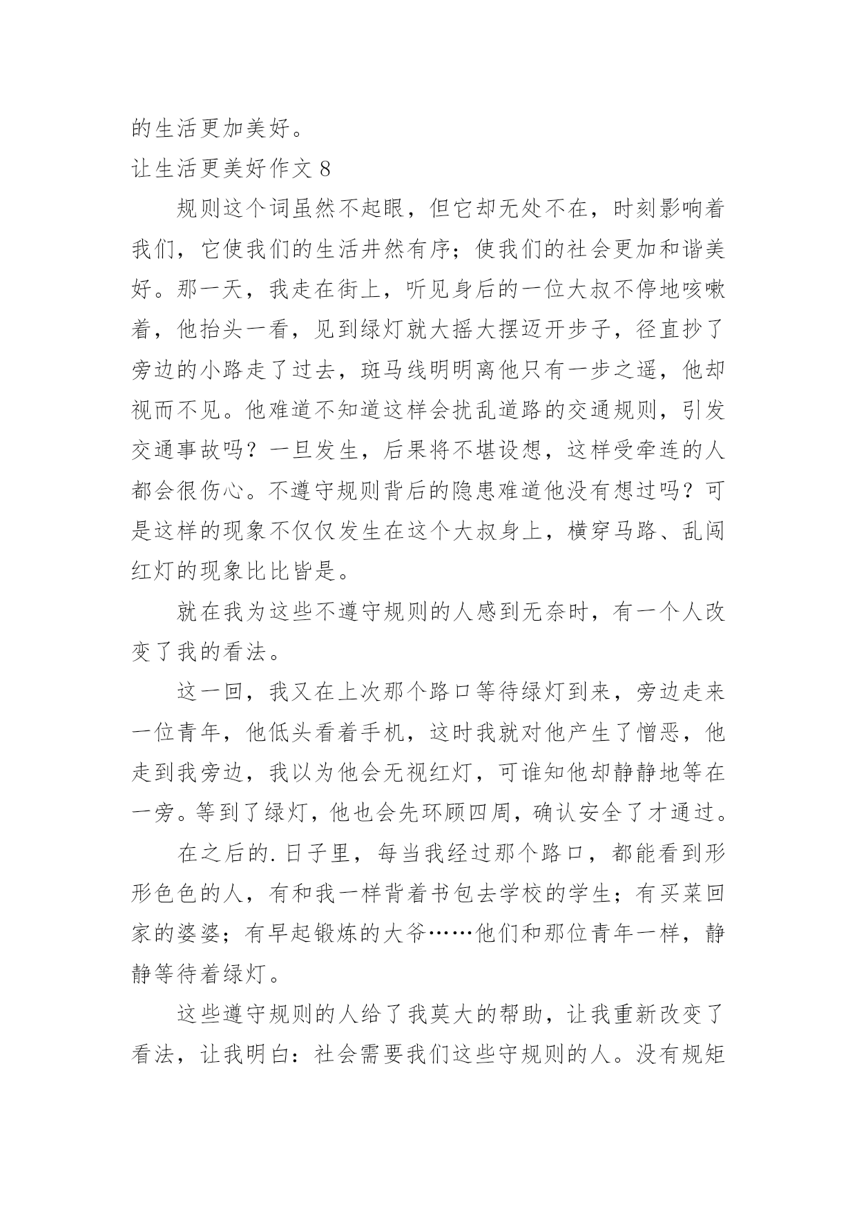 让生活更美好作文让生活更美好作文汇总(15篇)在平凡的学习、工作、生活中,大家都尝试过写作文吧,作文是人们以书面形式表情达意的言语活动。还是对作文一筹莫展吗?以下是小编整理的让生活更美好作文,仅供参考,希望能够帮助到大家。让生活更美好作文1今天,我看到了一则小故事,上面说的是,一群谁也不认识的陌生人在一家饭店吃饭,大家都因小心谨慎而感到不自在,就在这时后面突然传来一声盐罐破了的声音,而因此打破了尴尬的气氛,这个故事让我明白了一个道理,人们都感觉人与人之间的隔膜很厚,但是这隔膜很脆弱,问题是勇于打破它的'人太少了。其实,一个微笑,一个眼神,一个声音,和简单的一句话都可以打破这之间的隔膜。比如我每天上学的时候路上都会遇见张伯伯,我总是对张伯伯微笑着说早上好啊张伯伯,他也会对我说,你好,去上学啊!让生活更美好作文25G,一个让人们既熟悉又陌生的词,熟悉是因为朋友圈微博里到处刷,陌生是因为大部分人对5G只是一知半解,它还没有完全走入我们的生活。先睹为快,带着大家来了解一下我眼中的5G。有人说,5G就是比4G多一个G;也有人说,它是5g的大写;也有人说,它是储存量的标记;还有人说......“no,no,no”如果你这么觉得那就大错特错了。5G,是第五代移动通信技术,它的数据传输速率最高可达10Gbit/s,这可不是比4G多一点点,而是比它快10倍!甚至远远不至这个数,假如我要下一部1G多的电影,4G网络下,大概要五六分钟;5G的话,几秒钟就下完了。但它的功能可不止这一点点。就拿学习来说,我到北京去旅游,书和本子忘在了南京的'家中,通过5G技术远程操控,可以指挥机器人打开书本,按照我的写作动作在作业本上来完成,想一想就觉得激动。如果妈妈的人在广东,而需要完成的工作在北京,那也可以通过这种技术,来个“神操作”,当然,这需要慢慢来,愿景变远景,远景变近景,近景成现实,天地之间,尺寸之中。再看看一些日常娱乐,就像游戏,逛街,看书。在未来的游戏中,你不用在屏幕前打着键盘,握着鼠标,而是身临其境般地成为了游戏里的主角。现在逛街基本都在用手机淘宝来购物,未来你可以使用AR5G技术,走在虚拟的街道上并使用AR手套触摸商品,真实地去感受它。如果你正在读书,正为自己找不到书或没有这本书而烦恼时,没关系,使用VR投影技术,搜索引擎会进入浩如烟海的搜索库,找到你指定的书本,而你只要躺在床上使用语音或手势来指示翻页。正因为有了速度的提升,瞬时反应,未来的5G科技会给你带来更多的惊喜,像无人驾驶,外科手术,这种对速度和精度有着极高要求的技术,在5G那里,套用一句话来说“天空飘来五个字,那都不是事”,换句话来讲,5G大科技,世界真神奇。让生活更美好作文3“只要人人献出一份爱,世界将会变成美好的人间。”爱,让世界更美好!那天我要到爷爷家看他们,因为车子限号的缘故,我只好搭乘公交车,还没来到站牌下,公交车就来了,于是我三步并作两步飞奔到公交车门前,双手扒住车门,脚一蹬,腿一跳便上了车,车上还有几个座位,我找了个空坐了上去,一会儿一个白发苍苍的老奶奶拎着菜上了车,司机喊道:“有哪位给这个老奶奶让个座呢?”我站了起来对老奶奶说道:“奶奶您坐我这儿吧,然后奶奶笑了笑说:“现在的小朋友真有礼貌,谢谢。”我的脸红红的,像一个大苹果,害羞地说:“不用谢,这是我们小学生应该做的。”眨眼间到了下车的地方了,我摸了摸口袋,心想:咦,我的硬币呢?我急得像热锅上的蚂蚁,向自己熟悉的人借钱?我立刻向四面八方张望,竞没有一个熟悉的面孔怎么办?只有向司机承认自己没带钱了,忽然,坐在我身旁的老奶奶一句话打断了我的思绪:“小朋友,小朋友你是没带钱吗?我带了给你。”我回头一看原来是刚才那位老奶奶,当我接过老奶奶的钱时,眼泪像断了线的珠子一样直往外冒,脸红红的,低下了头,不敢直视她。下了车才知道,我们竟然是一个村子的`,我帮她拎着菜,她帮我背着书包,一老一少一起向村里走去。爱心就像一把火,温暖了我的心;爱心就像一汪清泉,让我的心不再干渴;爱心,就像一场春雨滋润了我的灵魂。还是那句话,只要人人献出一份爱,世界将会成为美好的人间。爱心,让生活更美好!让生活更美好作文4生命在于运动。生命不息,运动不止。因为运动,让我们拥有健康的体魄;因为运动,让我们享受快乐;因为运动,让我们的生活更精彩。每当清晨,阳光都会跳进我的家,阳光像金子一般,是那么耀眼,那么明亮。它温暖了我的.全身,照亮了我的家人,我们全家就要起床锻炼身体了。动起来,汗水会换来精彩!动起来,你会更加可爱!动起来,别再让梦期待!动起来,成功会向你敞开!生命在于运动”,没有运动也就没有了生命,缺少运动的生命是短暂的!参与运动,会赋予我们勇敢、果断的精神;参与运动,会赋予我们更快、更高、更强的力量;参与运动,会令我们拥有健康与快乐。运动不但给我们带来了