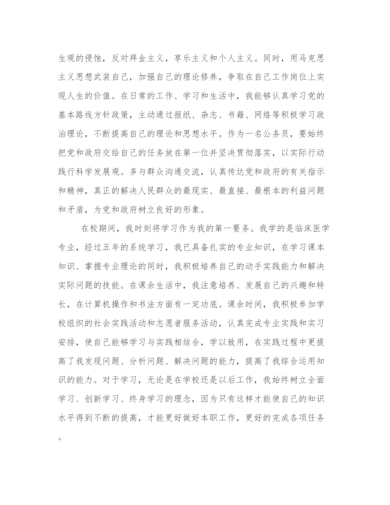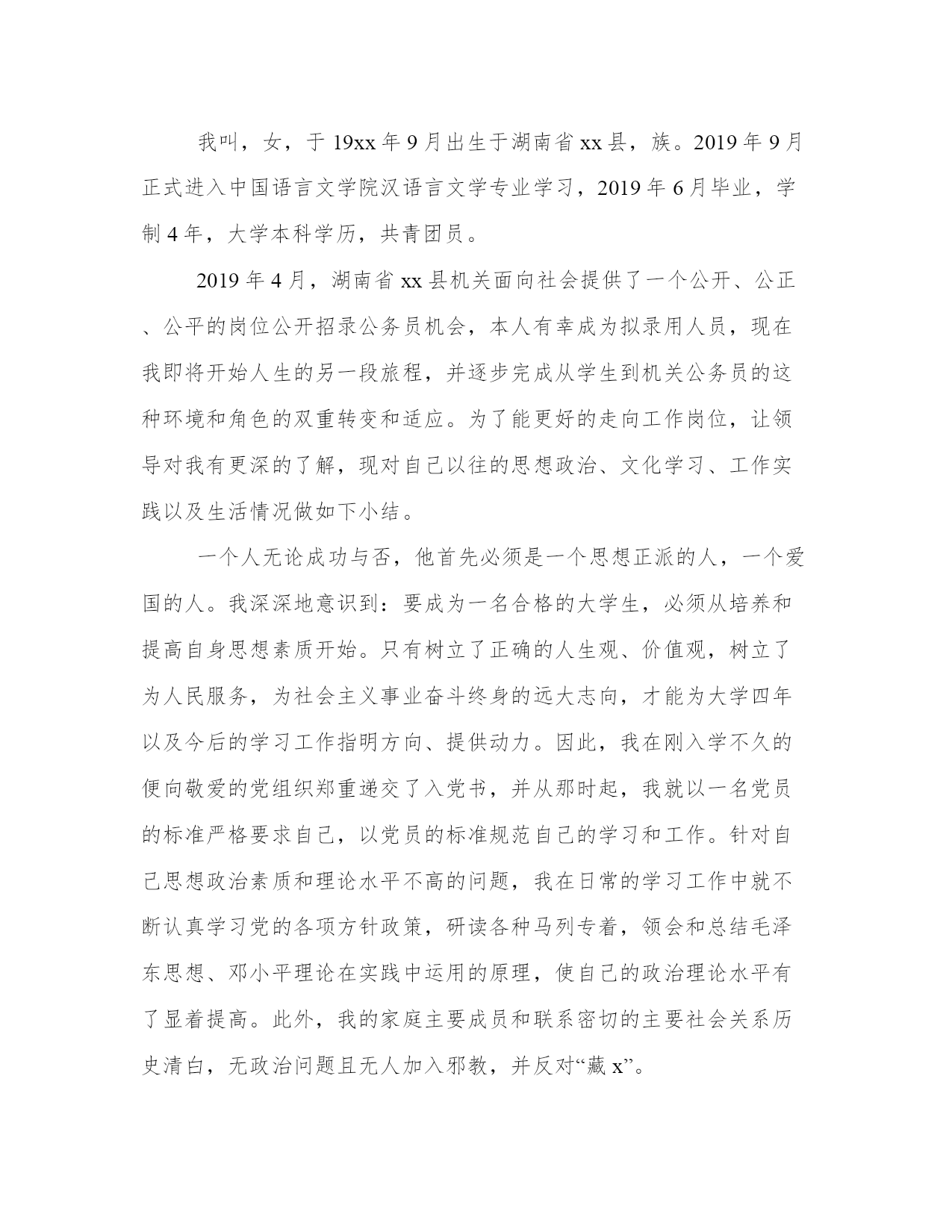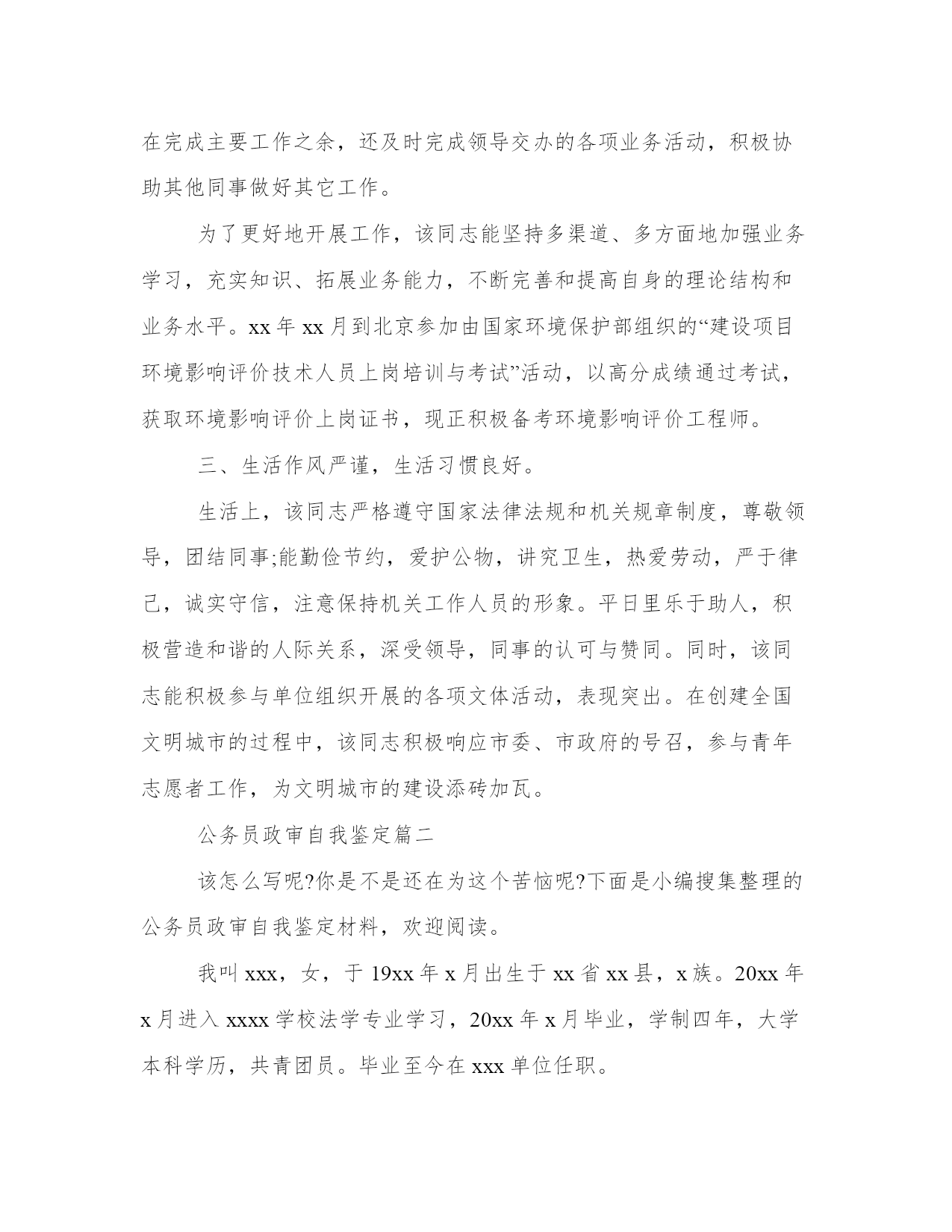 公务员政审自我鉴定(优质15篇)总结是一种反思和思考的过程,对我们的学习和成长非常重要。如何处理好人际关系,建立良好的人际网络,使自己的生活更加美满和幸福?以下是小编为大家介绍的心理健康知识,帮助大家更好地管理自己的情绪和心态。公务员政审自我鉴定篇一男汉族中共党员本科学历。xx年xx月出生于xx年x月参加工作现就职于。该同志的主要表现如下:一、思想政治上,政治立场坚定,具有较强的政治理论水平。该同志始终坚持运用马克思列宁主义的立场、观点和方法论,运用辩证唯物主义与历史唯物主义去分析和观察事物,坚持真理,坚持正确的世界观、人生观、价值观,用正确的世界观、人生观、价值观指导自己的学习、工作和生活实践,在重大原则问题上旗帜鲜明,在大是大非面前头脑清醒。能够适应时代的变化和工作的需要,不断加强政治和业务知识学习,适应能力强。对党的事业充满信心,认真贯彻执行党的路线、方针、政策。在思想上积极构筑抵御资产阶级民主和自由化、拜金主义、自由主义等一切腐朽思想侵蚀的坚固防线。热爱祖国,热爱中国共产党,热爱社会主义,拥护中国共产党的领导,拥护改革开放。具有较强的大局意识、责任意识,工作勤勤恳恳,任劳任怨。工作中能够摆正位置,严格要求,为人正派,遵纪守法,尊重领导,团结同志。在过去的一年中,该同志能够认真参加单位组织的各种政治学习活动,运用互联网、报刊、电视等媒体多途径地学习了邓小平理论、“”重要思想、科学发展观和党的重大方针政策以及与工作相关的各种知识,并注重联系工作实际加强积累、消化并吸收。特别是今年开展深入学习科学发展观活动以来,该同志积极参加学习实践活动,深刻理解科学发展观的、意义,认真做好学习笔记,积极汇报学习成果、查找自身不足并及时改进。认真学习珠三角改革发展规划纲要,参加组织的珠三角改革发展规划纲要的专家辅导会。并能结合工作实践不断克服自身不足,牢固树立改革意识、创新意识和超前意识,不断进取,各项工作均取得了较好成绩,得到了领导班子成员和绝大多数干部群众的认可。二、创新学习,工作认真负责。在工作上,该同志服从集体和领导的工作安排,为人踏实稳重,责任心强,有着强烈的集体荣誉感和良好的团队合作精神,想问题、做事情能从大局出发,以集体为重。做事积极主动,迎难而上,不怕苦,不怕累。在本职岗位上敬岗爱业,尽职尽责,其编制的环境影响报告表专业而全面,既能对工程进行全面详细地分析,又能对环境的保护提出科学的意见,为我区的环境保护工作提供科学的决策依据。在完成主要工作之余,还及时完成领导交办的各项业务活动,积极协助其他同事做好其它工作。为了更好地开展工作,该同志能坚持多渠道、多方面地加强业务学习,充实知识、拓展业务能力,不断完善和提高自身的理论结构和业务水平。xx年xx月到北京参加由国家环境保护部组织的“建设项目环境影响评价技术人员上岗培训与考试”活动,以高分成绩通过考试,获取环境影响评价上岗证书,现正积极备考环境影响评价工程师。三、生活作风严谨,生活习惯良好。生活上,该同志严格遵守国家法律法规和机关规章制度,尊敬领导,团结同事;能勤俭节约,爱护公物,讲究卫生,热爱劳动,严于律己,诚实守信,注意保持机关工作人员的形象。平日里乐于助人,积极营造和谐的人际关系,深受领导,同事的认可与赞同。同时,该同志能积极参与单位组织开展的各项文体活动,表现突出。在创建全国文明城市的过程中,该同志积极响应市委、市政府的号召,参与青年志愿者工作,为文明城市的建设添砖加瓦。公务员政审自我鉴定篇二该怎么写呢?你是不是还在为这个苦恼呢?下面是小编搜集整理的公务员政审自我鉴定材料,欢迎阅读。我叫xxx,女,于19xx年x月出生于xx省xx县,x族。20xx年x月进入xxxx学校法学专业学习,20xx年x月毕业,学制四年,大学本科学历,共青团员。毕业至今在xxx单位任职。20xx年x月,本人参加了xx省公务员考试,报考了xx职位,有幸以优异的成绩成为拟录用人员,现在我即将开始人生的另一段旅程,并逐步完成从事业单位到机关公务员的这种环境和角色的双重转变和适应。为了能更好的走向工作岗位,让领导对我有更深的了解,现对自己以往的学习、工作、思想、生活情况做如下小结。在大学期间,本人遵守国家法律、学校纪律,作为一名法学专业的学生,在日常生活中以课堂所学为基础,培养自己的法律意识,通过老师的教导、同学的帮助以及自己的努力,认真学习、打下了扎实的法学基础。参加工作以来,围绕本职中心工作,对照相关标准,严以律己,较好的完成各项工作任务;同时,认真学习相关业务知识,不断提高自己的理论水平和综合素质;严格遵守单位制定的各项工作制度,积极参加单位组织的各项活动,虚心向有经验的同志请教工作上的问题,学习他们的先进经验和知识;敢于吃苦、善于钻研,能按规定的时间与程序办事,