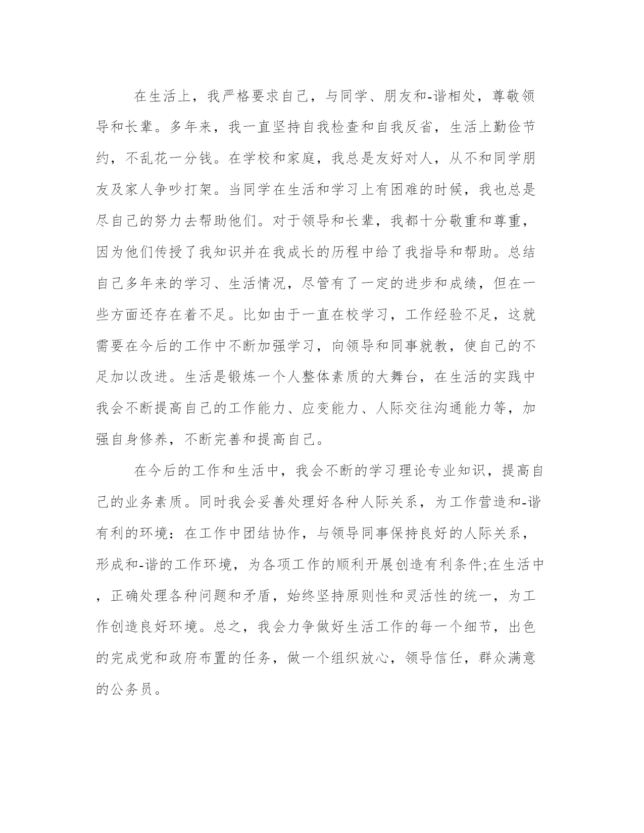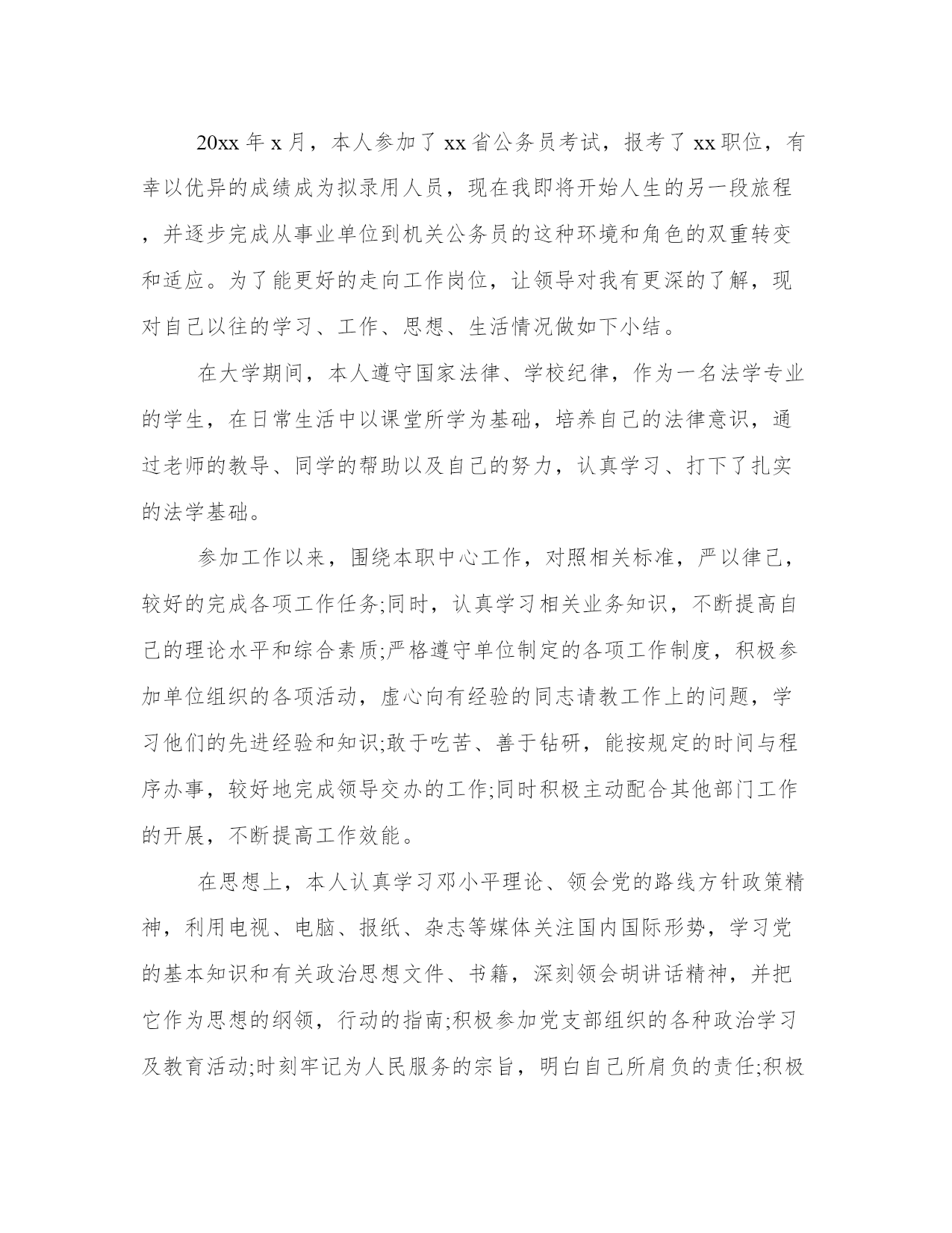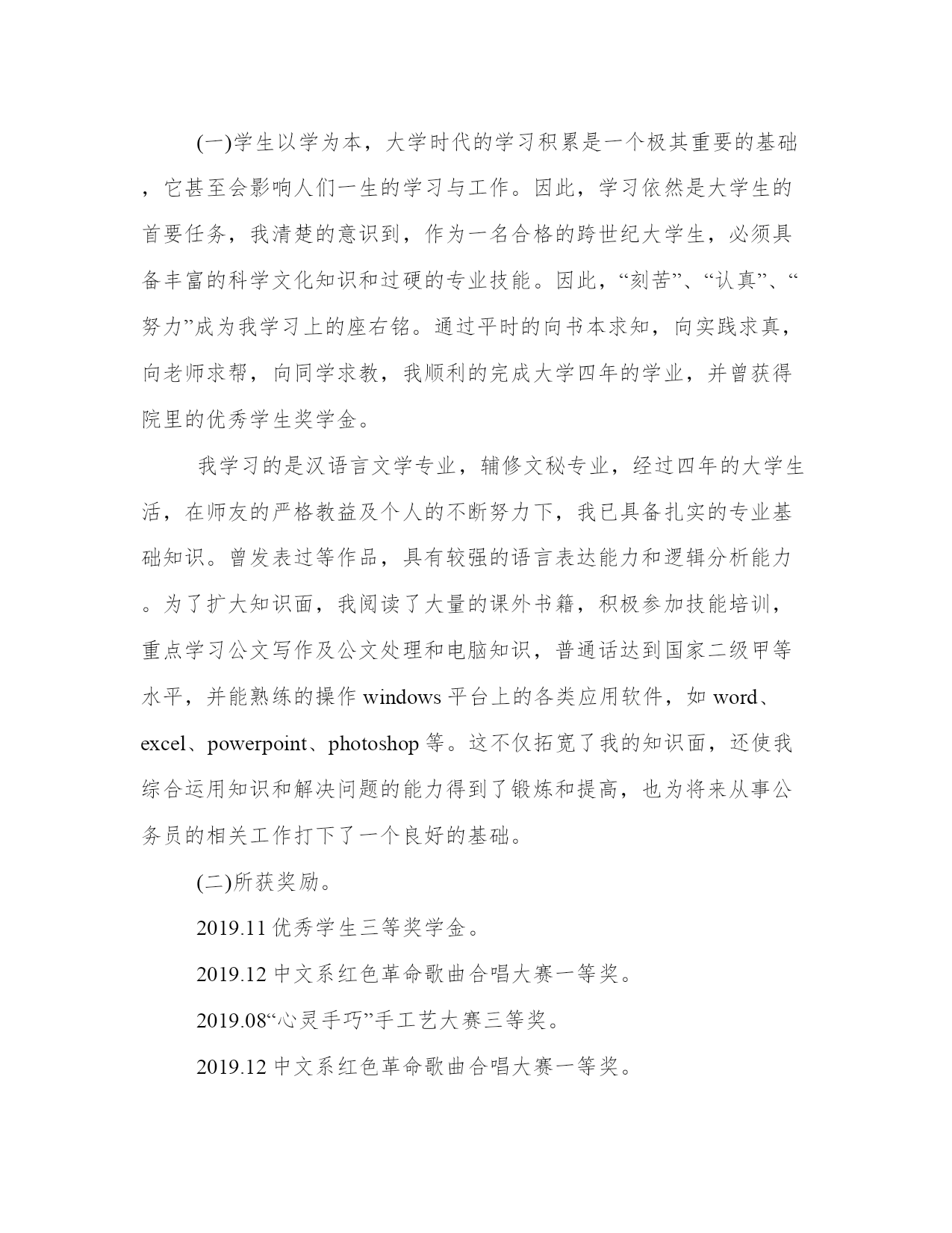 公务员政审自我鉴定(优质15篇)总结是一种反思和思考的过程,对我们的学习和成长非常重要。如何处理好人际关系,建立良好的人际网络,使自己的生活更加美满和幸福?以下是小编为大家介绍的心理健康知识,帮助大家更好地管理自己的情绪和心态。公务员政审自我鉴定篇一男汉族中共党员本科学历。xx年xx月出生于xx年x月参加工作现就职于。该同志的主要表现如下:一、思想政治上,政治立场坚定,具有较强的政治理论水平。该同志始终坚持运用马克思列宁主义的立场、观点和方法论,运用辩证唯物主义与历史唯物主义去分析和观察事物,坚持真理,坚持正确的世界观、人生观、价值观,用正确的世界观、人生观、价值观指导自己的学习、工作和生活实践,在重大原则问题上旗帜鲜明,在大是大非面前头脑清醒。能够适应时代的变化和工作的需要,不断加强政治和业务知识学习,适应能力强。对党的事业充满信心,认真贯彻执行党的路线、方针、政策。在思想上积极构筑抵御资产阶级民主和自由化、拜金主义、自由主义等一切腐朽思想侵蚀的坚固防线。热爱祖国,热爱中国共产党,热爱社会主义,拥护中国共产党的领导,拥护改革开放。具有较强的大局意识、责任意识,工作勤勤恳恳,任劳任怨。工作中能够摆正位置,严格要求,为人正派,遵纪守法,尊重领导,团结同志。在过去的一年中,该同志能够认真参加单位组织的各种政治学习活动,运用互联网、报刊、电视等媒体多途径地学习了邓小平理论、“”重要思想、科学发展观和党的重大方针政策以及与工作相关的各种知识,并注重联系工作实际加强积累、消化并吸收。特别是今年开展深入学习科学发展观活动以来,该同志积极参加学习实践活动,深刻理解科学发展观的、意义,认真做好学习笔记,积极汇报学习成果、查找自身不足并及时改进。认真学习珠三角改革发展规划纲要,参加组织的珠三角改革发展规划纲要的专家辅导会。并能结合工作实践不断克服自身不足,牢固树立改革意识、创新意识和超前意识,不断进取,各项工作均取得了较好成绩,得到了领导班子成员和绝大多数干部群众的认可。二、创新学习,工作认真负责。在工作上,该同志服从集体和领导的工作安排,为人踏实稳重,责任心强,有着强烈的集体荣誉感和良好的团队合作精神,想问题、做事情能从大局出发,以集体为重。做事积极主动,迎难而上,不怕苦,不怕累。在本职岗位上敬岗爱业,尽职尽责,其编制的环境影响报告表专业而全面,既能对工程进行全面详细地分析,又能对环境的保护提出科学的意见,为我区的环境保护工作提供科学的决策依据。在完成主要工作之余,还及时完成领导交办的各项业务活动,积极协助其他同事做好其它工作。为了更好地开展工作,该同志能坚持多渠道、多方面地加强业务学习,充实知识、拓展业务能力,不断完善和提高自身的理论结构和业务水平。xx年xx月到北京参加由国家环境保护部组织的“建设项目环境影响评价技术人员上岗培训与考试”活动,以高分成绩通过考试,获取环境影响评价上岗证书,现正积极备考环境影响评价工程师。三、生活作风严谨,生活习惯良好。生活上,该同志严格遵守国家法律法规和机关规章制度,尊敬领导,团结同事;能勤俭节约,爱护公物,讲究卫生,热爱劳动,严于律己,诚实守信,注意保持机关工作人员的形象。平日里乐于助人,积极营造和谐的人际关系,深受领导,同事的认可与赞同。同时,该同志能积极参与单位组织开展的各项文体活动,表现突出。在创建全国文明城市的过程中,该同志积极响应市委、市政府的号召,参与青年志愿者工作,为文明城市的建设添砖加瓦。公务员政审自我鉴定篇二该怎么写呢?你是不是还在为这个苦恼呢?下面是小编搜集整理的公务员政审自我鉴定材料,欢迎阅读。我叫xxx,女,于19xx年x月出生于xx省xx县,x族。20xx年x月进入xxxx学校法学专业学习,20xx年x月毕业,学制四年,大学本科学历,共青团员。毕业至今在xxx单位任职。20xx年x月,本人参加了xx省公务员考试,报考了xx职位,有幸以优异的成绩成为拟录用人员,现在我即将开始人生的另一段旅程,并逐步完成从事业单位到机关公务员的这种环境和角色的双重转变和适应。为了能更好的走向工作岗位,让领导对我有更深的了解,现对自己以往的学习、工作、思想、生活情况做如下小结。在大学期间,本人遵守国家法律、学校纪律,作为一名法学专业的学生,在日常生活中以课堂所学为基础,培养自己的法律意识,通过老师的教导、同学的帮助以及自己的努力,认真学习、打下了扎实的法学基础。参加工作以来,围绕本职中心工作,对照相关标准,严以律己,较好的完成各项工作任务;同时,认真学习相关业务知识,不断提高自己的理论水平和综合素质;严格遵守单位制定的各项工作制度,积极参加单位组织的各项活动,虚心向有经验的同志请教工作上的问题,学习他们的先进经验和知识;敢于吃苦、善于钻研,能按规定的时间与程序办事,