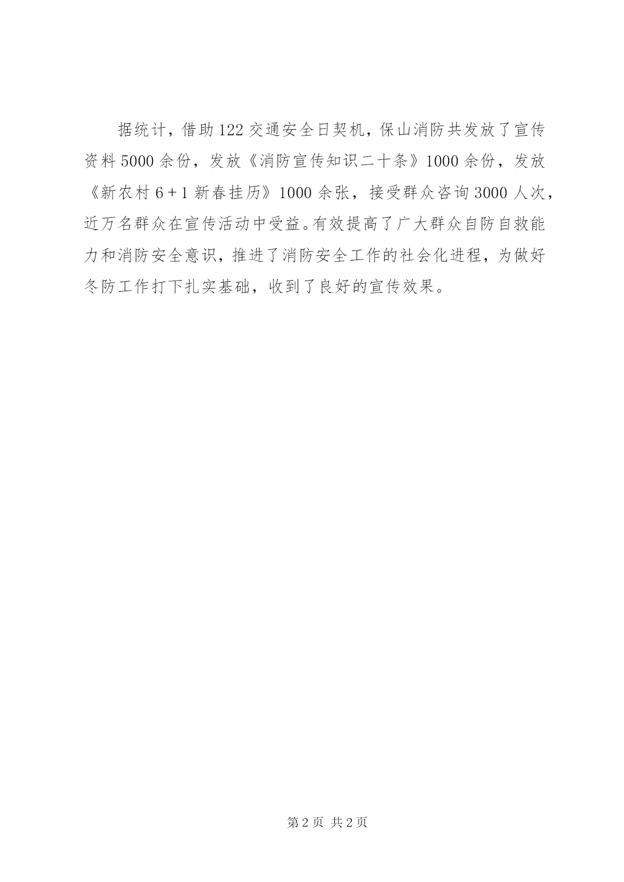 第PAGE\*Arabic\*MERGEFORMAT2页共NUMPAGES\*MERGEFORMAT2页122交通安全日教育讲稿12月2日是全国首个“交通安全日”,保山支队宣传人员走上街头,巧借“122交通安全日”活动之势大力开展消防安全知识宣传,赢得市民一致好评。为让XX县区民了解消防知识,提高自防自救能力,构筑全市冬季防火墙,12月2日,保山支队宣传人员以“人人参与消防,共创平安和谐”为宣传主题,走进XX县区最繁华的客运站进行消防安全知识宣传活动。在活动现场,消防宣传人员重点围绕《消防安全常识二十条》、“96119”火灾隐患举报等工作,深入扎实地开展消防宣传活动。宣传人员向过往行人派发消防安全知识手册以及防火知识小卡片,并对提醒群众在春节期间不要燃放烟花爆竹,一定要选择空旷的地方;冬季是引发火灾的高峰期,使用电器设备较多,要注意电器设备的安全使用;遇到火灾事故时,不要慌乱,要及时的采取初期扑救措施,迅速报警,配合消防队员做好火灾扑救工作。针对消防法规、家庭防火、公众聚集场所防火等冬季防火知识向市民群众作了详细的讲解,让市民了解了消防日常工作,树立起消防意识及增强安全意识,加强自救能力。同时,宣传人员结合新近发生的典型火灾案例向过往群众讲解火灾给人民和财产造成的巨大损害,加强群众的防火意识,警惕火灾事故的发生。据统计,借助122交通安全日契机,保山消防共发放了宣传资料5000余份,发放《消防宣传知识二十条》1000余份,发放《新农村6﹢1新春挂历》1000余张,接受群众咨询3000人次,近万名群众在宣传活动中受益。有效提高了广大群众自防自救能力和消防安全意识,推进了消防安全工作的社会化进程,为做好冬防工作打下扎实基础,收到了良好的宣传效果。