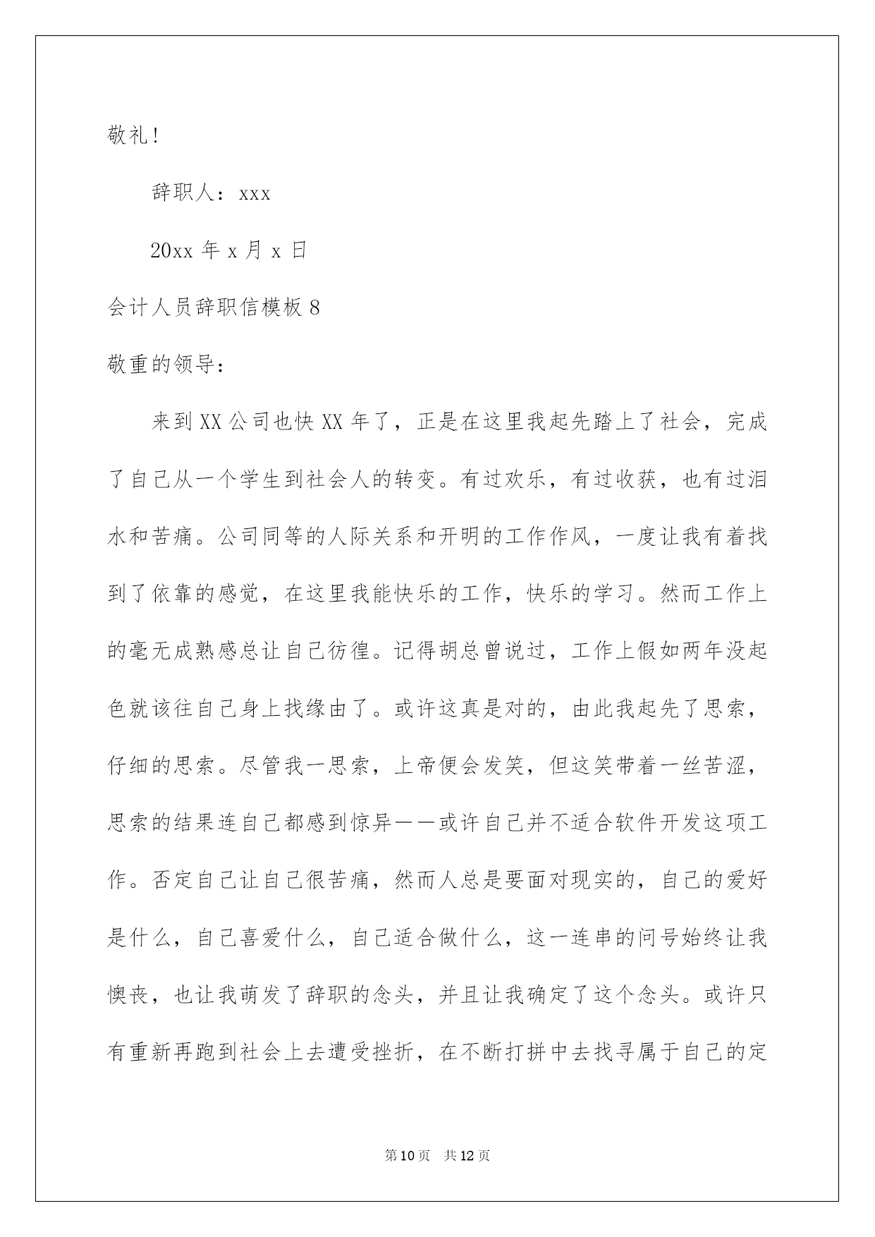 第PAGE\*Arabic\*MERGEFORMAT12页共NUMPAGES\*Arabic\*MERGEFORMAT12页第PAGE\*MERGEFORMAT12页共NUMPAGES\*MERGEFORMAT12页第PAGE\*MERGEFORMAT12页共NUMPAGES\*MERGEFORMAT12页第PAGE\*MERGEFORMAT12页共NUMPAGES\*MERGEFORMAT12页第PAGE\*MERGEFORMAT12页共NUMPAGES\*MERGEFORMAT12页第PAGE\*MERGEFORMAT12页共NUMPAGES\*MERGEFORMAT12页第PAGE\*MERGEFORMAT12页共NUMPAGES\*MERGEFORMAT12页第PAGE\*MERGEFORMAT12页共NUMPAGES\*MERGEFORMAT12页第PAGE\*MERGEFORMAT12页共NUMPAGES\*MERGEFORMAT12页第PAGE\*MERGEFORMAT12页共NUMPAGES\*MERGEFORMAT12页第PAGE\*MERGEFORMAT12页共NUMPAGES\*MERGEFORMAT12页2022会计人员辞职信会计人员辞职信模板(8篇)进入一家公司一段时间后,我们会由于一些不得已的缘由而辞职,这时就须要学习写辞职信吧。是不是苦于写不出正规的辞职信呢?下面是我为大家收集的会计人员辞职信模板,仅供参考,希望能够帮助到大家。会计人员辞职信模板1敬重的各位领导:您好!我怀着困难的心情写这封辞职信。由于您对我的实力的信任,使我得以加入公司,并且在短短的两年间获得了很多的机遇和挑战。由于个人的缘由,我不得不向公司提出申请,并希望能与今年x月xx日正式离职。公司同等的人际关系和开明的工作作风,一度让我有着找到了依靠的感觉,在这里我能快乐的工作,快乐的学习。然而工作上的毫无成熟感总让自己彷徨。记得胡总曾说过,工作上假如两年没起色就该往自己身上找缘由了。或许这真是对的,由此,我起先了思索,仔细的思索。尽管我一思索,上帝便会发笑,但这笑带着一丝苦涩,思索的结果连自己都感到惊异――或许自己并不适合软件开发这项工作。否定自己让自己很苦痛,然而人总是要面对现实的,自己的爱好是什么,自己喜爱什么,自己适合做什么,这一连串的问号始终让我懊丧,也让我萌发了辞职的念头,并且让我确定了这个念头。或许只有重新再跑到社会上去遭受挫折,在不断打拼中去找寻属于自己的定位,才是我人生的下一步选择。从小到大始终过得很顺,这曾让我傲慢,如今却让自己深深得苦痛,不能自拔,或许人真的要学会渐渐长大。对于由此为公司造成的不便,我深感愧疚。但同时也希望公司能体恤我的个人实际,对我的申请予以考虑并批准为盼。此致敬礼!辞职人:xx日期:会计人员辞职信模板2敬重的领导:你好!特别感谢这么多年来,你们在工作和生活上对我的指导和帮助,更感谢你们在工作上给我的激励和对我的信任。我在公司工作了11年,11年里有我全部的青春和全部的美妙时间,现在要离开她,说心理话非常不情愿,但是我却不得不对她说“再见”,这是为了我的身体、我的家人、为了公司的的明天更美妙!11年前的9月,我幸运的通过考核,成为了公司的一名员工。我先后从事过开票、收款、出纳、销售会计、原料成本会计、以及现在的主办会计工作岗位,在每一个工作岗位上我都任劳任怨、兢兢业业地完成领导交给我的全部任务,即使在我女儿诞生的前一天也是如此,并得到了各级领导的好评。在没有电脑以前我每天晚上都必需加班汇总当天的销售报表和过销售收入明细账,因为白天要为客户结算折扣;计算成本时也必需一个一个品种的算;以至于没到公司几年,我的.眼睛近视的度数一下上升了四百多度;现在用上电脑了,虽然比手工记账便利、快捷,但是企业的核算也更精细,长期的电脑操作除了使我的视力降到了零,且必需配带近千度的高度镜片外,颈锥和双肩也受到了严峻的损伤,常常痛得睡不着觉,并引起常常性头昏、失眠。因此,我觉得我已经不相宜做这项工作了,我必需和我生活了11年的工作说“再见”。此致敬礼!辞职人:xxx20xx年x月x日会计人员辞职信模板3敬重的公司领导:很愧疚因此报告而扰了您们,岁月如逝,茫然回首,本人已在三和效力三载又一月之余,由当时女儿的尚未诞生到如今能清楚喊我爸爸,可谓斗转星移,弹指一挥。本人更是由刚入职时的一窍不通到如今的知人熟物,这期间当然少不了自己之努力,但更离不开公司领导及同事之热忱帮助,对此,本人深怀感谢而不能忘矣。与三和携手走过三年光景,记录点滴,领悟到的不单单是工作,更多的是只可专