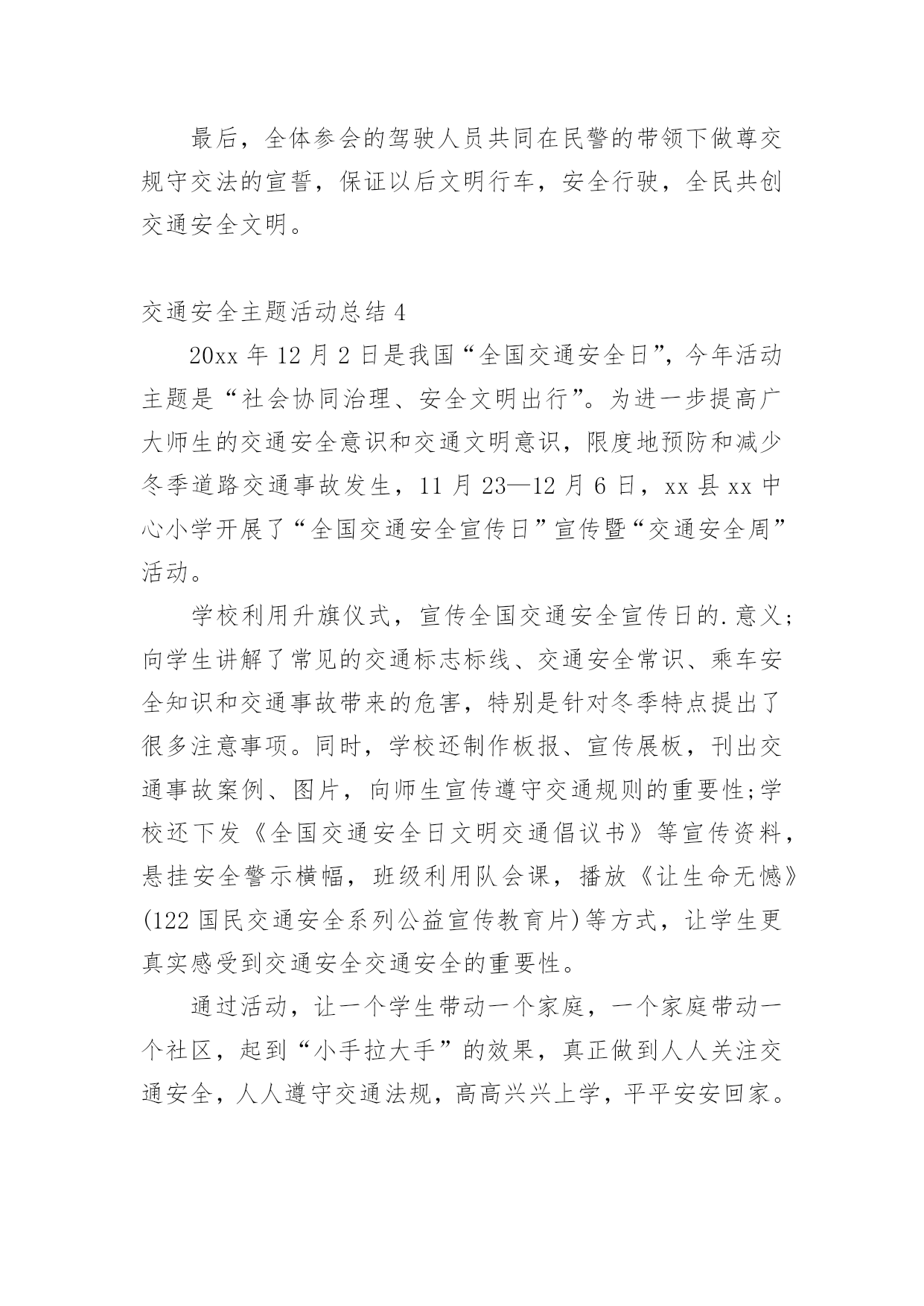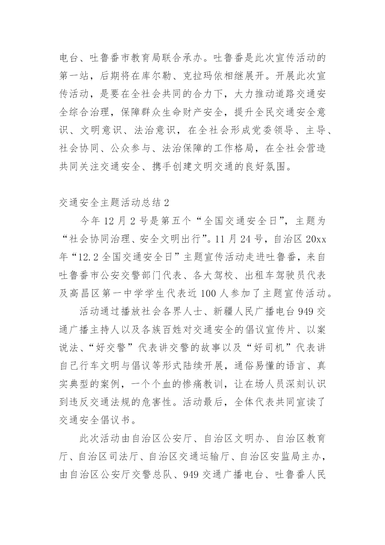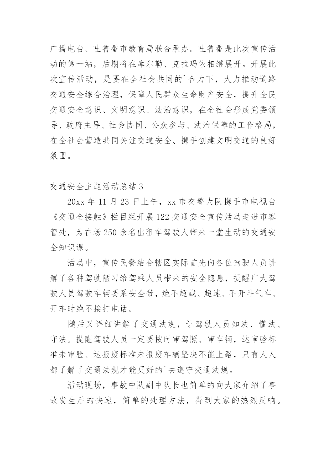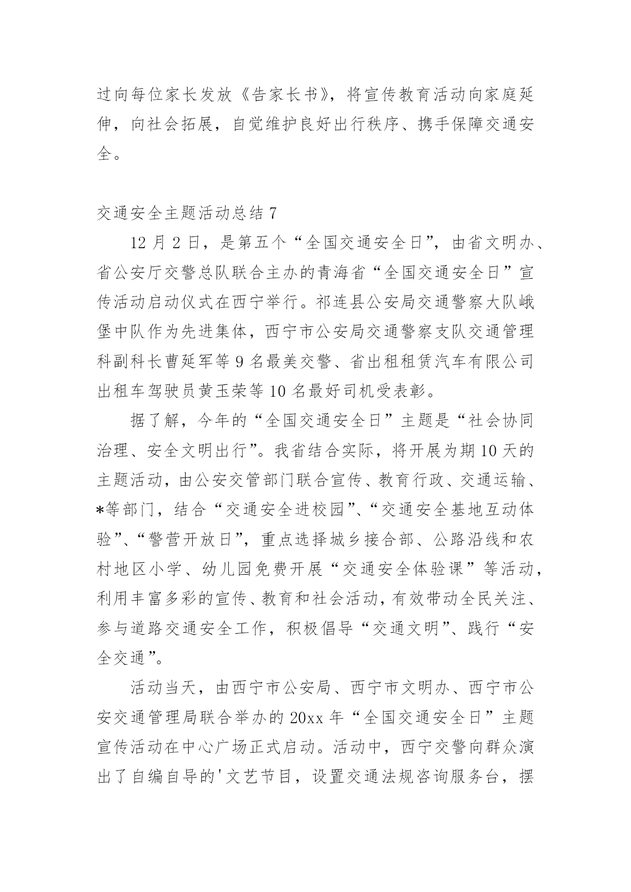 交通安全主题活动总结总结就是把一个时段的学习、工作或其完成情况进行一次全面系统的总结,它有助于我们寻找工作和事物发展的规律,从而掌握并运用这些规律,因此十分有必须要写一份总结哦。总结一般是怎么写的呢?下面是小编为大家整理的交通安全主题活动总结,希望能够帮助到大家。交通安全主题活动总结1今年12月2号是第五个“全国交通安全日”,主题为“社会协同治理、安全文明出行”。11月24号,自治区20xx年“12.2全国交通安全日”主题宣传活动走进吐鲁番,来自吐鲁番市公安交警部门代表、各大驾校、出租车驾驶员代表及高昌区第一中学学生代表近100人参加了主题宣传活动。活动通过播放社会各界人士、新疆广播电台949交通广播主持人以及各族百姓对交通安全的倡议宣传片、以案说法、“好交警”代表讲交警的故事以及“好司机”代表讲自己行车文明与倡议等形式陆续开展,通俗易懂的语言、真实典型的案例,一个个血的`惨痛教训,让在场人员深刻认识到违反交通法规的危害性。活动最后,全体代表共同宣读了交通安全倡议书。此次活动由自治区公安厅、自治区文明办、自治区教育厅、自治区司法厅、自治区交通运输厅、自治区安监局主办,由自治区公安厅交警总队、949交通广播电台、吐鲁番广播电台、吐鲁番市教育局联合承办。吐鲁番是此次宣传活动的第一站,后期将在库尔勒、克拉玛依相继展开。开展此次宣传活动,是要在全社会共同的合力下,大力推动道路交通安全综合治理,保障群众生命财产安全,提升全民交通安全意识、文明意识、法治意识,在全社会形成党委领导、主导、社会协同、公众参与、法治保障的工作格局,在全社会营造共同关注交通安全、携手创建文明交通的良好氛围。交通安全主题活动总结2今年12月2号是第五个“全国交通安全日”,主题为“社会协同治理、安全文明出行”。11月24号,自治区20xx年“12.2全国交通安全日”主题宣传活动走进吐鲁番,来自吐鲁番市公安交警部门代表、各大驾校、出租车驾驶员代表及高昌区第一中学学生代表近100人参加了主题宣传活动。活动通过播放社会各界人士、新疆人民广播电台949交通广播主持人以及各族百姓对交通安全的倡议宣传片、以案说法、“好交警”代表讲交警的故事以及“好司机”代表讲自己行车文明与倡议等形式陆续开展,通俗易懂的语言、真实典型的案例,一个个血的惨痛教训,让在场人员深刻认识到违反交通法规的危害性。活动最后,全体代表共同宣读了交通安全倡议书。此次活动由自治区公安厅、自治区文明办、自治区教育厅、自治区司法厅、自治区交通运输厅、自治区安监局主办,由自治区公安厅交警总队、949交通广播电台、吐鲁番人民广播电台、吐鲁番市教育局联合承办。吐鲁番是此次宣传活动的第一站,后期将在库尔勒、克拉玛依相继展开。开展此次宣传活动,是要在全社会共同的`合力下,大力推动道路交通安全综合治理,保障人民群众生命财产安全,提升全民交通安全意识、文明意识、法治意识,在全社会形成党委领导、政府主导、社会协同、公众参与、法治保障的工作格局,在全社会营造共同关注交通安全、携手创建文明交通的良好氛围。交通安全主题活动总结320xx年11月23日上午,xx市交警大队携手市电视台《交通全接触》栏目组开展122交通安全宣传活动走进市客管处,为在场250余名出租车驾驶人带来一堂生动的交通安全知识课。活动中,宣传民警结合辖区实际首先向各位驾驶人员讲解了各种驾驶陋习给驾乘人员带来的安全隐患,提醒广大驾驶人员驾驶车辆要系安全带,绝不超载、超速、不开斗气车、开车时绝不接打电话。随后又详细讲解了交通法规,让驾驶人员知法、懂法、守法。提醒驾驶人员一定要按时审驾照、审车辆,达审验标准未审验、达报废标准未报废车辆坚决不能上路,只有人人都了解了交通法规才能更好的`去遵守交通法规。活动现场,事故中队副中队长也简单的向大家介绍了事故发生后的快速,简单的处理方法,得到大家的热烈反响。最后,全体参会的驾驶人员共同在民警的带领下做尊交规守交法的宣誓,保证以后文明行车,安全行驶,全民共创交通安全文明。交通安全主题活动总结420xx年12月2日是我国“全国交通安全日”,今年活动主题是“社会协同治理、安全文明出行”。为进一步提高广大师生的交通安全意识和交通文明意识,限度地预防和减少冬季道路交通事故发生,11月23—12月6日,xx县xx中心小学开展了“全国交通安全宣传日”宣传暨“交通安全周”活动。学校利用升旗仪式,宣传全国交通安全宣传日的.意义;向学生讲解了常见的交通标志标线、交通安全常识、乘车安全知识和交通事故带来的危害,特别是针对冬季特点提出了很多注意事项。同时,学校还制作板报、宣传展板,刊出交通事故案例、图片,向师生宣传遵守交通规则的重要性;学校还下发《全国交通安全日文明交通倡议书》等宣传资料,悬挂安全警示横幅,班级利用队会课,播放《让生命无憾》(122国民交通安