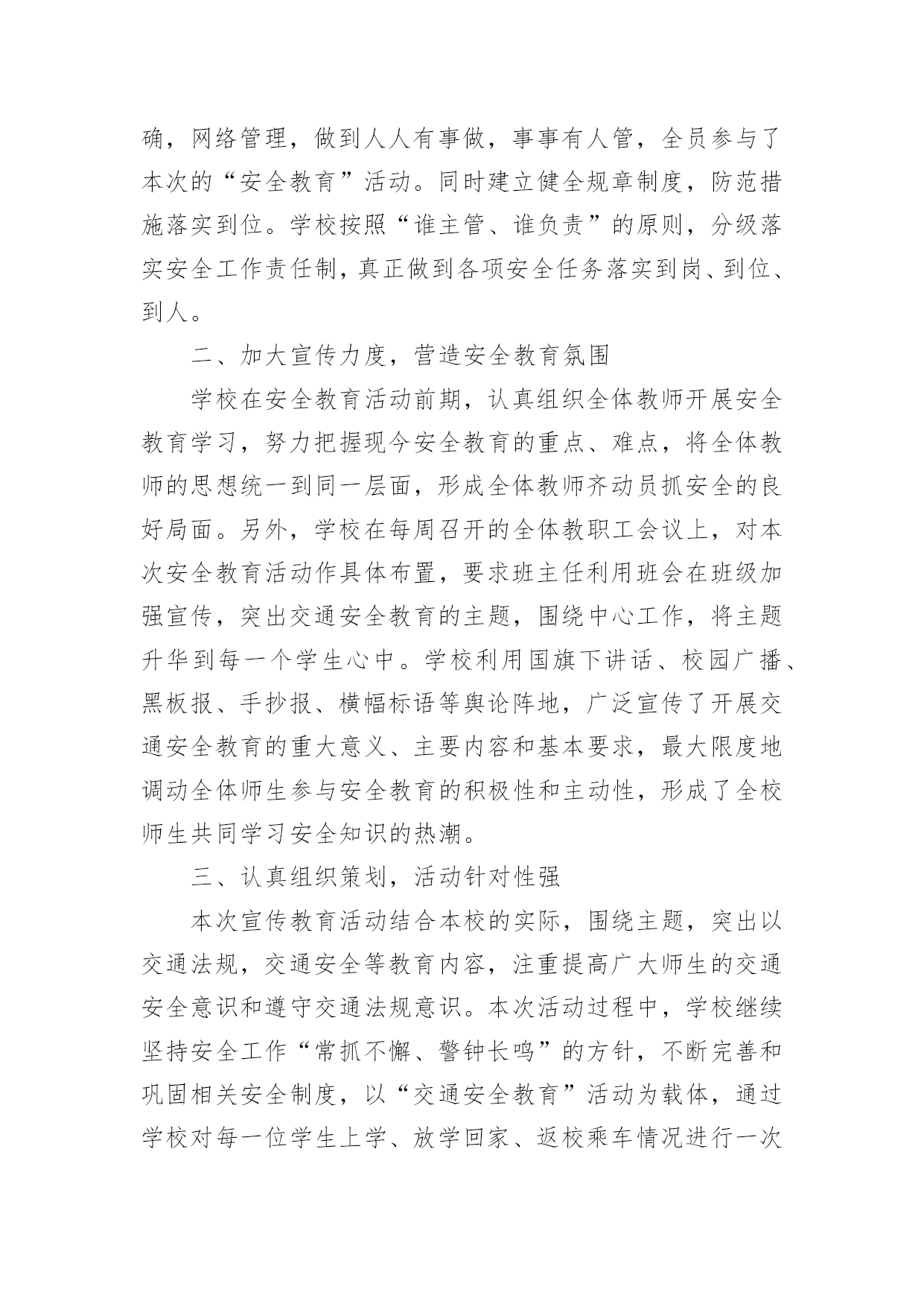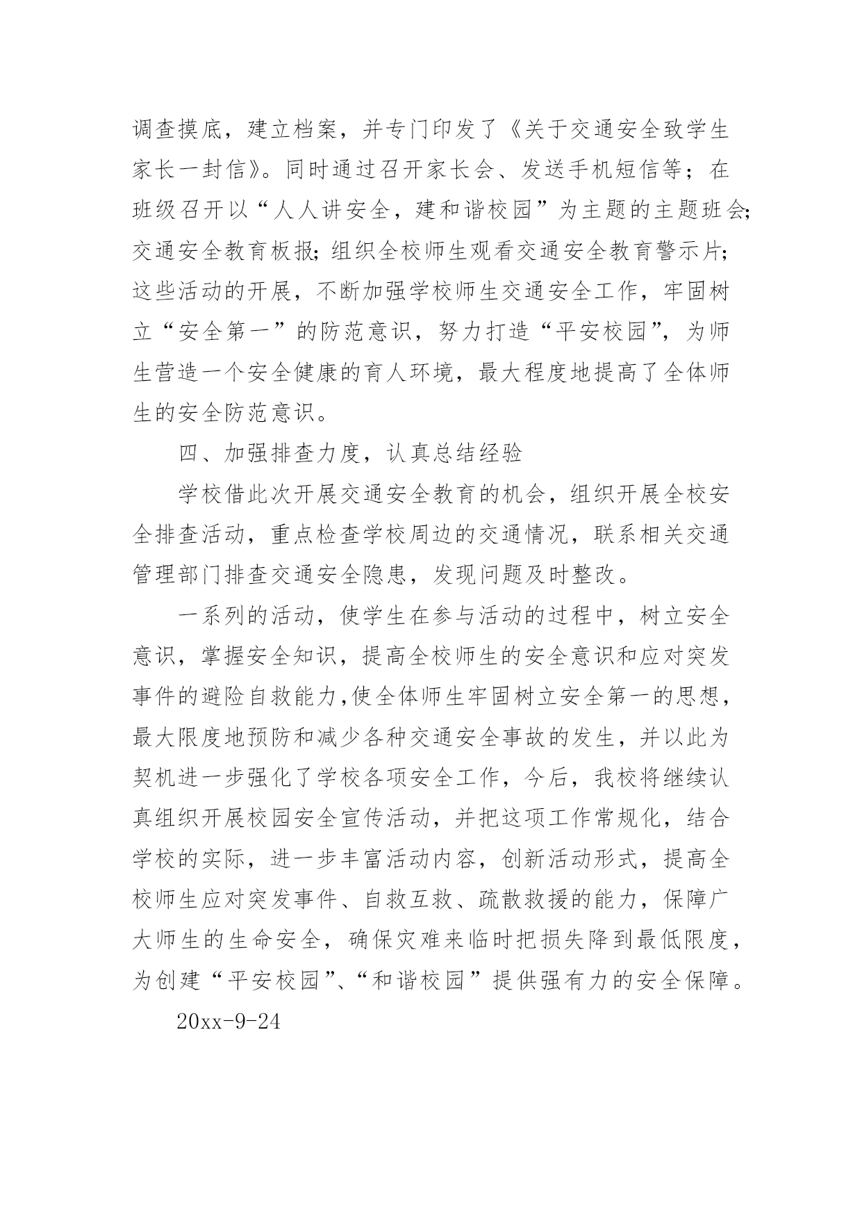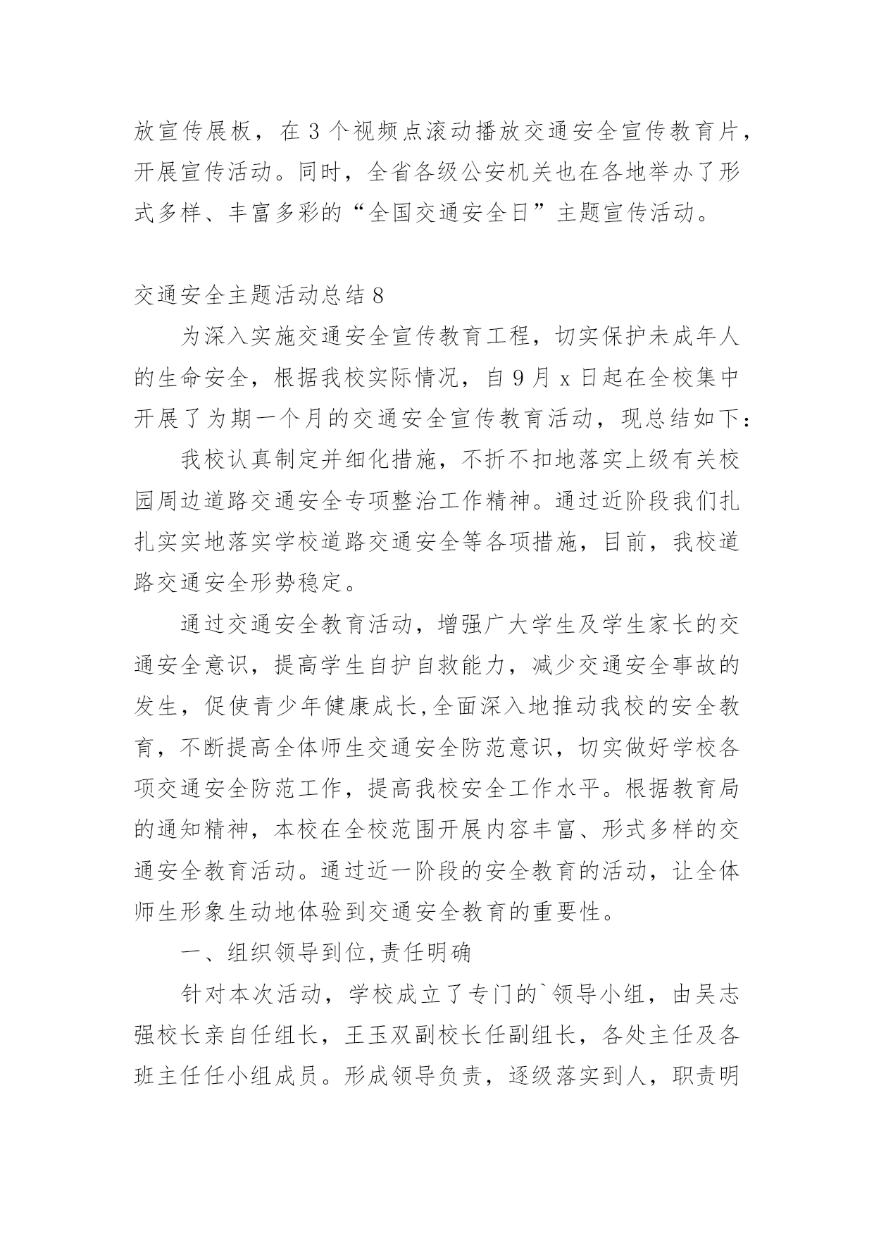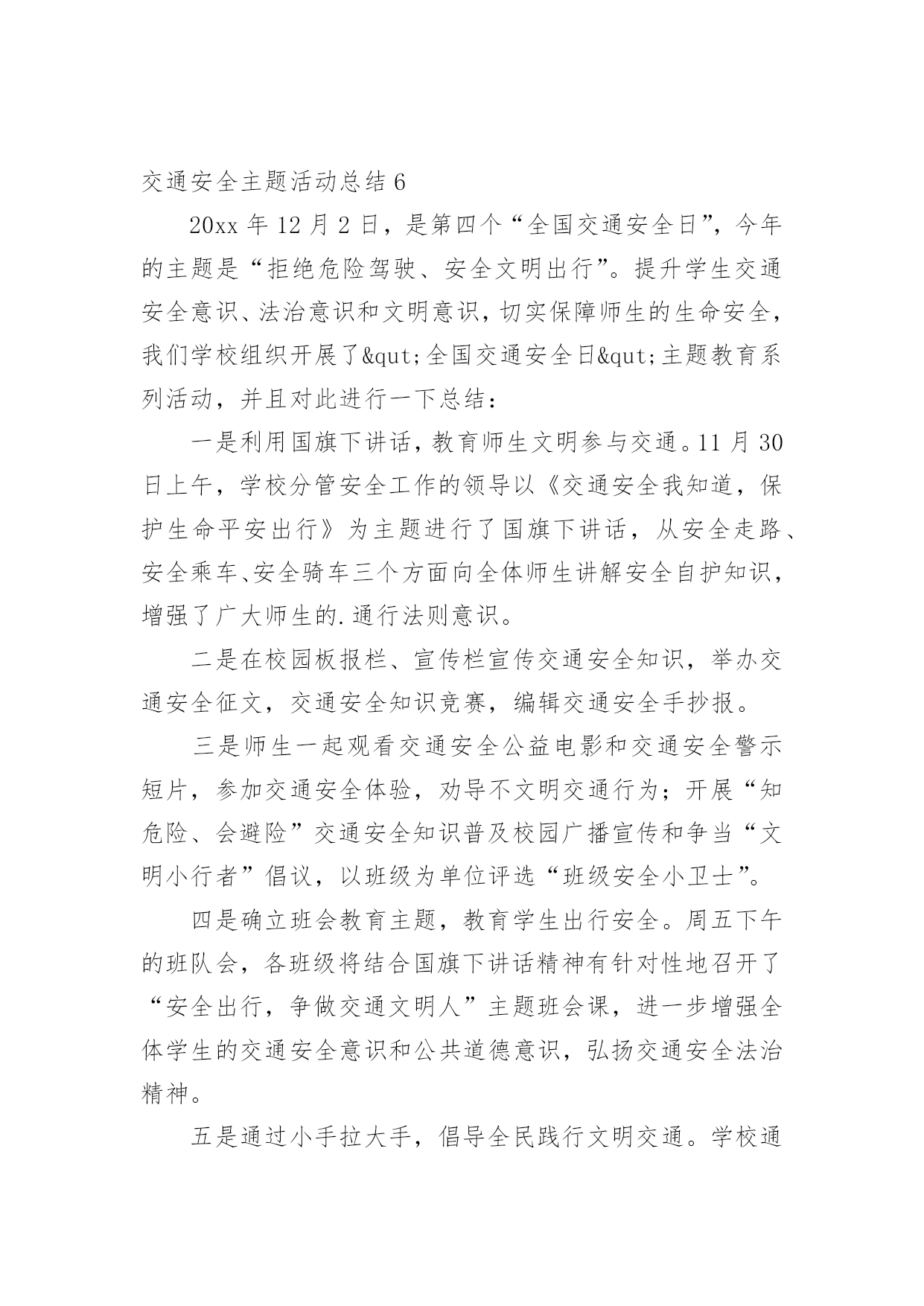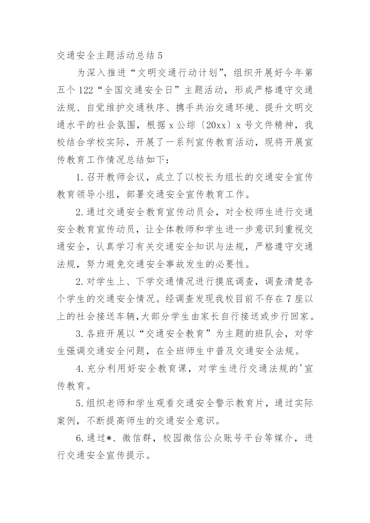 交通安全主题活动总结总结就是把一个时段的学习、工作或其完成情况进行一次全面系统的总结,它有助于我们寻找工作和事物发展的规律,从而掌握并运用这些规律,因此十分有必须要写一份总结哦。总结一般是怎么写的呢?下面是小编为大家整理的交通安全主题活动总结,希望能够帮助到大家。交通安全主题活动总结1今年12月2号是第五个“全国交通安全日”,主题为“社会协同治理、安全文明出行”。11月24号,自治区20xx年“12.2全国交通安全日”主题宣传活动走进吐鲁番,来自吐鲁番市公安交警部门代表、各大驾校、出租车驾驶员代表及高昌区第一中学学生代表近100人参加了主题宣传活动。活动通过播放社会各界人士、新疆广播电台949交通广播主持人以及各族百姓对交通安全的倡议宣传片、以案说法、“好交警”代表讲交警的故事以及“好司机”代表讲自己行车文明与倡议等形式陆续开展,通俗易懂的语言、真实典型的案例,一个个血的`惨痛教训,让在场人员深刻认识到违反交通法规的危害性。活动最后,全体代表共同宣读了交通安全倡议书。此次活动由自治区公安厅、自治区文明办、自治区教育厅、自治区司法厅、自治区交通运输厅、自治区安监局主办,由自治区公安厅交警总队、949交通广播电台、吐鲁番广播电台、吐鲁番市教育局联合承办。吐鲁番是此次宣传活动的第一站,后期将在库尔勒、克拉玛依相继展开。开展此次宣传活动,是要在全社会共同的合力下,大力推动道路交通安全综合治理,保障群众生命财产安全,提升全民交通安全意识、文明意识、法治意识,在全社会形成党委领导、主导、社会协同、公众参与、法治保障的工作格局,在全社会营造共同关注交通安全、携手创建文明交通的良好氛围。交通安全主题活动总结2今年12月2号是第五个“全国交通安全日”,主题为“社会协同治理、安全文明出行”。11月24号,自治区20xx年“12.2全国交通安全日”主题宣传活动走进吐鲁番,来自吐鲁番市公安交警部门代表、各大驾校、出租车驾驶员代表及高昌区第一中学学生代表近100人参加了主题宣传活动。活动通过播放社会各界人士、新疆人民广播电台949交通广播主持人以及各族百姓对交通安全的倡议宣传片、以案说法、“好交警”代表讲交警的故事以及“好司机”代表讲自己行车文明与倡议等形式陆续开展,通俗易懂的语言、真实典型的案例,一个个血的惨痛教训,让在场人员深刻认识到违反交通法规的危害性。活动最后,全体代表共同宣读了交通安全倡议书。此次活动由自治区公安厅、自治区文明办、自治区教育厅、自治区司法厅、自治区交通运输厅、自治区安监局主办,由自治区公安厅交警总队、949交通广播电台、吐鲁番人民广播电台、吐鲁番市教育局联合承办。吐鲁番是此次宣传活动的第一站,后期将在库尔勒、克拉玛依相继展开。开展此次宣传活动,是要在全社会共同的`合力下,大力推动道路交通安全综合治理,保障人民群众生命财产安全,提升全民交通安全意识、文明意识、法治意识,在全社会形成党委领导、政府主导、社会协同、公众参与、法治保障的工作格局,在全社会营造共同关注交通安全、携手创建文明交通的良好氛围。交通安全主题活动总结320xx年11月23日上午,xx市交警大队携手市电视台《交通全接触》栏目组开展122交通安全宣传活动走进市客管处,为在场250余名出租车驾驶人带来一堂生动的交通安全知识课。活动中,宣传民警结合辖区实际首先向各位驾驶人员讲解了各种驾驶陋习给驾乘人员带来的安全隐患,提醒广大驾驶人员驾驶车辆要系安全带,绝不超载、超速、不开斗气车、开车时绝不接打电话。随后又详细讲解了交通法规,让驾驶人员知法、懂法、守法。提醒驾驶人员一定要按时审驾照、审车辆,达审验标准未审验、达报废标准未报废车辆坚决不能上路,只有人人都了解了交通法规才能更好的`去遵守交通法规。活动现场,事故中队副中队长也简单的向大家介绍了事故发生后的快速,简单的处理方法,得到大家的热烈反响。最后,全体参会的驾驶人员共同在民警的带领下做尊交规守交法的宣誓,保证以后文明行车,安全行驶,全民共创交通安全文明。交通安全主题活动总结420xx年12月2日是我国“全国交通安全日”,今年活动主题是“社会协同治理、安全文明出行”。为进一步提高广大师生的交通安全意识和交通文明意识,限度地预防和减少冬季道路交通事故发生,11月23—12月6日,xx县xx中心小学开展了“全国交通安全宣传日”宣传暨“交通安全周”活动。学校利用升旗仪式,宣传全国交通安全宣传日的.意义;向学生讲解了常见的交通标志标线、交通安全常识、乘车安全知识和交通事故带来的危害,特别是针对冬季特点提出了很多注意事项。同时,学校还制作板报、宣传展板,刊出交通事故案例、图片,向师生宣传遵守交通规则的重要性;学校还下发《全国交通安全日文明交通倡议书》等宣传资料,悬挂安全警示横幅,班级利用队会课,播放《让生命无憾》(122国民交通安