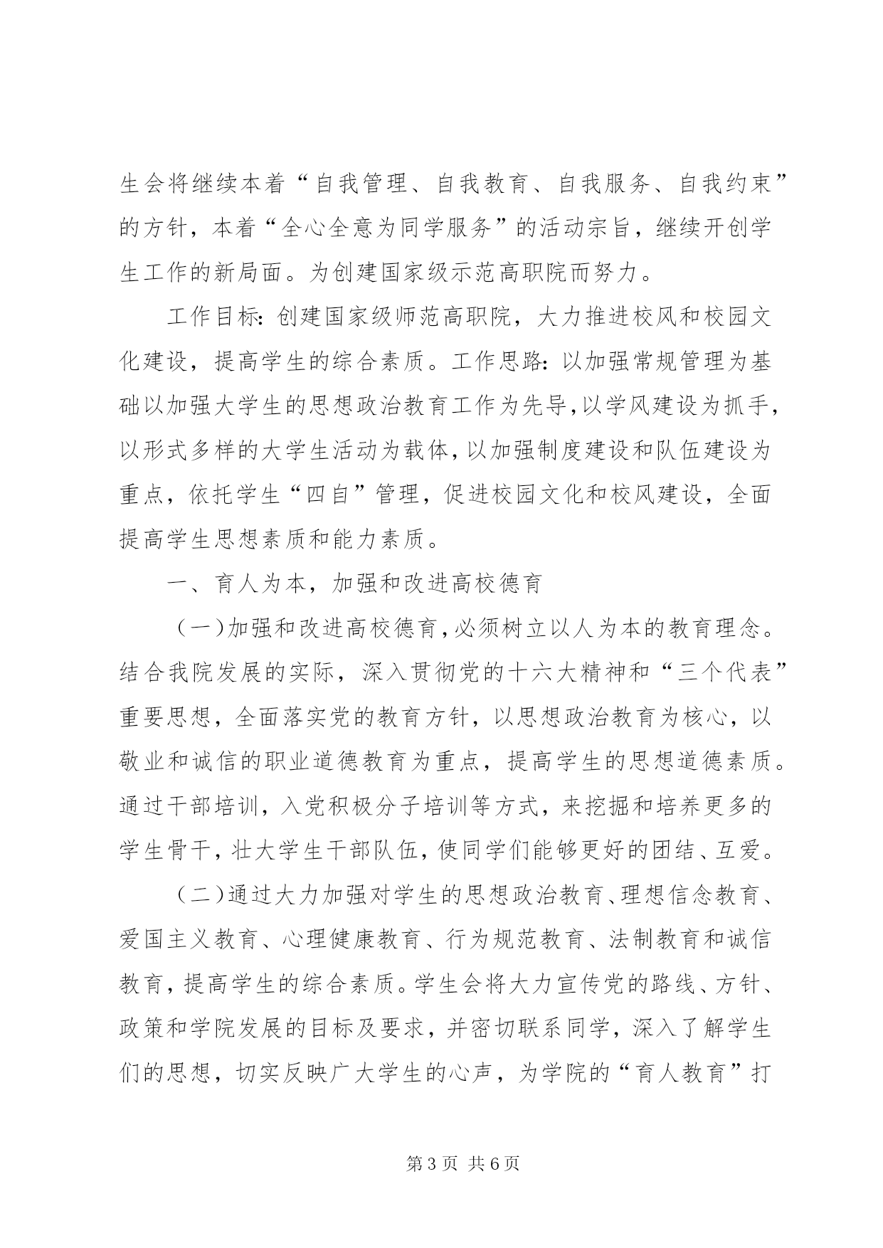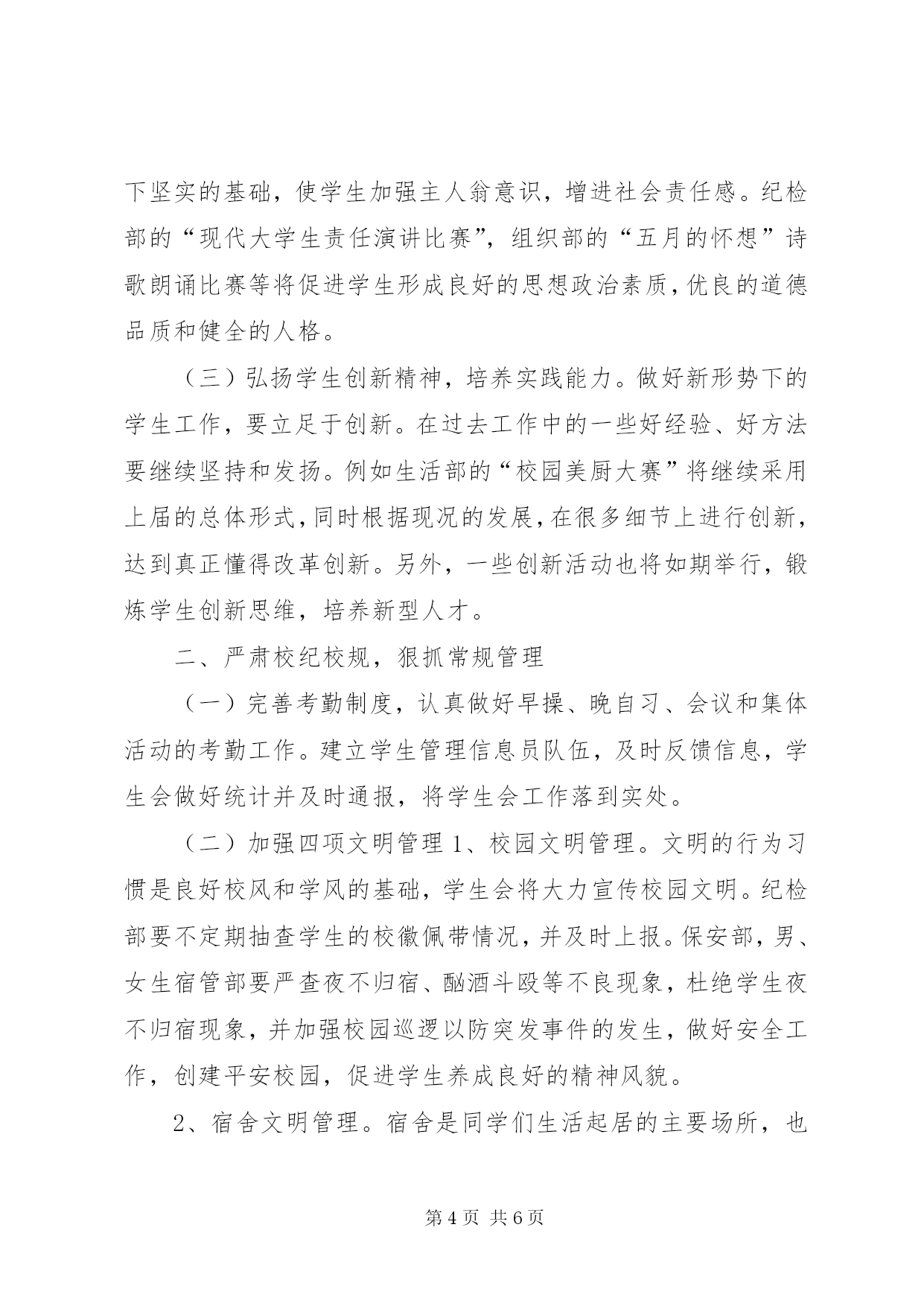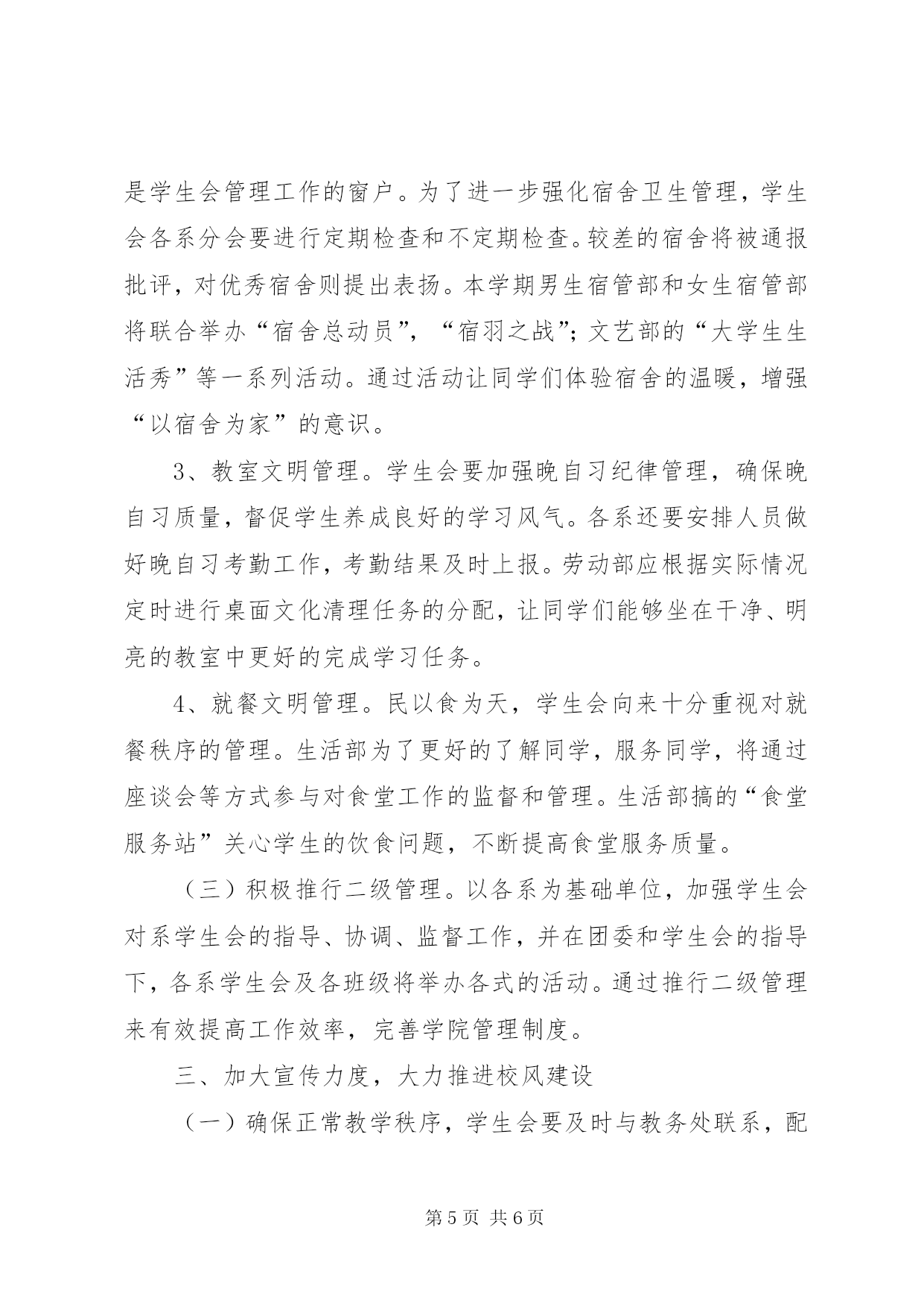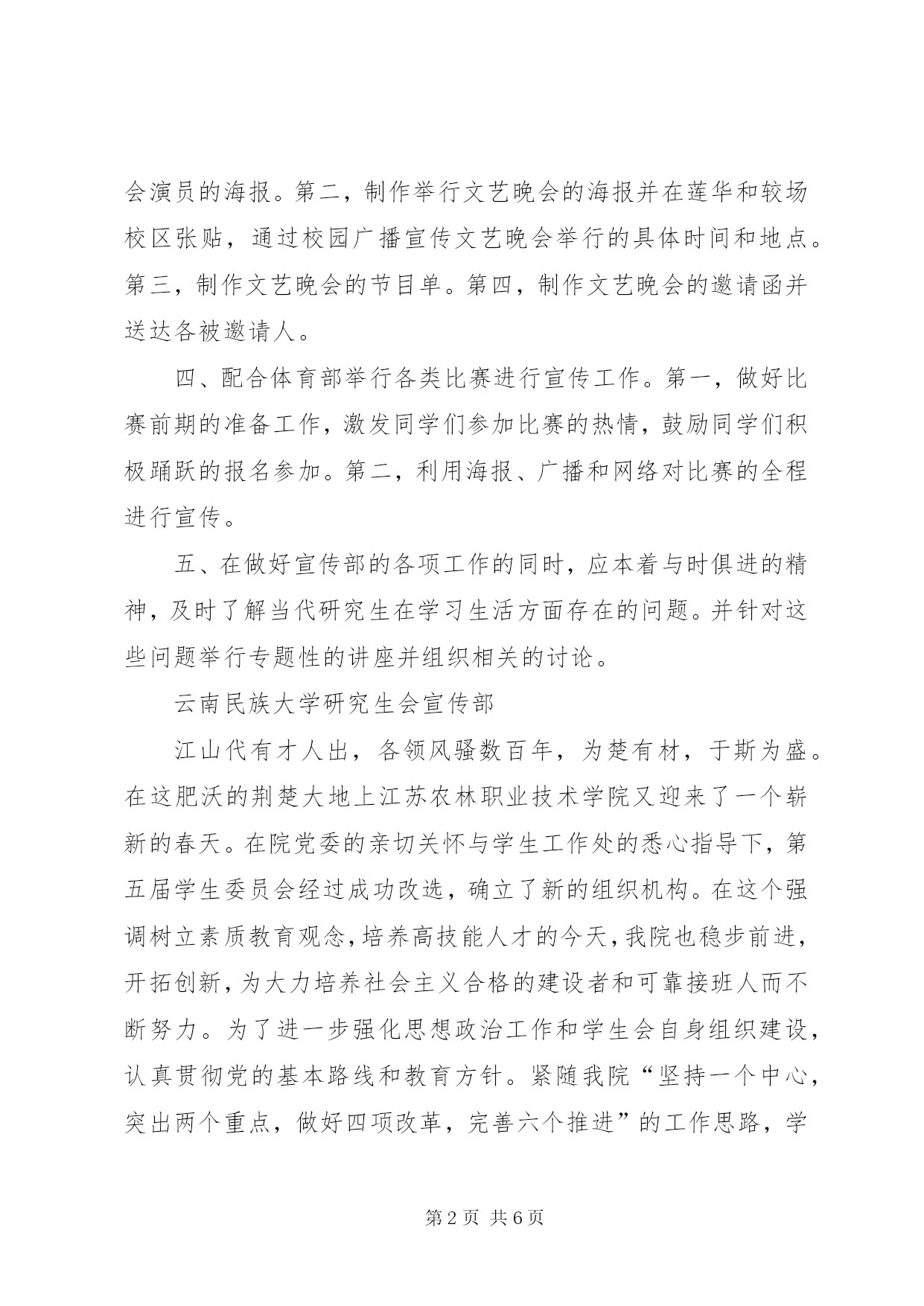 第PAGE\*Arabic\*MERGEFORMAT6页共NUMPAGES\*MERGEFORMAT6页大学研究生会宣传部工作计划宣传部作为研究生会下属六部之一,其工作重点和核心就在于立足研究生会这个平台,积极有效地宣传整个研究生会的理念及其各项活动,从而使得校内外的师生关注和了解我们的工作并积极参与到各项活动中来。在研究生部各领导和研究生会主席团的要求和指导下,现就xx年年下学期宣传部工作作如下计划:一、办好在莲华校区和较场校区研究生会宣传栏。第一,对宣传栏的张贴内容进行意见的收集,内容要突出新意有所创新。第二,宣传栏除了要宣传研究生部的精神外,还应注重其内容的功用性,比如发布就业信息,介绍就业技巧等内容。第三,对于宣传栏的制作应不拘一格。应本着该严谨的地方不花哨,该花哨的地方不严谨的原则进行制作。二、配合学术部开展的系列讲座进行宣传,活跃我校研究生学术氛围以及加强我校和各兄弟院校之间的学术交流。宣传部所进行的工作应以校内为重点。首先,为了使得讲座能更吸引师生的关注,在校内收集整理广大师生对举行讲座的意见和建议,并及时反馈给学术部。其次,在我校莲华校区和较场校区张贴宣传海报并利用校园广播和网络进行宣传。再次,配合学术部进行场地的选定和布置。最后,配合外联部与各兄弟院校联系沟通做好辅助性的工作。三、配合文艺部做好晚会筹备工作。第一,张贴招募文艺晚会演员的海报。第二,制作举行文艺晚会的海报并在莲华和较场校区张贴,通过校园广播宣传文艺晚会举行的具体时间和地点。第三,制作文艺晚会的节目单。第四,制作文艺晚会的邀请函并送达各被邀请人。四、配合体育部举行各类比赛进行宣传工作。第一,做好比赛前期的准备工作,激发同学们参加比赛的热情,鼓励同学们积极踊跃的报名参加。第二,利用海报、广播和网络对比赛的全程进行宣传。五、在做好宣传部的各项工作的同时,应本着与时俱进的精神,及时了解当代研究生在学习生活方面存在的问题。并针对这些问题举行专题性的讲座并组织相关的讨论。云南民族大学研究生会宣传部江山代有才人出,各领风骚数百年,为楚有材,于斯为盛。在这肥沃的荆楚大地上江苏农林职业技术学院又迎来了一个崭新的春天。在院党委的亲切关怀与学生工作处的悉心指导下,第五届学生委员会经过成功改选,确立了新的组织机构。在这个强调树立素质教育观念,培养高技能人才的今天,我院也稳步前进,开拓创新,为大力培养社会主义合格的建设者和可靠接班人而不断努力。为了进一步强化思想政治工作和学生会自身组织建设,认真贯彻党的基本路线和教育方针。紧随我院“坚持一个中心,突出两个重点,做好四项改革,完善六个推进”的工作思路,学生会将继续本着“自我管理、自我教育、自我服务、自我约束”的方针,本着“全心全意为同学服务”的活动宗旨,继续开创学生工作的新局面。为创建国家级示范高职院而努力。工作目标:创建国家级师范高职院,大力推进校风和校园文化建设,提高学生的综合素质。工作思路:以加强常规管理为基础以加强大学生的思想政治教育工作为先导,以学风建设为抓手,以形式多样的大学生活动为载体,以加强制度建设和队伍建设为重点,依托学生“四自”管理,促进校园文化和校风建设,全面提高学生思想素质和能力素质。一、育人为本,加强和改进高校德育(一)加强和改进高校德育,必须树立以人为本的教育理念。结合我院发展的实际,深入贯彻党的十六大精神和“三个代表”重要思想,全面落实党的教育方针,以思想政治教育为核心,以敬业和诚信的职业道德教育为重点,提高学生的思想道德素质。通过干部培训,入党积极分子培训等方式,来挖掘和培养更多的学生骨干,壮大学生干部队伍,使同学们能够更好的团结、互爱。(二)通过大力加强对学生的思想政治教育、理想信念教育、爱国主义教育、心理健康教育、行为规范教育、法制教育和诚信教育,提高学生的综合素质。学生会将大力宣传党的路线、方针、政策和学院发展的目标及要求,并密切联系同学,深入了解学生们的思想,切实反映广大学生的心声,为学院的“育人教育”打下坚实的基础,使学生加强主人翁意识,增进社会责任感。纪检部的“现代大学生责任演讲比赛”,组织部的“五月的怀想”诗歌朗诵比赛等将促进学生形成良好的思想政治素质,优良的道德品质和健全的人格。(三)弘扬学生创新精神,培养实践能力。做好新形势下的学生工作,要立足于创新。在过去工作中的一些好经验、好方法要继续坚持和发扬。例如生活部的“校园美厨大赛”将继续采用上届的总体形式,同时根据现况的发展,在很多细节上进行创新,达到真正懂得改革创新。另外,一些创新活动也将如期举行,锻炼学生创新思维,培养新型人才。二、严肃校纪校规,狠抓常规管理(一)完善考勤制度,认真做好早操、晚自习、会议和集体活动的考勤工作。建立学生管理信息员队伍,及时反馈信息,学生会做好统计并及时通报,将学生会工