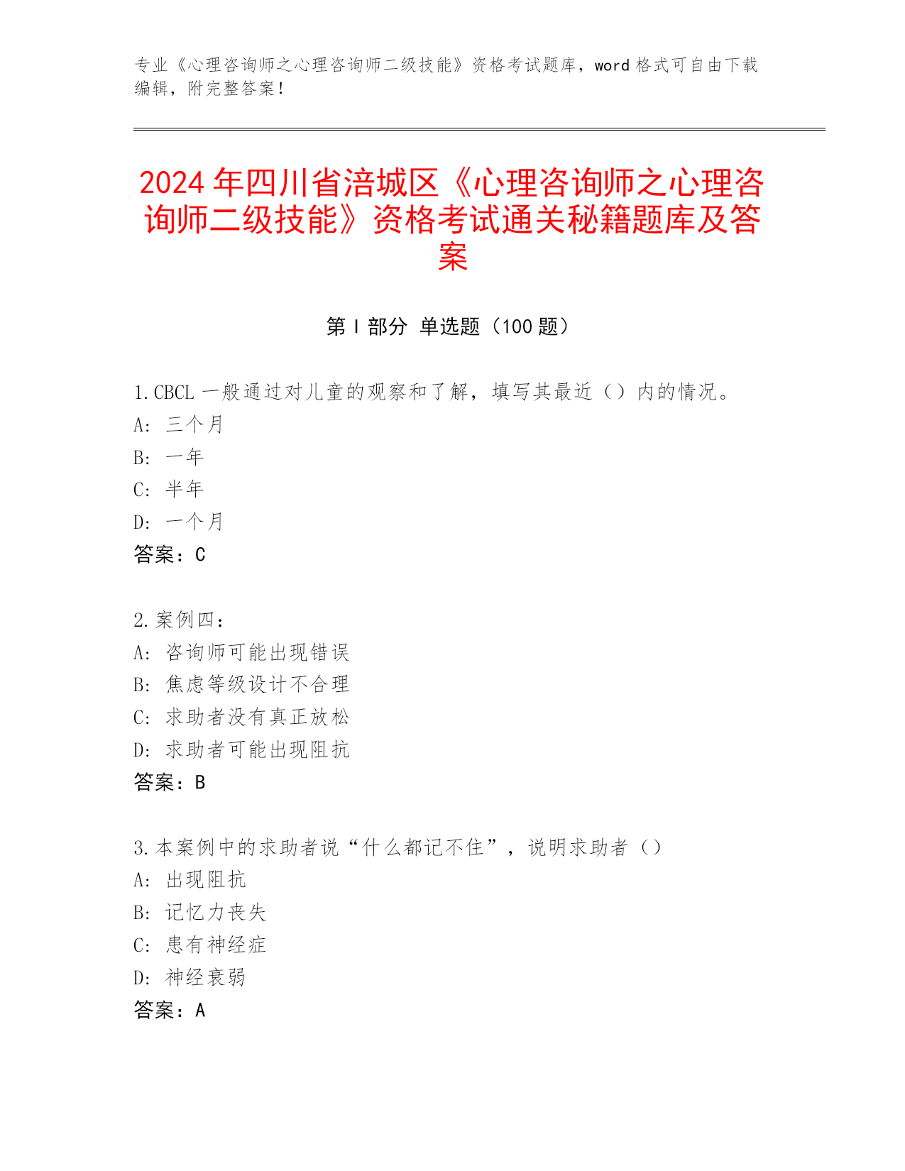2024年四川省涪城区《心理咨询师之心理咨询师二级技能》资格考试通关秘籍题库及答案