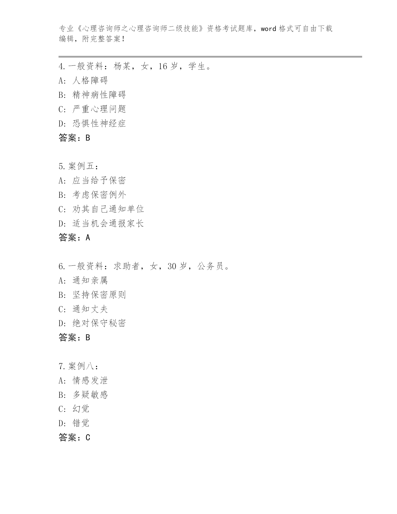云南省芒市《心理咨询师之心理咨询师二级技能》资格考试通关秘籍题库含答案(巩固)