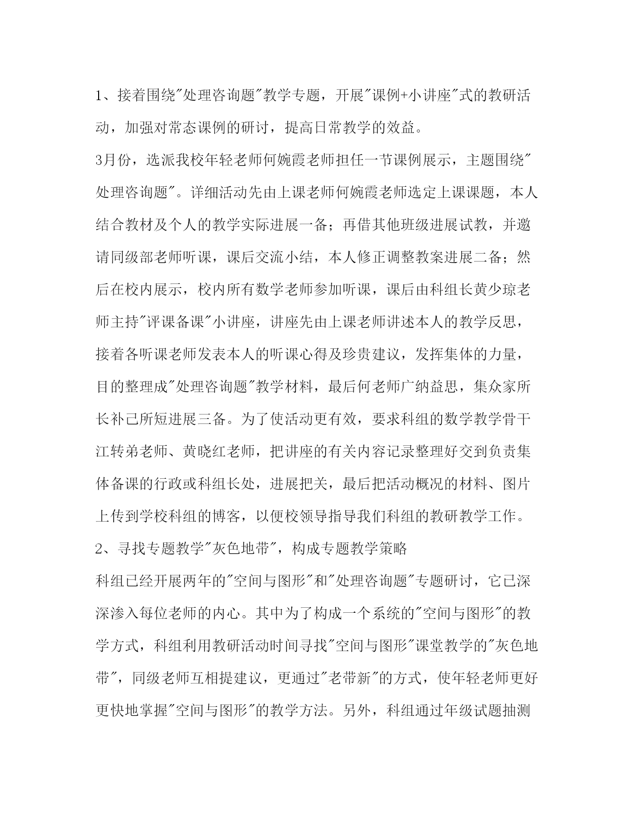 小学数学科工作参考计划范文一、指导思想本学期,数学科组以市教研室和万江区小学数学科工作打算,学校工作打算为导向,以围绕"空间与图形"和"处理咨询题教学"专题研讨为主深化校本教研,通过合作交流,追求高效的教学策略同时落实并做好常规工作的开展,以到达进一步提高老师的教学才能和课堂效益,促进老师专业开展,进一步培养学生良好的学习适应,激发学生学习数学的兴趣。二、主要工作(一)理解科组确定的教学主张,以提高老师常态教学的高效性。召开科组新学期会议,明确科组教学主张:简约而有活力每位老师每节课做到:简约是指教学目的要简明、教学内容要简约、教学环节要简约、教学方法要简单、板书设计要简练、数学语言要做到精确而简约;有活力是指在通过课堂中留意精心设计现实而富有吸引力的咨询题情境、倡导主动、合作、探究的学习方式让学生经历知识的构成过程、通过方式多样的评价激发学生的学习兴趣,务必向40分钟的课堂要质量。(二)立足校本教研,接着开展各种教研活动,提高老师的教学水平,促进老师专业开展。1、接着围绕"处理咨询题"教学专题,开展"课例+小讲座"式的教研活动,加强对常态课例的研讨,提高日常教学的效益。3月份,选派我校年轻老师何婉霞老师担任一节课例展示,主题围绕"处理咨询题"。详细活动先由上课老师何婉霞老师选定上课课题,本人结合教材及个人的教学实际进展一备;再借其他班级进展试教,并邀请同级部老师听课,课后交流小结,本人修正调整教案进展二备;然后在校内展示,校内所有数学老师参加听课,课后由科组长黄少琼老师主持"评课备课"小讲座,讲座先由上课老师讲述本人的教学反思,接着各听课老师发表本人的听课心得及珍贵建议,发挥集体的力量,目的整理成"处理咨询题"教学材料,最后何老师广纳益思,集众家所长补己所短进展三备。为了使活动更有效,要求科组的数学教学骨干江转弟老师、黄晓红老师,把讲座的有关内容记录整理好交到负责集体备课的行政或科组长处,进展把关,最后把活动概况的材料、图片上传到学校科组的博客,以便校领导指导我们科组的教研教学工作。2、寻找专题教学"灰色地带",构成专题教学策略科组已经开展两年的"空间与图形"和"处理咨询题"专题研讨,它已深深渗入每位老师的内心。其中为了构成一个系统的"空间与图形"的教学方式,科组利用教研活动时间寻找"空间与图形"课堂教学的"灰色地带",同级老师互相提建议,更通过"老带新"的方式,使年轻老师更好更快地掌握"空间与图形"的教学方法。另外,科组通过年级试题抽测的方式,抽查学生对"处理咨询题"板块的理解应用,从而反应出老师的教学成效与误区,及时为老师指明"处理咨询题"的教学方向,并构成策略,向"高效课堂"靠近。3、合作交流,落实好对外交流活动的工作(1)为了发挥学校的骨干老师的辐射作用,搭建学习、交流、展示的平台,锻炼他们的教学才能,促进他们的专业开展。在4月份我校将由何婉霞老师在万江区小学借班上课,承担区亮相课,我校其他数学老师也参与议课。(2)组织好老师积极参与区的观课、议课活动,6月份我校江转弟老师在区承办的市辅导员教研沙龙活动中进展课例展示,全体老师要献计献策,发挥科组的团体智慧,争取在展示活动中有好的表现,并以此为契机,进一步提高老师本身的专业水平。4、接着做好网络教研活动科组会把在网上搜集的优秀教学材料放在数学科组的博客平台上,让老师平时阅读,资源共享,到达互相提高,共同进步。(科组各成员共同参与)5、做好教学随笔,每月举行一次科组教研教学总结学习。会议时间:每月的第四个星期星期一班会在平时教学中,各位老师可能会有教学困惑及存在一些咨询题。本学期科组为了使活动更有针对性、更有效性,讨论的咨询题来源于我们一线的老师,然后重新选择老师最关注、最需要处理的三个咨询题,让老师在平时教学中研究讨论,并把本人的体会写成教学随笔,以便在科组每月一次的学习会议上发表,促进老师获得本身专业的开展,希望各位老师做好平时积累。(三)落实计算才能过关,让学生真正掌握口算、笔算的技巧。通过上学期区的教学质量检查反应,我们科组制定本学期年级的抽测要求:本学期年级的教学重点:一、二年级接着狠抓学生的口算,训练学生的口算速度及精确性;三、四年级大力加强学生的脱式计算;五、六年级则着重于"处理咨询题",同时在"处理咨询题"中也浸透计算的训练,老师要真实理解本人教学情况,更好掌握课堂教学存在的咨询题,把握好教学策略,从而提高教学质量。(四)以学生为本,落实搞好各种活动和加强常规工作的检查,促进师生全面开展。1、抓好平时的数学备课,以提高教学质量本学期,在备课上有所改变,重点要求每位老师除电子备课外另作简易书面备课,内容包括教学目的、教学重难点、打破重难点的方法、练习设计、错例记录通过老师个人的二次备课,不仅突出本人的个