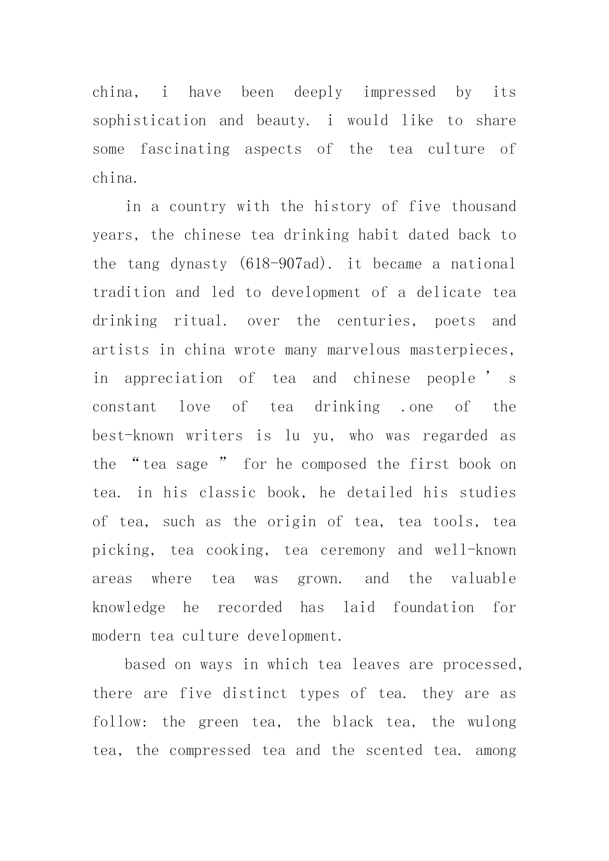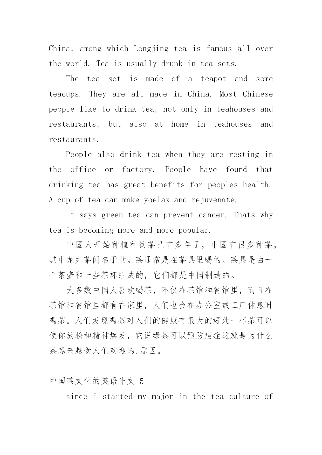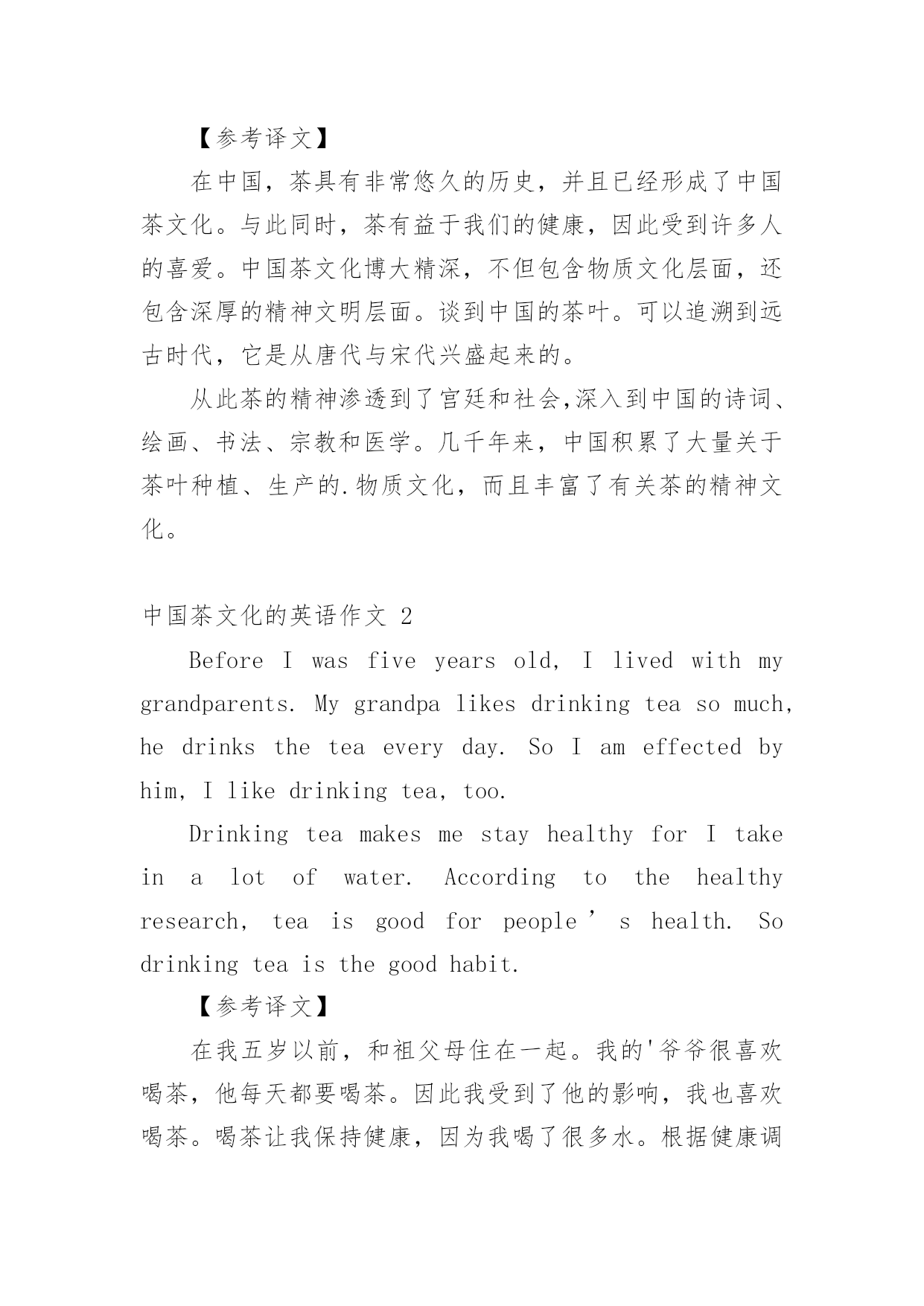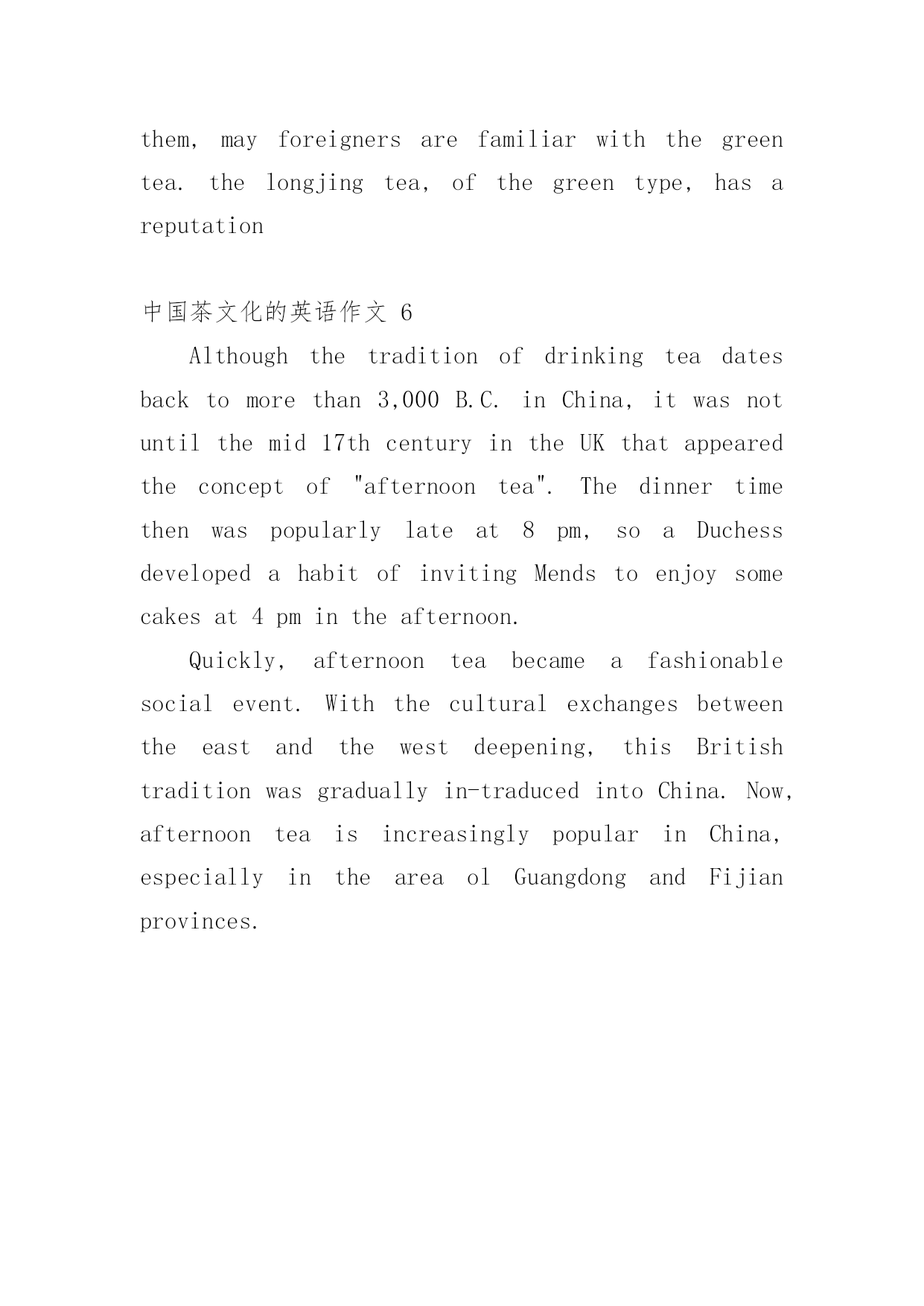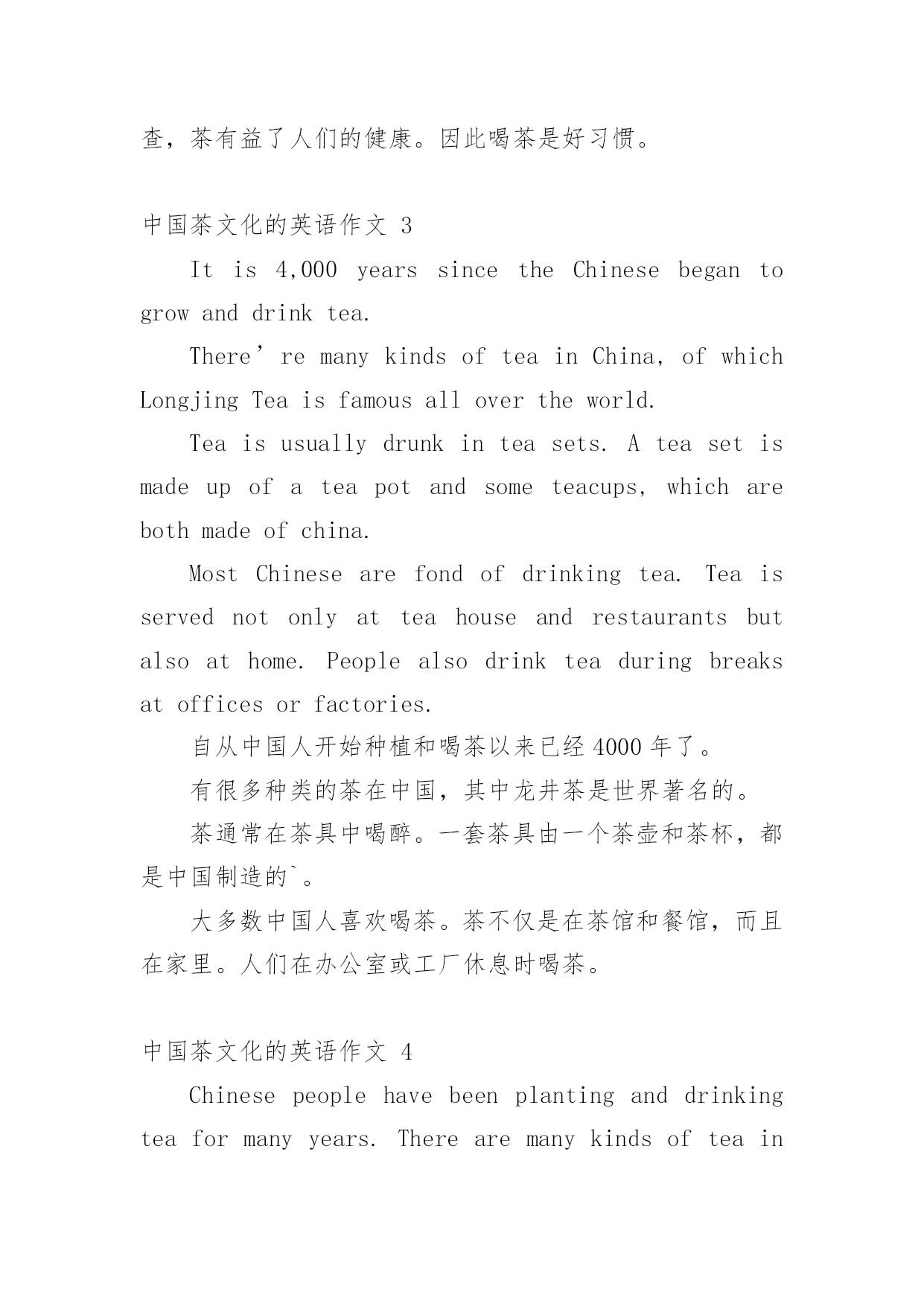 中国茶文化的英语作文有关中国茶文化的英语作文(精选6篇)导语:中华茶文化源远流长,博大精深,不但包含物质文化层面,还包含深厚的精神文明层次。下面是yuwenmi小编为大家整理的优秀英语作文,欢迎阅读与借鉴,谢谢!中国茶文化的英语作文1InChina,teahasaverylonghistory,andhasformedaChineseteaculture.Atthesametime,teaisgoodforourhealthandislovedbymanypeople.Chineseteacultureisbroadandprofound.Itincludesnotonlymaterialculture,butalsoprofoundspiritualcivilization.TalkingaboutChinesetea.Canbetracedbacktoancienttimes,itisfromtheTangDynastyandSongDynastyflourished.Fromthenon,thespiritofteapermeatedthecourtandsociety,andwentdeepintoChinesepoetry,painting,calligraphy,religionandmedicine.Forthousandsofyears,Chinahasaccumulatedalargenumberofteacultivationandproductionofmaterialculture,butalsoenrichedthespiritualcultureoftea.【参考译文】在中国,茶具有非常悠久的历史,并且已经形成了中国茶文化。与此同时,茶有益于我们的健康,因此受到许多人的喜爱。中国茶文化博大精深,不但包含物质文化层面,还包含深厚的精神文明层面。谈到中国的茶叶。可以追溯到远古时代,它是从唐代与宋代兴盛起来的。从此茶的精神渗透到了宫廷和社会,深入到中国的诗词、绘画、书法、宗教和医学。几千年来,中国积累了大量关于茶叶种植、生产的.物质文化,而且丰富了有关茶的精神文化。中国茶文化的英语作文2BeforeIwasfiveyearsold,Ilivedwithmygrandparents.Mygrandpalikesdrinkingteasomuch,hedrinkstheteaeveryday.SoIameffectedbyhim,Ilikedrinkingtea,too.DrinkingteamakesmestayhealthyforItakeinalotofwater.Accordingtothehealthyresearch,teaisgoodforpeople’shealth.Sodrinkingteaisthegoodhabit.【参考译文】在我五岁以前,和祖父母住在一起。我的'爷爷很喜欢喝茶,他每天都要喝茶。因此我受到了他的影响,我也喜欢喝茶。喝茶让我保持健康,因为我喝了很多水。根据健康调查,茶有益了人们的健康。因此喝茶是好习惯。中国茶文化的英语作文3Itis4,000yearssincetheChinesebegantogrowanddrinktea.There’remanykindsofteainChina,ofwhichLongjingTeaisfamousallovertheworld.Teaisusuallydrunkinteasets.Ateasetismadeupofateapotandsometeacups,whicharebothmadeofchina.MostChinesearefondofdrinkingtea.Teaisservednotonlyatteahouseandrestaurantsbutalsoathome.Peoplealsodrinkteaduringbreaksatofficesorfactories.自从中国人开始种植和喝茶以来已经4000年了。有很多种类的茶在中国,其中龙井茶是世界著名的。茶通常在茶具中喝醉。一套茶具由一个茶壶和茶杯,都是中国制造的`。大多数中国人喜欢喝茶。茶不仅是在茶馆和餐馆,而且在家里。人们在办公室或工厂休息时喝茶。中国茶文化的英语作文4Chinesepeoplehavebeenplantinganddrinkingteaformanyyears.TherearemanykindsofteainChina,amongwhichLongjingteaisfamousallovertheworld.Teaisusuallydrunkinteasets.Theteasetismadeofateapotandsometeacups.The
