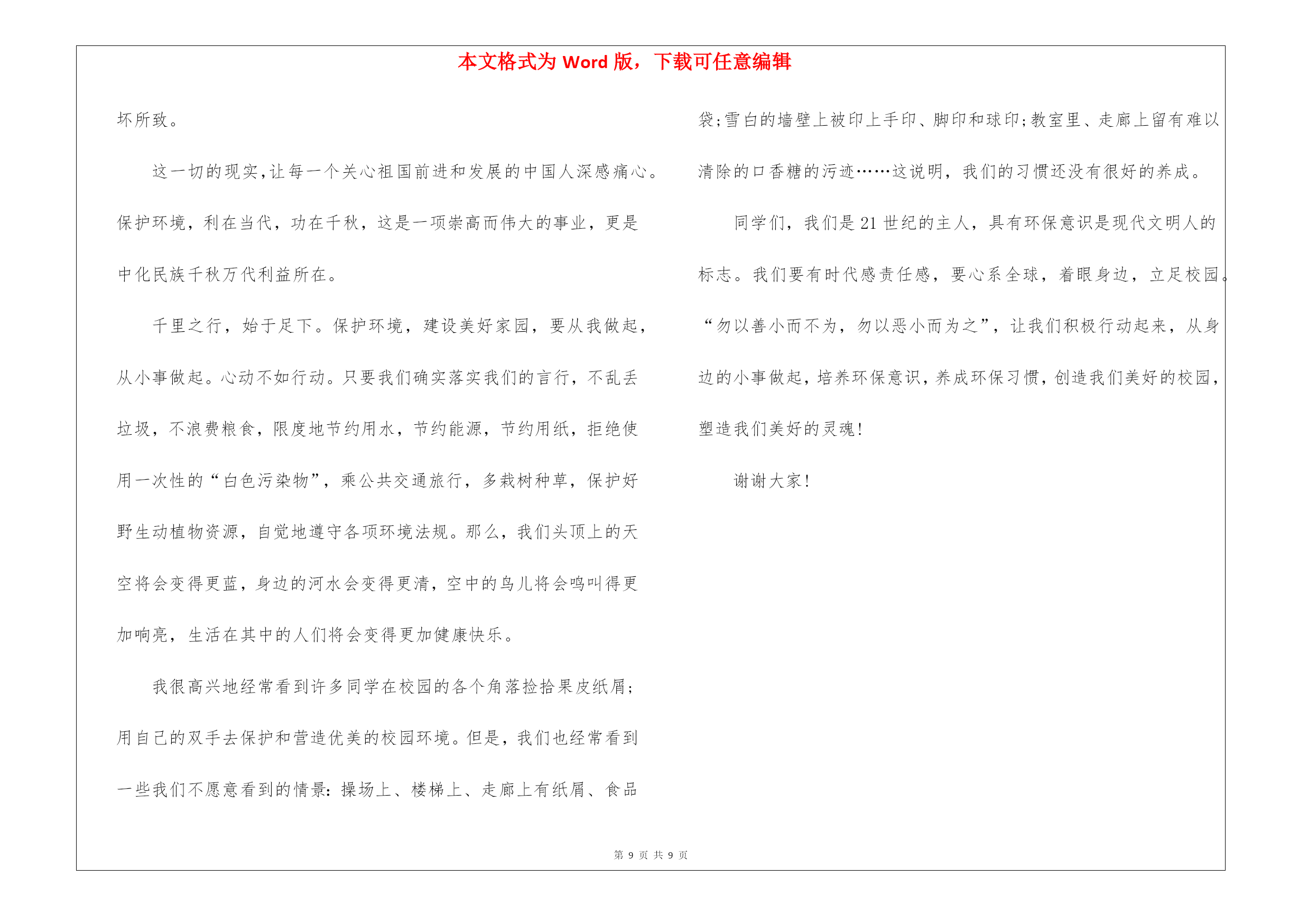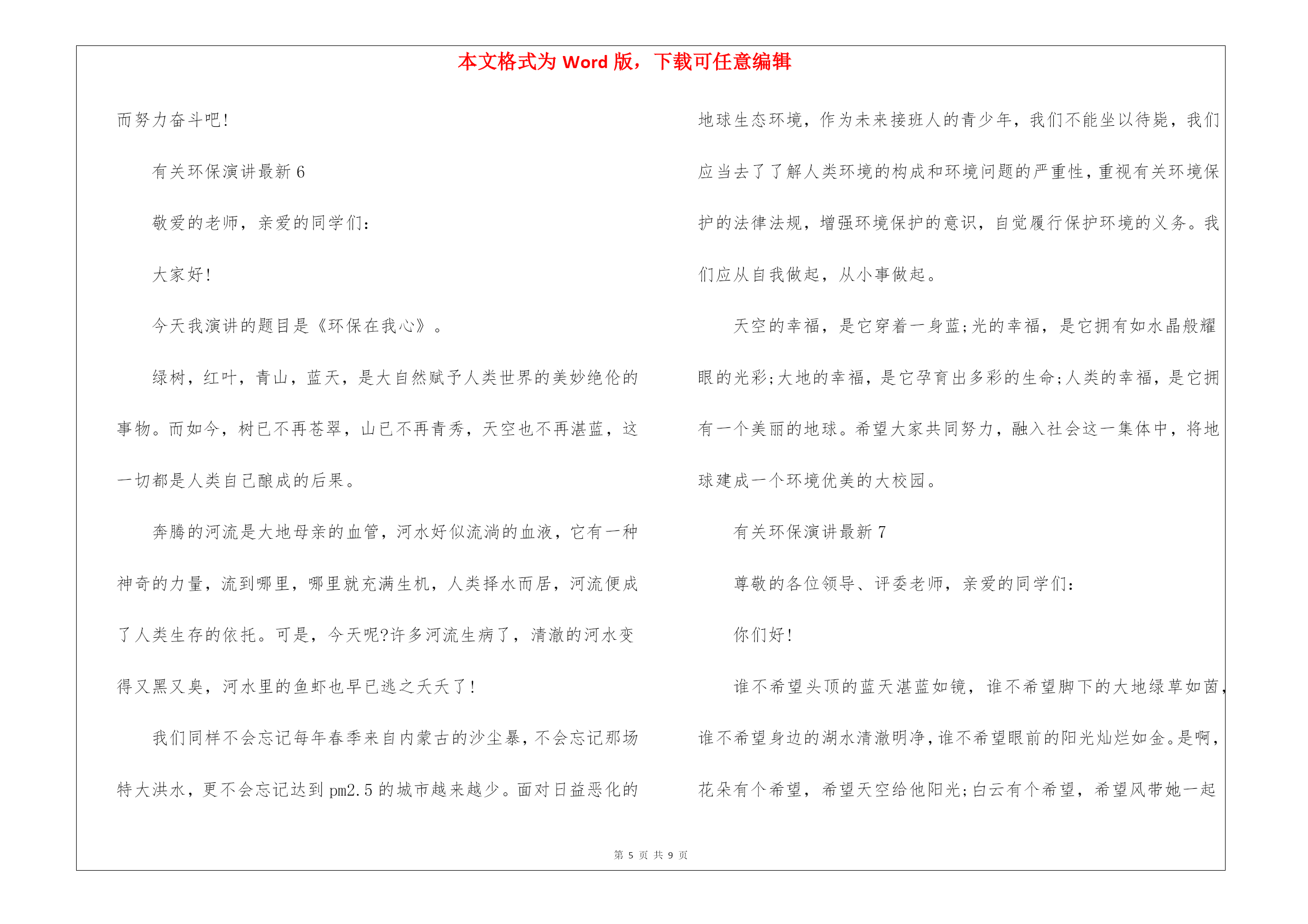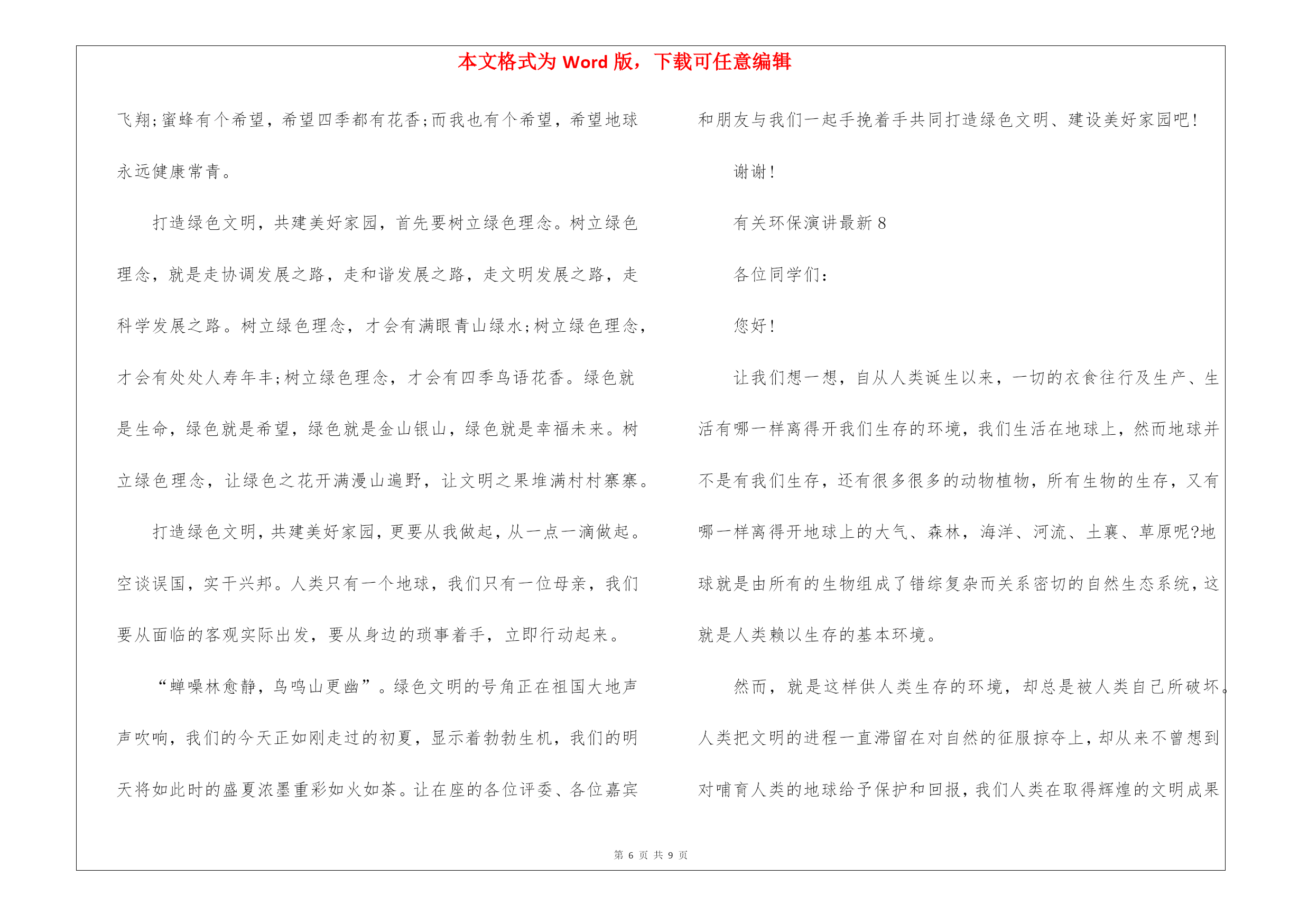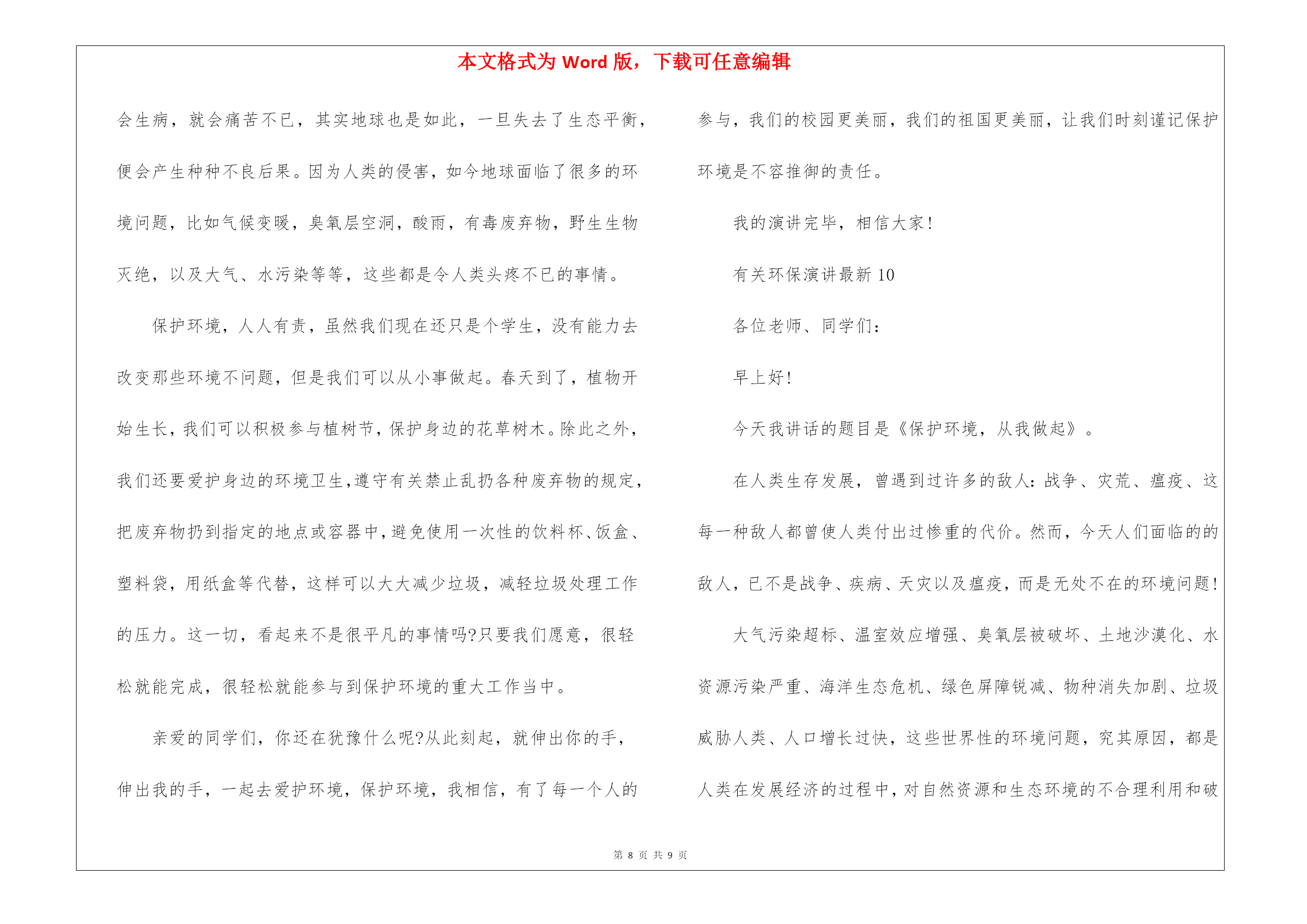 本文格式为Word版,下载可任意编辑第PAGE\*MERGEFORMAT9页共NUMPAGES\*MERGEFORMAT9页有关环保演讲范文最新10篇保护环境是我们大家义不容辞的责任。没有一个清洁美好的环境,再优裕的生活条件也无意义。我们要从现在做起,从身边做起,从小事做起。下面是编写整理的有关环保演讲最新,大家一起来看看吧。有关环保演讲最新1尊敬的老师,亲爱的同学们:大家好!今天,我的演讲主题是——《保护环境》。每天清晨,当我们走进校园,每个人都能感受到她的美丽、整洁。瞧:校门口两棵粗壮挺拔的榕树像两位忠于职守的卫士,日夜不停地守卫着校园;操场东西两边高大结实的凤凰树像朝气蓬勃的小孩,贪婪地吮吸着春天的甘露;校雕下一株株娇嫩的小草在微风中轻轻地摇曳着,欢快地向我们招手;平整舒适的塑胶跑道更是校园一道亮丽的风景线……在这样整洁优雅的校园环境中,我们沐浴着阳光,吸取着营养。我们满怀激情,畅想未来。曲格平曾说过:“没有一个清洁美好的环境,再优裕的生活条件也无意义。”学校是我们的家,我们是学校的主人,学校环境的美化要靠大家的共同努力。保护我们的校园就从我做起,从身边的小事做起,从力所能及的事情做起。参与环保活动,培养环保素养,人人争做环保小卫士。不要把它想象成很难的事情,其实环保就在我们身边。当你捡起别人掉下的一张纸时;当你记得及时关灯,不浪费用电时;当你用好水龙头能及时关掉,而不是让水白白流掉;当你下课、集会时能做到有秩序、有礼貌,而不是高声喧哗、嬉闹;当你不乱涂乱画,不践踏草坪,不攀折树枝;你就已经在做着环保卫士应该做的事情了。诸如此类的太多太多小事,我们其实都能做到。我相信,只要我们人人洁身自爱,个个遵守公德,我们的校园一定会更加干净、整洁、美丽!同学们,校园是我家,环保靠大家!为了大家能有一个更优美、更舒适的学习环境,为了我们能更加健康茁壮地成长,让我们携起手来,为保护环境贡献自己的力量吧!谢谢大家!有关环保演讲最新2敬爱的老师,亲爱的同学们:大家好!地球是迄今为止人类所知道的宇宙中可以承载人类生命的星球。人类在了球上生活已有几百万年的历史。在这漫长的岁月中,人类就是依靠地球上的资源生存、繁衍、发展的,所以,地球是人类的母亲。人类在漫长的发展道路上,无论是履行自然还是发展经济,都创造了辉煌的业绩。但是与此同时,因为不合理的开发和利用自然资源,不注意环境保护工作,造成了全球性的生态破坏和环境污染。现在全球每年有600万公顷的土地沦为沙漠,2000万公顷森林在消失,平均一小时有一种物种在灭绝。由于臭氧层被破坏,温室效应在加剧,使用权地球气温不断升高,南极冰冠开始溶化,海洋平面将不断升高,世界上许多沿海城市、岛屿和大量土地,将被海水吞没。这一系列环境问题,不仅影响着经济的发展和社会的进步,甚至威胁着人类的生存,所以爱护环境,已成为全人类共同关心的问题。同学们,保护环境十分重要。如果在发展经济的过程中不注意环境保护,就要受到大自然的报复。不仅损害我们这一代,还要遗害子孙万代!同学们,我们是地球的主人,我们每个人从小就要有环境保护意识。保护环境是我们大家义不容辞的责任。我们要从现在做起,从身边做起,从小事做起:爱护花草树木,爱护鸟类和其他小动物等等。通过我们的努力,使祖国的天更蓝,地更绿,水更清。有关环保演讲最新3尊敬的各位老师们、同学们:大家好!今天我演讲的题目是《低碳环保,从我做起》!现在,已经是21世纪了,地球的科技越来越发达,从过去的猿人到现在的文明人,经过了漫长的演变,现在,人们已经可以运用自己的智慧,将汽油、铁等东西攒在一起,做成汽车等东西了,可正是由于这些东西的诞生,地球的能源也越来越少,环境也越来越差……首先,我们得从空调下手,空调是比较费电的,还会排放暖气,所以,我们可以将电风扇放在下面,提高制冷效果,好少开一会空调,当空调开启几小时后关闭,马上开电风扇。晚上用这个方法,可以不用整夜开空调,省电近50%其次,冰箱也很重要,冰箱里的东西占容积的80%,或多或少都会费电,还有,看电视时,少开电视,以节约电源,在街上开的汽车,每天排放的尾气会导致气候变暖,还会污染空气,所以,我们可以尽量步行,坐公交车,以减少尾气排放。我推荐的只不过是几种方法,希望大家可以做到这些,过上低碳、环保的生活。有关环保演讲最新4各位老师、同学们:早上好!今天我讲话的题目是《保护环境,从我做起》。在人类生存发展,曾遇到过许多的敌人:战争、灾荒、瘟疫、这每一种敌人都曾使人类付出过惨重的代价。然而,今天人们面临的的敌人,已不是战争、疾病、天灾以及瘟疫,而是无处不在的环境问题!大气污染超标、温室效应增强、臭氧层被破坏、土地沙漠化、水资源污染严重、海洋生态危机、绿色屏障锐减、物种消失加剧、垃圾威胁人类、人口增长过快,这些世界性的环境问题