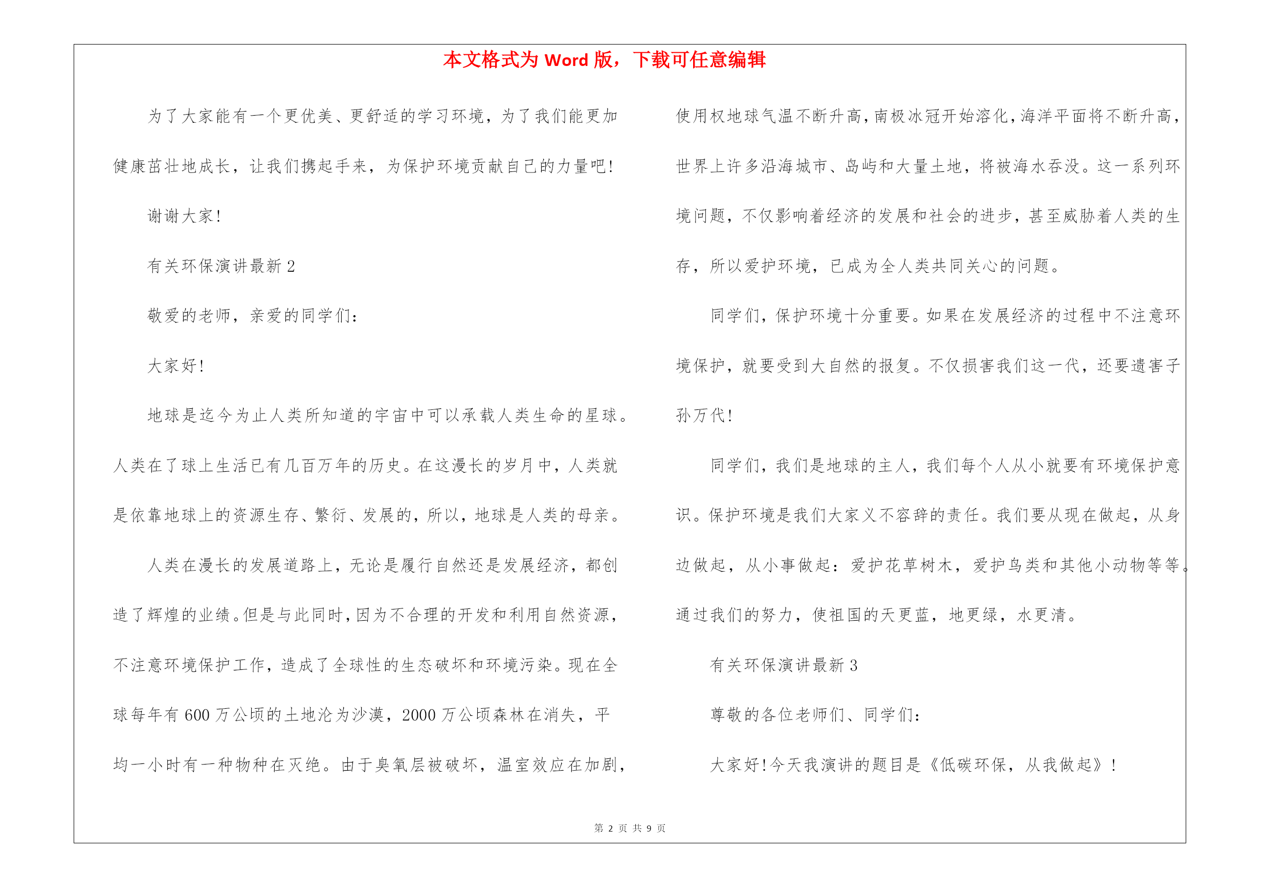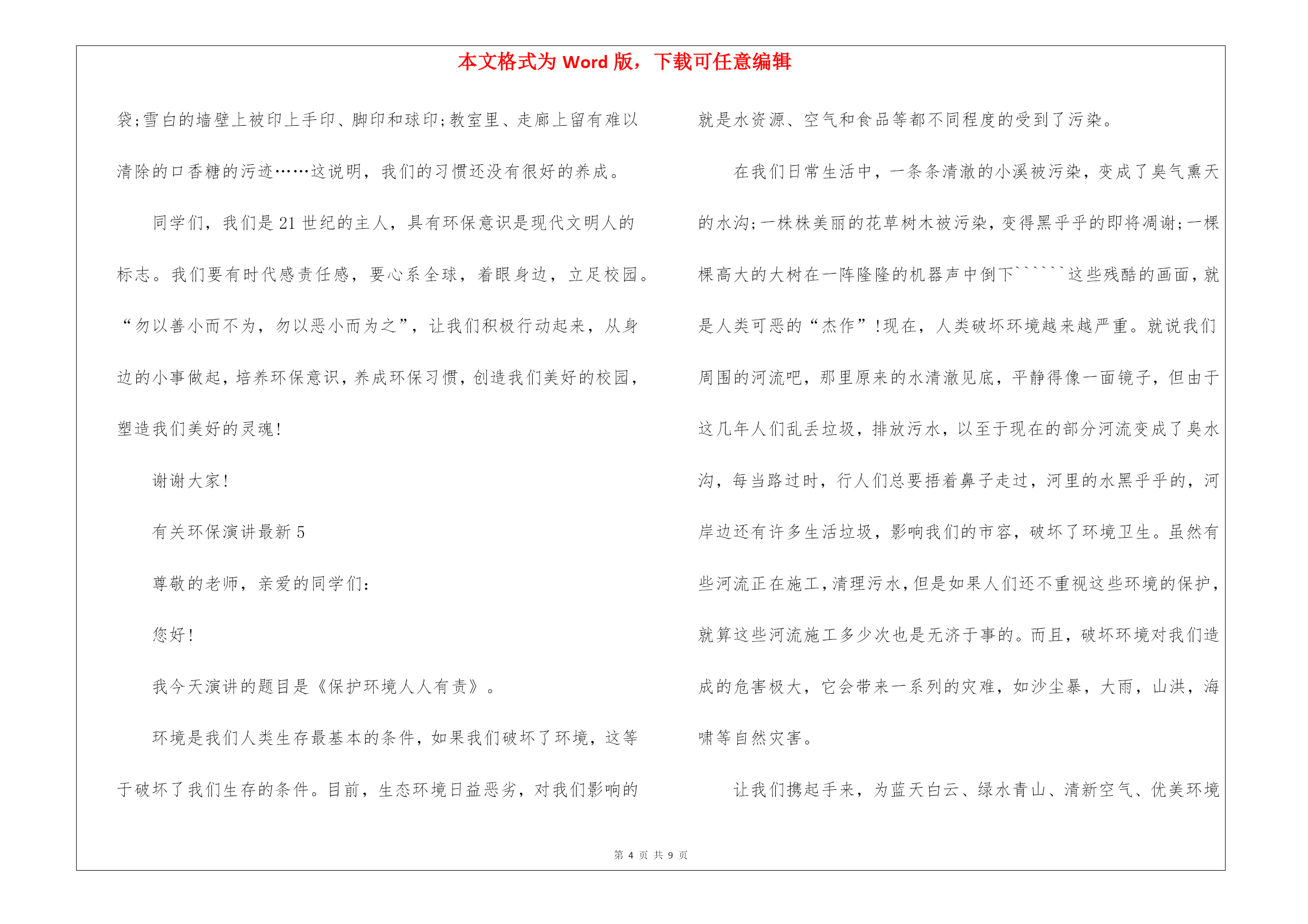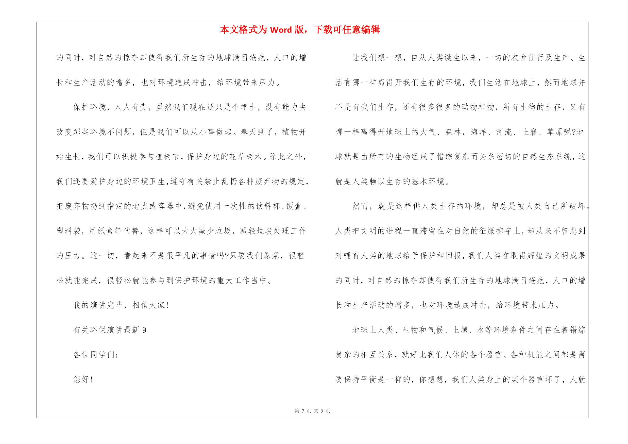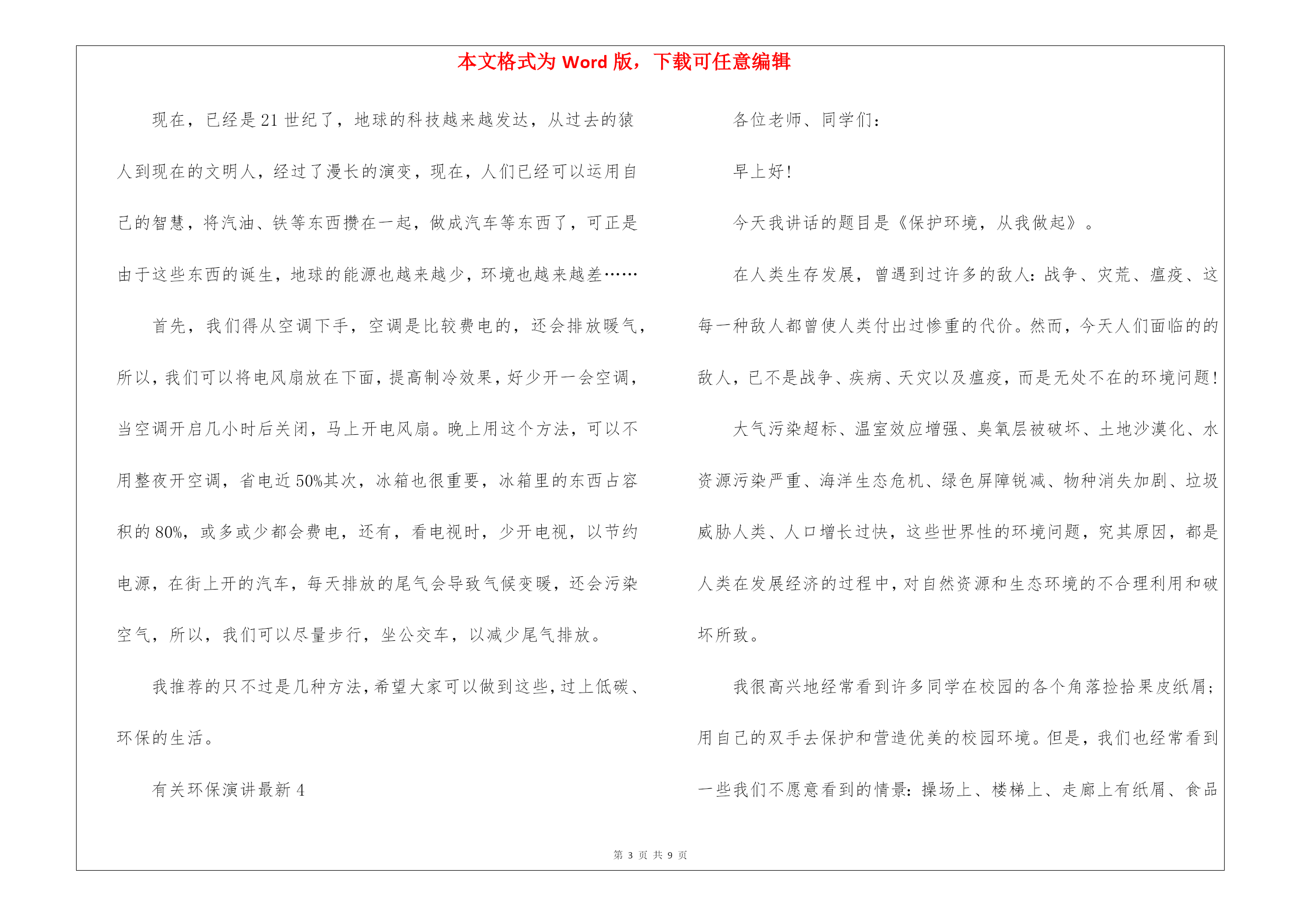 本文格式为Word版,下载可任意编辑第PAGE\*MERGEFORMAT9页共NUMPAGES\*MERGEFORMAT9页有关环保演讲范文最新10篇保护环境是我们大家义不容辞的责任。没有一个清洁美好的环境,再优裕的生活条件也无意义。我们要从现在做起,从身边做起,从小事做起。下面是编写整理的有关环保演讲最新,大家一起来看看吧。有关环保演讲最新1尊敬的老师,亲爱的同学们:大家好!今天,我的演讲主题是——《保护环境》。每天清晨,当我们走进校园,每个人都能感受到她的美丽、整洁。瞧:校门口两棵粗壮挺拔的榕树像两位忠于职守的卫士,日夜不停地守卫着校园;操场东西两边高大结实的凤凰树像朝气蓬勃的小孩,贪婪地吮吸着春天的甘露;校雕下一株株娇嫩的小草在微风中轻轻地摇曳着,欢快地向我们招手;平整舒适的塑胶跑道更是校园一道亮丽的风景线……在这样整洁优雅的校园环境中,我们沐浴着阳光,吸取着营养。我们满怀激情,畅想未来。曲格平曾说过:“没有一个清洁美好的环境,再优裕的生活条件也无意义。”学校是我们的家,我们是学校的主人,学校环境的美化要靠大家的共同努力。保护我们的校园就从我做起,从身边的小事做起,从力所能及的事情做起。参与环保活动,培养环保素养,人人争做环保小卫士。不要把它想象成很难的事情,其实环保就在我们身边。当你捡起别人掉下的一张纸时;当你记得及时关灯,不浪费用电时;当你用好水龙头能及时关掉,而不是让水白白流掉;当你下课、集会时能做到有秩序、有礼貌,而不是高声喧哗、嬉闹;当你不乱涂乱画,不践踏草坪,不攀折树枝;你就已经在做着环保卫士应该做的事情了。诸如此类的太多太多小事,我们其实都能做到。我相信,只要我们人人洁身自爱,个个遵守公德,我们的校园一定会更加干净、整洁、美丽!同学们,校园是我家,环保靠大家!为了大家能有一个更优美、更舒适的学习环境,为了我们能更加健康茁壮地成长,让我们携起手来,为保护环境贡献自己的力量吧!谢谢大家!有关环保演讲最新2敬爱的老师,亲爱的同学们:大家好!地球是迄今为止人类所知道的宇宙中可以承载人类生命的星球。人类在了球上生活已有几百万年的历史。在这漫长的岁月中,人类就是依靠地球上的资源生存、繁衍、发展的,所以,地球是人类的母亲。人类在漫长的发展道路上,无论是履行自然还是发展经济,都创造了辉煌的业绩。但是与此同时,因为不合理的开发和利用自然资源,不注意环境保护工作,造成了全球性的生态破坏和环境污染。现在全球每年有600万公顷的土地沦为沙漠,2000万公顷森林在消失,平均一小时有一种物种在灭绝。由于臭氧层被破坏,温室效应在加剧,使用权地球气温不断升高,南极冰冠开始溶化,海洋平面将不断升高,世界上许多沿海城市、岛屿和大量土地,将被海水吞没。这一系列环境问题,不仅影响着经济的发展和社会的进步,甚至威胁着人类的生存,所以爱护环境,已成为全人类共同关心的问题。同学们,保护环境十分重要。如果在发展经济的过程中不注意环境保护,就要受到大自然的报复。不仅损害我们这一代,还要遗害子孙万代!同学们,我们是地球的主人,我们每个人从小就要有环境保护意识。保护环境是我们大家义不容辞的责任。我们要从现在做起,从身边做起,从小事做起:爱护花草树木,爱护鸟类和其他小动物等等。通过我们的努力,使祖国的天更蓝,地更绿,水更清。有关环保演讲最新3尊敬的各位老师们、同学们:大家好!今天我演讲的题目是《低碳环保,从我做起》!现在,已经是21世纪了,地球的科技越来越发达,从过去的猿人到现在的文明人,经过了漫长的演变,现在,人们已经可以运用自己的智慧,将汽油、铁等东西攒在一起,做成汽车等东西了,可正是由于这些东西的诞生,地球的能源也越来越少,环境也越来越差……首先,我们得从空调下手,空调是比较费电的,还会排放暖气,所以,我们可以将电风扇放在下面,提高制冷效果,好少开一会空调,当空调开启几小时后关闭,马上开电风扇。晚上用这个方法,可以不用整夜开空调,省电近50%其次,冰箱也很重要,冰箱里的东西占容积的80%,或多或少都会费电,还有,看电视时,少开电视,以节约电源,在街上开的汽车,每天排放的尾气会导致气候变暖,还会污染空气,所以,我们可以尽量步行,坐公交车,以减少尾气排放。我推荐的只不过是几种方法,希望大家可以做到这些,过上低碳、环保的生活。有关环保演讲最新4各位老师、同学们:早上好!今天我讲话的题目是《保护环境,从我做起》。在人类生存发展,曾遇到过许多的敌人:战争、灾荒、瘟疫、这每一种敌人都曾使人类付出过惨重的代价。然而,今天人们面临的的敌人,已不是战争、疾病、天灾以及瘟疫,而是无处不在的环境问题!大气污染超标、温室效应增强、臭氧层被破坏、土地沙漠化、水资源污染严重、海洋生态危机、绿色屏障锐减、物种消失加剧、垃圾威胁人类、人口增长过快,这些世界性的环境问题