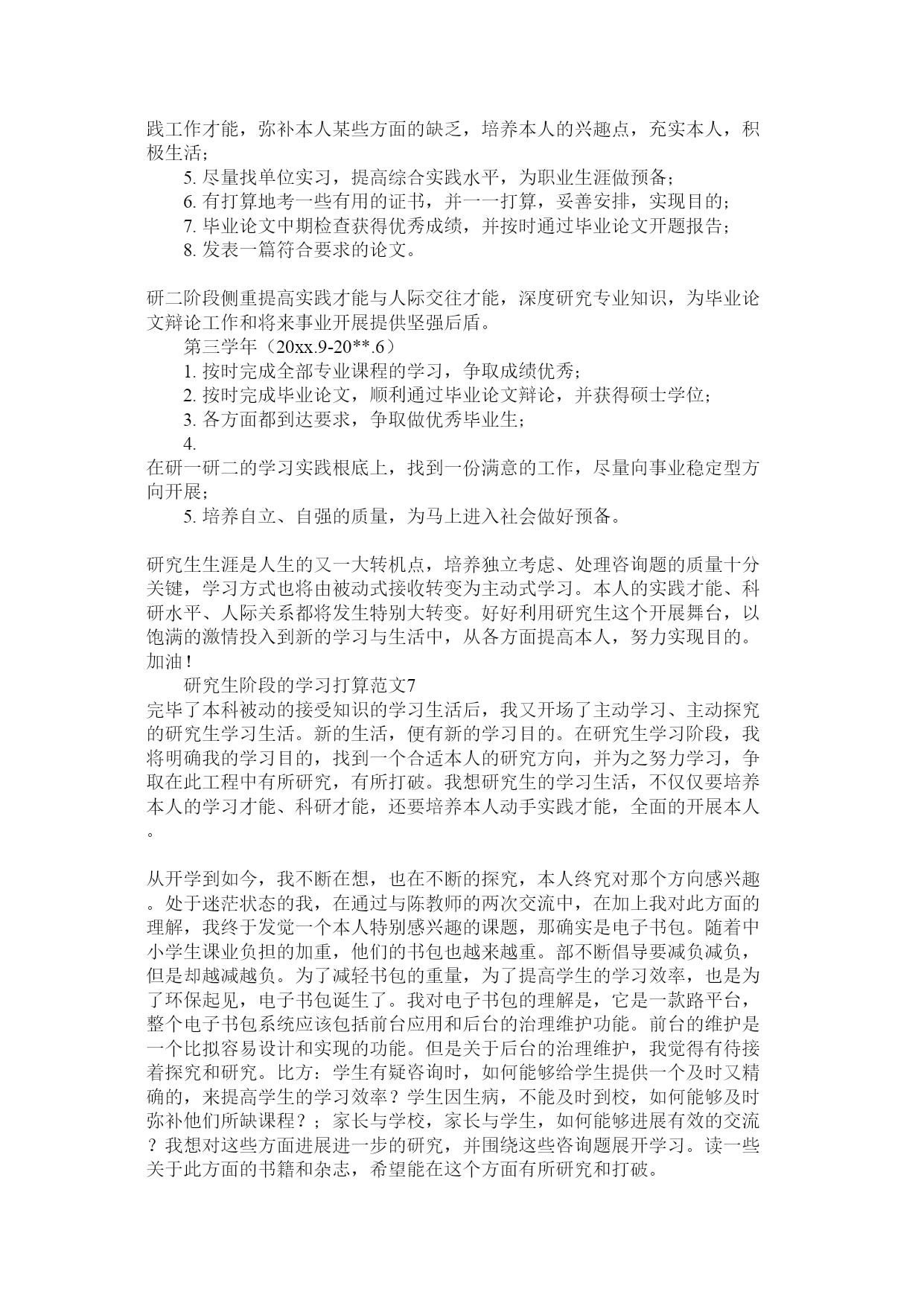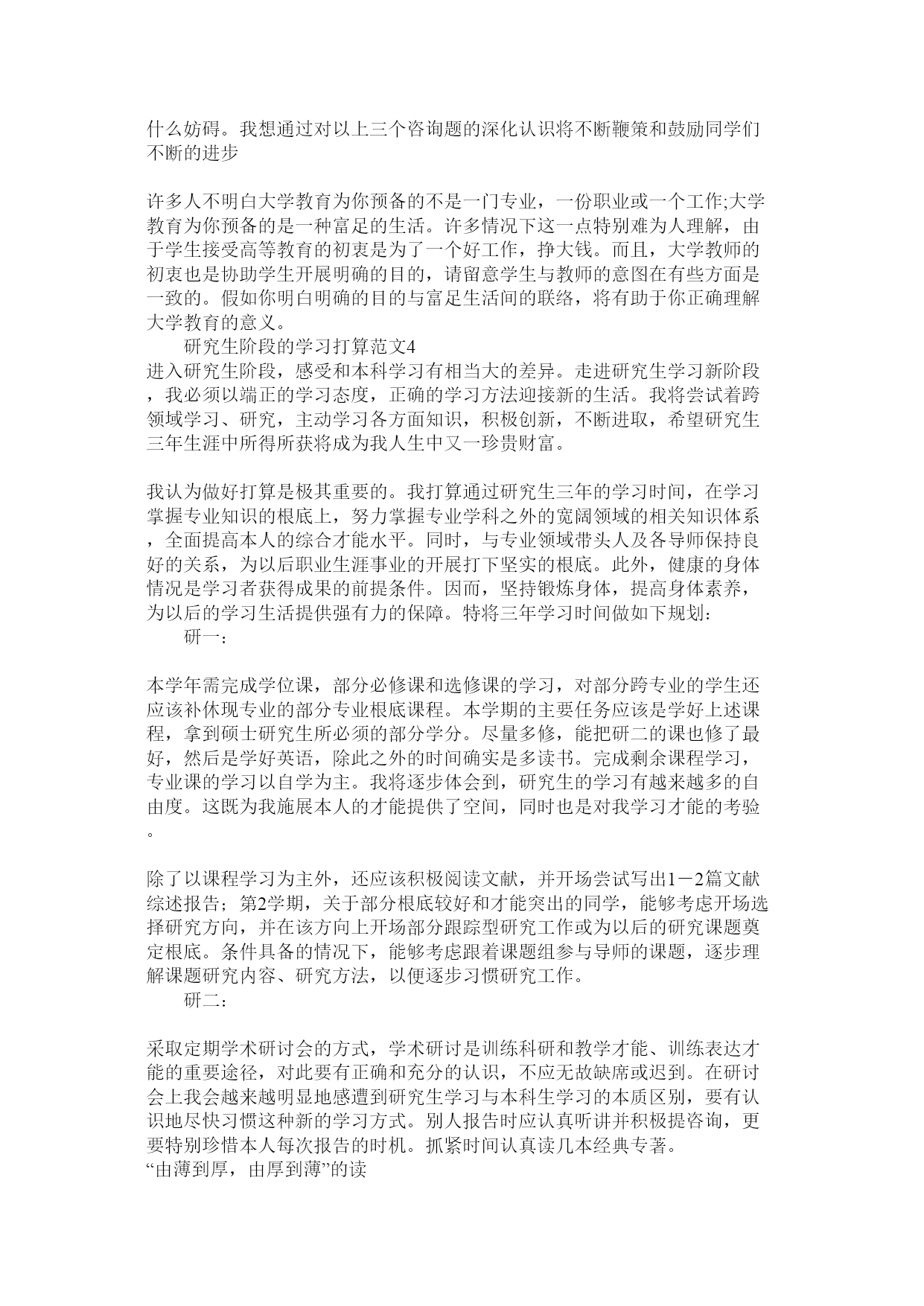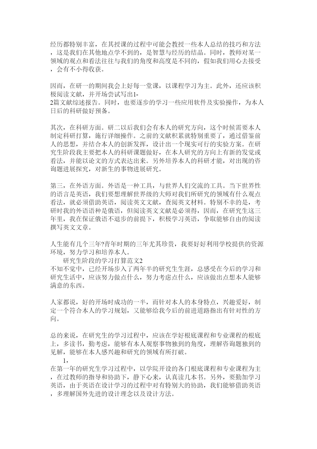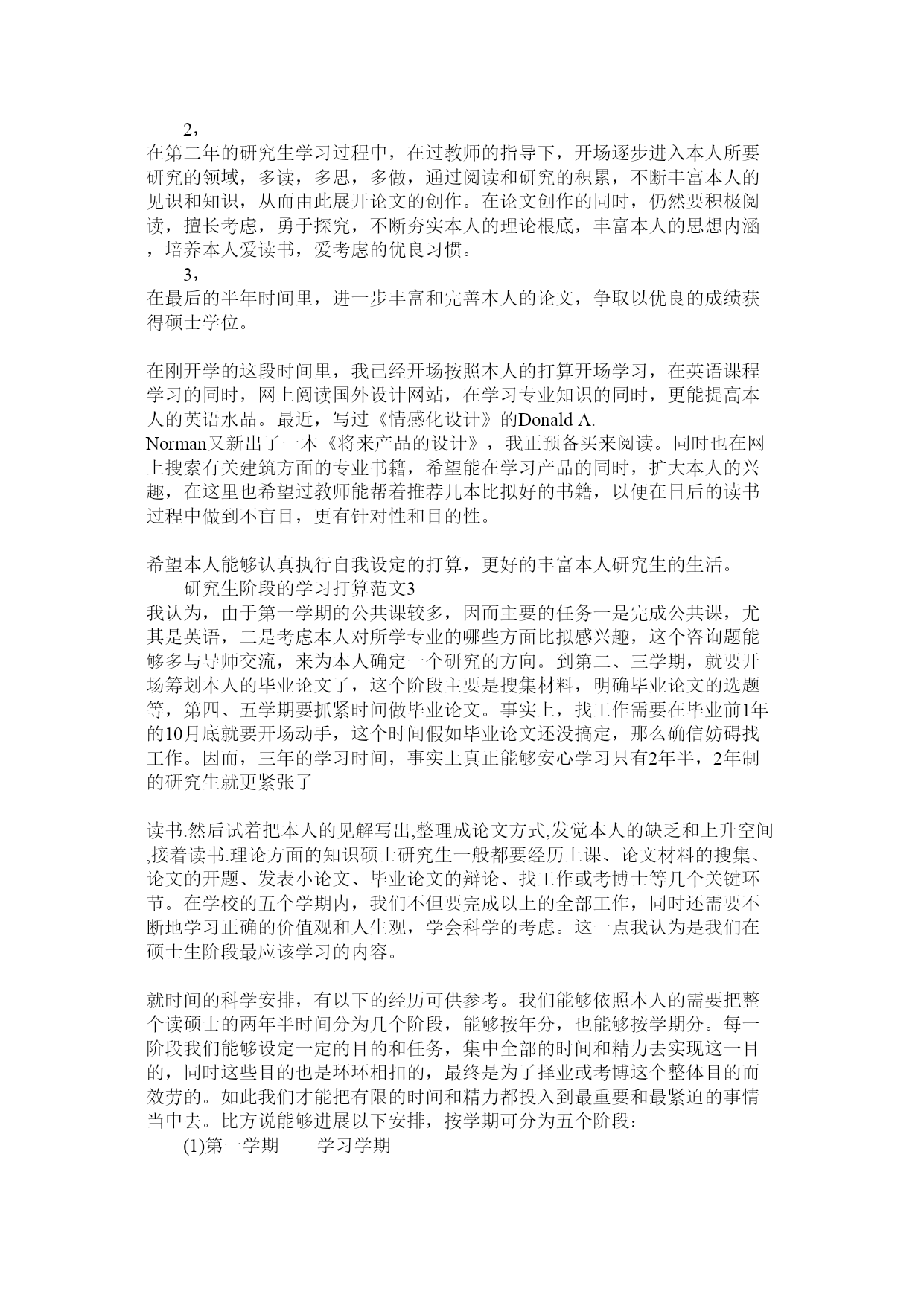 研究生阶段的学习打算范文研究生阶段的学习打算范文关键词:学习打算,研究生,阶段,范文研究生阶段的学习打算范文介绍:研究生生活较之本科有了更多的自由,因而也具有更大的自主性和自由发挥空间。以下是研究生阶段的学习打算范文,欢迎阅读。研究生阶段的学习打算范文1尽管早明白本人已经被录用,但当我接到录用通知书的那一刻,依然忍不住的激动了一番,。想想本人一年多的努力有了报答,依然蛮欣慰的。转眼间,我已经成为了一名真研究生阶段的学习打算范文详情:研究生生活较之本科有了更多的自由,因而也具有更大的自主性和自由发挥空间。以下是研究生阶段的学习打算范文,欢迎阅读。研究生阶段的学习打算范文1尽管早明白本人已经被录用,但当我接到录用通知书的那一刻,依然忍不住的激动了一番,。想想本人一年多的努力有了报答,依然蛮欣慰的。转眼间,我已经成为了一名真正的研究生,已经逐步的习惯了研究生的生活,大学四年转眼即逝,研究生的三年也并没有大多数人想象的那么长,这个期间是我们人生和事业的关键期,有许多重要的任务需要我们在这个阶段完成或奠定一个好的根底。这就需要我制定一个研究生期间的整体生涯规划,给本人规定目的和任务,并在实践中不断的探究并加以改良,尽可能的完成打算中得各项任务。希望在三年后我回首的时候,能够骄傲的说,我是一名合格的硕士。首先,在课程学习方面。研一时候开设的课程是为我们打根底的,只有根底结实了,我们今后在科研的道路上才会走的稳,走的远。如今我们的课程分为学位课和公共课,学位课是与我们的专业有关的,是我们今后研究的理论根底,因而在研一的时候我要把每一门学位课学好,认真考虑课程理论的现实意义,融会贯穿,学有所用。公共课主要是政治内容的,以马克思主义为主。马克思主义是我们学习、研究与工作的根本指导思想。要注重理论学习课,不要当成负担,也不要只当作拿学分的途径,而要真正地去学,学有所得,学有所用。给我们授课的教师大都是教授、副教授级别的,人生阅历、科研经历都特别丰富,在其授课的过程中可能会教授一些本人总结的技巧和方法,这是我们在其他地点学不到的,是智慧与经历的结晶。同时,教师对某一领域的观点和看法往往与我们的角度和高度是不同的,假如我们用心去接受,会有不小得收获。因而,在研一的期间我会上好每一堂课,以课程学习为主。此外,还应该积极阅读文献,并开场尝试写出1-2篇文献综述报告。同时,也要逐步的学习一些应用软件及实验操作,为本人日后的科研做好预备。其次,在科研方面。研二以后我们会有本人的研究方向,这个时候需要本人制定科研打算,施行详细操作。之前的文献积累就特别重要了,通过借鉴前人的思想,并结合本人的创新发挥,设计出一个现实可行的实验方案。在研究生阶段我主要把本人的科研课题做好,在本人研究的方向上有新的发觉或看法,并能以论文的方式表达出来。另外培养本人的科研才能,对出现的咨询题进展探究,对新生的事物进展研究。第三,在外语方面。外语是一种工具,与世界人们交流的工具。当下世界性的语言是英语,我们要想理解世界级的大师对我们所研究的领域有什么观点看法,就必须借助英语,阅读英文文献,查阅英文材料。特别不幸的是,考研时我的外语语种是俄语,但阅读英文文献是必须得,因而,在研究生这三年里,我在保证俄语不退步的前提下,积极学习英语,争取能够自由的阅读撰写英文文章。人生能有几个三年?青年时期的三年尤其珍贵,我要好好利用学校提供的资源环境,努力学习和培养本人。研究生阶段的学习打算范文2不知不觉中,已经开场步入了两年半的研究生生涯,总感受在今后的学习和研究生活中,应该努力做点什么,努力考虑点什么,应该做出点想本人能够满意的东西。人家都说,好的开场时成功的一半,而针对本人的本身特点,兴趣爱好,制定一个符合本人的学习规划,又能够给我今后的前进道路指出有针对性的方向。总的来说,在研究生的学习过程中,应该在学好根底课程和专业课程的根底上,多读书,勤考虑,能够有本人观察事物独到的角度,理解咨询题独到的见解,能够在本人感兴趣和研究的领域有所打破。1,在第一年的研究生学习过程中,以学院开设的各门根底课程和专业课程为主,在过教师的指导和协助下,静下心来,认真读几本书。另外,要勤加学习英语,由于英语在设计学习的过程中对有特别大的协助,我们能够借助英语,多理解国外先进的设计理念以及设计方法。2,在第二年的研究生学习过程中,在过教师的指导下,开场逐步进入本人所要研究的领域,多读,多思,多做,通过阅读和研究的积累,不断丰富本人的见识和知识,从而由此展开论文的创作。在论文创作的同时,仍然要积极阅读,擅长考虑,勇于探究,不断夯实本人的理论根底,丰富本人的思想内涵,培养本人爱读书,爱考虑的优良习惯。3,在最后的半年时间里,进一步丰富和完善本人的论文,争取以优良的成绩获得