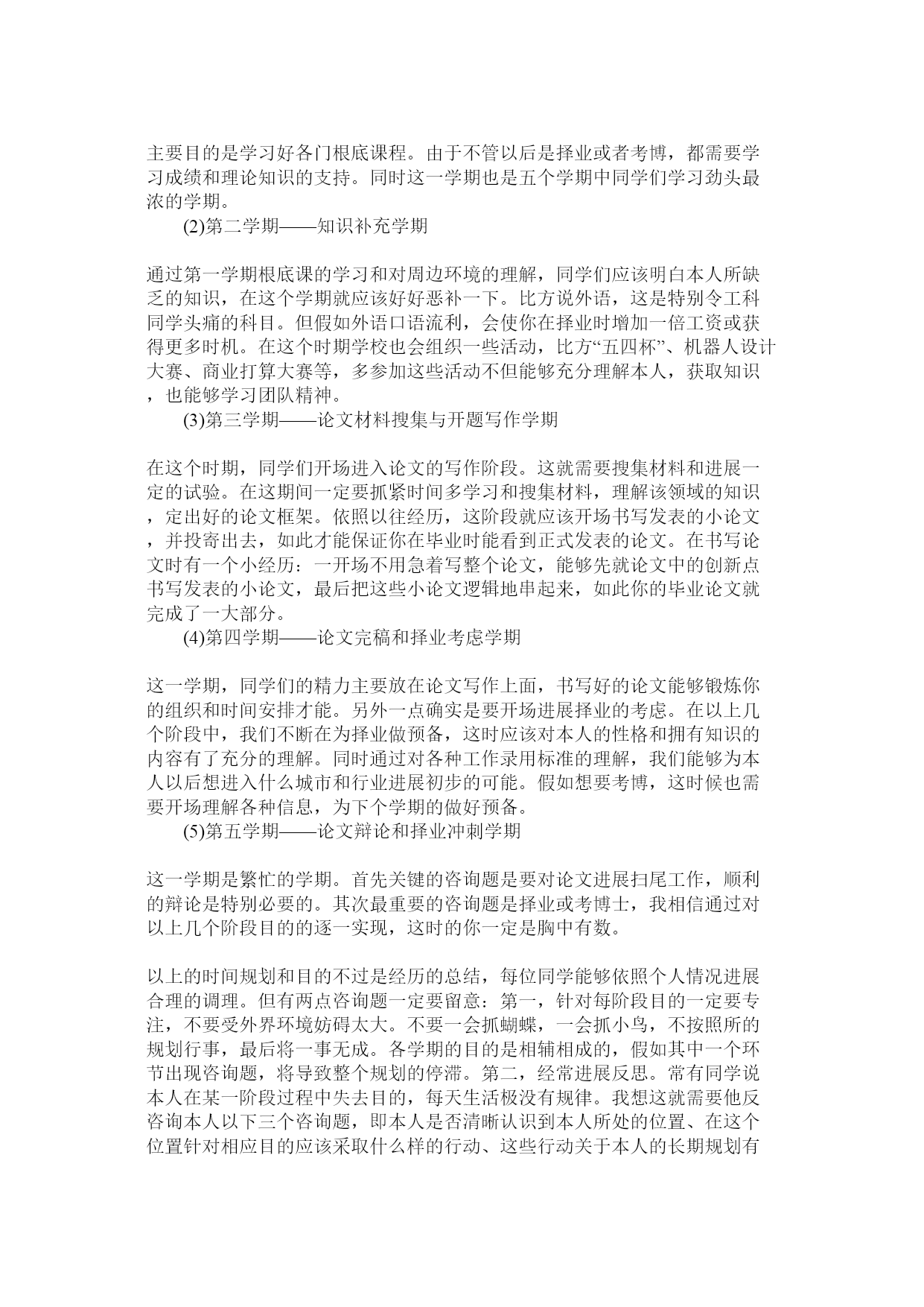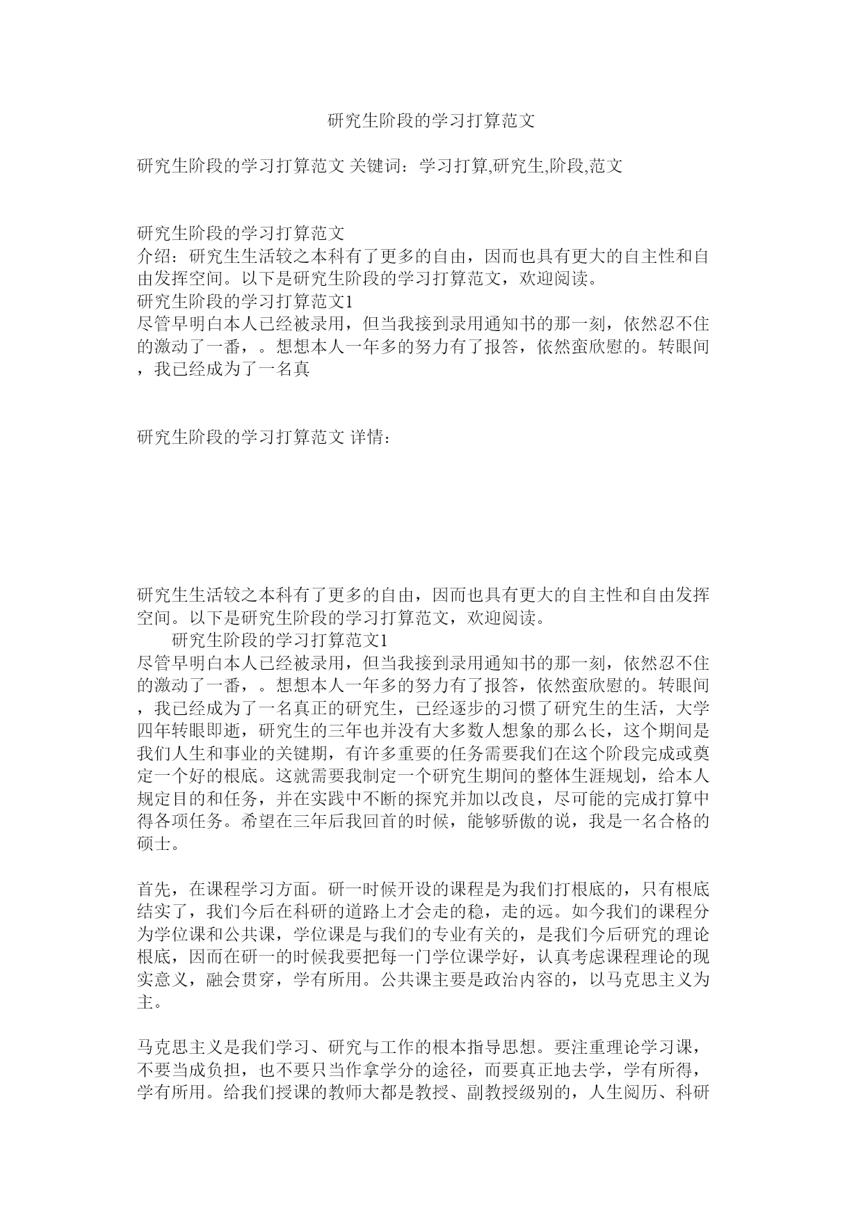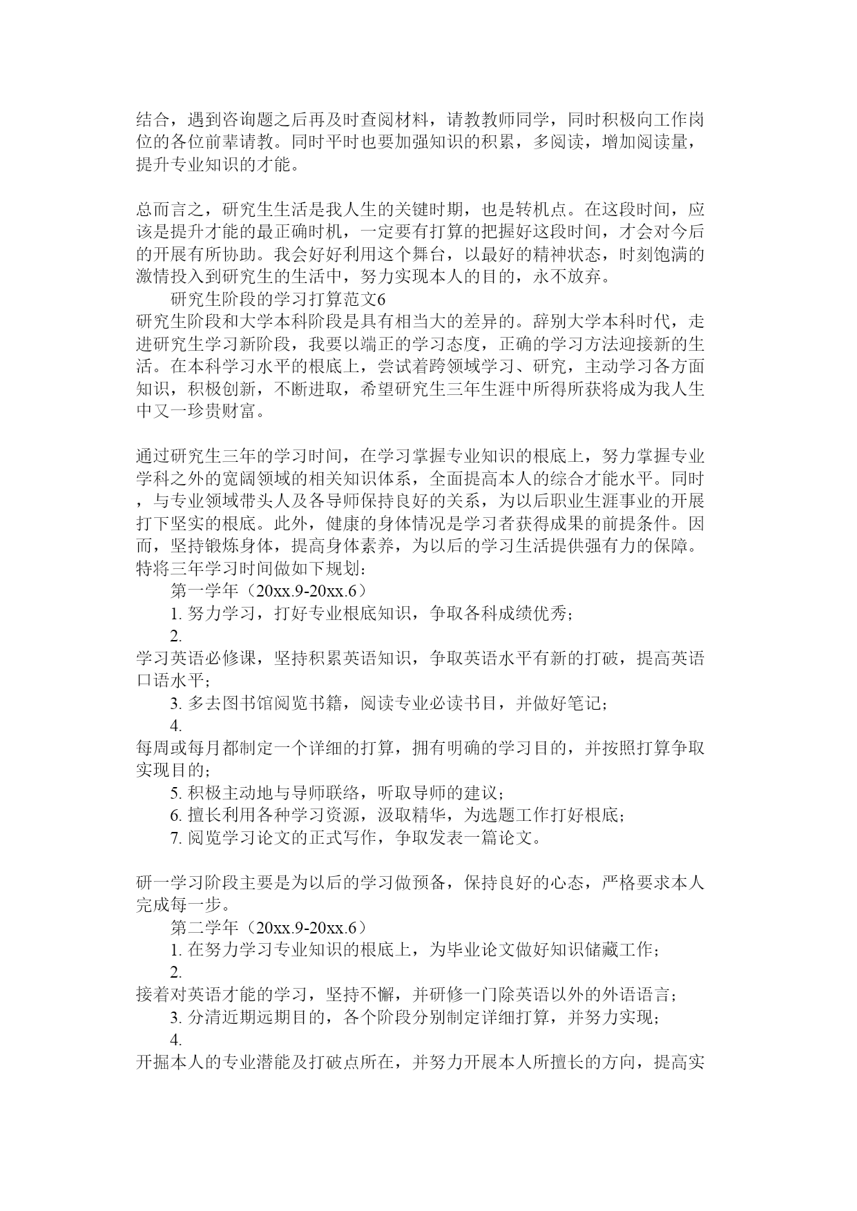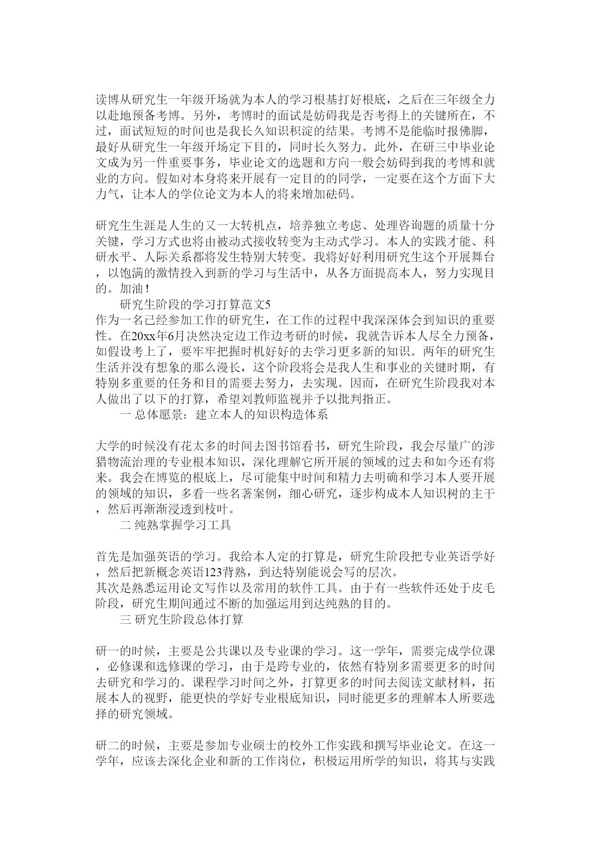 研究生阶段的学习打算范文研究生阶段的学习打算范文关键词:学习打算,研究生,阶段,范文研究生阶段的学习打算范文介绍:研究生生活较之本科有了更多的自由,因而也具有更大的自主性和自由发挥空间。以下是研究生阶段的学习打算范文,欢迎阅读。研究生阶段的学习打算范文1尽管早明白本人已经被录用,但当我接到录用通知书的那一刻,依然忍不住的激动了一番,。想想本人一年多的努力有了报答,依然蛮欣慰的。转眼间,我已经成为了一名真研究生阶段的学习打算范文详情:研究生生活较之本科有了更多的自由,因而也具有更大的自主性和自由发挥空间。以下是研究生阶段的学习打算范文,欢迎阅读。研究生阶段的学习打算范文1尽管早明白本人已经被录用,但当我接到录用通知书的那一刻,依然忍不住的激动了一番,。想想本人一年多的努力有了报答,依然蛮欣慰的。转眼间,我已经成为了一名真正的研究生,已经逐步的习惯了研究生的生活,大学四年转眼即逝,研究生的三年也并没有大多数人想象的那么长,这个期间是我们人生和事业的关键期,有许多重要的任务需要我们在这个阶段完成或奠定一个好的根底。这就需要我制定一个研究生期间的整体生涯规划,给本人规定目的和任务,并在实践中不断的探究并加以改良,尽可能的完成打算中得各项任务。希望在三年后我回首的时候,能够骄傲的说,我是一名合格的硕士。首先,在课程学习方面。研一时候开设的课程是为我们打根底的,只有根底结实了,我们今后在科研的道路上才会走的稳,走的远。如今我们的课程分为学位课和公共课,学位课是与我们的专业有关的,是我们今后研究的理论根底,因而在研一的时候我要把每一门学位课学好,认真考虑课程理论的现实意义,融会贯穿,学有所用。公共课主要是政治内容的,以马克思主义为主。马克思主义是我们学习、研究与工作的根本指导思想。要注重理论学习课,不要当成负担,也不要只当作拿学分的途径,而要真正地去学,学有所得,学有所用。给我们授课的教师大都是教授、副教授级别的,人生阅历、科研经历都特别丰富,在其授课的过程中可能会教授一些本人总结的技巧和方法,这是我们在其他地点学不到的,是智慧与经历的结晶。同时,教师对某一领域的观点和看法往往与我们的角度和高度是不同的,假如我们用心去接受,会有不小得收获。因而,在研一的期间我会上好每一堂课,以课程学习为主。此外,还应该积极阅读文献,并开场尝试写出1-2篇文献综述报告。同时,也要逐步的学习一些应用软件及实验操作,为本人日后的科研做好预备。其次,在科研方面。研二以后我们会有本人的研究方向,这个时候需要本人制定科研打算,施行详细操作。之前的文献积累就特别重要了,通过借鉴前人的思想,并结合本人的创新发挥,设计出一个现实可行的实验方案。在研究生阶段我主要把本人的科研课题做好,在本人研究的方向上有新的发觉或看法,并能以论文的方式表达出来。另外培养本人的科研才能,对出现的咨询题进展探究,对新生的事物进展研究。第三,在外语方面。外语是一种工具,与世界人们交流的工具。当下世界性的语言是英语,我们要想理解世界级的大师对我们所研究的领域有什么观点看法,就必须借助英语,阅读英文文献,查阅英文材料。特别不幸的是,考研时我的外语语种是俄语,但阅读英文文献是必须得,因而,在研究生这三年里,我在保证俄语不退步的前提下,积极学习英语,争取能够自由的阅读撰写英文文章。人生能有几个三年?青年时期的三年尤其珍贵,我要好好利用学校提供的资源环境,努力学习和培养本人。研究生阶段的学习打算范文2不知不觉中,已经开场步入了两年半的研究生生涯,总感受在今后的学习和研究生活中,应该努力做点什么,努力考虑点什么,应该做出点想本人能够满意的东西。人家都说,好的开场时成功的一半,而针对本人的本身特点,兴趣爱好,制定一个符合本人的学习规划,又能够给我今后的前进道路指出有针对性的方向。总的来说,在研究生的学习过程中,应该在学好根底课程和专业课程的根底上,多读书,勤考虑,能够有本人观察事物独到的角度,理解咨询题独到的见解,能够在本人感兴趣和研究的领域有所打破。1,在第一年的研究生学习过程中,以学院开设的各门根底课程和专业课程为主,在过教师的指导和协助下,静下心来,认真读几本书。另外,要勤加学习英语,由于英语在设计学习的过程中对有特别大的协助,我们能够借助英语,多理解国外先进的设计理念以及设计方法。2,在第二年的研究生学习过程中,在过教师的指导下,开场逐步进入本人所要研究的领域,多读,多思,多做,通过阅读和研究的积累,不断丰富本人的见识和知识,从而由此展开论文的创作。在论文创作的同时,仍然要积极阅读,擅长考虑,勇于探究,不断夯实本人的理论根底,丰富本人的思想内涵,培养本人爱读书,爱考虑的优良习惯。3,在最后的半年时间里,进一步丰富和完善本人的论文,争取以优良的成绩获得