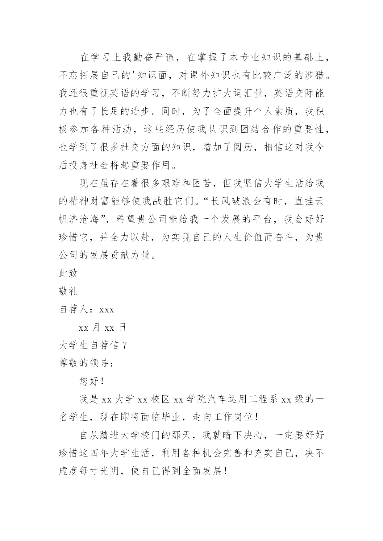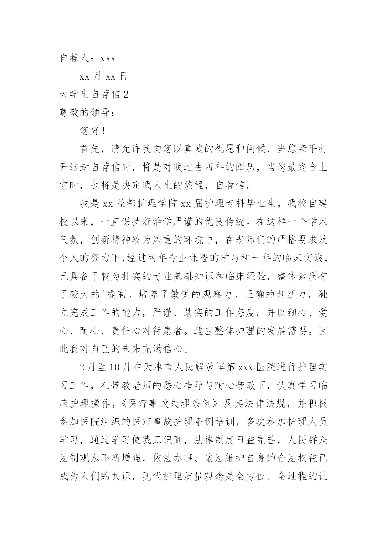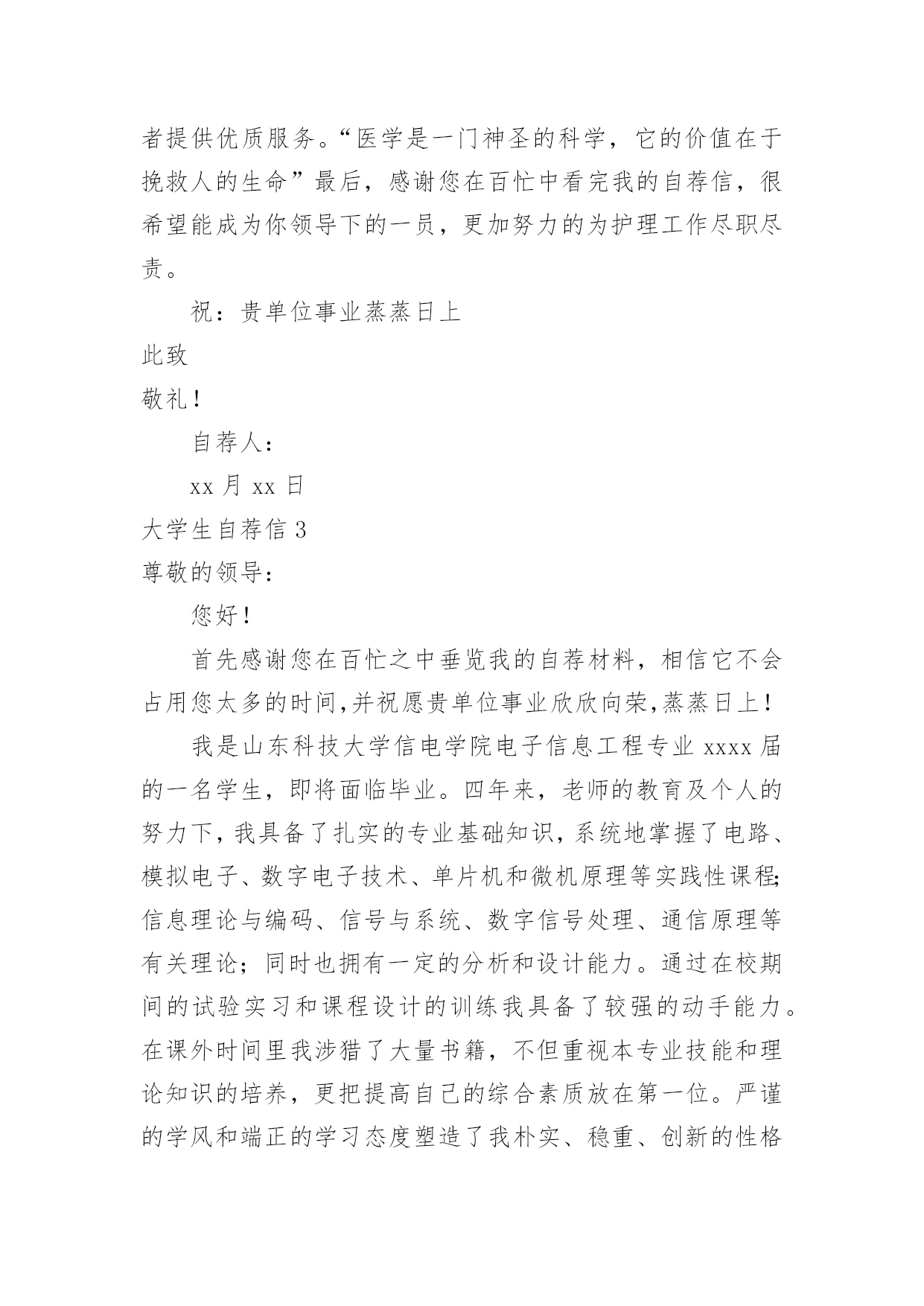 大学生自荐信大学生自荐信[优]在当今不断发展的世界,我们越来越经常使用自荐信,自荐信根据用途的不同也有着不同的类型。为了让您不再为写自荐信头疼,以下是小编为大家整理的大学生自荐信,希望能够帮助到大家。大学生自荐信1尊敬的领导:您好!首先,真诚地感谢你从百忙之中抽出时间来看我的自荐材料。我叫xxX,现年24岁,来自辽宁省,是xx有色金属工业学校毕业生。今天我是怀着平静而又激动的心情呈上这份自荐书的。之所以平静,我的知识和能力不会让你们失望,将无愧于您的选择;之所以激动,我决定以无悔的青春走到你们中间,实现共同的辉煌。在这里,我不能向您出示任何有权威人士的推荐书来为我谋得职业,也拿不出一摞摞的获奖证书作为我的筹码,而只能凭自己十几年来刻苦学习的结果和吃苦耐劳的本性,作为我的奠基石,如果说我有什么优点的话,那就是我年轻。在校期间,我认真学习,勤奋刻苦,努力做好本职工作,在学生会和班级工作中积累了大量的'工作经验,使自己具有良好的身体素质和心理素质。几年来我努力学习专业知识,从各门课程的基础知识出发,努力掌握其基本技能技巧,深钻细研,寻求其内在规律,并取得了良好的成绩,获过二等奖学金在学好专业知识的基础上,我还自学了电脑方面的一些知识,比如:电脑一般故障的排除、文字处理与排版等等。实践是检验真理的唯一标准。所以我利用暑假期间到xx电器公司实习电路的配线和故障排除,还安装了xx中学的语音室的电路等。课余时间我还要到图书馆为同学们服务,在图书馆和阅览室里我学到了很多各方面的知识。一个人只有把聪明才智应用到实际上工作中去,服务于社会,有利于社会,让效益和效率来证明自己,才能真正体现自己的自身价值!我坚信,路是一步一步走出来的。只有脚踏实地,努力工作,才能做出更出色的成绩!“器必试而先知其利钝,马必骑而后知其良驽。”我深信:只要我找到一个支点,就能撬起整个地球,只要给我一片土壤,我会用年轻的生命去耕耘,您不仅能看到我的成功,而且能够收获整个秋天。这就是我的自信和能力的承诺。剑鸣厘中,期之以声。热切期望我这拳拳寸草心、浓浓赤诚情能与您同呼吸、共命运、同发展、求进步。请给我一个机会,我会用行动来证明自己。非常盼望能与您进一步面谈,恭盼回音。最后,衷心祝愿贵单位事业发达、蒸蒸日上!此致敬礼!自荐人:xxxxx月xx日大学生自荐信2尊敬的领导:您好!首先,请允许我向您以真诚的祝愿和问候,当您亲手打开这封自荐信时,将是对我过去四年的阅历,当您最终合上它时,也将是决定我人生的旅程,自荐信。我是xx益都护理学院xx届护理专科毕业生,我校自建校以来,一直保持着治学严谨的优良传统。在这样一个学术气氛,创新精神较为浓重的环境中,在老师们的严格要求及个人的努力下,经过两年专业课程的学习和一年的临床实践,已具备了较为扎实的专业基础知识和临床经验,整体素质有了较大的`提高。培养了敏锐的观察力。正确的判断力,独立完成工作的能力,严谨、踏实的工作态度。并以细心、爱心、耐心、责任心对待患者。适应整体护理的发展需要。因此我对自己的未来充满信心。2月至10月在天津市人民解放军第xxx医院进行护理实习工作,在带教老师的悉心指导与耐心带教下,认真学习临床护理操作,《医疗事故处理条例》及其法律法规,并积极参加医院组织的医疗事故护理条例培训,多次参加护理人员学习,通过学习使我意识到,法律制度日益完善,人民群众法制观念不断增强,依法办事、依法维护自身的合法权益已成为人们的共识,现代护理质量观念是全方位、全过程的让病人满意,这是人们对医疗护理服务提出更高、更新的需求,因而丰富法律知识,增强安全保护意识,并且可以使护理人员懂法、用法、依法减少医疗事故的发生。理论水平与实践水平有了一定提高,在实习过程中,本人严格遵守医院规章制度,认真履行实习护士职责,严格要求自己,尊敬师长,团结同学,关心病人,不迟到,不早退,踏实工作,努力做到护理工作规范化,技能服务优质化,基础护理灵活化,爱心活动经常化,将理论与实践相结合,并做到理论学习有计划,有重点,护理工作有措施,有记录,实习期间,始终以”爱心,细心,耐心”为基本,努力做到”眼勤,手勤,脚勤,嘴勤”,想病人之所想,急病人之所急,全心全意为患都提供优质服务,树立了良好的医德医风。在各科室的实习工作中,能规范书写各类护理文书,及时完成交接班记录,并做好病人出入院评估护理和健康宣教,能做好各科常见病,多发病的护理工作,认真执行无菌操作规程,能做好术前准备指导,并完成术中,术后护理及观察,在工作中,发现问题能认真分析,及时解决,能熟练进行内,外,妇儿及重症监护等各项护理操作,严格执行三查七对,同时,不断丰富自己的业务知识,通过学习,对整体护理技术与病房管理知识有了更全面的认识和了解。通过半年多的实习,本人理论水平和实践水平都有所提高,在今后的工作中,本人将