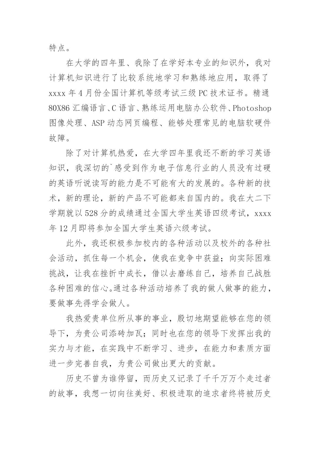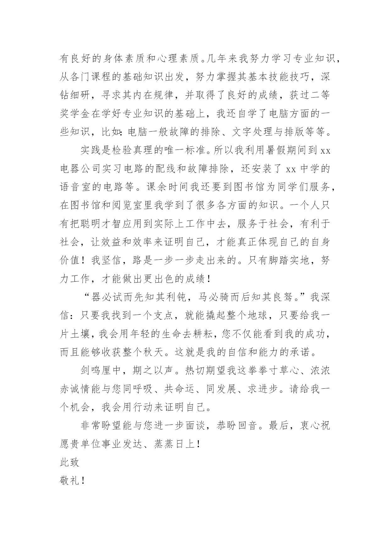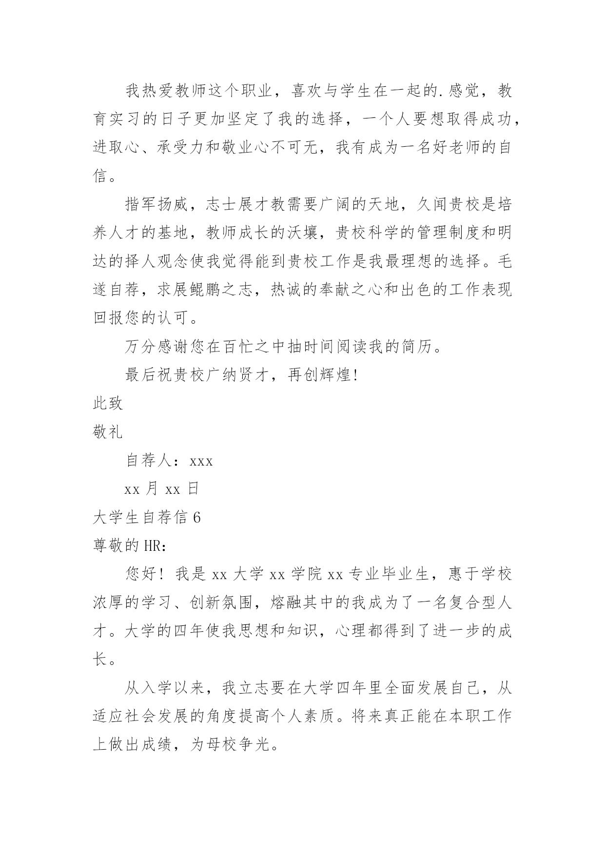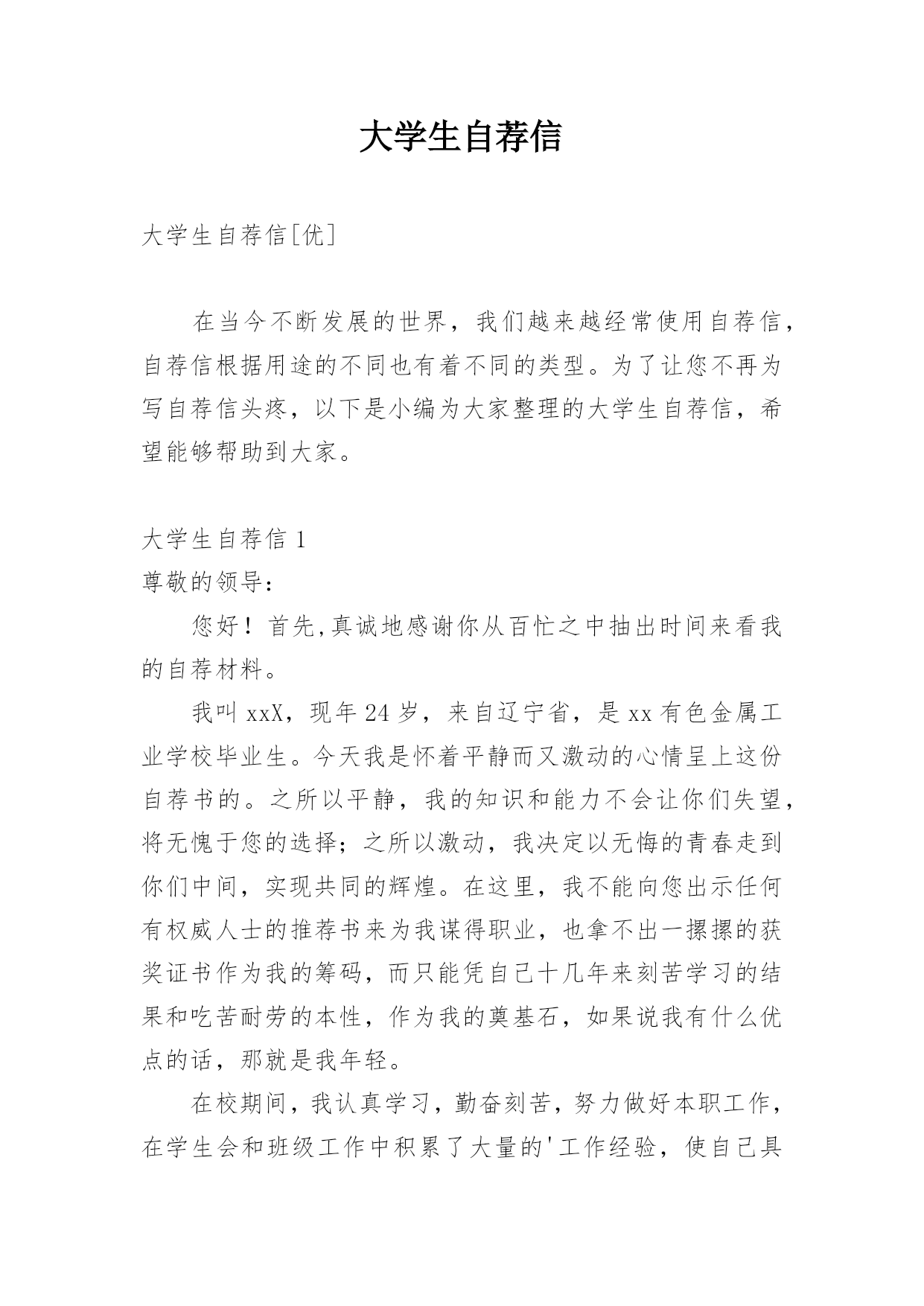 大学生自荐信大学生自荐信[优]在当今不断发展的世界,我们越来越经常使用自荐信,自荐信根据用途的不同也有着不同的类型。为了让您不再为写自荐信头疼,以下是小编为大家整理的大学生自荐信,希望能够帮助到大家。大学生自荐信1尊敬的领导:您好!首先,真诚地感谢你从百忙之中抽出时间来看我的自荐材料。我叫xxX,现年24岁,来自辽宁省,是xx有色金属工业学校毕业生。今天我是怀着平静而又激动的心情呈上这份自荐书的。之所以平静,我的知识和能力不会让你们失望,将无愧于您的选择;之所以激动,我决定以无悔的青春走到你们中间,实现共同的辉煌。在这里,我不能向您出示任何有权威人士的推荐书来为我谋得职业,也拿不出一摞摞的获奖证书作为我的筹码,而只能凭自己十几年来刻苦学习的结果和吃苦耐劳的本性,作为我的奠基石,如果说我有什么优点的话,那就是我年轻。在校期间,我认真学习,勤奋刻苦,努力做好本职工作,在学生会和班级工作中积累了大量的'工作经验,使自己具有良好的身体素质和心理素质。几年来我努力学习专业知识,从各门课程的基础知识出发,努力掌握其基本技能技巧,深钻细研,寻求其内在规律,并取得了良好的成绩,获过二等奖学金在学好专业知识的基础上,我还自学了电脑方面的一些知识,比如:电脑一般故障的排除、文字处理与排版等等。实践是检验真理的唯一标准。所以我利用暑假期间到xx电器公司实习电路的配线和故障排除,还安装了xx中学的语音室的电路等。课余时间我还要到图书馆为同学们服务,在图书馆和阅览室里我学到了很多各方面的知识。一个人只有把聪明才智应用到实际上工作中去,服务于社会,有利于社会,让效益和效率来证明自己,才能真正体现自己的自身价值!我坚信,路是一步一步走出来的。只有脚踏实地,努力工作,才能做出更出色的成绩!“器必试而先知其利钝,马必骑而后知其良驽。”我深信:只要我找到一个支点,就能撬起整个地球,只要给我一片土壤,我会用年轻的生命去耕耘,您不仅能看到我的成功,而且能够收获整个秋天。这就是我的自信和能力的承诺。剑鸣厘中,期之以声。热切期望我这拳拳寸草心、浓浓赤诚情能与您同呼吸、共命运、同发展、求进步。请给我一个机会,我会用行动来证明自己。非常盼望能与您进一步面谈,恭盼回音。最后,衷心祝愿贵单位事业发达、蒸蒸日上!此致敬礼!自荐人:xxxxx月xx日大学生自荐信2尊敬的领导:您好!首先,请允许我向您以真诚的祝愿和问候,当您亲手打开这封自荐信时,将是对我过去四年的阅历,当您最终合上它时,也将是决定我人生的旅程,自荐信。我是xx益都护理学院xx届护理专科毕业生,我校自建校以来,一直保持着治学严谨的优良传统。在这样一个学术气氛,创新精神较为浓重的环境中,在老师们的严格要求及个人的努力下,经过两年专业课程的学习和一年的临床实践,已具备了较为扎实的专业基础知识和临床经验,整体素质有了较大的`提高。培养了敏锐的观察力。正确的判断力,独立完成工作的能力,严谨、踏实的工作态度。并以细心、爱心、耐心、责任心对待患者。适应整体护理的发展需要。因此我对自己的未来充满信心。2月至10月在天津市人民解放军第xxx医院进行护理实习工作,在带教老师的悉心指导与耐心带教下,认真学习临床护理操作,《医疗事故处理条例》及其法律法规,并积极参加医院组织的医疗事故护理条例培训,多次参加护理人员学习,通过学习使我意识到,法律制度日益完善,人民群众法制观念不断增强,依法办事、依法维护自身的合法权益已成为人们的共识,现代护理质量观念是全方位、全过程的让病人满意,这是人们对医疗护理服务提出更高、更新的需求,因而丰富法律知识,增强安全保护意识,并且可以使护理人员懂法、用法、依法减少医疗事故的发生。理论水平与实践水平有了一定提高,在实习过程中,本人严格遵守医院规章制度,认真履行实习护士职责,严格要求自己,尊敬师长,团结同学,关心病人,不迟到,不早退,踏实工作,努力做到护理工作规范化,技能服务优质化,基础护理灵活化,爱心活动经常化,将理论与实践相结合,并做到理论学习有计划,有重点,护理工作有措施,有记录,实习期间,始终以”爱心,细心,耐心”为基本,努力做到”眼勤,手勤,脚勤,嘴勤”,想病人之所想,急病人之所急,全心全意为患都提供优质服务,树立了良好的医德医风。在各科室的实习工作中,能规范书写各类护理文书,及时完成交接班记录,并做好病人出入院评估护理和健康宣教,能做好各科常见病,多发病的护理工作,认真执行无菌操作规程,能做好术前准备指导,并完成术中,术后护理及观察,在工作中,发现问题能认真分析,及时解决,能熟练进行内,外,妇儿及重症监护等各项护理操作,严格执行三查七对,同时,不断丰富自己的业务知识,通过学习,对整体护理技术与病房管理知识有了更全面的认识和了解。通过半年多的实习,本人理论水平和实践水平都有所提高,在今后的工作中,本人将
