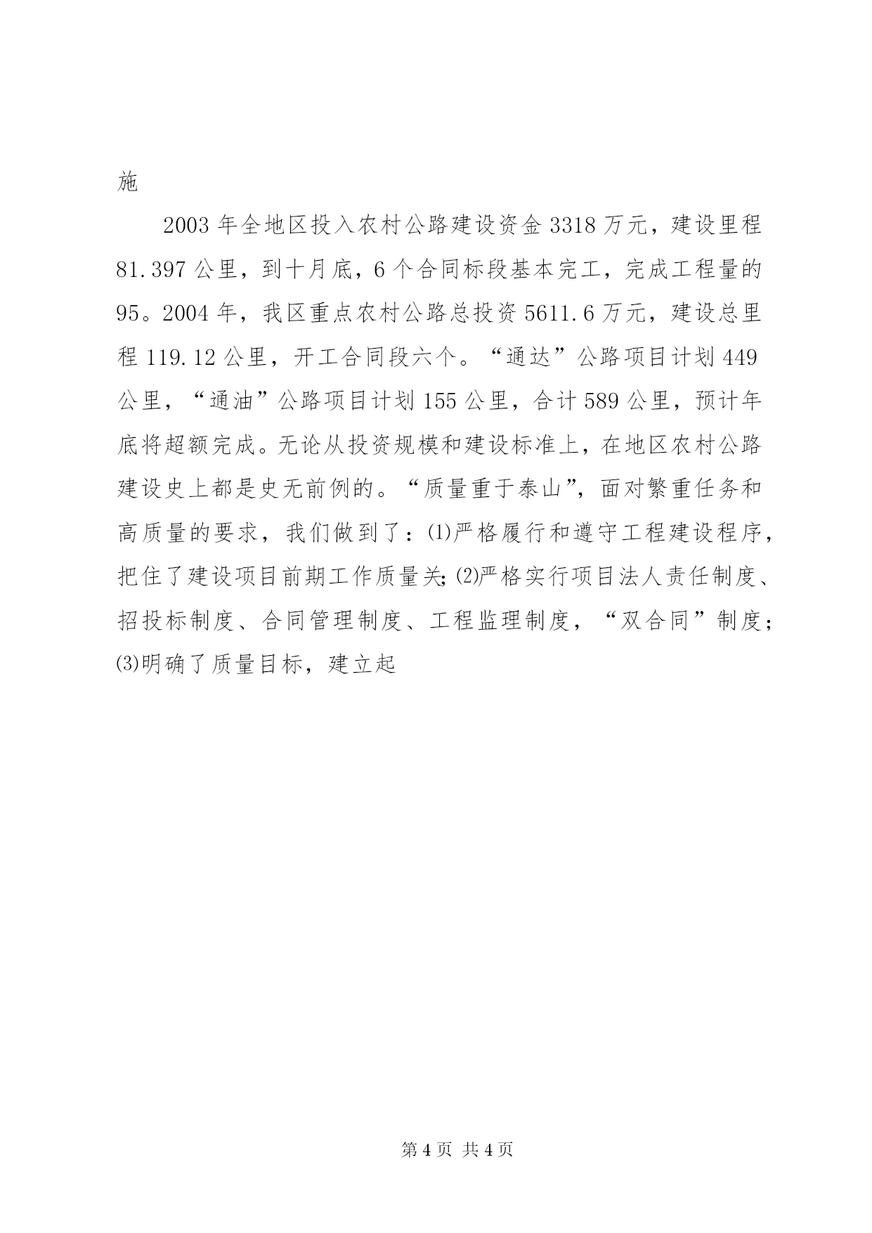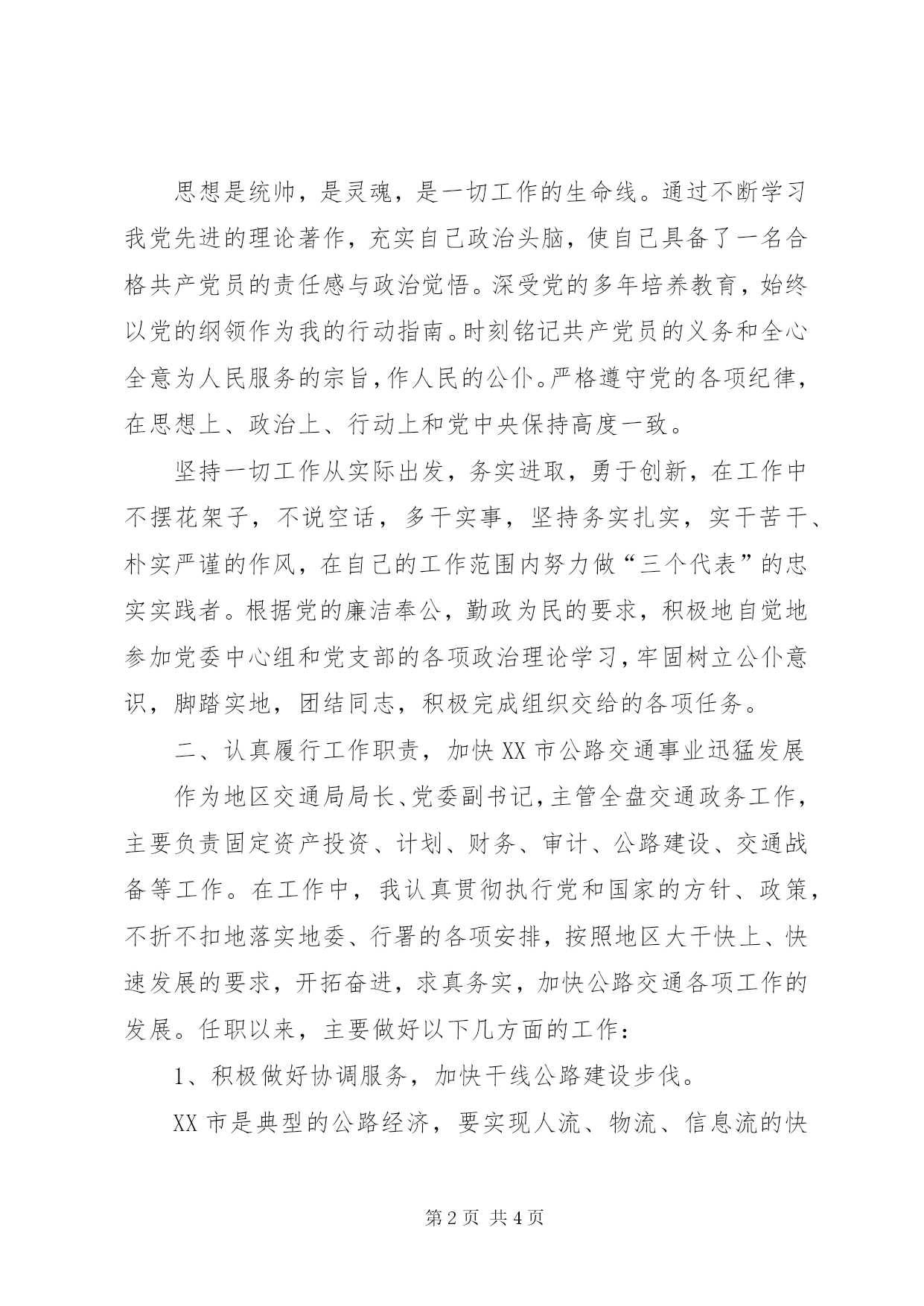 第PAGE\*Arabic\*MERGEFORMAT4页共NUMPAGES\*MERGEFORMAT4页交通局局长述职报告本人任职以来,在马列主义、毛泽东思想、邓小平理论和“三个代表”重要思想的指引下,以只争朝夕的精神努力工作,恪尽职守,勤勉自立,为XX市交通事业的发展作出了自己的努力。特别是这两年自治区对农村公路建设投资逐年成倍增加,面对千载难逢的历史机遇和繁重的公路建设任务,作为地区交通局局长,自己深感肩负的责任重大。几年来,在地委行署的正确领导下,自己以发展地区交通事业、促进地区经济发展为已任,团结交通局领导班子全体成员,积极与有关部门协调配合,充分调动广大干部的积极性、创造性,抢抓机遇,开拓奋进,以强烈的责任感和使命感投身于地区交通事业的发展。通过艰苦付出和不懈努力,各项工作取得了显著的成效。农村公路建设任务每年都能在保证质量的前提下足额完成。并受到自治区交通厅通报表扬。公路规划工作在全疆交通系统十五个地州市中名列榜首,创建文明行业、纠风工作分别在全疆交通系统进行经验交流,运输市场秩序进一步规范,安全生产工作深入扎实地开展,交通工作呈现出良好的发展局面。取得成绩的同时,当然也存在一些不足。下面就任职以来所做的主要工作作以下总结。一、政治思想上始终保持与党一致,工作作风保持朴实、严谨。思想是统帅,是灵魂,是一切工作的生命线。通过不断学习我党先进的理论著作,充实自己政治头脑,使自己具备了一名合格共产党员的责任感与政治觉悟。深受党的多年培养教育,始终以党的纲领作为我的行动指南。时刻铭记共产党员的义务和全心全意为人民服务的宗旨,作人民的公仆。严格遵守党的各项纪律,在思想上、政治上、行动上和党中央保持高度一致。坚持一切工作从实际出发,务实进取,勇于创新,在工作中不摆花架子,不说空话,多干实事,坚持务实扎实,实干苦干、朴实严谨的作风,在自己的工作范围内努力做“三个代表”的忠实实践者。根据党的廉洁奉公,勤政为民的要求,积极地自觉地参加党委中心组和党支部的各项政治理论学习,牢固树立公仆意识,脚踏实地,团结同志,积极完成组织交给的各项任务。二、认真履行工作职责,加快XX市公路交通事业迅猛发展作为地区交通局局长、党委副书记,主管全盘交通政务工作,主要负责固定资产投资、计划、财务、审计、公路建设、交通战备等工作。在工作中,我认真贯彻执行党和国家的方针、政策,不折不扣地落实地委、行署的各项安排,按照地区大干快上、快速发展的要求,开拓奋进,求真务实,加快公路交通各项工作的发展。任职以来,主要做好以下几方面的工作:1、积极做好协调服务,加快干线公路建设步伐。XX市是典型的公路经济,要实现人流、物流、信息流的快速发展,必须加大公路交通基础设施建设步伐,以公路建设的快速发展,带动相关产业的发展,拉动地区经济的快速增长。在新疆公路交通建设大投入、大建设、大发展时期,作为交通局局长,自己始终把加快地区公路交通基础设施建设、重点农村公路建设、“通达”和“通油”工程建设作为第一要务,抢抓机遇,千方百计争取项目和公路建设资金。在地委、行署的大力支持和交通厅的关怀下,通过我们的不懈努力,2002年度,我们争取到了5亿多元的公路基础设施建设资金,其中:地区国省道干线投资4.864亿元,新建、改建、改造道路400多公里;农村道路投资1430万元,新建、改建道路60多公里;地方城镇道路建设资金2626万元,累计修建11公里;客运站点投资312万元。2003年我区共安排国道、省道、干线公路建设项目12个,公路建设总投资近7亿元,建设里程1000多公里。在落实项目资金后,由于施工项目多,施工条件不一,为确保工程顺利进行,我们加强与各县(市)政府的协调与沟通,在认真落实地区出台的各项优惠政策的同时,积极主动与施工单位加强联系,及时了解施工进展情况,随时解决工作中遇到问题,做到哪里出现问题我们的工作就开展到哪里,通过大量艰苦细致的工作,为地区公路建设创造了更加宽松的施工环境,为工程项目的顺利实施提供了有力保证。2、严格规范管理,把好质量关,确保农村公路建设顺利实施2003年全地区投入农村公路建设资金3318万元,建设里程81.397公里,到十月底,6个合同标段基本完工,完成工程量的95。2004年,我区重点农村公路总投资5611.6万元,建设总里程119.12公里,开工合同段六个。“通达”公路项目计划449公里,“通油”公路项目计划155公里,合计589公里,预计年底将超额完成。无论从投资规模和建设标准上,在地区农村公路建设史上都是史无前例的。“质量重于泰山”,面对繁重任务和高质量的要求,我们做到了:⑴严格履行和遵守工程建设程序,把住了建设项目前期工作质量关;⑵严格实行项目法人责任制度、招投标制度、合同管理制度、工程监理制度,“双合同”制度;⑶明确了
