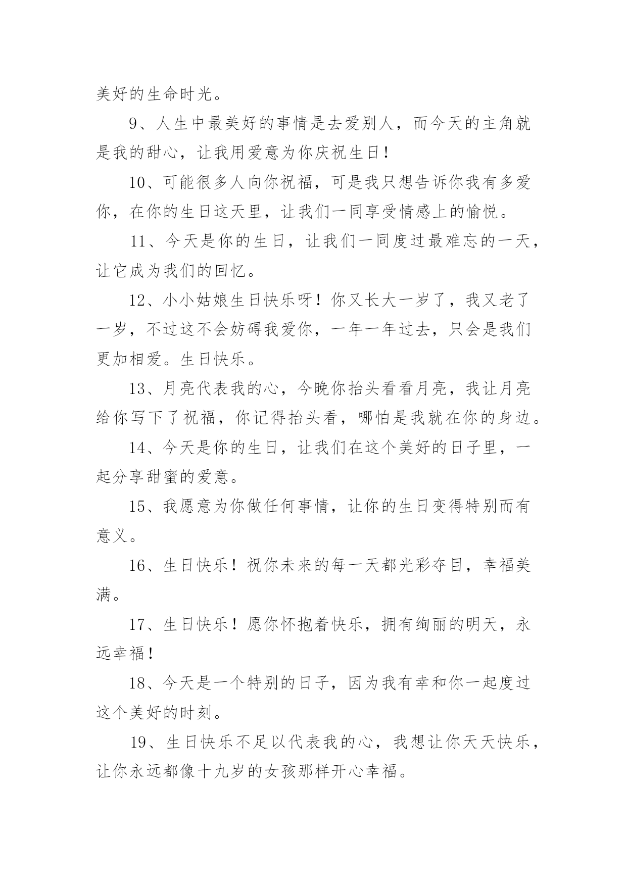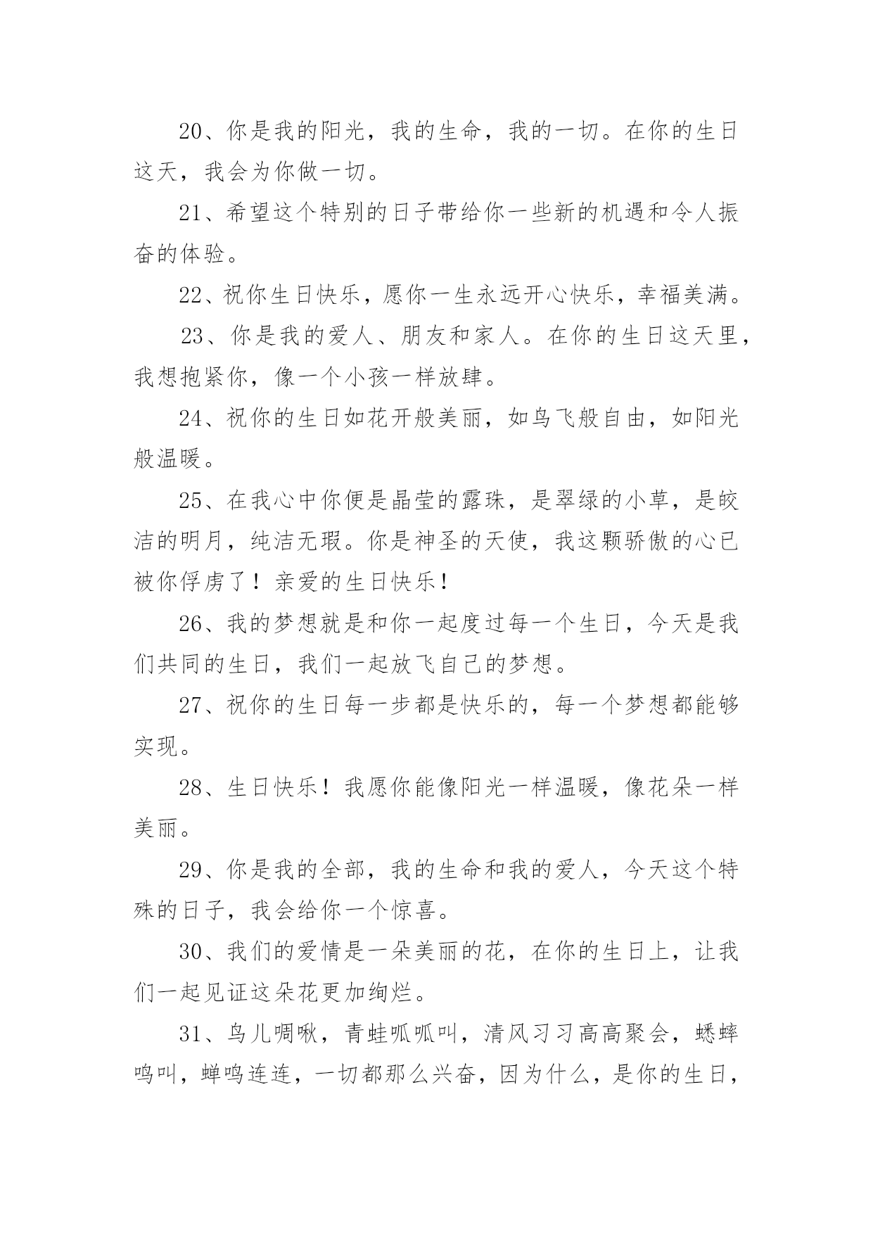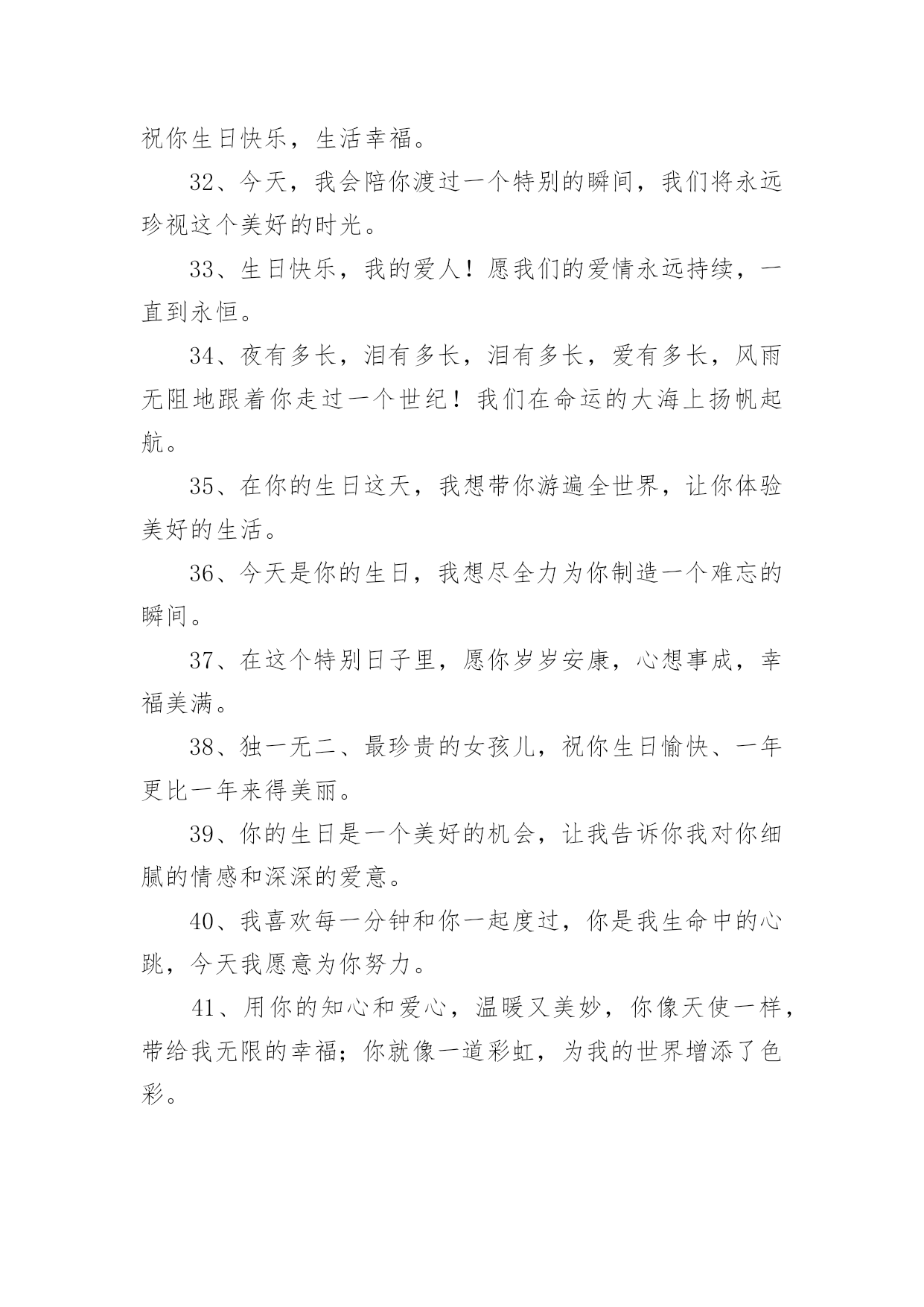 最新男女友过生日文案最新男女友过生日文案在日常学习、工作和生活中,大家都看到过文案吧,文案具有在理智上启发人们,在情感上打动人们的作用。还在苦苦寻找优秀经典的文案吗?下面是小编收集整理的最新男女友过生日文案,仅供参考,欢迎大家阅读。1、你是我生命中的阳光,让我始终保持微笑,因为我知道你珍惜我。生日快乐,爱人。2、今天,让我们拥抱幸福,享受彼此的陪伴,庆祝你的生日。3、爱,但它的甜蜜,是美丽的;只有它的欢乐,才能显示它的坚强;庄重就是庄重;只有它的精致,它才显得神秘。4、长夜漫漫,因为有人思念;摊开对面,因为有人不见了;孤独无眠,因为有人在数羊,爱两个字:晚安。5、今天是你的生日,让我们共同度过一个最美好的日子,留下最美好的记忆。6、希望这个生日会给你带来更多的快乐和幸福,让我们共同庆祝这个美好的日子。7、这是我第一次陪你过生日,希望这一天对你来说会有特别的意义。8、我希望我们能够永远在一起,与时俱进,一起度过美好的生命时光。9、人生中最美好的事情是去爱别人,而今天的主角就是我的甜心,让我用爱意为你庆祝生日!10、可能很多人向你祝福,可是我只想告诉你我有多爱你,在你的生日这天里,让我们一同享受情感上的愉悦。11、今天是你的生日,让我们一同度过最难忘的一天,让它成为我们的回忆。12、小小姑娘生日快乐呀!你又长大一岁了,我又老了一岁,不过这不会妨碍我爱你,一年一年过去,只会是我们更加相爱。生日快乐。13、月亮代表我的心,今晚你抬头看看月亮,我让月亮给你写下了祝福,你记得抬头看,哪怕是我就在你的身边。14、今天是你的生日,让我们在这个美好的日子里,一起分享甜蜜的爱意。15、我愿意为你做任何事情,让你的生日变得特别而有意义。16、生日快乐!祝你未来的每一天都光彩夺目,幸福美满。17、生日快乐!愿你怀抱着快乐,拥有绚丽的明天,永远幸福!18、今天是一个特别的日子,因为我有幸和你一起度过这个美好的时刻。19、生日快乐不足以代表我的心,我想让你天天快乐,让你永远都像十九岁的女孩那样开心幸福。20、你是我的阳光,我的生命,我的一切。在你的生日这天,我会为你做一切。21、希望这个特别的日子带给你一些新的机遇和令人振奋的体验。22、祝你生日快乐,愿你一生永远开心快乐,幸福美满。23、你是我的爱人、朋友和家人。在你的生日这天里,我想抱紧你,像一个小孩一样放肆。24、祝你的生日如花开般美丽,如鸟飞般自由,如阳光般温暖。25、在我心中你便是晶莹的露珠,是翠绿的小草,是皎洁的明月,纯洁无瑕。你是神圣的天使,我这颗骄傲的心已被你俘虏了!亲爱的生日快乐!26、我的梦想就是和你一起度过每一个生日,今天是我们共同的生日,我们一起放飞自己的梦想。27、祝你的生日每一步都是快乐的,每一个梦想都能够实现。28、生日快乐!我愿你能像阳光一样温暖,像花朵一样美丽。29、你是我的全部,我的生命和我的爱人,今天这个特殊的日子,我会给你一个惊喜。30、我们的爱情是一朵美丽的花,在你的生日上,让我们一起见证这朵花更加绚烂。31、鸟儿啁啾,青蛙呱呱叫,清风习习高高聚会,蟋蟀鸣叫,蝉鸣连连,一切都那么兴奋,因为什么,是你的生日,祝你生日快乐,生活幸福。32、今天,我会陪你渡过一个特别的瞬间,我们将永远珍视这个美好的时光。33、生日快乐,我的爱人!愿我们的爱情永远持续,一直到永恒。34、夜有多长,泪有多长,泪有多长,爱有多长,风雨无阻地跟着你走过一个世纪!我们在命运的大海上扬帆起航。35、在你的生日这天,我想带你游遍全世界,让你体验美好的生活。36、今天是你的生日,我想尽全力为你制造一个难忘的瞬间。37、在这个特别日子里,愿你岁岁安康,心想事成,幸福美满。38、独一无二、最珍贵的女孩儿,祝你生日愉快、一年更比一年来得美丽。39、你的生日是一个美好的机会,让我告诉你我对你细腻的情感和深深的爱意。40、我喜欢每一分钟和你一起度过,你是我生命中的心跳,今天我愿意为你努力。41、用你的知心和爱心,温暖又美妙,你像天使一样,带给我无限的幸福;你就像一道彩虹,为我的世界增添了色彩。