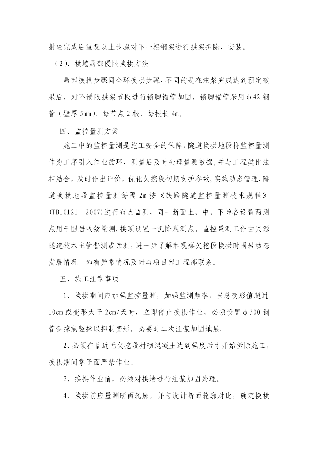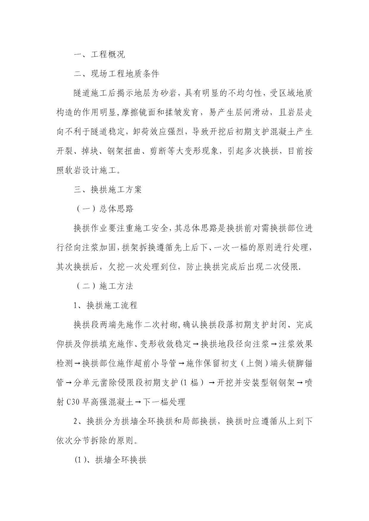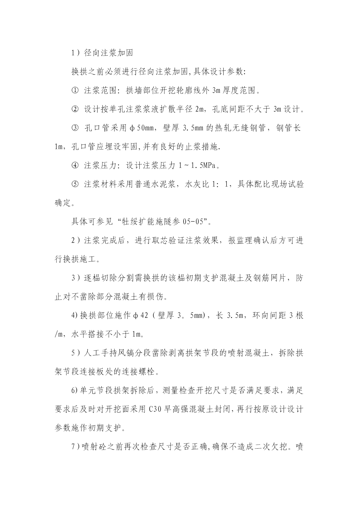 隧道施工换拱方案实用文档(实用文档,可以直接使用,可编辑优秀版资料,欢迎下载)表A。0.1换拱方案报审表工程项目名称:施工合同段:致(项目监理机构):我单位根据施工合同的有关规定已编制完成工程的换拱施工(方案),并经我单位技术负责人审查批准,请予以审查。附:换拱施工方案。施工单位(章):项目负责人:日期:年月日专业监理工程师意见:专业监理工程师:日期:年月日项目监理机构意见:项目监理机构(章):总监理工程师:日期:年月日建设单位意见:建设单位(章):负责人:日期:年月日换拱施工方案一、工程概况二、现场工程地质条件隧道施工后揭示地层为砂岩,具有明显的不均匀性,受区域地质构造的作用明显,摩擦镜面和揉皱发育,易产生层间滑动,且岩层走向不利于隧道稳定,卸荷效应强烈,导致开挖后初期支护混凝土产生开裂、掉块、钢架扭曲、剪断等大变形现象,引起多次换拱,目前按照软岩设计施工。三、换拱施工方案(一)总体思路换拱作业要注重施工安全,其总体思路是换拱前对需换拱部位进行径向注浆加固,拱架拆换遵循先上后下、一次一榀的原则进行处理,其次换拱后,欠挖一次处理到位,防止换拱完成后出现二次侵限.(二)施工方法1、换拱施工流程换拱段两端先施作二次衬砌,确认换拱段落初期支护封闭、完成仰拱及仰拱填充施作、变形收敛稳定→换拱地段径向注浆→注浆效果检测→换拱部位施作超前小导管→施作保留初支(上侧)端头锁脚锚管→分单元凿除侵限段初期支护(1榀)→开挖并安装型钢钢架→喷射C30早高强混凝土→下一榀处理2、换拱分为拱墙全环换拱和局部换拱,换拱时应遵循从上到下依次分节拆除的原则。(1)、拱墙全环换拱1)径向注浆加固换拱之前必须进行径向注浆加固,具体设计参数:①注浆范围:拱墙部位开挖轮廓线外3m厚度范围。②设计按单孔注浆浆液扩散半径2m,孔底间距不大于3m设计。③孔口管采用φ50mm,壁厚3.5mm的热轧无缝钢管,钢管长1m,孔口管应埋设牢固,并有良好的止浆措施.④注浆压力:设计注浆压力1~1.5MPa。⑤注浆材料采用普通水泥浆,水灰比1:1,具体配比现场试验确定。具体可参见“牡绥扩能施隧参05-05”。2)注浆完成后,进行取芯验证注浆效果,报监理确认后方可进行换拱施工。3)逐榀切除分割需换拱的该榀初期支护混凝土及钢筋网片,防止对不凿除部分混凝土有损伤。4)换拱部位施作φ42(壁厚3。5mm),长3.5m,环向间距3根/m,水平搭接不小于1m。5)人工手持风镐分段凿除剥离拱架节段的喷射混凝土,拆除拱架节段连接板处的连接螺栓。6)单元节段拱架拆除后,测量检查开挖尺寸是否满足要求,满足要求后及时对开挖面采用C30早高强混凝土封闭,再行按原设计设计参数施作初期支护。7)喷射砼之前再次检查尺寸是否正确,确保不造成二次欠挖。喷射砼完成后重复以上步骤对下一榀钢架进行拱架拆除、安装。(2)、拱墙局部侵限换拱方法局部换拱步骤同全环换拱步骤,不同的是在注浆完成达到预定效果后,对不侵限拱架节段进行锁脚锚管加固,锁脚锚管采用φ42钢管(壁厚5mm),每节点2根,每根长4m。四、监控量测方案施工中的监控量测是施工安全的保障,隧道换拱地段将监控量测作为工序引入作业循环,测量后及时处理量测数据,并与工程类比法相结合,及时作出评价,优化欠挖段初期支护参数,实施动态管理.隧道换拱地段监控量测每隔2m按《铁路隧道监控量测技术规程》(TB10121—2007)进行布点监测,同一断面上、中、下导各设置两测点用于围岩收敛量测,拱顶设置一沉降观测点。监控量测工作由兴源隧道技术主管督测或亲测,进一步了解和观察欠挖段换拱时围岩动态发展情况。如有异常情况及时与项目部工程部联系。五、施工注意事项1、换拱期间应加强监控量测,加强监测频率,当总变形值超过10cm或变形大于2cm/天时,立即停止换拱作业,必须设置φ300钢管斜撑或竖撑以抑制变形,必要时二次注浆加固地层.2、必须在临近无欠挖段衬砌混凝土达到强度后才开始拆除施工,换拱期间掌子面严禁作业。3、换拱作业前,必须对拱墙进行注浆加固处理。4、换拱前应量测断面轮廓,并与设计断面轮廓对比,确定换拱范围,严禁因操作失误造成误换拱或二次换拱。5、换拱前应核实监控量测,当沉降及净空收敛稳定后方可进行换拱作业.6、换拱前应先进行隧底开挖、仰拱及填充施作。初期支护封闭成环,仰拱及填充施作形成对隧底周边岩体的反压。7、拆除拱架时要随时注意围岩情况,如发现围岩破碎及掉块现象,应立即停止拆除,用喷射混凝土封闭拆除面后再次进行径向注浆加固,以稳固围岩。8、拆换拱架时,拆除完一个单元或一榀钢拱架后,应立即安装新的拱架上去,待全环初期支护完成后,才可进行下一榀钢拱架的拆除置换工作。