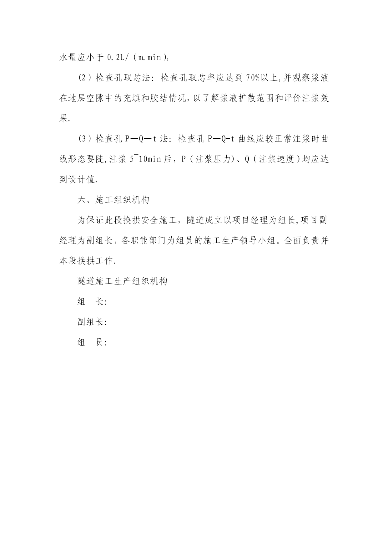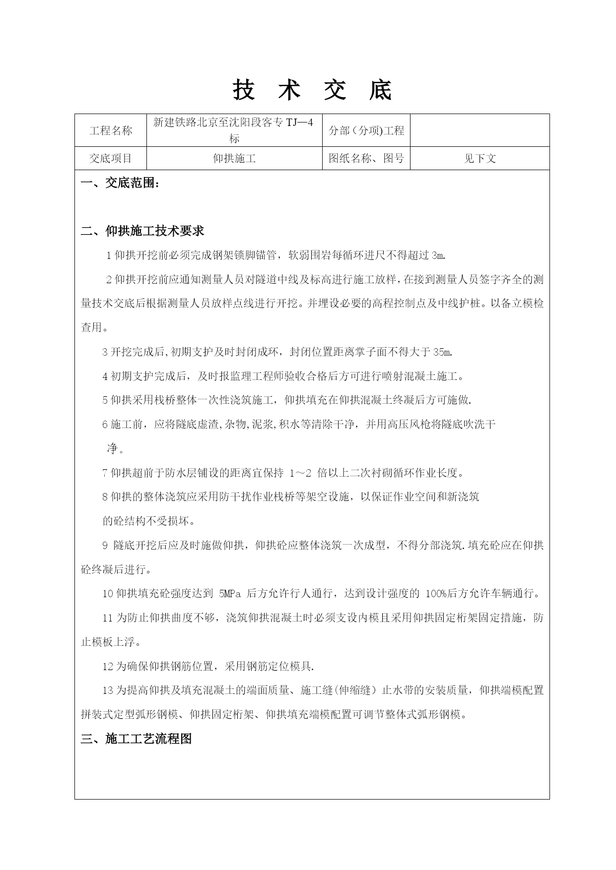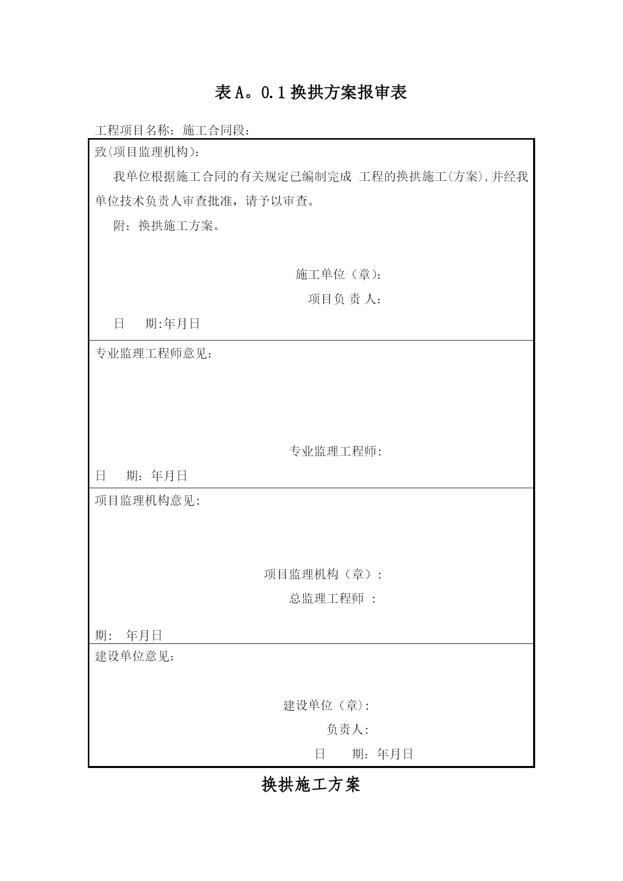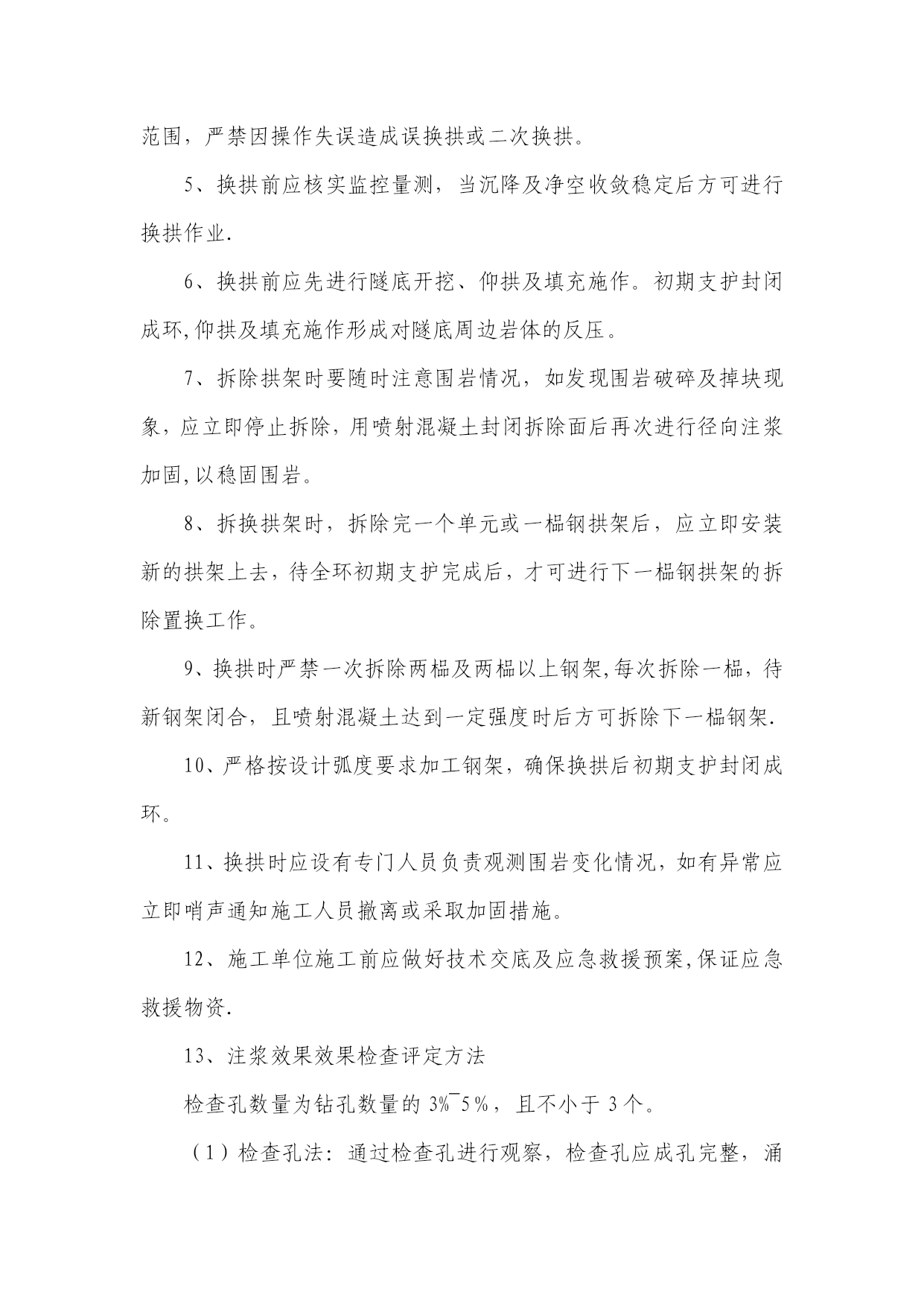 隧道施工换拱方案实用文档(实用文档,可以直接使用,可编辑优秀版资料,欢迎下载)表A。0.1换拱方案报审表工程项目名称:施工合同段:致(项目监理机构):我单位根据施工合同的有关规定已编制完成工程的换拱施工(方案),并经我单位技术负责人审查批准,请予以审查。附:换拱施工方案。施工单位(章):项目负责人:日期:年月日专业监理工程师意见:专业监理工程师:日期:年月日项目监理机构意见:项目监理机构(章):总监理工程师:日期:年月日建设单位意见:建设单位(章):负责人:日期:年月日换拱施工方案一、工程概况二、现场工程地质条件隧道施工后揭示地层为砂岩,具有明显的不均匀性,受区域地质构造的作用明显,摩擦镜面和揉皱发育,易产生层间滑动,且岩层走向不利于隧道稳定,卸荷效应强烈,导致开挖后初期支护混凝土产生开裂、掉块、钢架扭曲、剪断等大变形现象,引起多次换拱,目前按照软岩设计施工。三、换拱施工方案(一)总体思路换拱作业要注重施工安全,其总体思路是换拱前对需换拱部位进行径向注浆加固,拱架拆换遵循先上后下、一次一榀的原则进行处理,其次换拱后,欠挖一次处理到位,防止换拱完成后出现二次侵限.(二)施工方法1、换拱施工流程换拱段两端先施作二次衬砌,确认换拱段落初期支护封闭、完成仰拱及仰拱填充施作、变形收敛稳定→换拱地段径向注浆→注浆效果检测→换拱部位施作超前小导管→施作保留初支(上侧)端头锁脚锚管→分单元凿除侵限段初期支护(1榀)→开挖并安装型钢钢架→喷射C30早高强混凝土→下一榀处理2、换拱分为拱墙全环换拱和局部换拱,换拱时应遵循从上到下依次分节拆除的原则。(1)、拱墙全环换拱1)径向注浆加固换拱之前必须进行径向注浆加固,具体设计参数:①注浆范围:拱墙部位开挖轮廓线外3m厚度范围。②设计按单孔注浆浆液扩散半径2m,孔底间距不大于3m设计。③孔口管采用φ50mm,壁厚3.5mm的热轧无缝钢管,钢管长1m,孔口管应埋设牢固,并有良好的止浆措施.④注浆压力:设计注浆压力1~1.5MPa。⑤注浆材料采用普通水泥浆,水灰比1:1,具体配比现场试验确定。具体可参见“牡绥扩能施隧参05-05”。2)注浆完成后,进行取芯验证注浆效果,报监理确认后方可进行换拱施工。3)逐榀切除分割需换拱的该榀初期支护混凝土及钢筋网片,防止对不凿除部分混凝土有损伤。4)换拱部位施作φ42(壁厚3。5mm),长3.5m,环向间距3根/m,水平搭接不小于1m。5)人工手持风镐分段凿除剥离拱架节段的喷射混凝土,拆除拱架节段连接板处的连接螺栓。6)单元节段拱架拆除后,测量检查开挖尺寸是否满足要求,满足要求后及时对开挖面采用C30早高强混凝土封闭,再行按原设计设计参数施作初期支护。7)喷射砼之前再次检查尺寸是否正确,确保不造成二次欠挖。喷射砼完成后重复以上步骤对下一榀钢架进行拱架拆除、安装。(2)、拱墙局部侵限换拱方法局部换拱步骤同全环换拱步骤,不同的是在注浆完成达到预定效果后,对不侵限拱架节段进行锁脚锚管加固,锁脚锚管采用φ42钢管(壁厚5mm),每节点2根,每根长4m。四、监控量测方案施工中的监控量测是施工安全的保障,隧道换拱地段将监控量测作为工序引入作业循环,测量后及时处理量测数据,并与工程类比法相结合,及时作出评价,优化欠挖段初期支护参数,实施动态管理.隧道换拱地段监控量测每隔2m按《铁路隧道监控量测技术规程》(TB10121—2007)进行布点监测,同一断面上、中、下导各设置两测点用于围岩收敛量测,拱顶设置一沉降观测点。监控量测工作由兴源隧道技术主管督测或亲测,进一步了解和观察欠挖段换拱时围岩动态发展情况。如有异常情况及时与项目部工程部联系。五、施工注意事项1、换拱期间应加强监控量测,加强监测频率,当总变形值超过10cm或变形大于2cm/天时,立即停止换拱作业,必须设置φ300钢管斜撑或竖撑以抑制变形,必要时二次注浆加固地层.2、必须在临近无欠挖段衬砌混凝土达到强度后才开始拆除施工,换拱期间掌子面严禁作业。3、换拱作业前,必须对拱墙进行注浆加固处理。4、换拱前应量测断面轮廓,并与设计断面轮廓对比,确定换拱范围,严禁因操作失误造成误换拱或二次换拱。5、换拱前应核实监控量测,当沉降及净空收敛稳定后方可进行换拱作业.6、换拱前应先进行隧底开挖、仰拱及填充施作。初期支护封闭成环,仰拱及填充施作形成对隧底周边岩体的反压。7、拆除拱架时要随时注意围岩情况,如发现围岩破碎及掉块现象,应立即停止拆除,用喷射混凝土封闭拆除面后再次进行径向注浆加固,以稳固围岩。8、拆换拱架时,拆除完一个单元或一榀钢拱架后,应立即安装新的拱架上去,待全环初期支护完成后,才可进行下一榀钢拱架的拆除置换工作。