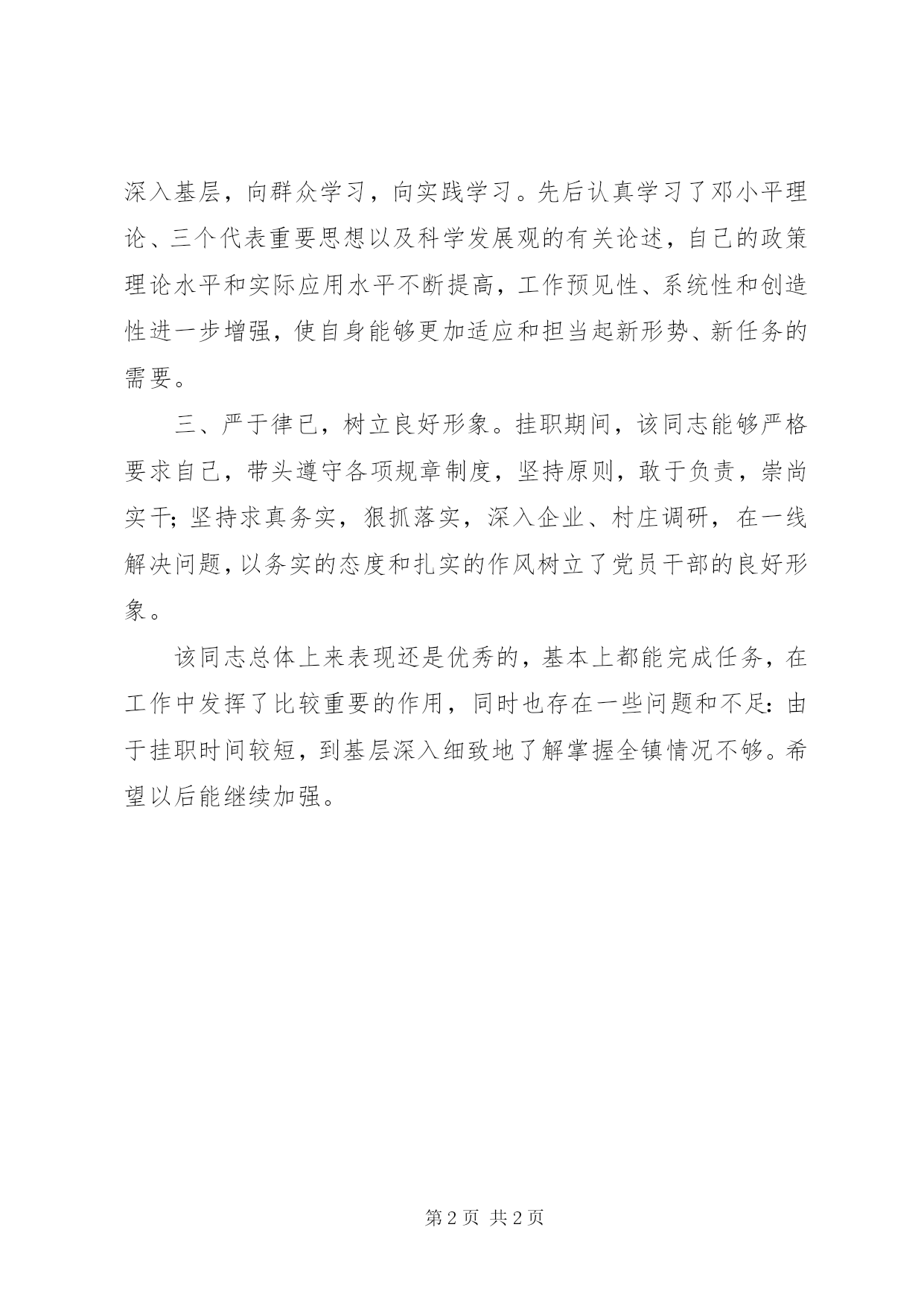第PAGE\*Arabic\*MERGEFORMAT2页共NUMPAGES\*MERGEFORMAT2页公务员乡镇挂职工作鉴定根据组织安排,领导同意,***同志协助**镇镇长抓农村工作和财政工作。在半年的时间里,该同志认真实践三个代表重要思想,坚持立党为公、执政为民,认真履行职责,扎实开展工作,始终保持了思想上的先进性,工作上的主动性、创造性和实效性,较好地完成了各项工作任务。下面是该同志的工作鉴定。一、真抓实干,创造性开展工作。挂职期间,该同志在尽快熟悉工作情况的基础上,坚持以改革的精神抓工作、促落实,以创新的思路抓重点、促全盘,分工的各项工作都取得了明显成效。一是林业建设迈出新步伐。突出荒山造林这个重点,通过采取强化宣传教育、加强管护、加大政策扶持力度等措施,提高了全镇造林绿化水平。二是平安**建设扎实推进。按照关口前移,重心下移,强化基层基础工作的要求,积极开展矛盾纠纷和信访隐患的排查调处,建立了排查、反馈、调处、回访四位一体的工作机制,保证了矛盾纠纷和信访隐患及时发现、超前化解,维护了社会稳定。三是财源建设富有成效。围绕构筑大财源体系,巩固壮大现有税源,培植后续税源,引进外来税源,健全社会综合治税网络,强化税收征管,增加了地方财政收入。二、加强学习,提高自身素质和工作能力。该同志坚持把学习作为提高自身素质和工作能力的重要途径。积极参加镇党委理论中心组学习和以讲促学活动,坚持利用业余时间自学,并注重深入基层,向群众学习,向实践学习。先后认真学习了邓小平理论、三个代表重要思想以及科学发展观的有关论述,自己的政策理论水平和实际应用水平不断提高,工作预见性、系统性和创造性进一步增强,使自身能够更加适应和担当起新形势、新任务的需要。三、严于律已,树立良好形象。挂职期间,该同志能够严格要求自己,带头遵守各项规章制度,坚持原则,敢于负责,崇尚实干;坚持求真务实,狠抓落实,深入企业、村庄调研,在一线解决问题,以务实的态度和扎实的作风树立了党员干部的良好形象。该同志总体上来表现还是优秀的,基本上都能完成任务,在工作中发挥了比较重要的作用,同时也存在一些问题和不足:由于挂职时间较短,到基层深入细致地了解掌握全镇情况不够。希望以后能继续加强。