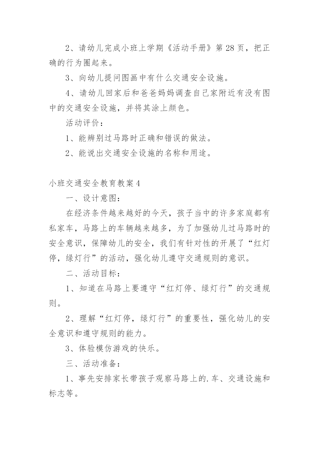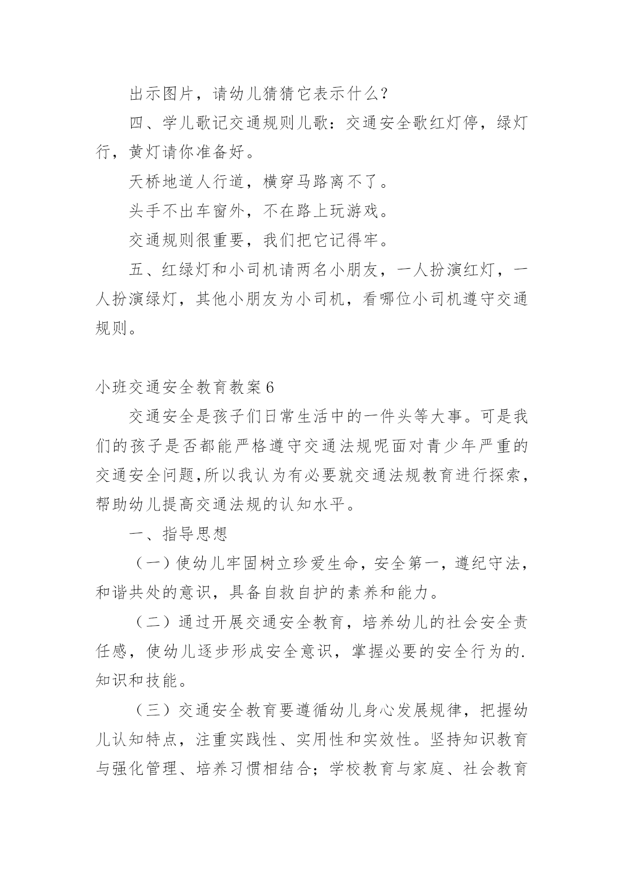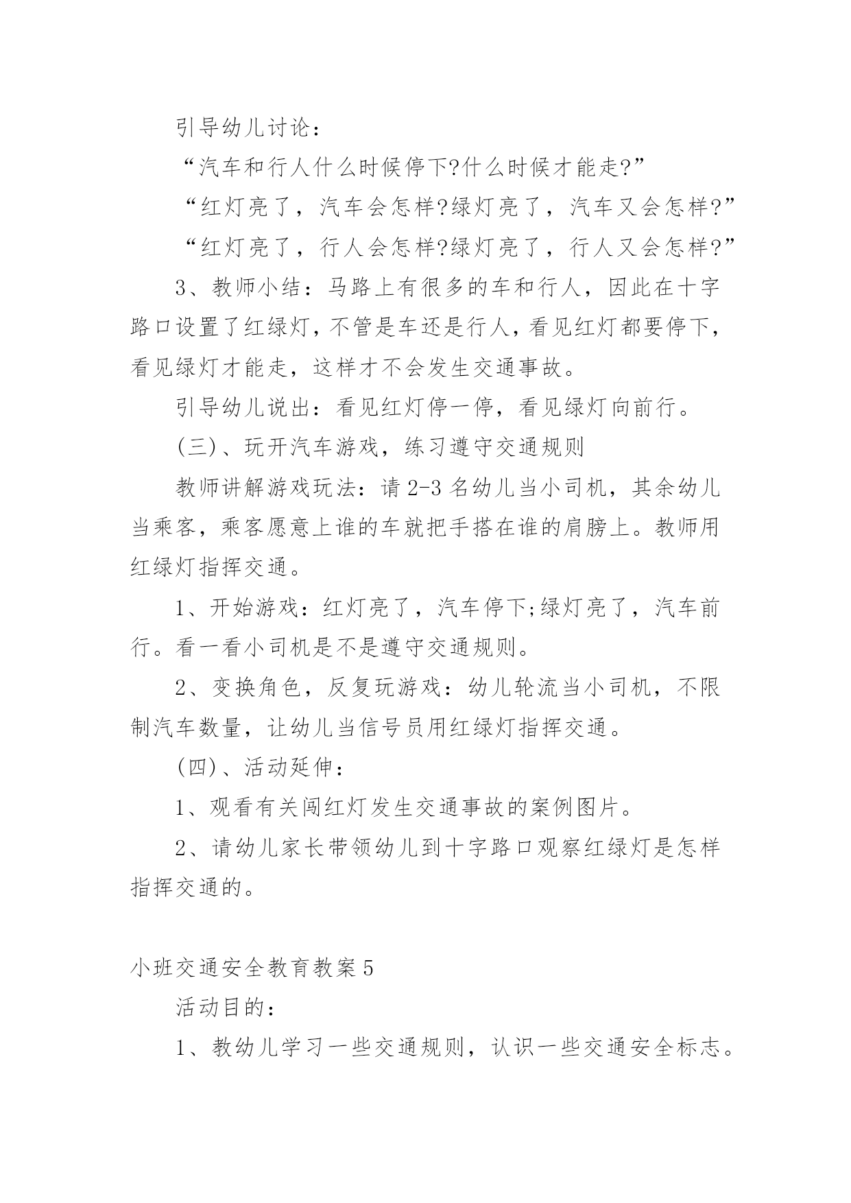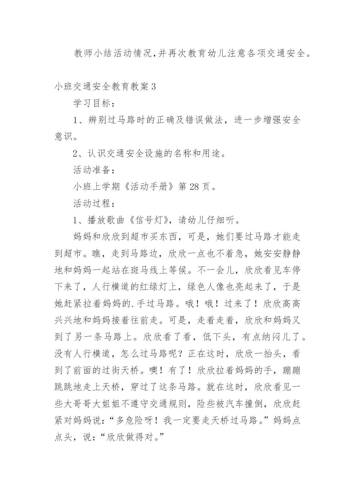 小班交通安全教育教案作为一名辛苦耕耘的教育工作者,可能需要进行教案编写工作,借助教案可以提高教学质量,收到预期的教学效果。那么什么样的教案才是好的呢?下面是小编帮大家整理的小班交通安全教育教案,欢迎阅读,希望大家能够喜欢。小班交通安全教育教案1【活动设想】交通工具是现代人社会生活中不可缺少的一个部分,这些交通工具给我们的生活带来了便利,也会给我们人身安全带来危害。于是对幼儿进行交通安全教育,成了一种必要的活动。为了让幼儿懂得遵守交通规则的重要性,增强自我保护意识,所以我选择孩子们生活中最常见和亲身体验过的交通工具“公交车”来设计本次活动,让幼儿了解交通工具与我们每一个人生活的关系,懂得乘车时应遵守交通规则。【活动目标】1、通过学习乘车小常识,增强幼儿的交通安全意识。2、激发幼儿主动关心别人,愿意做一名文明小乘客。3、在绘画和游戏活动中体验交通安全的重要性,从而自觉地遵守交通规则。结合辖区内的实际情况,选择乘坐安全性的车。【活动准备】教学图片、音乐《叭叭叭、汽车开来了》、A4白纸若干、油画棒每人一盒【活动过程】(一)放音乐带领幼儿玩“开汽车”的游戏,引出课题。——在音乐声中,幼儿与教师一起开汽车进入游戏场地。——“小朋友,刚才我们一起开着我们的小汽车来到了我们的活动室,那你们有没有和爸爸、妈妈乘坐过公交车?”——“公交车是什么样子的,和我们看到的摩托车、三轮车有哪些不一样?——“公交车前排座位是留给谁做的?——“我们在乘车时需要注意什么呢?(二)教师出示教学图片,与幼儿一起讨论图片上的幼儿做得对不对?为什么?我们怎样做才能成为一名文明小乘客呢?(1)出示图。“有个小朋友在公交车上与其他小朋友大声吵闹,走来走去的。”师问:这样的小乘客能做文明小乘客吗?为什么?他该怎么做?(2)出示图“有个小朋友把头伸到窗外东张西望,而且把手伸出去。”师问:这样的小乘客能做文明小乘客吗?为什么?他该怎么做?(3)出示图“有个小朋友在公交车上吃东西,而且把垃圾乱扔。”师问:这样的小乘客能做文明小乘客吗?为什么?他该怎么做?(三)小结:我们在乘坐公交车时都要做一个注意安全,讲文明、讲礼貌的小朋友,不能像图中的'小朋友那样不注意乘车安全,不讲文明礼貌。小朋友你下次乘车时,你会怎么做呢?请个别小朋友讲述正确的乘车方法,除了做到正确乘车,还有,出门时不要坐三轮车和无照驾驶的私人车。这些车都会小朋友们带来很多安全隐患,你们知道了吗?然后让全班小朋友用绘画的形式,表现自己乘车的行为。(四)幼儿绘画,教师指导。引导幼儿发挥想象把自己的想法画出来。教师鼓励、启发幼儿根据自己的想法,大胆的绘画,同时细心的添画细节部分,丰富内容。【延伸】1、展示幼儿作品,讲述作品内容。2、在交通安全模拟城,组织幼儿玩“文明小乘客”的模拟游戏。小班交通安全教育教案2指导思想为贯彻落实“安全文化进校园”活动,使全体师生牢固树立“珍爱生命、安全第一”活动准备:1、交通安全故事短片的.碟片。2、带幼儿观看交通安全知识图片。3、认识交通标记:活动过程向幼儿介绍一些常见的交通标志,知道交通标志与我们生活的关系。学会看交通标志,遵守交通规则。鼓励幼儿画交通标志。4、与交警队联系请交警宣教员到园讲解交通安全知识和教做交通手势指挥操。5、小班以班级为单位,组织幼儿开展交通安全知识教育活动。通过游戏与实际生活相联系的图片,学会判断对与错。学习安全过马路学习看红绿灯过马路;先看左边是否有来车,没有来车才走入车行道;再看右边是否有来车,没有来车时就可以安全横过道路了。组织实施1、有次序带孩子到二楼礼堂坐好。2、请幼儿观看交通安全知识短片。3、请交警宣教员讲解交通安全知识及看各种标志图。4、请交警宣教员教幼儿做交通手势指挥操。5、参观交通安全知识图片展。6、组织幼儿进行交通安全游戏。7、活动结束各班幼儿在老师的带领下有次序回教室;教师小结活动情况,并再次教育幼儿注意各项交通安全。小班交通安全教育教案3学习目标:1、辨别过马路时的正确及错误做法,进一步增强安全意识。2、认识交通安全设施的名称和用途。活动准备:小班上学期《活动手册》。活动过程:1、播放歌曲《信号灯》,请幼儿仔细听。妈妈和欣欣到超市买东西,可是,她们要过马路才能走到超市。瞧,走到马路边,欣欣一点也不着急,她安安静静地和妈妈一起站在斑马线上等候。不一会儿,欣欣看见车停下来了,人行横道的红绿灯上,绿色人像也亮起来了,于是她赶紧拉着妈妈的.手过马路。哦!哦!过来了!欣欣高高兴兴地和妈妈接着往前走。可是,走着走着,欣欣和妈妈又到了另一条马路上。欣欣看了看,低下头,有点纳闷儿了。没有人行横道,怎么过马路呢?正在这时,欣欣一抬头,看到了前面的过街天桥。噢!有了!欣欣拉着妈妈的手,蹦蹦跳跳地走上天桥,穿过了这条马路。就在这时,欣欣看见一些大哥哥大姐姐不遵守交通