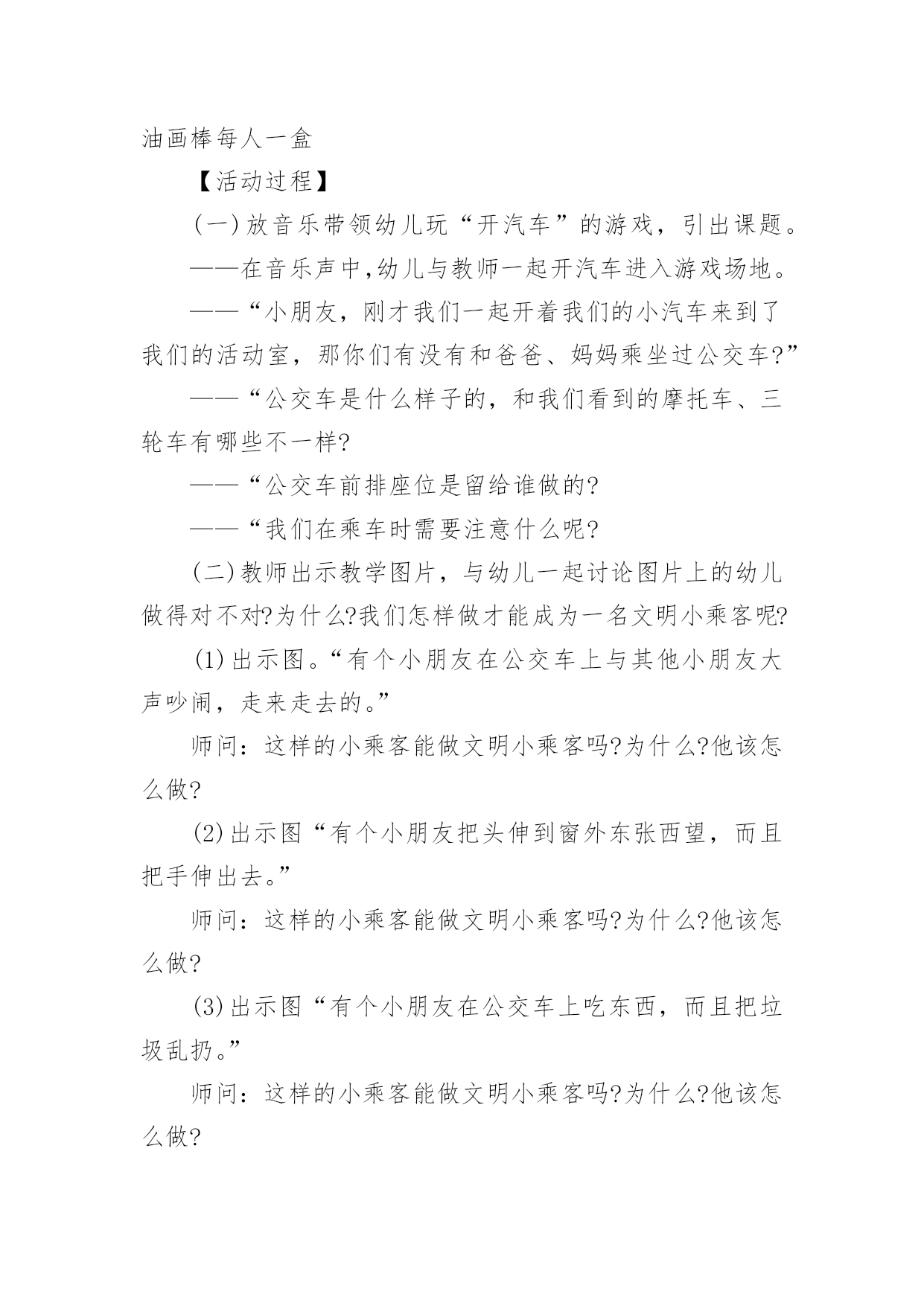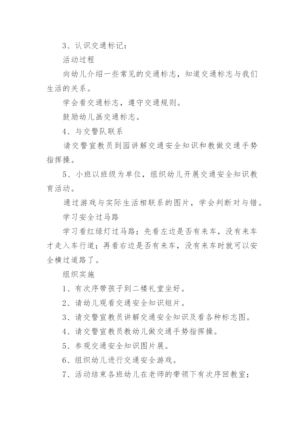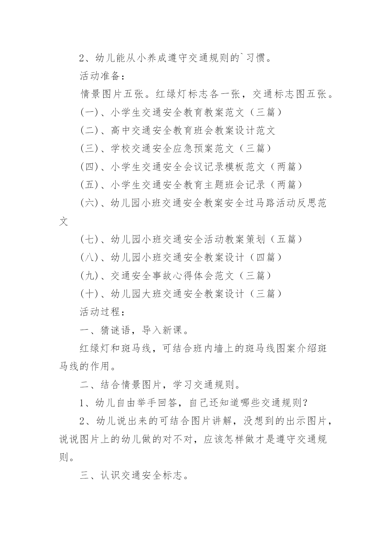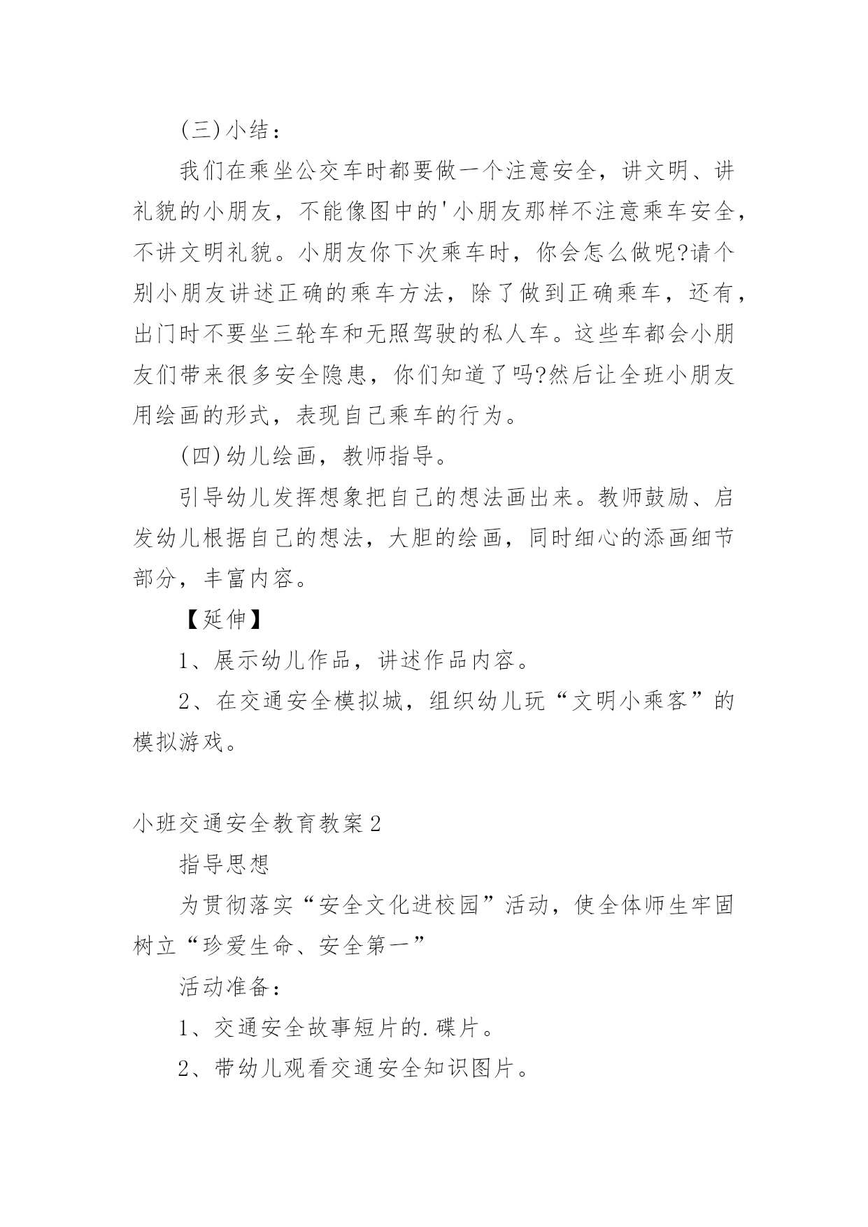 小班交通安全教育教案作为一名辛苦耕耘的教育工作者,可能需要进行教案编写工作,借助教案可以提高教学质量,收到预期的教学效果。那么什么样的教案才是好的呢?下面是小编帮大家整理的小班交通安全教育教案,欢迎阅读,希望大家能够喜欢。小班交通安全教育教案1【活动设想】交通工具是现代人社会生活中不可缺少的一个部分,这些交通工具给我们的生活带来了便利,也会给我们人身安全带来危害。于是对幼儿进行交通安全教育,成了一种必要的活动。为了让幼儿懂得遵守交通规则的重要性,增强自我保护意识,所以我选择孩子们生活中最常见和亲身体验过的交通工具“公交车”来设计本次活动,让幼儿了解交通工具与我们每一个人生活的关系,懂得乘车时应遵守交通规则。【活动目标】1、通过学习乘车小常识,增强幼儿的交通安全意识。2、激发幼儿主动关心别人,愿意做一名文明小乘客。3、在绘画和游戏活动中体验交通安全的重要性,从而自觉地遵守交通规则。结合辖区内的实际情况,选择乘坐安全性的车。【活动准备】教学图片、音乐《叭叭叭、汽车开来了》、A4白纸若干、油画棒每人一盒【活动过程】(一)放音乐带领幼儿玩“开汽车”的游戏,引出课题。——在音乐声中,幼儿与教师一起开汽车进入游戏场地。——“小朋友,刚才我们一起开着我们的小汽车来到了我们的活动室,那你们有没有和爸爸、妈妈乘坐过公交车?”——“公交车是什么样子的,和我们看到的摩托车、三轮车有哪些不一样?——“公交车前排座位是留给谁做的?——“我们在乘车时需要注意什么呢?(二)教师出示教学图片,与幼儿一起讨论图片上的幼儿做得对不对?为什么?我们怎样做才能成为一名文明小乘客呢?(1)出示图。“有个小朋友在公交车上与其他小朋友大声吵闹,走来走去的。”师问:这样的小乘客能做文明小乘客吗?为什么?他该怎么做?(2)出示图“有个小朋友把头伸到窗外东张西望,而且把手伸出去。”师问:这样的小乘客能做文明小乘客吗?为什么?他该怎么做?(3)出示图“有个小朋友在公交车上吃东西,而且把垃圾乱扔。”师问:这样的小乘客能做文明小乘客吗?为什么?他该怎么做?(三)小结:我们在乘坐公交车时都要做一个注意安全,讲文明、讲礼貌的小朋友,不能像图中的'小朋友那样不注意乘车安全,不讲文明礼貌。小朋友你下次乘车时,你会怎么做呢?请个别小朋友讲述正确的乘车方法,除了做到正确乘车,还有,出门时不要坐三轮车和无照驾驶的私人车。这些车都会小朋友们带来很多安全隐患,你们知道了吗?然后让全班小朋友用绘画的形式,表现自己乘车的行为。(四)幼儿绘画,教师指导。引导幼儿发挥想象把自己的想法画出来。教师鼓励、启发幼儿根据自己的想法,大胆的绘画,同时细心的添画细节部分,丰富内容。【延伸】1、展示幼儿作品,讲述作品内容。2、在交通安全模拟城,组织幼儿玩“文明小乘客”的模拟游戏。小班交通安全教育教案2指导思想为贯彻落实“安全文化进校园”活动,使全体师生牢固树立“珍爱生命、安全第一”活动准备:1、交通安全故事短片的.碟片。2、带幼儿观看交通安全知识图片。3、认识交通标记:活动过程向幼儿介绍一些常见的交通标志,知道交通标志与我们生活的关系。学会看交通标志,遵守交通规则。鼓励幼儿画交通标志。4、与交警队联系请交警宣教员到园讲解交通安全知识和教做交通手势指挥操。5、小班以班级为单位,组织幼儿开展交通安全知识教育活动。通过游戏与实际生活相联系的图片,学会判断对与错。学习安全过马路学习看红绿灯过马路;先看左边是否有来车,没有来车才走入车行道;再看右边是否有来车,没有来车时就可以安全横过道路了。组织实施1、有次序带孩子到二楼礼堂坐好。2、请幼儿观看交通安全知识短片。3、请交警宣教员讲解交通安全知识及看各种标志图。4、请交警宣教员教幼儿做交通手势指挥操。5、参观交通安全知识图片展。6、组织幼儿进行交通安全游戏。7、活动结束各班幼儿在老师的带领下有次序回教室;教师小结活动情况,并再次教育幼儿注意各项交通安全。小班交通安全教育教案3学习目标:1、辨别过马路时的正确及错误做法,进一步增强安全意识。2、认识交通安全设施的名称和用途。活动准备:小班上学期《活动手册》。活动过程:1、播放歌曲《信号灯》,请幼儿仔细听。妈妈和欣欣到超市买东西,可是,她们要过马路才能走到超市。瞧,走到马路边,欣欣一点也不着急,她安安静静地和妈妈一起站在斑马线上等候。不一会儿,欣欣看见车停下来了,人行横道的红绿灯上,绿色人像也亮起来了,于是她赶紧拉着妈妈的.手过马路。哦!哦!过来了!欣欣高高兴兴地和妈妈接着往前走。可是,走着走着,欣欣和妈妈又到了另一条马路上。欣欣看了看,低下头,有点纳闷儿了。没有人行横道,怎么过马路呢?正在这时,欣欣一抬头,看到了前面的过街天桥。噢!有了!欣欣拉着妈妈的手,蹦蹦跳跳地走上天桥,穿过了这条马路。就在这时,欣欣看见一些大哥哥大姐姐不遵守交通