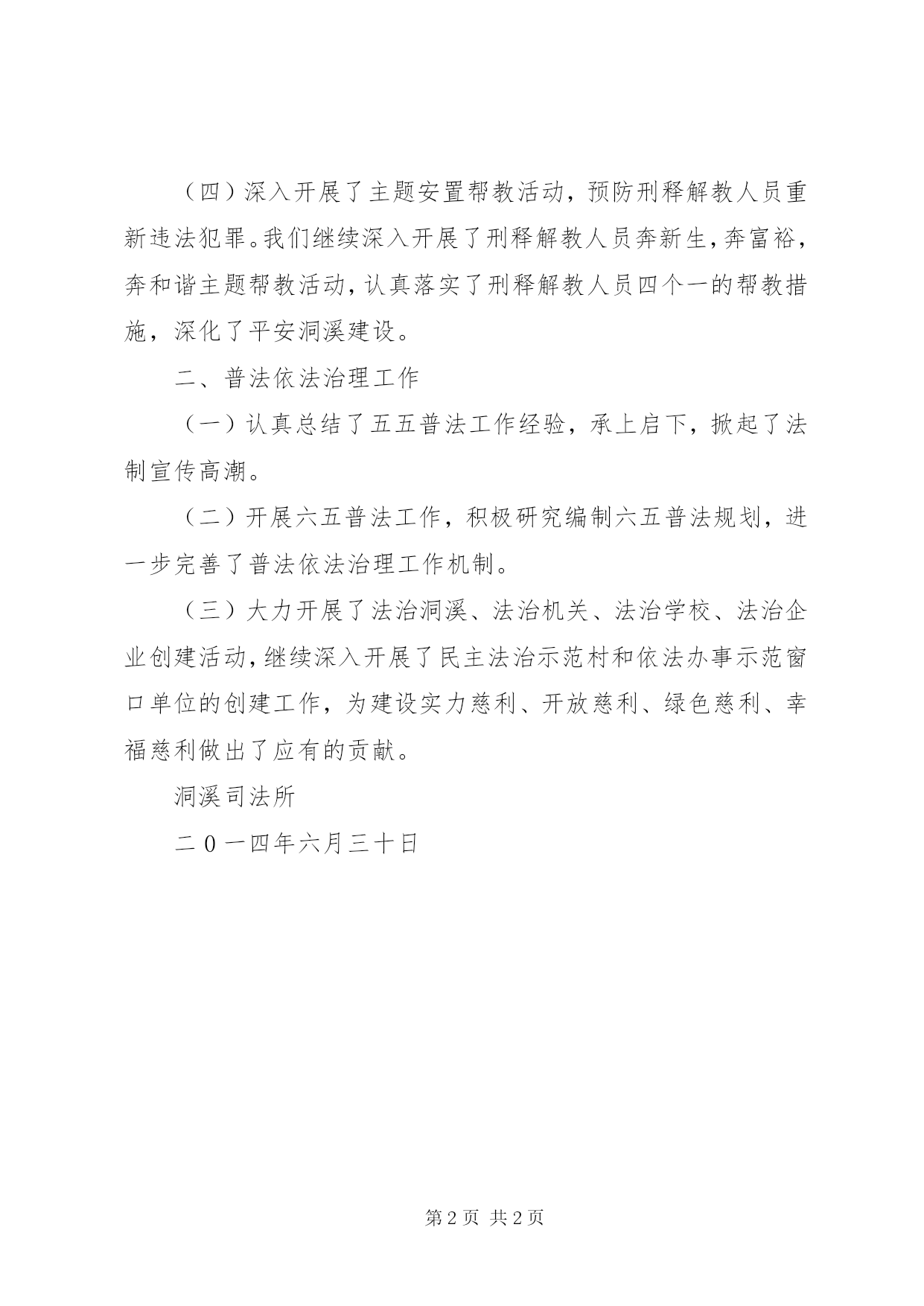 第PAGE\*Arabic\*MERGEFORMAT2页共NUMPAGES\*MERGEFORMAT2页XX年度司法行政半年工作总结半年来,我们认真贯彻落实中央经济工作会议和各级政法综治维稳、司法行政工作会议精神,坚持以邓小平理论和三个代表重要思想为指导,深入贯彻落实科学发展观,广泛开展法制宣传教育,全面推进人民调解、依法治理、基层法律服务、安置帮教、社区矫正等各项业务工作,不断提高工作水平,着力建设法治洞溪,和谐洞溪,为全乡经济又好又快发展营造了良好的法治环境。一、基层基础工作(一)认真开展了矛盾纠纷的排查和调处工作。半年来,我们紧紧围绕党委政府的重大工作部署,适时组织开展了重大节日、重要会议期间、敏感时期和季节性矛盾纠纷的排查调处工作,强化了人民调解和三调联动工作职能。认真做好了社会热点难点矛盾纠纷,三跨矛盾纠纷和涉及民生问题矛盾纠纷的调处工作,充分彰显了人民调解工作在维护社会和谐稳定中的重要作用,我所上半年共成功调解各类民事纠纷12件。(二)加强了人民调解队伍建设。5月份,我所举办了一次村调解主任培训班,大力宣传《人民调解法》,进一步完善和巩固了各村人民调解组织。(三)做好了社区矫正对象的入矫、建档工作。今年,洞溪辖区新增了一名社区矫正人员,按照上级要求,我所做好了对这名对象的入矫、谈话、教育、建档等工作。(四)深入开展了主题安置帮教活动,预防刑释解教人员重新违法犯罪。我们继续深入开展了刑释解教人员奔新生,奔富裕,奔和谐主题帮教活动,认真落实了刑释解教人员四个一的帮教措施,深化了平安洞溪建设。二、普法依法治理工作(一)认真总结了五五普法工作经验,承上启下,掀起了法制宣传高潮。(二)开展六五普法工作,积极研究编制六五普法规划,进一步完善了普法依法治理工作机制。(三)大力开展了法治洞溪、法治机关、法治学校、法治企业创建活动,继续深入开展了民主法治示范村和依法办事示范窗口单位的创建工作,为建设实力慈利、开放慈利、绿色慈利、幸福慈利做出了应有的贡献。洞溪司法所二0一四年六月三十日