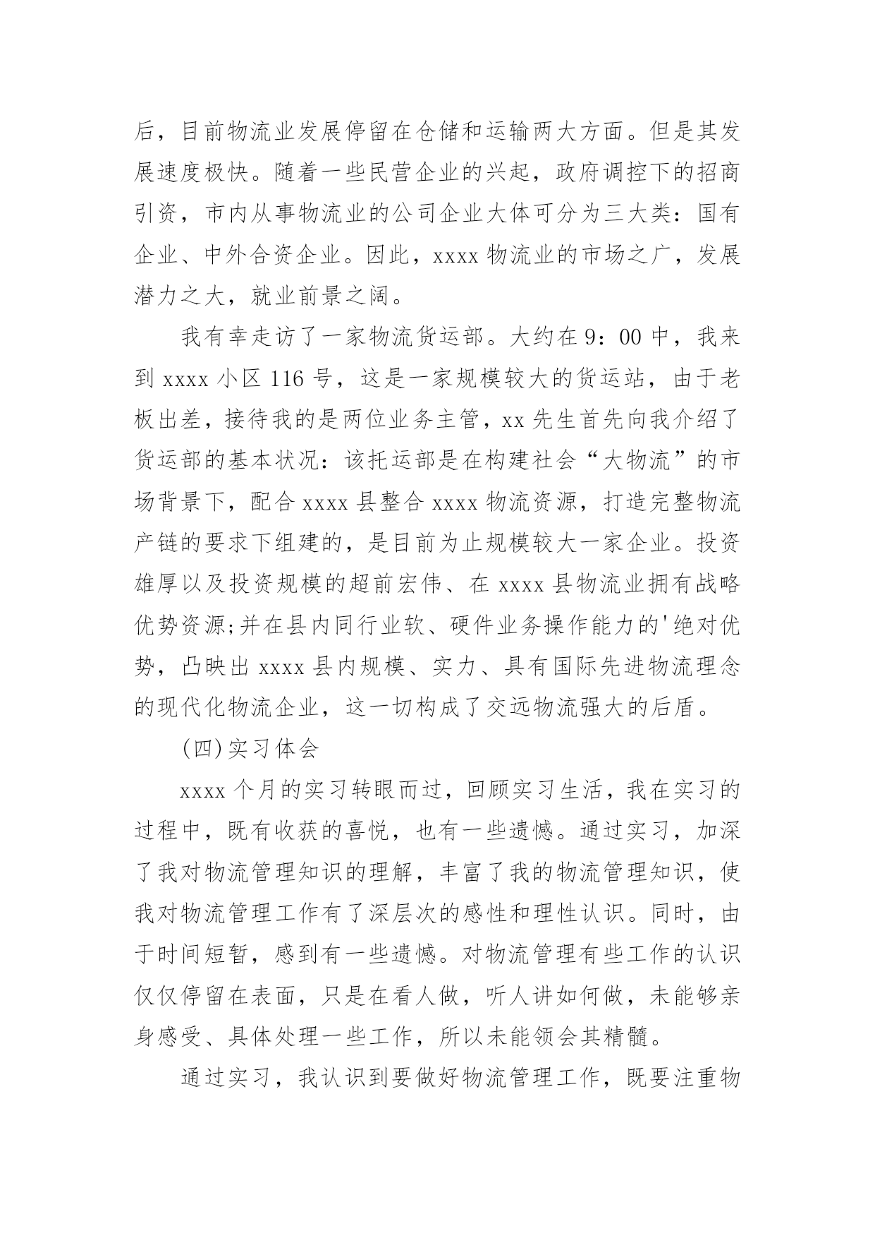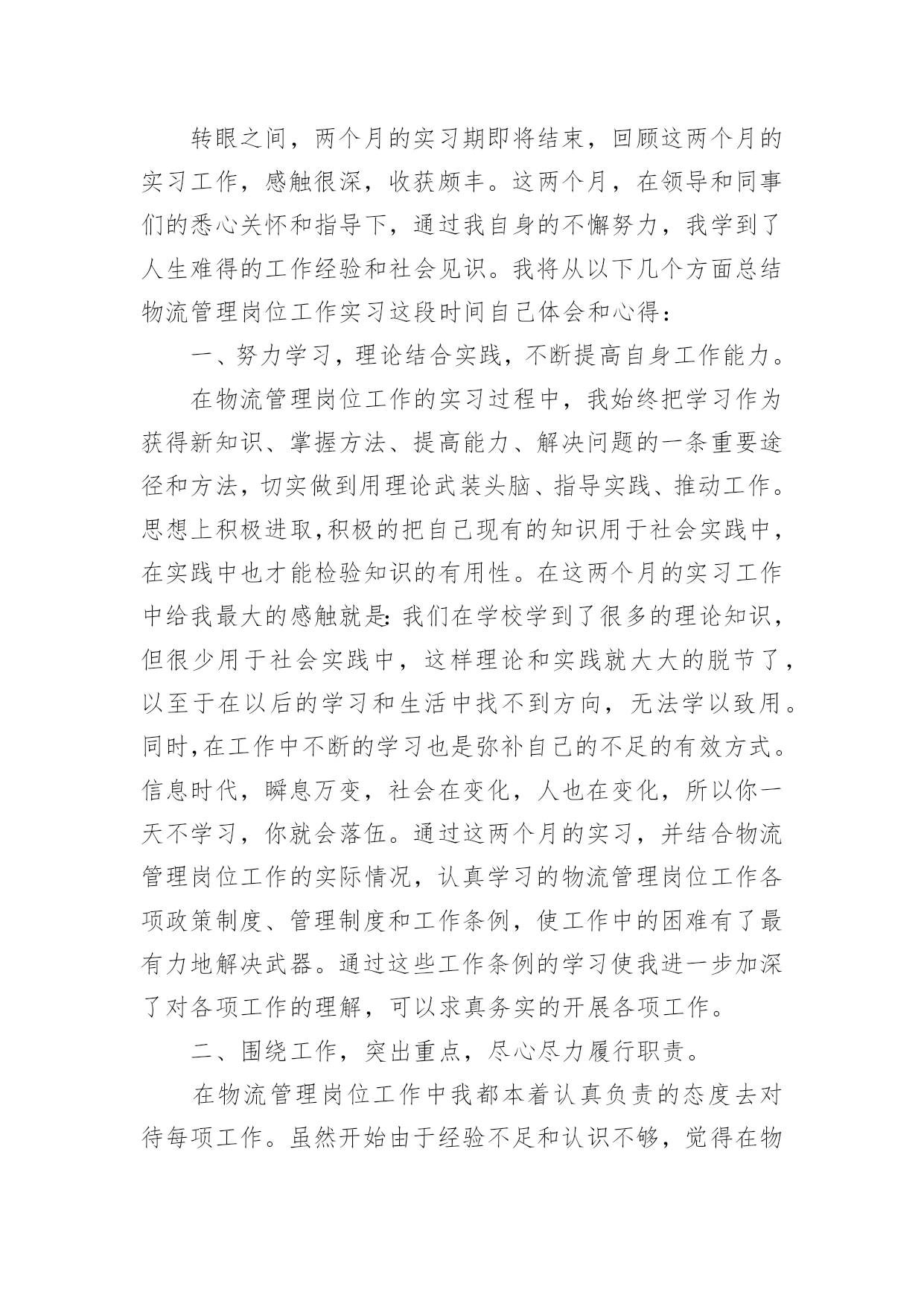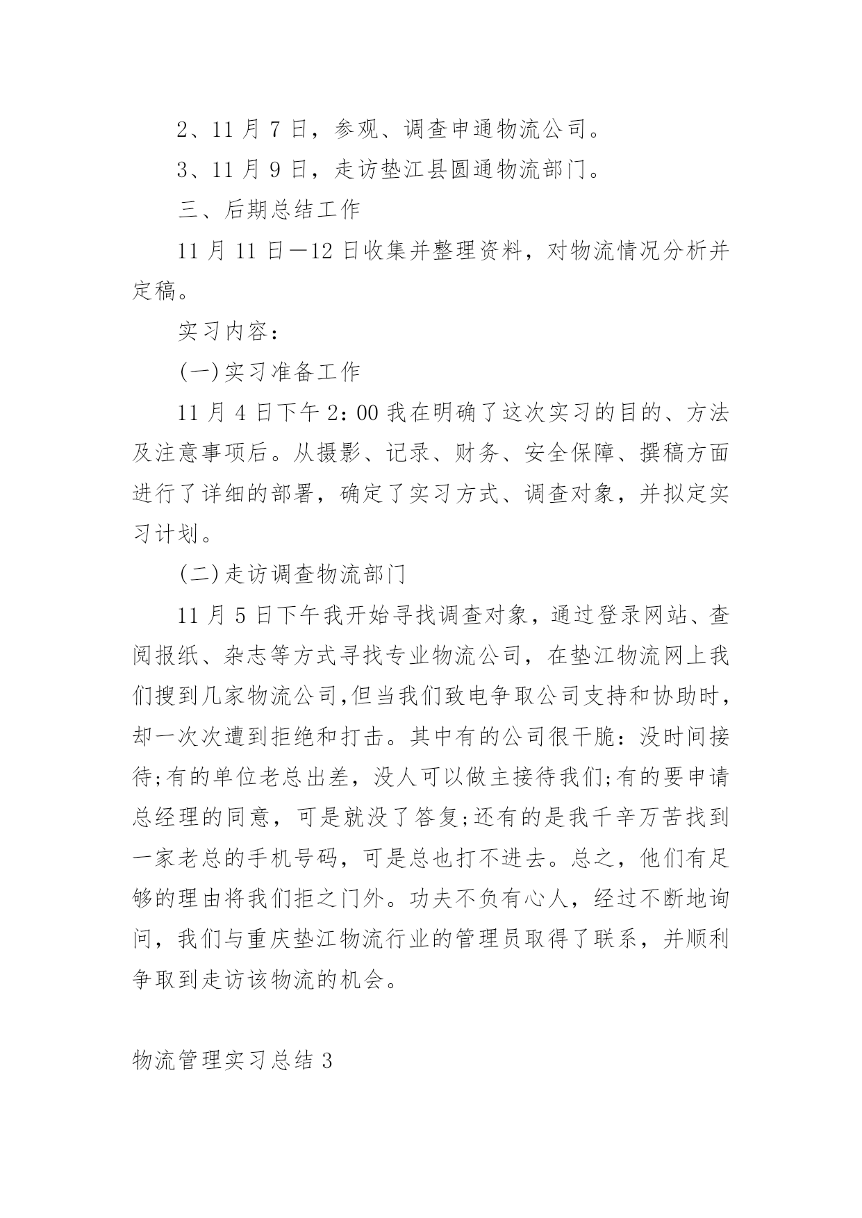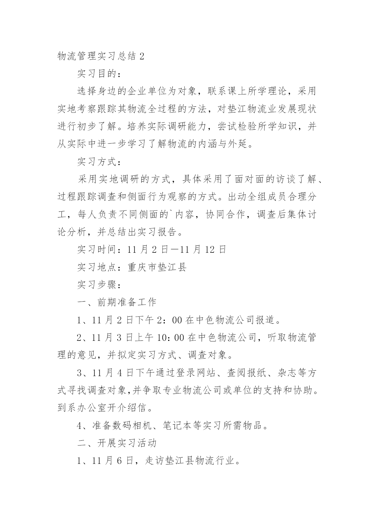 物流管理实习总结总结是事后对某一阶段的学习、工作或其完成情况加以回顾和分析的一种书面材料,它可以使我们更有效率,因此我们要做好归纳,写好总结。如何把总结做到重点突出呢?以下是小编帮大家整理的物流管理实习总结,欢迎阅读,希望大家能够喜欢。物流管理实习总结1一、实习目的选择身边的企业单位为对象,联系课上所学理论,采用实地考察跟踪其物流全过程的方法,对盛和物流业发展现状进行初步了解。培养实际调研能力,尝试检验所学知识,并从实际中进一步学习了解物流的内涵与外延。二、实习方式采用实地调研的方式,具体采用了面对面的访谈了解、过程跟踪调查和侧面行为观察的方式。出动全组成员合理分工,每人负责不同侧面的内容,协同合作,调查后集体讨论分析,并总结实习报告。三、实习时间四、实习地点:xxxx有限公司五、实习步骤(一)前期准备工作1、到xxxx物流公司报道。2、在xxxx物流公司,听取物流管理的意见,并拟定实习方式、调查对象。3、通过登录网站、查阅报纸、杂志等方式寻找调查对象,并争取专业物流公司或单位的支持和协助。到系办公室开介绍信。4、准备数码相机、笔记本等实习所需物品。(二)开展实习活动1、走访xxxx县物流行业。2、参观、调查xxxx物流公司。3、走访xxxx物流部门。4、开展具体物流管理工作。(三)后期总结工作收集并整理资料,对物流情况分析并定稿。六、实习内容:(一)实习准备工作我在明确了这次实习的目的、方法及注意事项后。从摄影、记录、财务、安全保障、撰稿方面进行了详细的部署,确定了实习方式、调查对象,并拟定实习计划。(二)走访调查物流部门寻找调查对象,通过登录网站、查阅报纸、杂志等方式寻找专业物流公司,在xxxx物流网上我们搜到几家物流公司,但当我们致电争取公司支持和协助时,却一次次遭到拒绝和打击。其中有的公司很干脆:没时间接待;有的单位老总出差,没人可以做主接待我们;有的要申请总经理的同意,可是就没了答复;还有的是我千辛万苦找到一家老总的手机号码,可是总也打不进去。总之,他们有足够的理由将我们拒之门外。功夫不负有心人,经过不断地询问,我们与xxxx物流行业的管理员取得了联系,并顺利争取到走访该物流的机会。(三)实地调查情况来到xxxxxx物流部门,这是我本次实习的第一站。当我讲明了这次走访的目的后,便开始了这次人物访谈。首先该站管理员向我讲述了其物流管理的历程。随着市场经济的迅速发展、社会化大生产特别是工业化初步实现。使得产品极大的丰富,产品的大量交换、运输与仓储成为必然。各种各样物资的流动与日俱增,越来越受到人们的关注。xxxx县政府认识到作为新的经济增长点的现代物流业必然成为xxxx经济发展的基础产业。要充分发挥其区位优势。潜在无限的商机,县内外商贾云集,纷纷把目光注视在xxxx这片红土地上。县政府果断提出自己的发展思路和战略构想。并投入大量资金建设好县内、外1小时经济圈。栽好梧桐树、引来金凤凰。短短几年时间xx城经济发生了翻天覆地的变化。xxxx物流业也正是在这样的环境下应运而生。政府对物流业发展的高度重视,对该协会成立给予了大力支持,同时五家从事物流行业的公司是该协会的发起单位。县领导对xxxx的物流现状进行了分析,他指出xxxx县的物流业还处在一个低层次的发展阶段,与其他地区相比相对滞后,目前物流业发展停留在仓储和运输两大方面。但是其发展速度极快。随着一些民营企业的兴起,政府调控下的招商引资,市内从事物流业的公司企业大体可分为三大类:国有企业、中外合资企业。因此,xxxx物流业的市场之广,发展潜力之大,就业前景之阔。我有幸走访了一家物流货运部。大约在9:00中,我来到xxxx小区116号,这是一家规模较大的货运站,由于老板出差,接待我的是两位业务主管,xx先生首先向我介绍了货运部的基本状况:该托运部是在构建社会“大物流”的市场背景下,配合xxxx县整合xxxx物流资源,打造完整物流产链的要求下组建的,是目前为止规模较大一家企业。投资雄厚以及投资规模的超前宏伟、在xxxx县物流业拥有战略优势资源;并在县内同行业软、硬件业务操作能力的'绝对优势,凸映出xxxx县内规模、实力、具有国际先进物流理念的现代化物流企业,这一切构成了交远物流强大的后盾。(四)实习体会xxxx个月的实习转眼而过,回顾实习生活,我在实习的过程中,既有收获的喜悦,也有一些遗憾。通过实习,加深了我对物流管理知识的理解,丰富了我的物流管理知识,使我对物流管理工作有了深层次的感性和理性认识。同时,由于时间短暂,感到有一些遗憾。对物流管理有些工作的认识仅仅停留在表面,只是在看人做,听人讲如何做,未能够亲身感受、具体处理一些工作,所以未能领会其精髓。通过实习,我认识到要做好物流管理工作,既要注重物流管理理论知识的学习,更重要的是要把实践与理论两者紧密相结合。物流管理作为