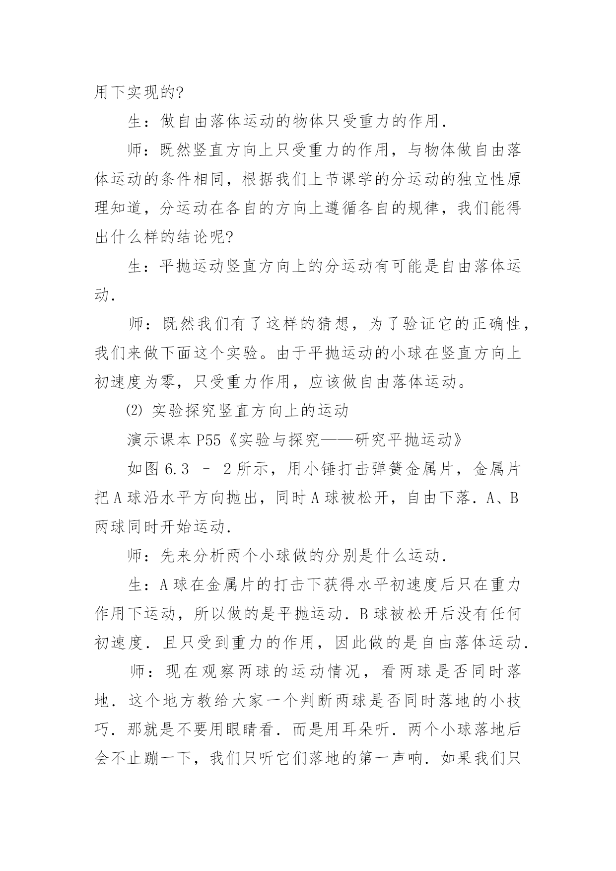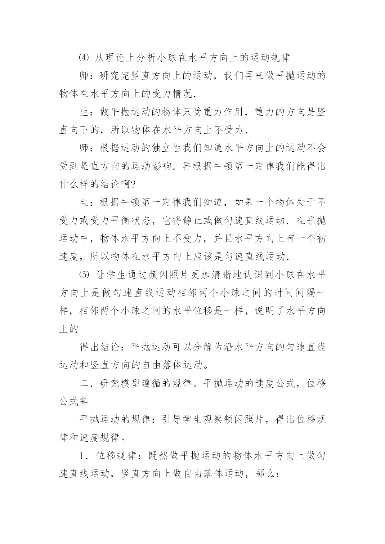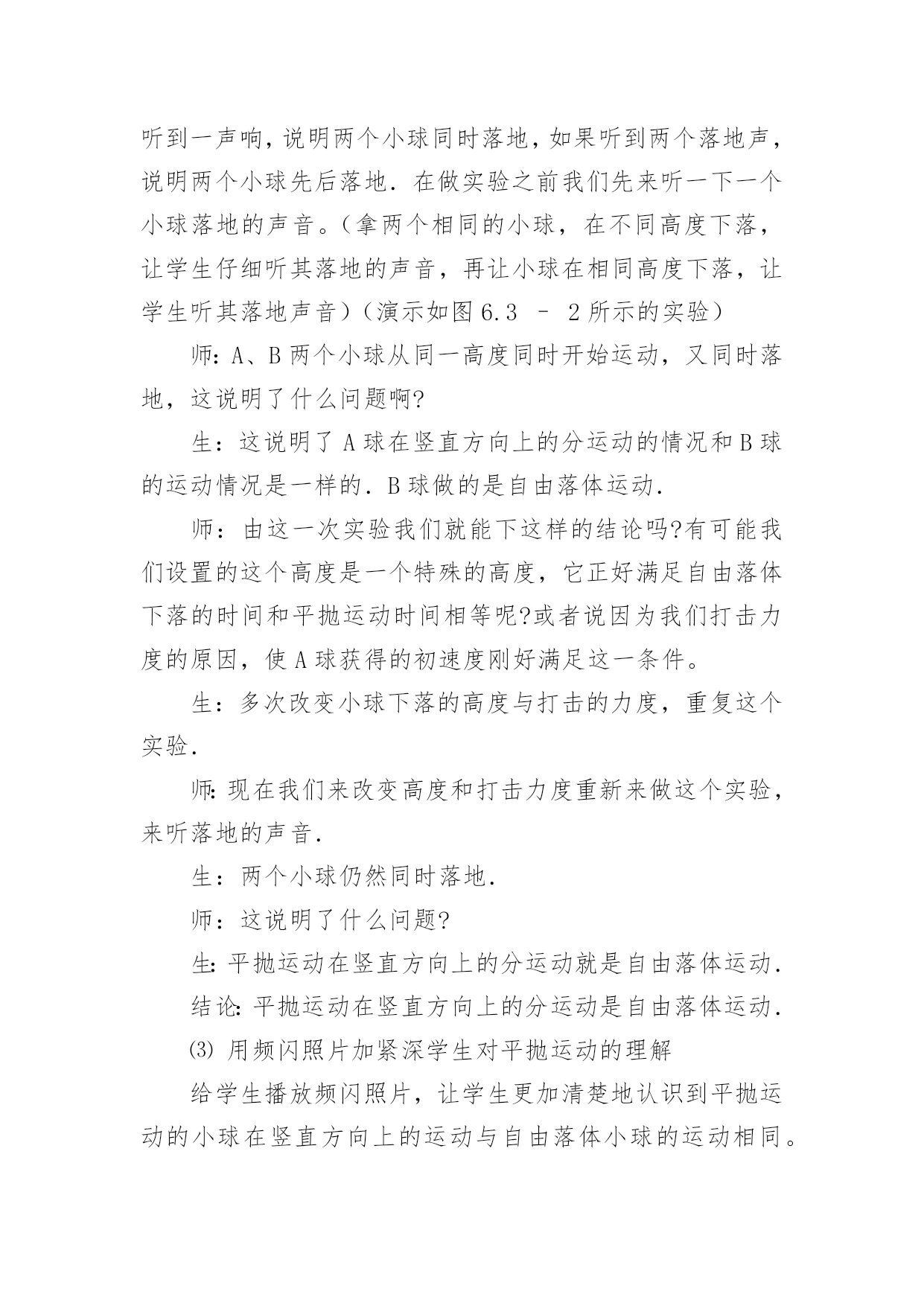 平抛运动教学设计作为一名专为他人授业解惑的人民教师,就有可能用到教学设计,教学设计是把教学原理转化为教学材料和教学活动的计划。那么应当如何写教学设计呢?下面是小编收集整理的平抛运动教学设计,仅供参考,大家一起来看看吧。【教材分析】学习平抛运动之前,学生接触到的都是直线运动,平抛运动比直线运动复杂,不容易直接研究它的运动规律,就需要将它分解为简单的直线运动来研究。教学时可结合平抛运动演示仪和频闪照片,使学生能认识到平抛运动可以分解为水平方向的匀速直线运动和竖直方向的自由落体运动,利用实验事实得出结论,能给学生留下更深的印象。【教学目标】知道什么是平抛运动;理解平抛运动可以分为水平方向的匀速直线运动和竖直方向的自由落体运动,且这两个方向上的运动互不影响;掌握平抛运动的规律,会处理简单的问题;通过实验、频闪照片,完全由感性认识到理性认识,培养观察能力和分析能力;渗透物理学研究方法的教育。认识平抛运动的处理方法是从复杂到简单,先分解再合成,这个规律是物理学研究的重要方法;发挥教学工具的作用,提高运用数学解决问题的能力;在物理教学中使学生受到相信科学、热爱科学的教育;培养学生学习科学的兴趣及实事求是的科学态度;激发学生积极的学习兴趣和勇于探索的精神。【教学重点与难点】平抛运动的特点和规律【教学过程】复习导入:师:前面我们学习了曲线运动的相关知识以及研究曲线运动基本方法——运动的合成与分解,在学习新课之前我们先来回顾一下.物体在什么情况下物体会做曲线运动?生:当物体所受的合力的方向跟它的速度方向不在同一条直线上时,物体做曲线运动。师:做曲线运动的物体其速度方向是怎样的?生:质点在某一点的速度方向,沿曲线在这一点的切线方向。师:对于曲线运动,我们通常会如何处理?生:把它分解为两个方向的运动来研究,两个分运动的共同效果与合运动效果是一样的。新授课一、什么是平抛运动1.充分感知现象:在此基础上进行大致分类。第一步是观看飞机投弹的录像,观察水平管子中射出水流的运动,观察桌面上滚下的小球的运动,观察水平抛出的纸团的运动。第二步是区分类别,将值得一起研究的运动归为一类。2.求同寻异:对归在一起的几种运动进行分析,既找不同点,又寻相同点。例如不同点为:运动速度不同,物体大小和质量不同,下落高度不同,所受重力不同,所受空气阻力不同等,相同点均为曲线运动,轨迹相似,初速度均水平。(渗透了多角度分析的思想方法)3.运用理想化方法,忽略次要因素,重新认识相同点:例如,前述几种运动中空气阻力是次要因素,将其忽略。4.寻找模型本质上的共同点:忽略空气阻力以后,从运动和力这一层面我们可以找到初速度方向水平,只受重力作用,加速度均为g这些相同点,从功与能角度,我们可以找到在运动过程中只有重力做功,机械能守恒这些相同点。给出平抛运动的定义:物体以一定的初速度沿水平方向抛出,不考虑空气阻力,物体只在重力作用下所做的运动叫做平抛运动5.综合表象:平抛运动与自由落体,平抛运动与水平匀速运动,频闪照片等。最后舍弃具体细节特征,概括形成反映平抛运动这一运动模型本质特征的表象。例如,虽然物体有大有小,重力有大有小,但重力加速度不变,虽然初速度有大有小,下落高度不同,这些可以影响轨迹的长短和形状,但运动的性质仍然相同。引导学生观察,平抛运动是由水平方向和竖直方向两个方向上的运动合成的,那就分别研究这两个方向上的运动。⑴从理论上猜想小球在竖直方向上的运动师:物体运动和受力情况是联系在一起的。生:在竖直方向上只受到重力的作用.师:想一下我们前面学过的运动形式有没有只在重力作用下实现的?生:做自由落体运动的物体只受重力的作用.师:既然竖直方向上只受重力的作用,与物体做自由落体运动的条件相同,根据我们上节课学的分运动的独立性原理知道,分运动在各自的方向上遵循各自的规律,我们能得出什么样的结论呢?生:平抛运动竖直方向上的分运动有可能是自由落体运动.师:既然我们有了这样的猜想,为了验证它的正确性,我们来做下面这个实验。由于平抛运动的小球在竖直方向上初速度为零,只受重力作用,应该做自由落体运动。⑵实验探究竖直方向上的运动演示课本P55《实验与探究——研究平抛运动》如图6.3–2所示,用小锤打击弹簧金属片,金属片把A球沿水平方向抛出,同时A球被松开,自由下落.A、B两球同时开始运动.师:先来分析两个小球做的分别是什么运动.生:A球在金属片的打击下获得水平初速度后只在重力作用下运动,所以做的是平抛运动.B球被松开后没有任何初速度.且只受到重力的作用,因此做的是自由落体运动.师:现在观察两球的运动情况,看两球是否同时落地.这个地方教给大家一个判断两球是否同时落地的小技巧.那就是不要用眼睛看.而是用耳朵听.两个小球落地后会不止蹦一下,我们只听它们落地的第一声响.如果我们只听到一声响,说明两个小球同时落