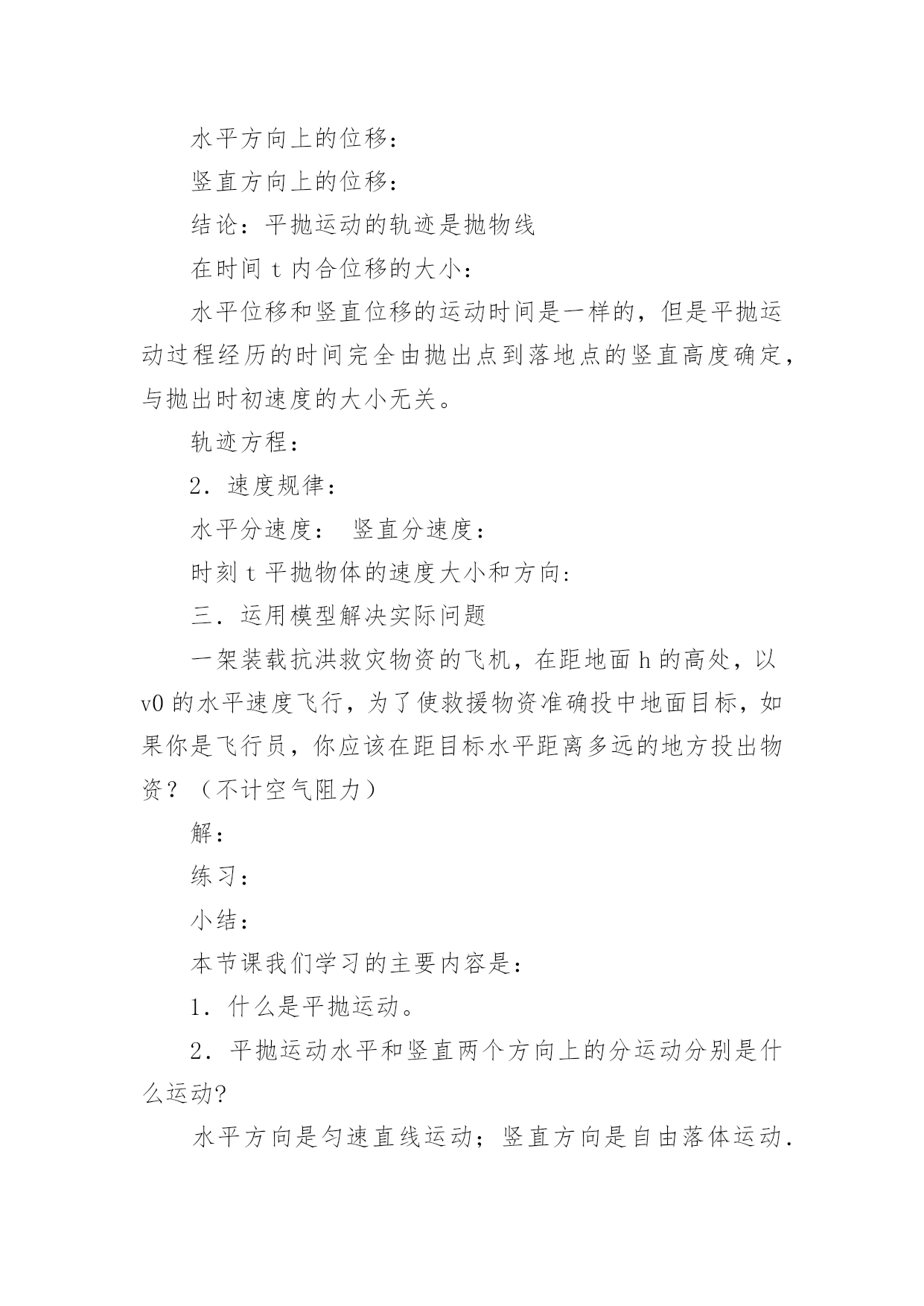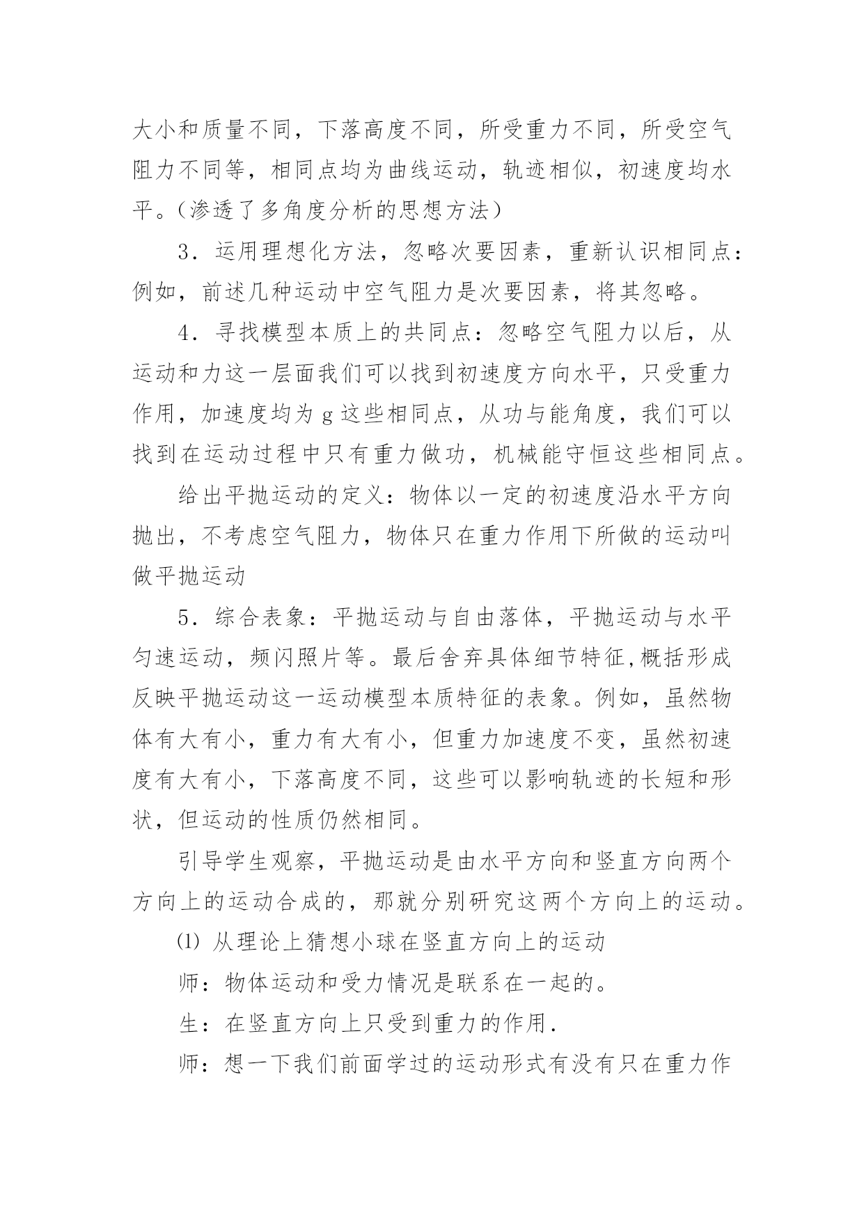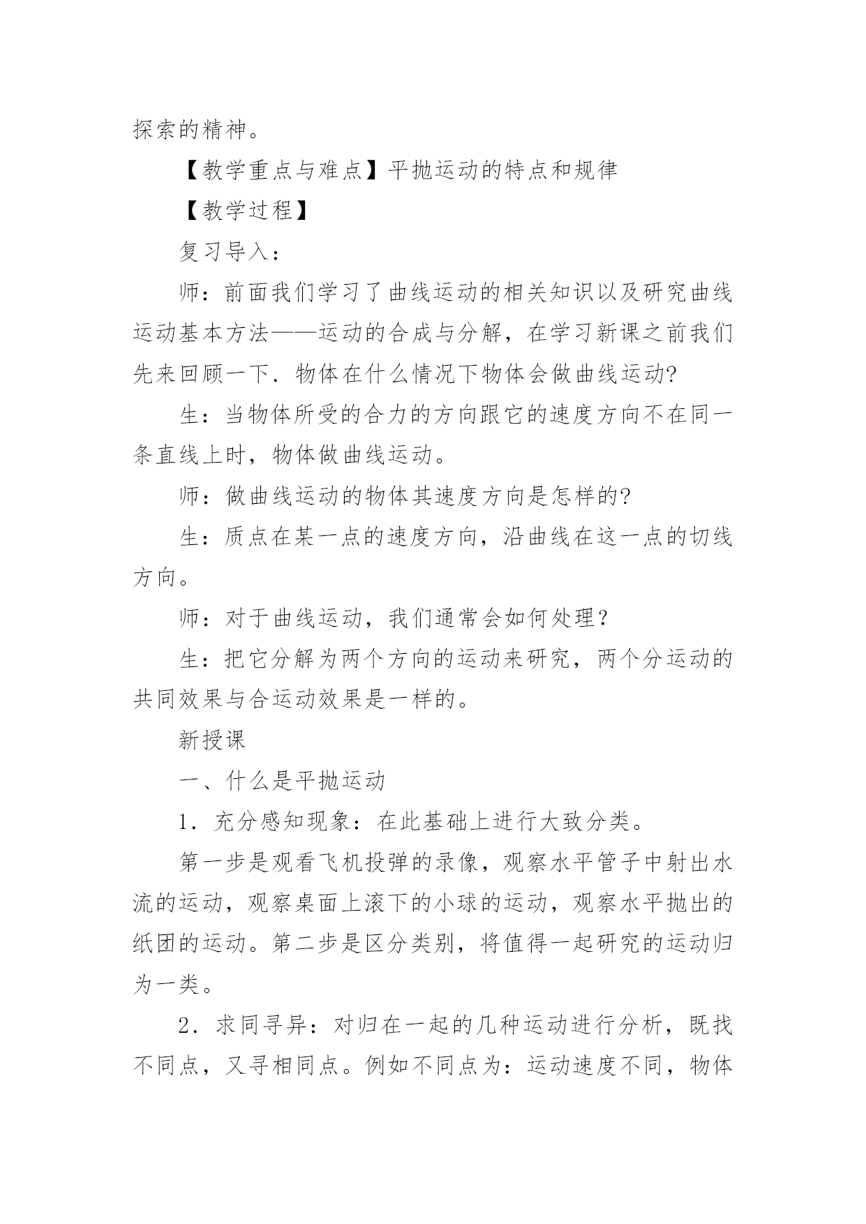 平抛运动教学设计作为一名专为他人授业解惑的人民教师,就有可能用到教学设计,教学设计是把教学原理转化为教学材料和教学活动的计划。那么应当如何写教学设计呢?下面是小编收集整理的平抛运动教学设计,仅供参考,大家一起来看看吧。【教材分析】学习平抛运动之前,学生接触到的都是直线运动,平抛运动比直线运动复杂,不容易直接研究它的运动规律,就需要将它分解为简单的直线运动来研究。教学时可结合平抛运动演示仪和频闪照片,使学生能认识到平抛运动可以分解为水平方向的匀速直线运动和竖直方向的自由落体运动,利用实验事实得出结论,能给学生留下更深的印象。【教学目标】知道什么是平抛运动;理解平抛运动可以分为水平方向的匀速直线运动和竖直方向的自由落体运动,且这两个方向上的运动互不影响;掌握平抛运动的规律,会处理简单的问题;通过实验、频闪照片,完全由感性认识到理性认识,培养观察能力和分析能力;渗透物理学研究方法的教育。认识平抛运动的处理方法是从复杂到简单,先分解再合成,这个规律是物理学研究的重要方法;发挥教学工具的作用,提高运用数学解决问题的能力;在物理教学中使学生受到相信科学、热爱科学的教育;培养学生学习科学的兴趣及实事求是的科学态度;激发学生积极的学习兴趣和勇于探索的精神。【教学重点与难点】平抛运动的特点和规律【教学过程】复习导入:师:前面我们学习了曲线运动的相关知识以及研究曲线运动基本方法——运动的合成与分解,在学习新课之前我们先来回顾一下.物体在什么情况下物体会做曲线运动?生:当物体所受的合力的方向跟它的速度方向不在同一条直线上时,物体做曲线运动。师:做曲线运动的物体其速度方向是怎样的?生:质点在某一点的速度方向,沿曲线在这一点的切线方向。师:对于曲线运动,我们通常会如何处理?生:把它分解为两个方向的运动来研究,两个分运动的共同效果与合运动效果是一样的。新授课一、什么是平抛运动1.充分感知现象:在此基础上进行大致分类。第一步是观看飞机投弹的录像,观察水平管子中射出水流的运动,观察桌面上滚下的小球的运动,观察水平抛出的纸团的运动。第二步是区分类别,将值得一起研究的运动归为一类。2.求同寻异:对归在一起的几种运动进行分析,既找不同点,又寻相同点。例如不同点为:运动速度不同,物体大小和质量不同,下落高度不同,所受重力不同,所受空气阻力不同等,相同点均为曲线运动,轨迹相似,初速度均水平。(渗透了多角度分析的思想方法)3.运用理想化方法,忽略次要因素,重新认识相同点:例如,前述几种运动中空气阻力是次要因素,将其忽略。4.寻找模型本质上的共同点:忽略空气阻力以后,从运动和力这一层面我们可以找到初速度方向水平,只受重力作用,加速度均为g这些相同点,从功与能角度,我们可以找到在运动过程中只有重力做功,机械能守恒这些相同点。给出平抛运动的定义:物体以一定的初速度沿水平方向抛出,不考虑空气阻力,物体只在重力作用下所做的运动叫做平抛运动5.综合表象:平抛运动与自由落体,平抛运动与水平匀速运动,频闪照片等。最后舍弃具体细节特征,概括形成反映平抛运动这一运动模型本质特征的表象。例如,虽然物体有大有小,重力有大有小,但重力加速度不变,虽然初速度有大有小,下落高度不同,这些可以影响轨迹的长短和形状,但运动的性质仍然相同。引导学生观察,平抛运动是由水平方向和竖直方向两个方向上的运动合成的,那就分别研究这两个方向上的运动。⑴从理论上猜想小球在竖直方向上的运动师:物体运动和受力情况是联系在一起的。生:在竖直方向上只受到重力的作用.师:想一下我们前面学过的运动形式有没有只在重力作用下实现的?生:做自由落体运动的物体只受重力的作用.师:既然竖直方向上只受重力的作用,与物体做自由落体运动的条件相同,根据我们上节课学的分运动的独立性原理知道,分运动在各自的方向上遵循各自的规律,我们能得出什么样的结论呢?生:平抛运动竖直方向上的分运动有可能是自由落体运动.师:既然我们有了这样的猜想,为了验证它的正确性,我们来做下面这个实验。由于平抛运动的小球在竖直方向上初速度为零,只受重力作用,应该做自由落体运动。⑵实验探究竖直方向上的运动演示课本P55《实验与探究——研究平抛运动》如图6.3–2所示,用小锤打击弹簧金属片,金属片把A球沿水平方向抛出,同时A球被松开,自由下落.A、B两球同时开始运动.师:先来分析两个小球做的分别是什么运动.生:A球在金属片的打击下获得水平初速度后只在重力作用下运动,所以做的是平抛运动.B球被松开后没有任何初速度.且只受到重力的作用,因此做的是自由落体运动.师:现在观察两球的运动情况,看两球是否同时落地.这个地方教给大家一个判断两球是否同时落地的小技巧.那就是不要用眼睛看.而是用耳朵听.两个小球落地后会不止蹦一下,我们只听它们落地的第一声响.如果我们只听到一声响,说明两个小球同时落
