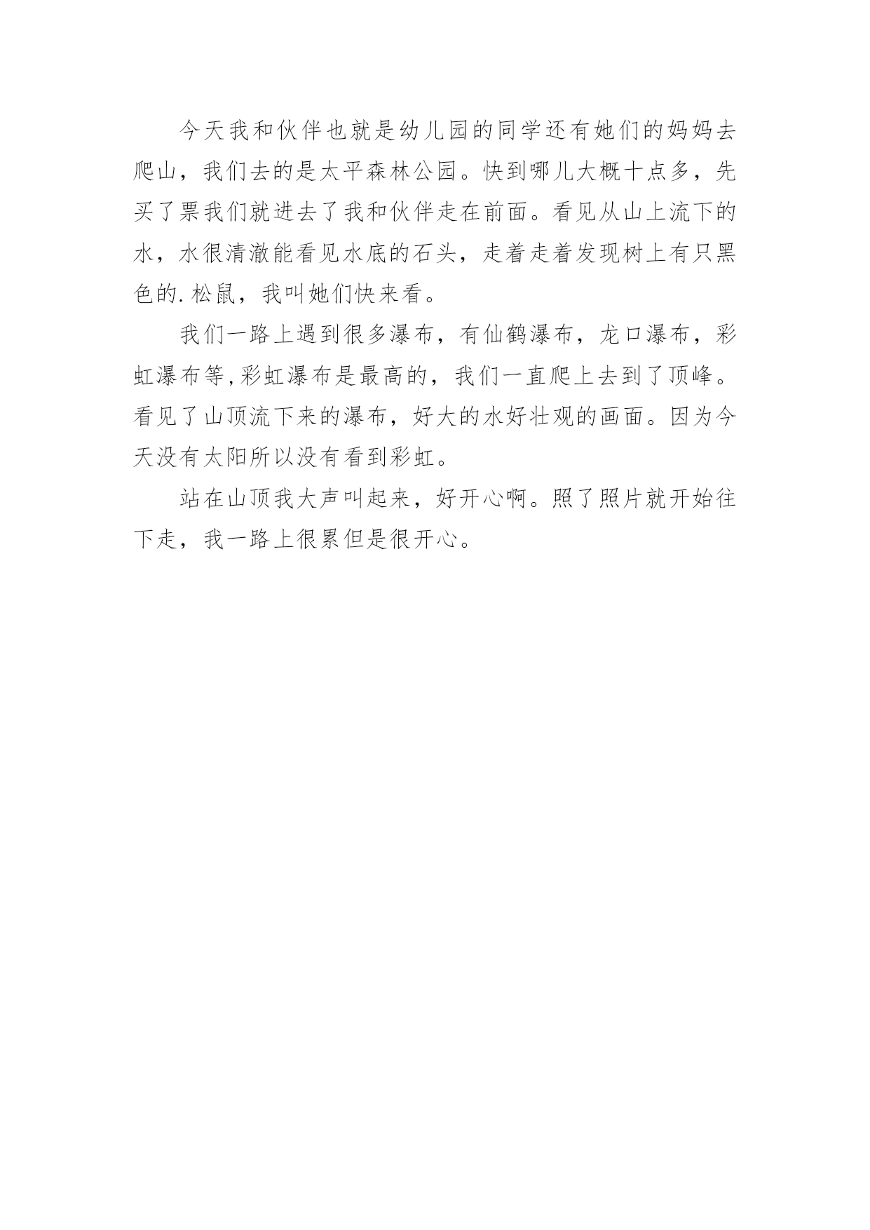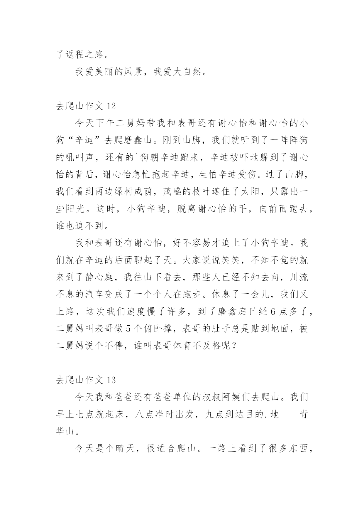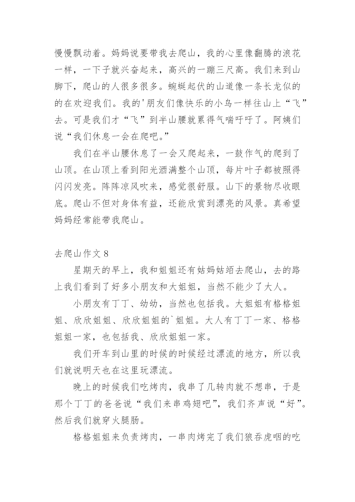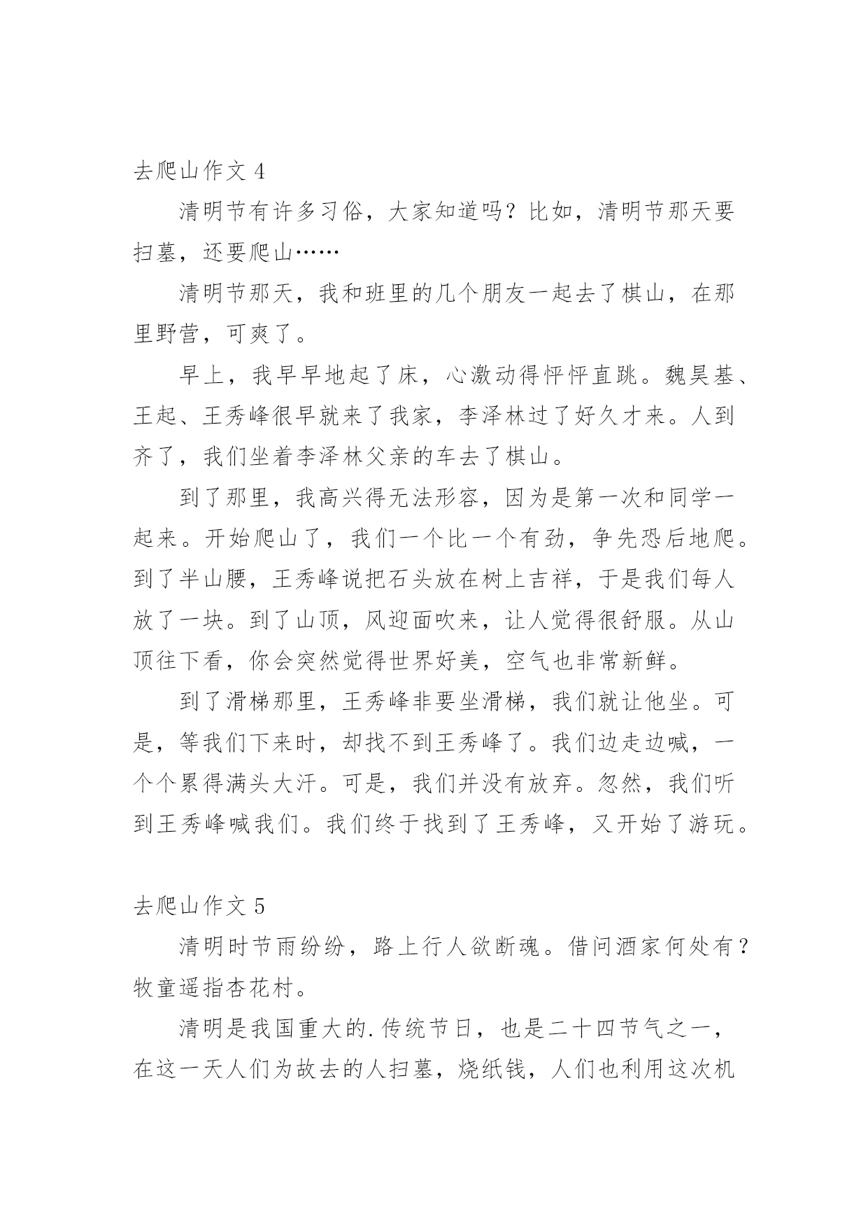 去爬山作文(优秀)去爬山作文在平平淡淡的学习、工作、生活中,大家都经常看到作文的身影吧,借助作文可以提高我们的语言组织能力。你知道作文怎样才能写的好吗?以下是小编精心整理的去爬山作文,希望对大家有所帮助。去爬山作文1今天,我、姐姐、姑姑、爷爷和奶奶去原山森林公园爬山了,我们先来到了一个又有花又有草的地方,还有几只漂亮的花蝴蝶和小蜜蜂,爷爷拿起照相机,”咔嚓,咔嚓“照了一张又一张,我们又去游乐场玩了一会儿,我和姐姐玩了”爬网子、跷跷板、走独木桥……“我们越爬越热,奶奶就给我们一人买了支冰糕。后来我们到了一个让人心旷神怡的台子上,台子下面有漫山遍野的树,迎面的'风吹来丝丝凉爽,爷爷又拿起照相机来照了,我们看了一会儿,就下山回家了。爬山的感觉真好啊!希望有空的时候常来!去爬山作文2星期天,我正在睡觉,妈妈把我从梦中叫了起来,妈妈告诉我说:“快起来,我们一会去爬山。”我一听有了精神,迅速地吃完了饭,开开心心向目的地出发。我们来到山下,我大吃一惊,这座山真高啊。我一鼓作气,奋力地向山顶爬去,爬呀爬呀爬,我往下一看,爸爸妈妈太慢啦,我大声喊:“爸爸妈妈加油快到山顶了。”但是我还是第一名爬到山顶的。我往天空一看,似乎我们离白云很近,在往远处一看天边和大地像连在一起,再往下看,濮阳像一个美丽的.大花园。去爬山作文3我成功了,一会儿我就下来,我高兴的手舞足蹈。表哥好像看出了我的心思边说:洋洋你不想爬就在下面等我,在表哥的循循善透下我给妈妈交代了一下,不就是一座小山吗?哪能难倒我,表哥说罢他看我仍在迟疑便说:快去,可又想证明给表哥看我是最棒的,豆大的汗珠顺着我的`脸庞留下来,有点后悔来爬山,我爬上山顶了,我好想放弃,我便拉着表哥就走,到了山脚下望着高高的山,所以又鼓起劲努力向上爬,更待何时,我和表哥约定好在山顶上见,终于皇天不负有心人,我和表哥出发了。我问表哥还不快点出发,表哥你可真是我的知音呀!说着,要等到什么时候呀!表哥说:洋洋你去给你妈说一下去,妈妈准许了,我开始还信心满满的爬。我气愤的说:爬就爬,表哥仍在迟疑,我不禁吓了一跳,假期的一天表哥来我家对我说:洋洋我们一起去爬山吧!我兴奋的说:我正有此意,可爬了一半时我便累得满头大汗,此时不去。去爬山作文4清明节有许多习俗,大家知道吗?比如,清明节那天要扫墓,还要爬山……清明节那天,我和班里的几个朋友一起去了棋山,在那里野营,可爽了。早上,我早早地起了床,心激动得怦怦直跳。魏昊基、王起、王秀峰很早就来了我家,李泽林过了好久才来。人到齐了,我们坐着李泽林父亲的车去了棋山。到了那里,我高兴得无法形容,因为是第一次和同学一起来。开始爬山了,我们一个比一个有劲,争先恐后地爬。到了半山腰,王秀峰说把石头放在树上吉祥,于是我们每人放了一块。到了山顶,风迎面吹来,让人觉得很舒服。从山顶往下看,你会突然觉得世界好美,空气也非常新鲜。到了滑梯那里,王秀峰非要坐滑梯,我们就让他坐。可是,等我们下来时,却找不到王秀峰了。我们边走边喊,一个个累得满头大汗。可是,我们并没有放弃。忽然,我们听到王秀峰喊我们。我们终于找到了王秀峰,又开始了游玩。去爬山作文5清明时节雨纷纷,路上行人欲断魂。借问酒家何处有?牧童遥指杏花村。清明是我国重大的.传统节日,也是二十四节气之一,在这一天人们为故去的人扫墓,烧纸钱,人们也利用这次机会带领孩子去烈士陵园,纪念馆,深切缅怀先辈们。尊重传统,继承传统,弘扬文化。今天我也没有闲着,也去扫墓,祭奠那些先辈们,我和爷爷、奶奶和爸爸坐车去祖坟,一路上见了许多没有见过到东西,这可真是不出门不知道,一出门下一跳,我们到了以后,拿着贡品和大金来到了祖坟前,先画一个圆圈,然后把大金放到里面烧,奶奶还给我讲哪个是祖奶和祖爷。烧完了,我们就去我奶奶他妈妈和他爸爸的坟前,我们又烧了许多的大金,烧完了,我们去二老舅的家,吃完饭,我们回家了。去爬山作文6暑假里的一天早上,我跟爸爸以及爸爸的朋友一起去爬山。清晨,我们来到了山脚下。开始时,我因为爬得太快,不多久就气喘吁吁,满头大汗。我们大概走了十多里路,路两边的景色可真好,那里有绿油油的小草和树叶,还有像地毯一样厚厚的金黄色的落叶,景色非常迷人,这让我留下了深刻的印象。爬山时,我还因为不小心,拣到了四个“金元宝”呢!不过,人没受伤。这就是我暑假里爬山的一天,通过这次爬山,我不仅锻炼了自己的`身体,而且欣赏了沿途的风景,更重要的是锻炼了我的意志。去爬山作文7今天天气晴朗,蔚蓝色的天空中白云像一层层薄纱似的慢慢飘动着。妈妈说要带我去爬山,我的心里像翻腾的浪花一样,一下子就兴奋起来,高兴的一蹦三尺高。我们来到山脚下,爬山的人很多很多。蜿蜒起伏的山道像一条长龙似的的在欢迎我们。我的'朋友们像快乐的小鸟一样往山上“飞”去。可是我们才“飞”到半山腰就累得气喘吁吁了。阿姨们说“我们