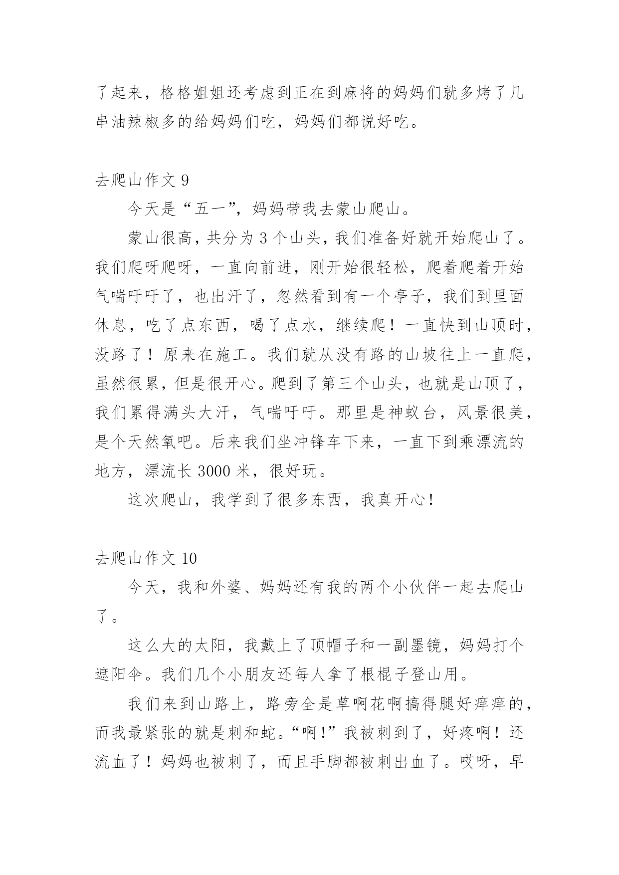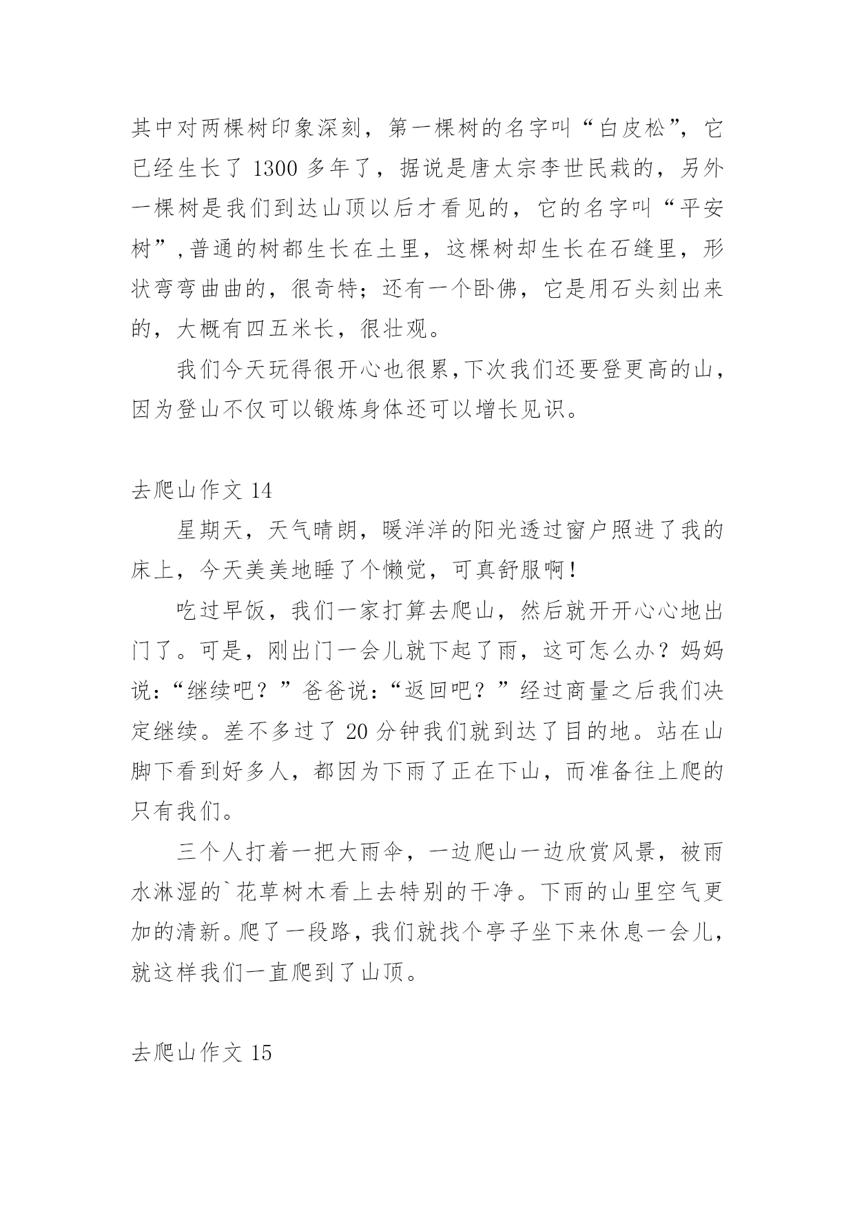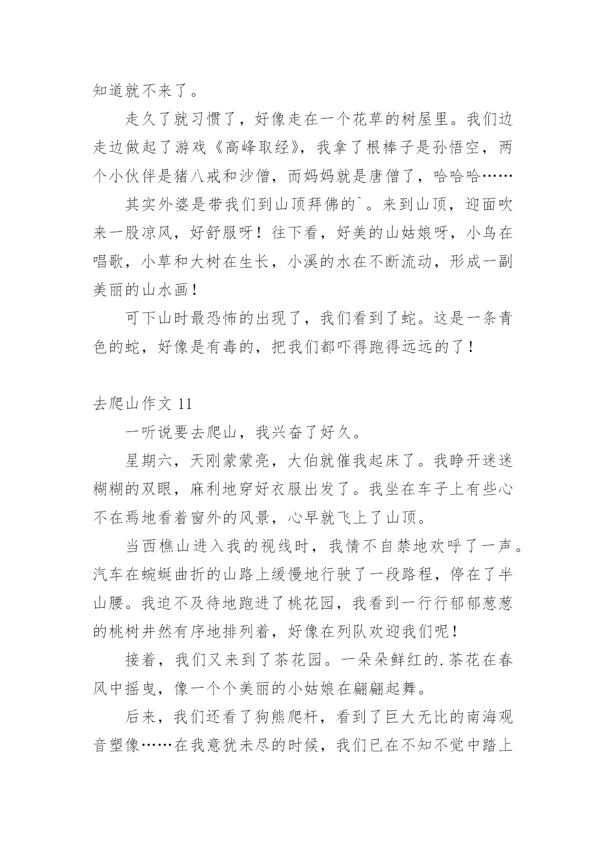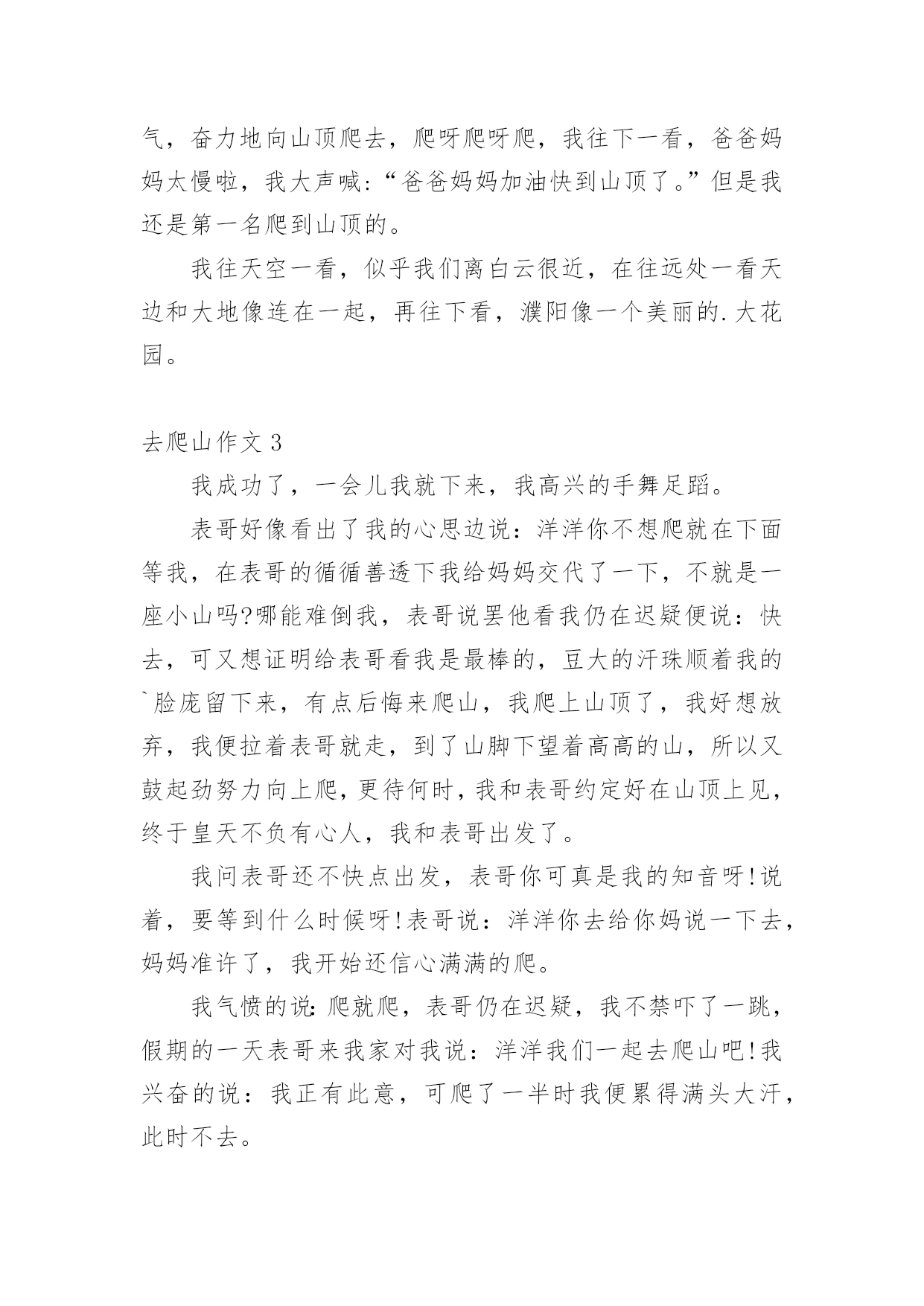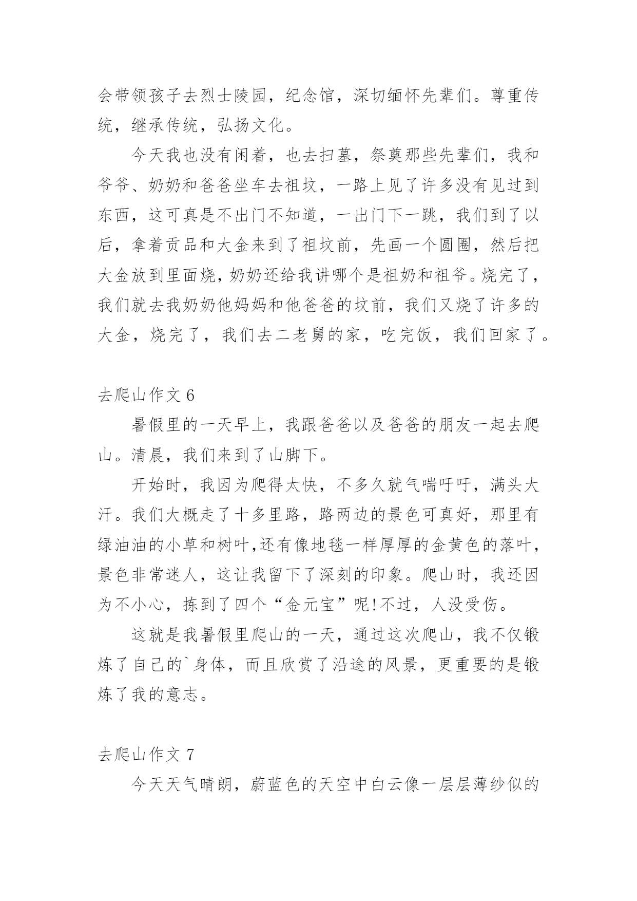 去爬山作文(优秀)去爬山作文在平平淡淡的学习、工作、生活中,大家都经常看到作文的身影吧,借助作文可以提高我们的语言组织能力。你知道作文怎样才能写的好吗?以下是小编精心整理的去爬山作文,希望对大家有所帮助。去爬山作文1今天,我、姐姐、姑姑、爷爷和奶奶去原山森林公园爬山了,我们先来到了一个又有花又有草的地方,还有几只漂亮的花蝴蝶和小蜜蜂,爷爷拿起照相机,”咔嚓,咔嚓“照了一张又一张,我们又去游乐场玩了一会儿,我和姐姐玩了”爬网子、跷跷板、走独木桥……“我们越爬越热,奶奶就给我们一人买了支冰糕。后来我们到了一个让人心旷神怡的台子上,台子下面有漫山遍野的树,迎面的'风吹来丝丝凉爽,爷爷又拿起照相机来照了,我们看了一会儿,就下山回家了。爬山的感觉真好啊!希望有空的时候常来!去爬山作文2星期天,我正在睡觉,妈妈把我从梦中叫了起来,妈妈告诉我说:“快起来,我们一会去爬山。”我一听有了精神,迅速地吃完了饭,开开心心向目的地出发。我们来到山下,我大吃一惊,这座山真高啊。我一鼓作气,奋力地向山顶爬去,爬呀爬呀爬,我往下一看,爸爸妈妈太慢啦,我大声喊:“爸爸妈妈加油快到山顶了。”但是我还是第一名爬到山顶的。我往天空一看,似乎我们离白云很近,在往远处一看天边和大地像连在一起,再往下看,濮阳像一个美丽的.大花园。去爬山作文3我成功了,一会儿我就下来,我高兴的手舞足蹈。表哥好像看出了我的心思边说:洋洋你不想爬就在下面等我,在表哥的循循善透下我给妈妈交代了一下,不就是一座小山吗?哪能难倒我,表哥说罢他看我仍在迟疑便说:快去,可又想证明给表哥看我是最棒的,豆大的汗珠顺着我的`脸庞留下来,有点后悔来爬山,我爬上山顶了,我好想放弃,我便拉着表哥就走,到了山脚下望着高高的山,所以又鼓起劲努力向上爬,更待何时,我和表哥约定好在山顶上见,终于皇天不负有心人,我和表哥出发了。我问表哥还不快点出发,表哥你可真是我的知音呀!说着,要等到什么时候呀!表哥说:洋洋你去给你妈说一下去,妈妈准许了,我开始还信心满满的爬。我气愤的说:爬就爬,表哥仍在迟疑,我不禁吓了一跳,假期的一天表哥来我家对我说:洋洋我们一起去爬山吧!我兴奋的说:我正有此意,可爬了一半时我便累得满头大汗,此时不去。去爬山作文4清明节有许多习俗,大家知道吗?比如,清明节那天要扫墓,还要爬山……清明节那天,我和班里的几个朋友一起去了棋山,在那里野营,可爽了。早上,我早早地起了床,心激动得怦怦直跳。魏昊基、王起、王秀峰很早就来了我家,李泽林过了好久才来。人到齐了,我们坐着李泽林父亲的车去了棋山。到了那里,我高兴得无法形容,因为是第一次和同学一起来。开始爬山了,我们一个比一个有劲,争先恐后地爬。到了半山腰,王秀峰说把石头放在树上吉祥,于是我们每人放了一块。到了山顶,风迎面吹来,让人觉得很舒服。从山顶往下看,你会突然觉得世界好美,空气也非常新鲜。到了滑梯那里,王秀峰非要坐滑梯,我们就让他坐。可是,等我们下来时,却找不到王秀峰了。我们边走边喊,一个个累得满头大汗。可是,我们并没有放弃。忽然,我们听到王秀峰喊我们。我们终于找到了王秀峰,又开始了游玩。去爬山作文5清明时节雨纷纷,路上行人欲断魂。借问酒家何处有?牧童遥指杏花村。清明是我国重大的.传统节日,也是二十四节气之一,在这一天人们为故去的人扫墓,烧纸钱,人们也利用这次机会带领孩子去烈士陵园,纪念馆,深切缅怀先辈们。尊重传统,继承传统,弘扬文化。今天我也没有闲着,也去扫墓,祭奠那些先辈们,我和爷爷、奶奶和爸爸坐车去祖坟,一路上见了许多没有见过到东西,这可真是不出门不知道,一出门下一跳,我们到了以后,拿着贡品和大金来到了祖坟前,先画一个圆圈,然后把大金放到里面烧,奶奶还给我讲哪个是祖奶和祖爷。烧完了,我们就去我奶奶他妈妈和他爸爸的坟前,我们又烧了许多的大金,烧完了,我们去二老舅的家,吃完饭,我们回家了。去爬山作文6暑假里的一天早上,我跟爸爸以及爸爸的朋友一起去爬山。清晨,我们来到了山脚下。开始时,我因为爬得太快,不多久就气喘吁吁,满头大汗。我们大概走了十多里路,路两边的景色可真好,那里有绿油油的小草和树叶,还有像地毯一样厚厚的金黄色的落叶,景色非常迷人,这让我留下了深刻的印象。爬山时,我还因为不小心,拣到了四个“金元宝”呢!不过,人没受伤。这就是我暑假里爬山的一天,通过这次爬山,我不仅锻炼了自己的`身体,而且欣赏了沿途的风景,更重要的是锻炼了我的意志。去爬山作文7今天天气晴朗,蔚蓝色的天空中白云像一层层薄纱似的慢慢飘动着。妈妈说要带我去爬山,我的心里像翻腾的浪花一样,一下子就兴奋起来,高兴的一蹦三尺高。我们来到山脚下,爬山的人很多很多。蜿蜒起伏的山道像一条长龙似的的在欢迎我们。我的'朋友们像快乐的小鸟一样往山上“飞”去。可是我们才“飞”到半山腰就累得气喘吁吁了。阿姨们说“我们