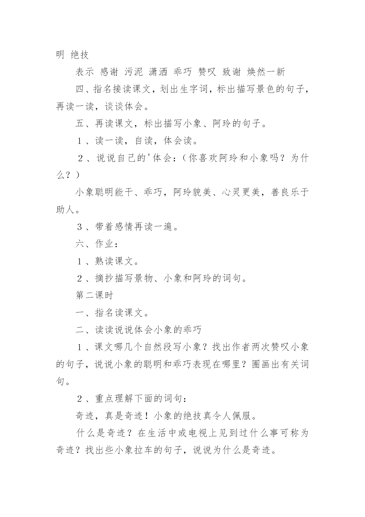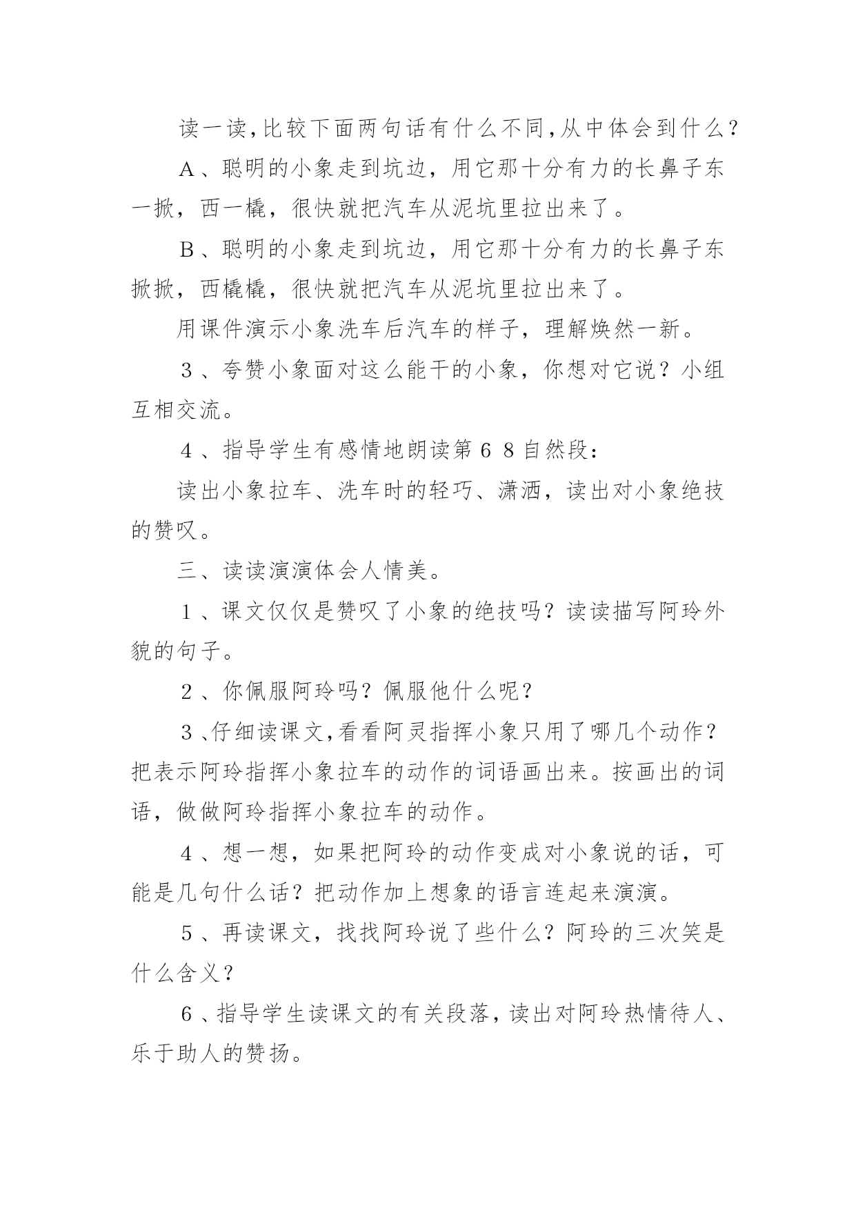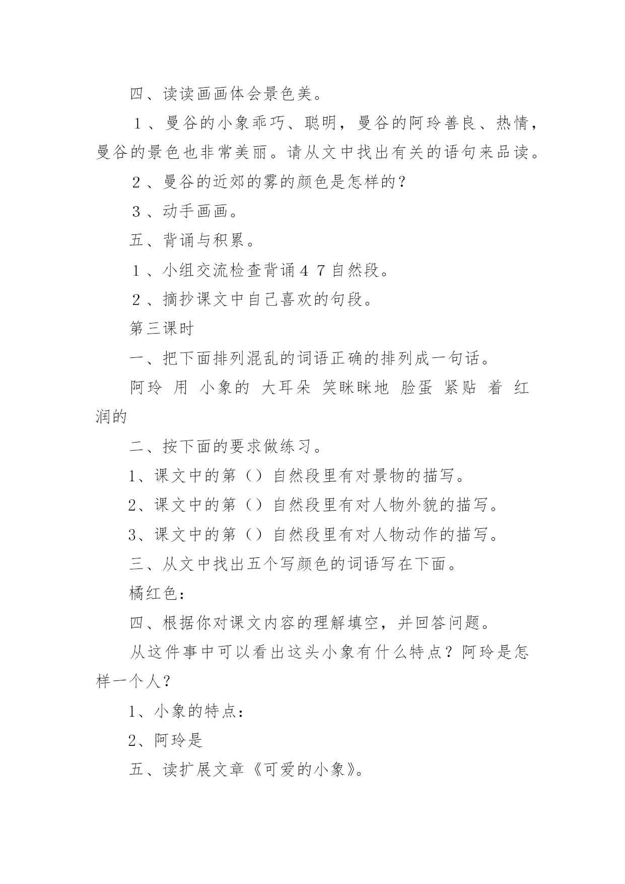 《曼谷的小象》教学设计一、教学目标:1、认识本课的23个生字,学会其中的15个字。能正确读写下列词语:乘坐、轮子、司机、铃声、裙子、整齐、聪明、佩服、握住、表示、感谢、乖巧、赞叹、致谢等。2、能正确、流利、有感情地朗读课文,背诵第四至自然段。3、能读懂课文,领会泰国妇女阿玲朴实、善良、乐于助人的优秀品质,受到国际主义精神的教育。二、教学重点:摘抄、积累语言;在理解课文的基础上,体会阿玲的美好品质。三、教学难点:学生通过课文对聪明、乖巧的小象的赞叹,体会热心助人的泰国妇女阿玲的优秀品质。四、课时安排:3课时第一课时一、板书课题,启发质疑。二、交流对曼谷、小象的了解。三、学生自读课文,初步了解课文的主要内容,读准下列词语:点缀颠簸坑坑洼洼泥泞不堪橘红色悦耳招呼聪明绝技表示感谢污泥潇洒乖巧赞叹致谢焕然一新四、指名接读课文,划出生字词,标出描写景色的句子,再读一读,谈谈体会。五、再读课文,标出描写小象、阿玲的句子。1、读一读,自读,体会读。2、说说自己的'体会:(你喜欢阿玲和小象吗?为什么?)小象聪明能干、乖巧,阿玲貌美、心灵更美,善良乐于助人。3、带着感情再读一遍。六、作业:1、熟读课文。2、摘抄描写景物、小象和阿玲的词句。第二课时一、指名读课文。二、读读说说体会小象的乖巧1、课文哪几个自然段写小象?找出作者两次赞叹小象的句子,说说小象的聪明和乖巧表现在哪里?圈画出有关词句。2、重点理解下面的词句:奇迹,真是奇迹!小象的绝技真令人佩服。什么是奇迹?在生活中或电视上见到过什么事可称为奇迹?找出些小象拉车的句子,说说为什么是奇迹。读一读,比较下面两句话有什么不同,从中体会到什么?A、聪明的小象走到坑边,用它那十分有力的长鼻子东一掀,西一橇,很快就把汽车从泥坑里拉出来了。B、聪明的小象走到坑边,用它那十分有力的长鼻子东掀掀,西橇橇,很快就把汽车从泥坑里拉出来了。用课件演示小象洗车后汽车的样子,理解焕然一新。3、夸赞小象面对这么能干的小象,你想对它说?小组互相交流。4、指导学生有感情地朗读第68自然段:读出小象拉车、洗车时的轻巧、潇洒,读出对小象绝技的赞叹。三、读读演演体会人情美。1、课文仅仅是赞叹了小象的绝技吗?读读描写阿玲外貌的句子。2、你佩服阿玲吗?佩服他什么呢?3、仔细读课文,看看阿灵指挥小象只用了哪几个动作?把表示阿玲指挥小象拉车的动作的词语画出来。按画出的词语,做做阿玲指挥小象拉车的动作。4、想一想,如果把阿玲的动作变成对小象说的话,可能是几句什么话?把动作加上想象的语言连起来演演。5、再读课文,找找阿玲说了些什么?阿玲的三次笑是什么含义?6、指导学生读课文的有关段落,读出对阿玲热情待人、乐于助人的赞扬。四、读读画画体会景色美。1、曼谷的小象乖巧、聪明,曼谷的阿玲善良、热情,曼谷的景色也非常美丽。请从文中找出有关的语句来品读。2、曼谷的近郊的雾的颜色是怎样的?3、动手画画。五、背诵与积累。1、小组交流检查背诵47自然段。2、摘抄课文中自己喜欢的句段。第三课时一、把下面排列混乱的词语正确的排列成一句话。阿玲用小象的大耳朵笑眯眯地脸蛋紧贴着红润的二、按下面的要求做练习。1、课文中的第()自然段里有对景物的描写。2、课文中的第()自然段里有对人物外貌的描写。3、课文中的第()自然段里有对人物动作的描写。三、从文中找出五个写颜色的词语写在下面。橘红色:四、根据你对课文内容的理解填空,并回答问题。从这件事中可以看出这头小象有什么特点?阿玲是怎样一个人?1、小象的特点:2、阿玲是五、读扩展文章《可爱的小象》。